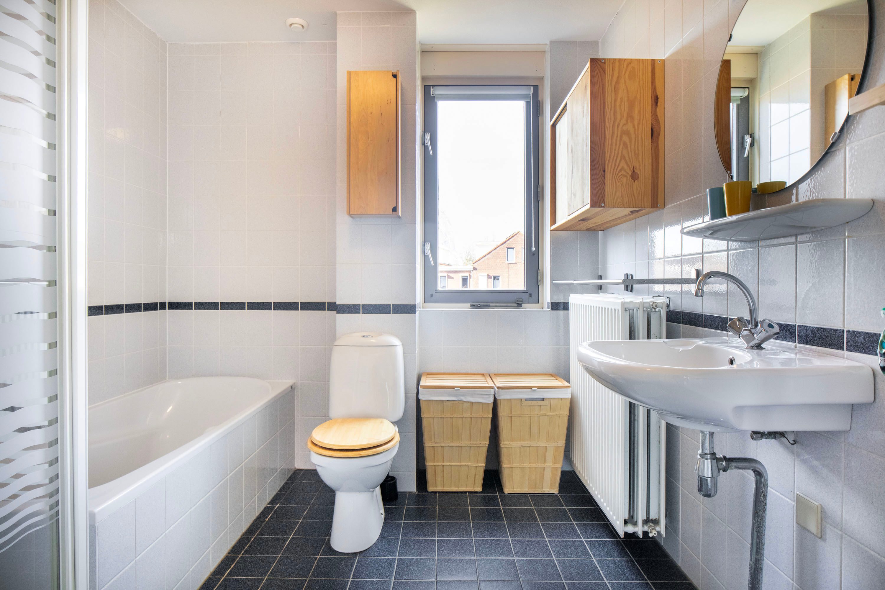 Op de eerste verdieping bevinden zich drie slaapkamers van circa 16 m², 12 m² en 9 m². De kamers zijn prettig ingedeeld en dankzij de ramen voorzien van een fijne hoeveelheid natuurlijk daglicht, waardoor ze licht en comfortabel aanvoelen. De ruimtes lenen zich uitstekend als slaapkamers, maar kunnen natuurlijk ook prima worden gebruikt als werk-, hobby- of logeerkamer. De badkamer is compleet uitgevoerd en voorzien van een ligbad, douche, toilet en een wastafel, waardoor alle dagelijkse voorzieningen hier praktisch zijn samengebracht.