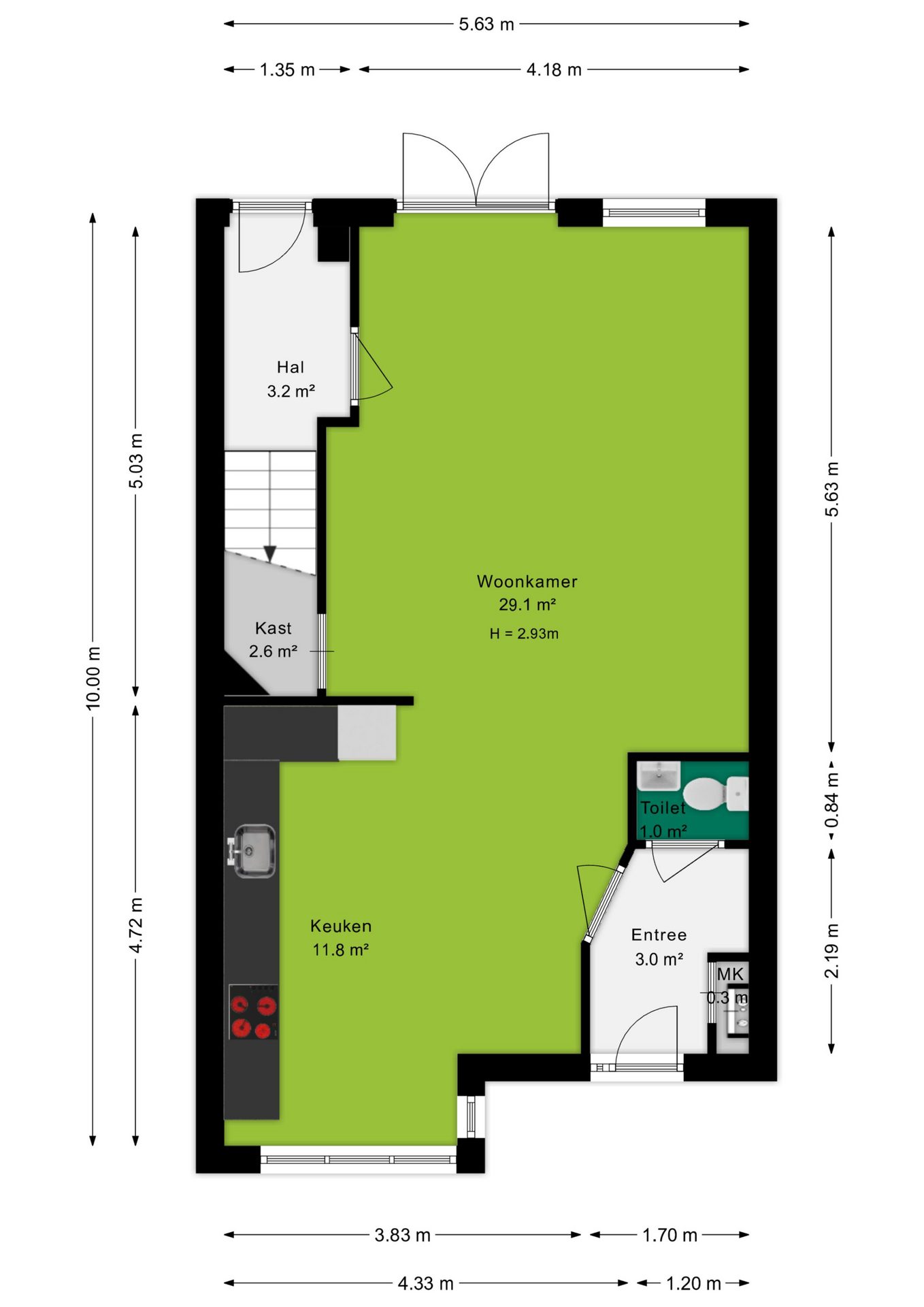 Via de entree kom je binnen in de hal met meterkast en toegang tot het toilet.