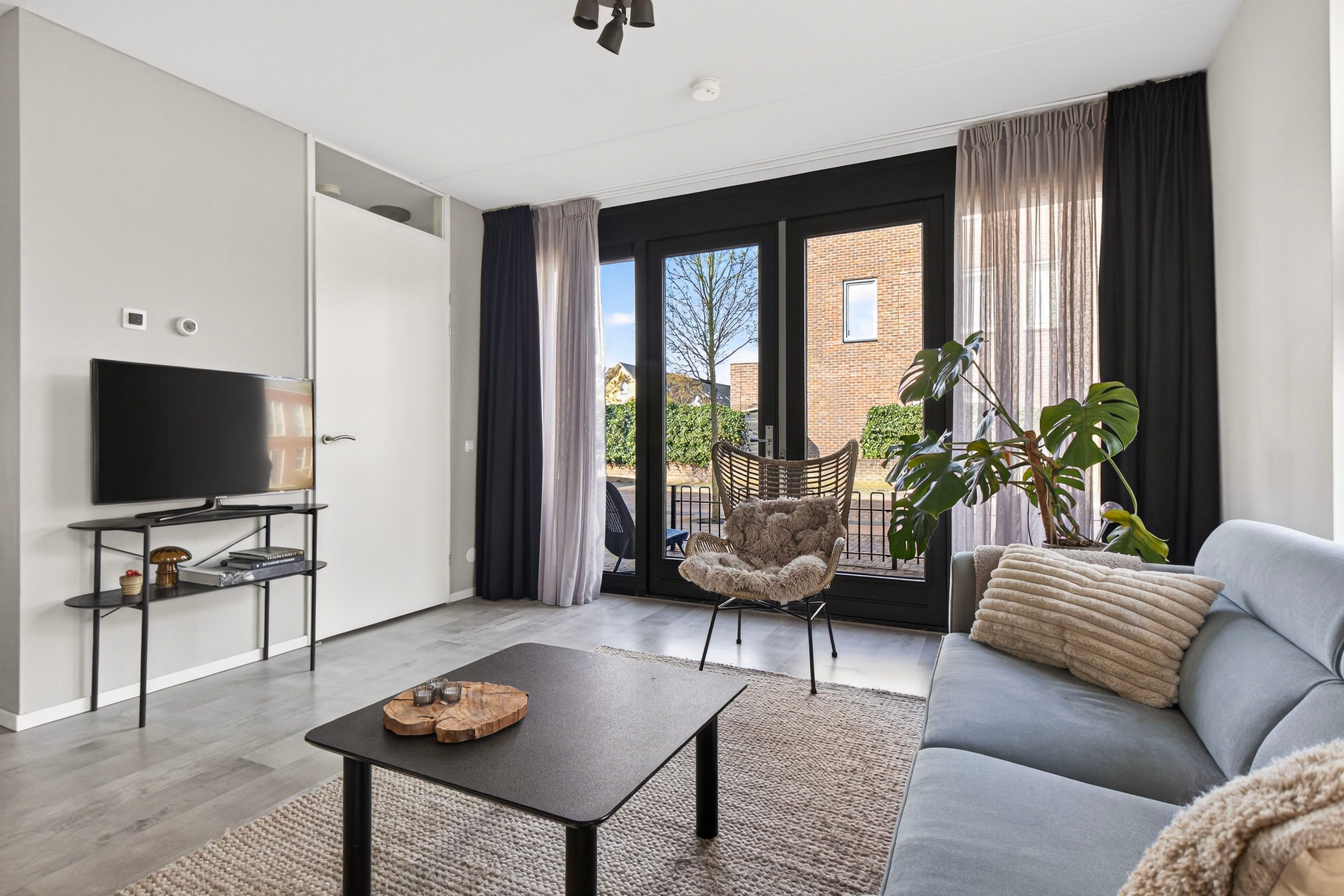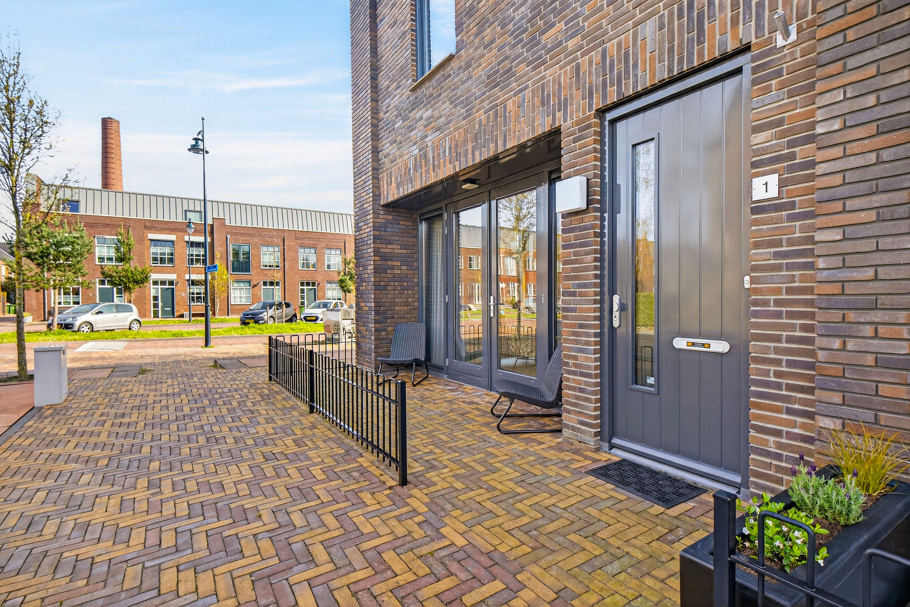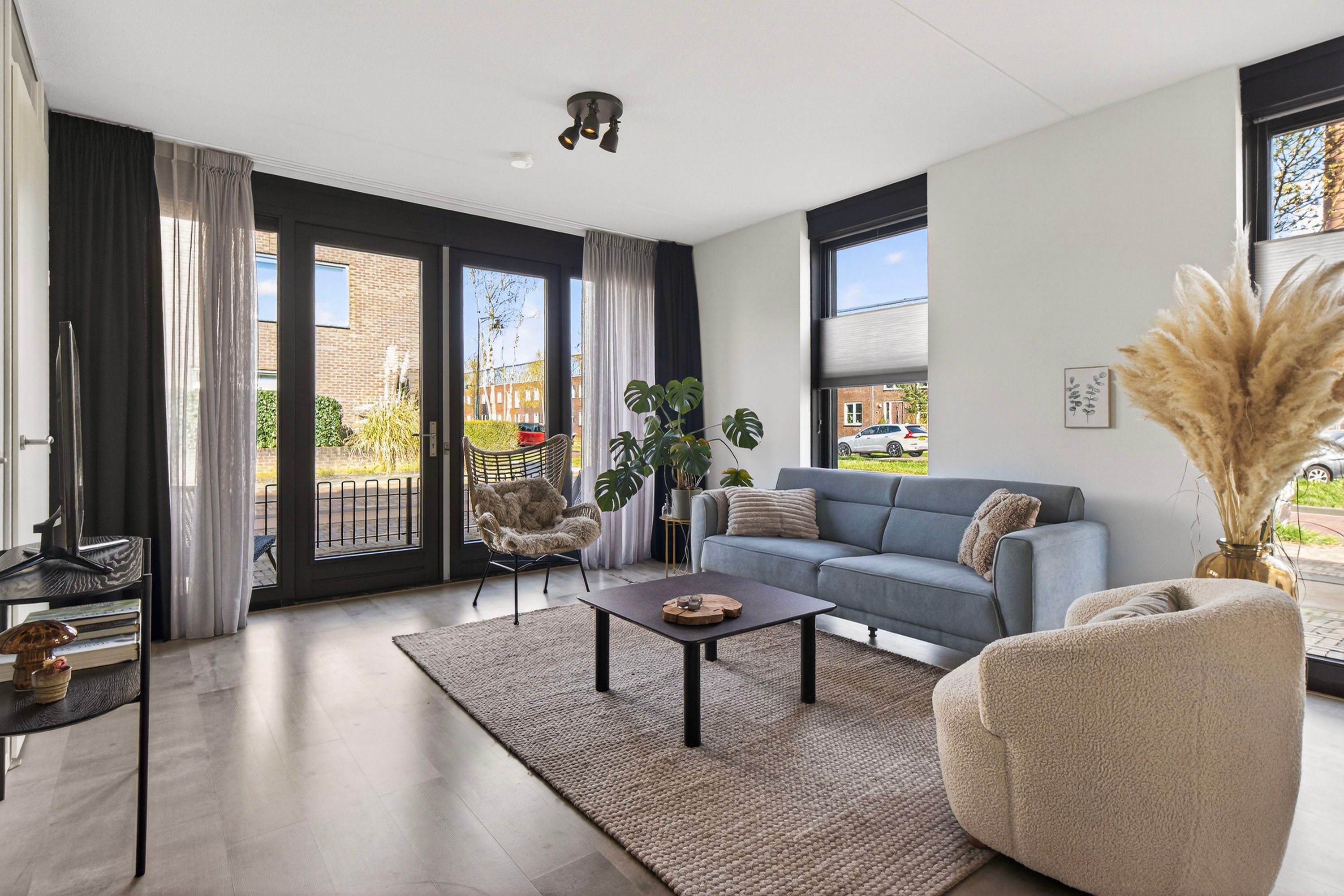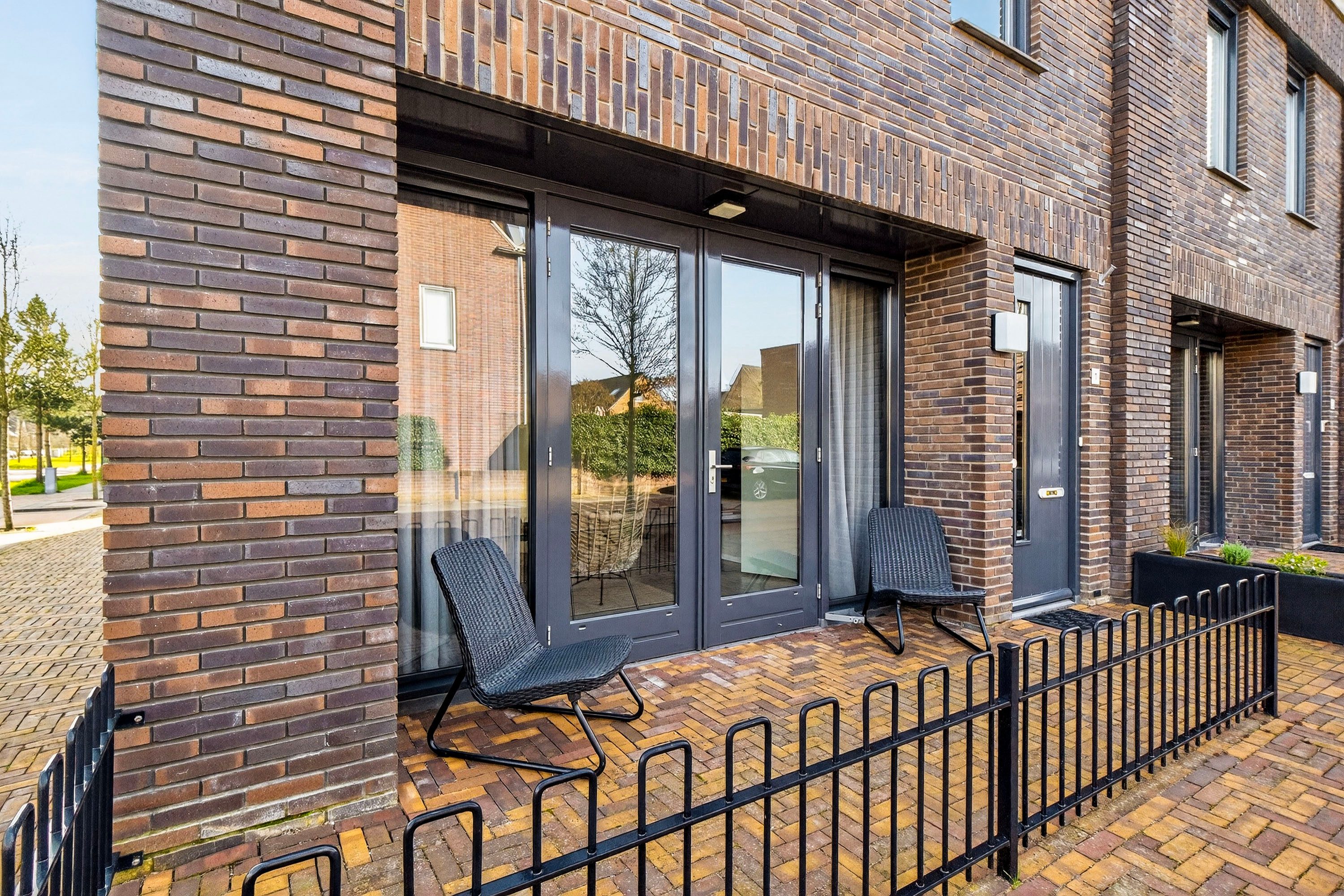 Via de openslaande deuren stap je zo de voortuin in, wat zorgt voor een prettige verbinding tussen binnen en buiten.