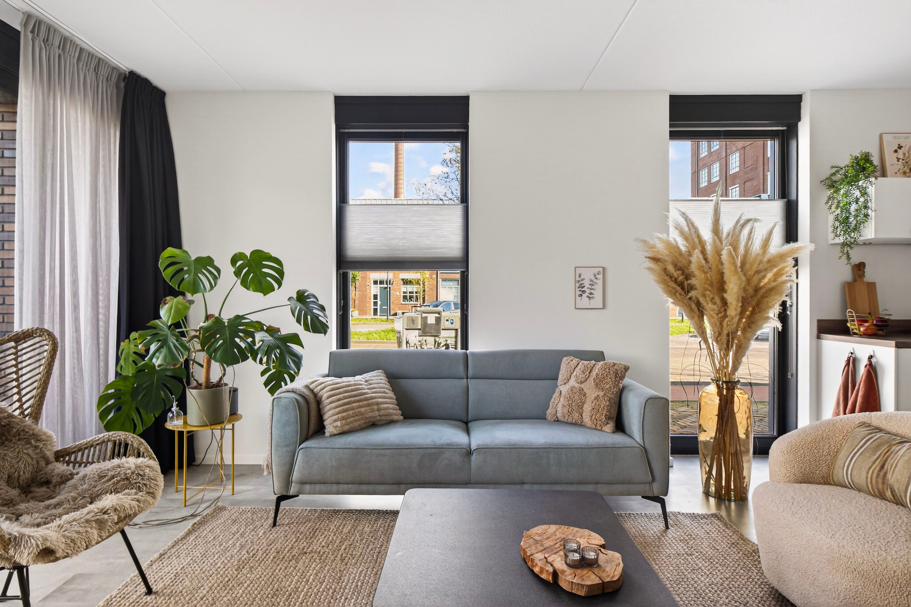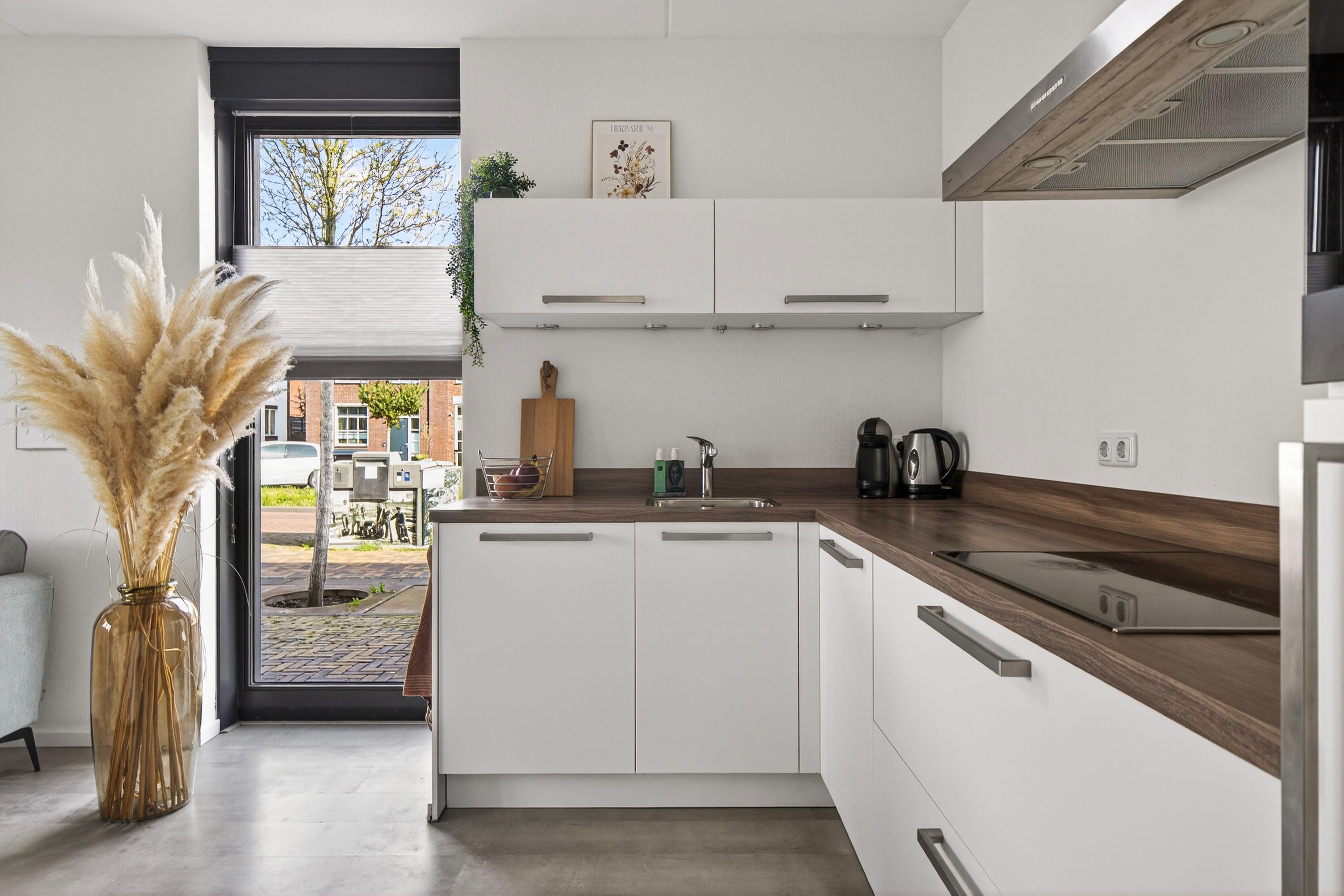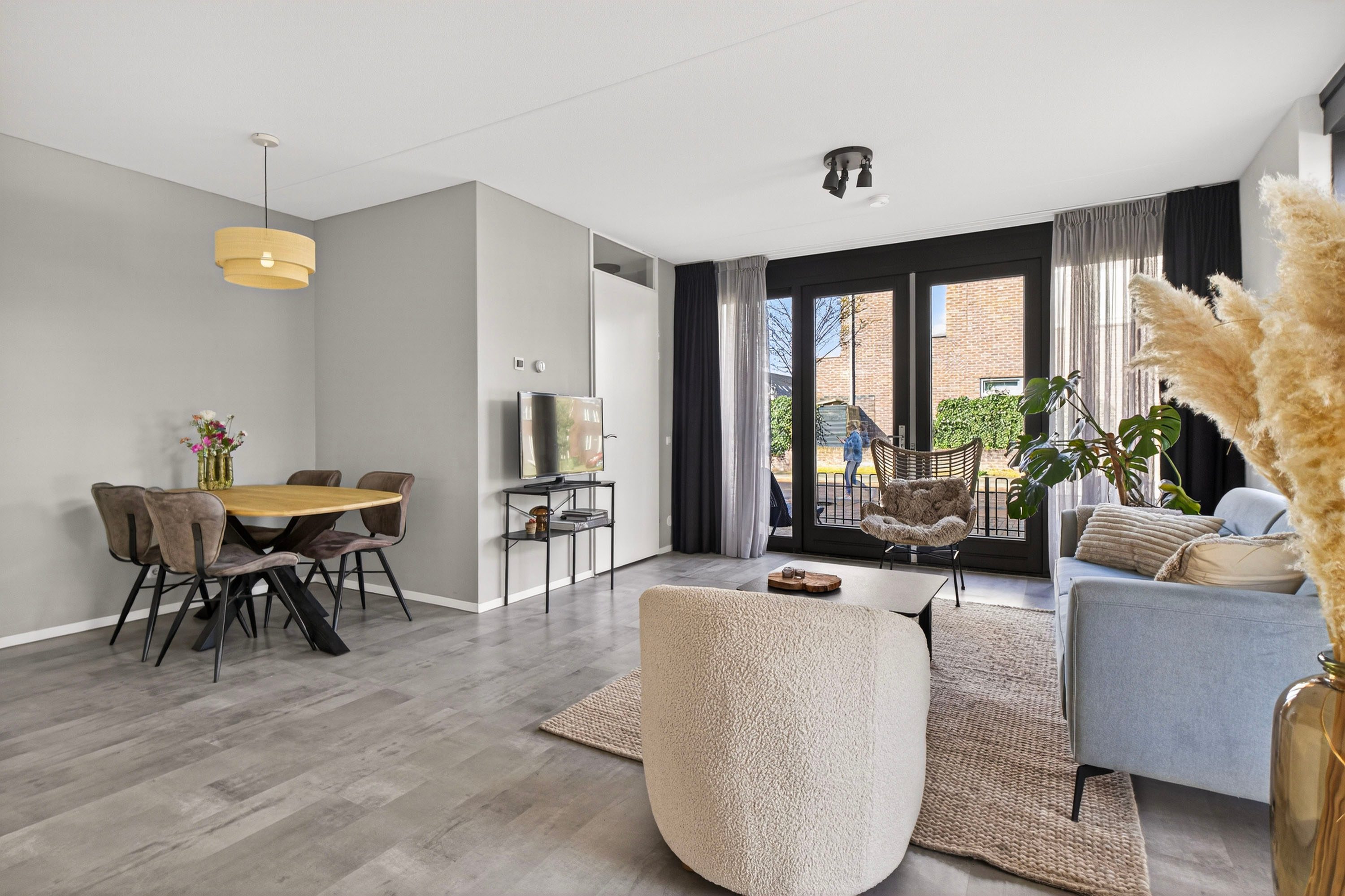 Via de openslaande deuren stap je zo de voortuin in, wat zorgt voor een prettige verbinding tussen binnen en buiten.