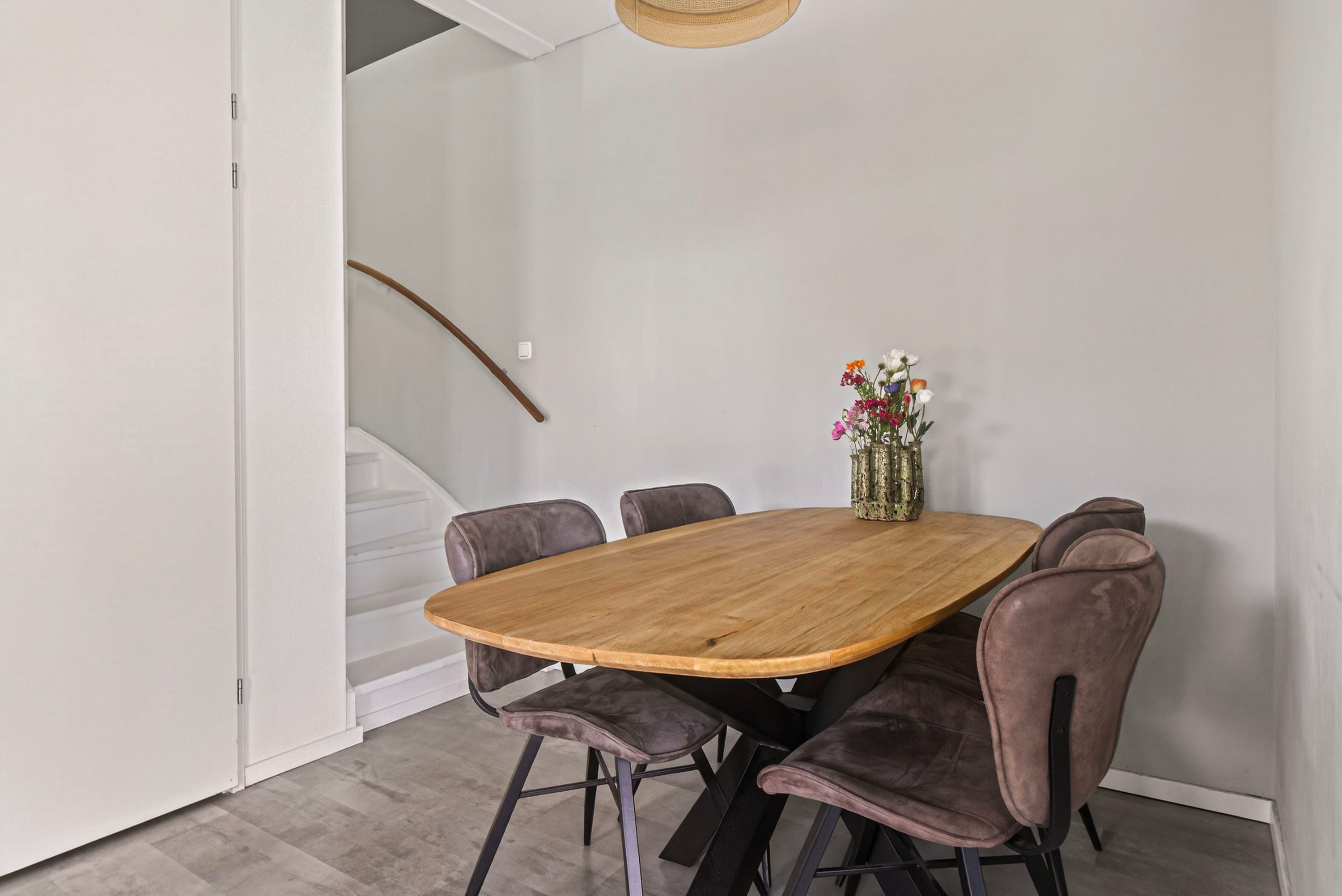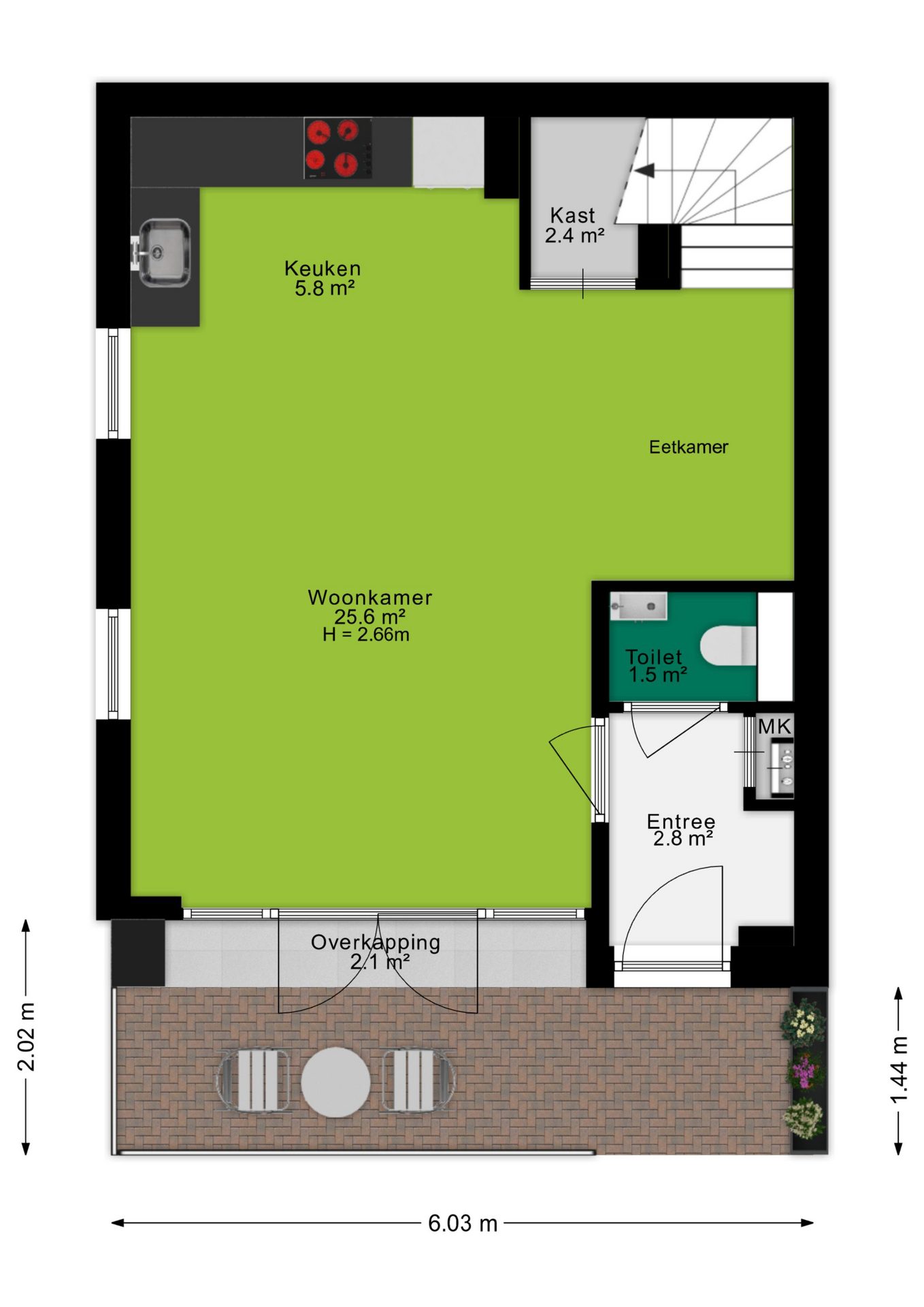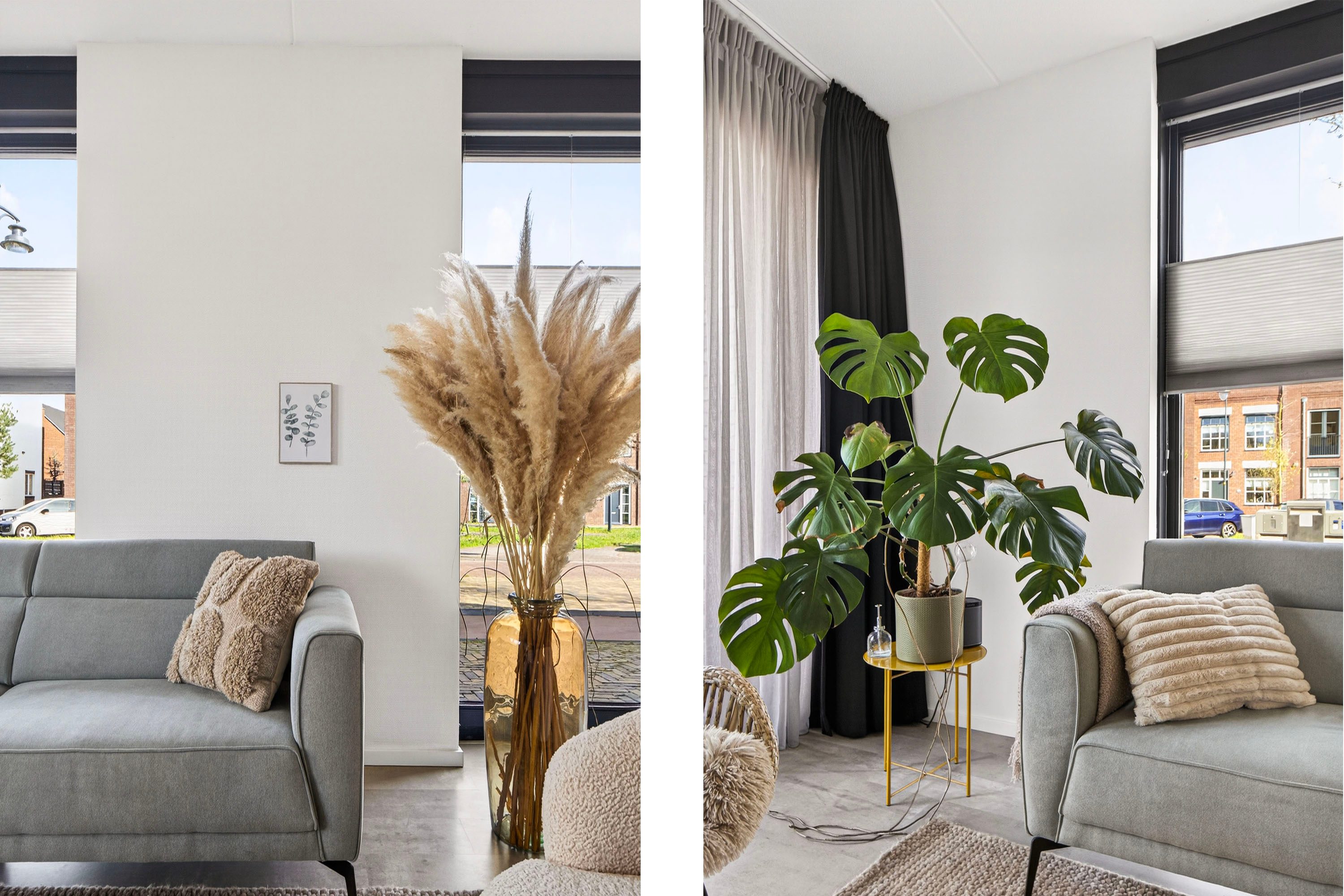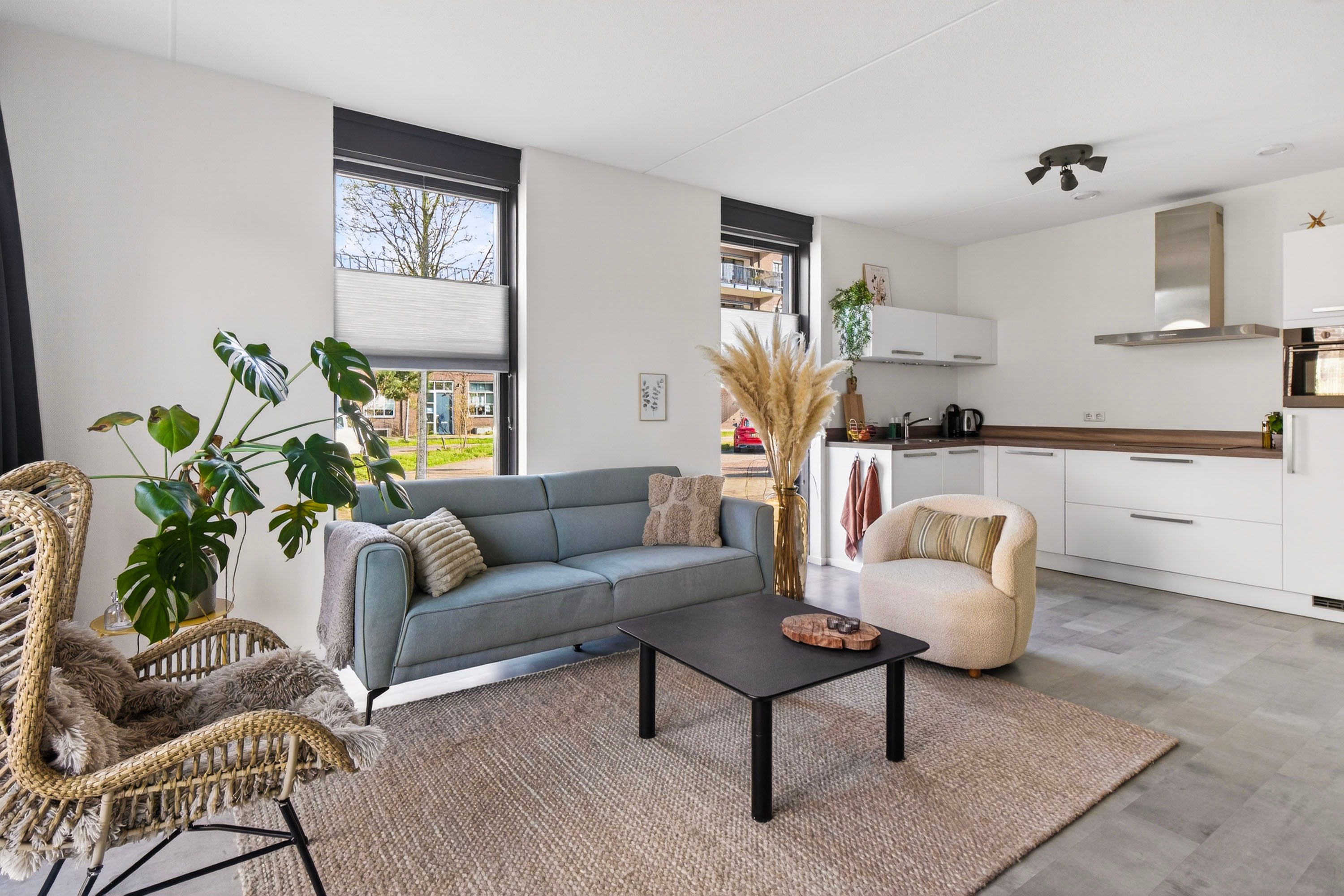 Via de openslaande deuren stap je zo de voortuin in, wat zorgt voor een prettige verbinding tussen binnen en buiten.