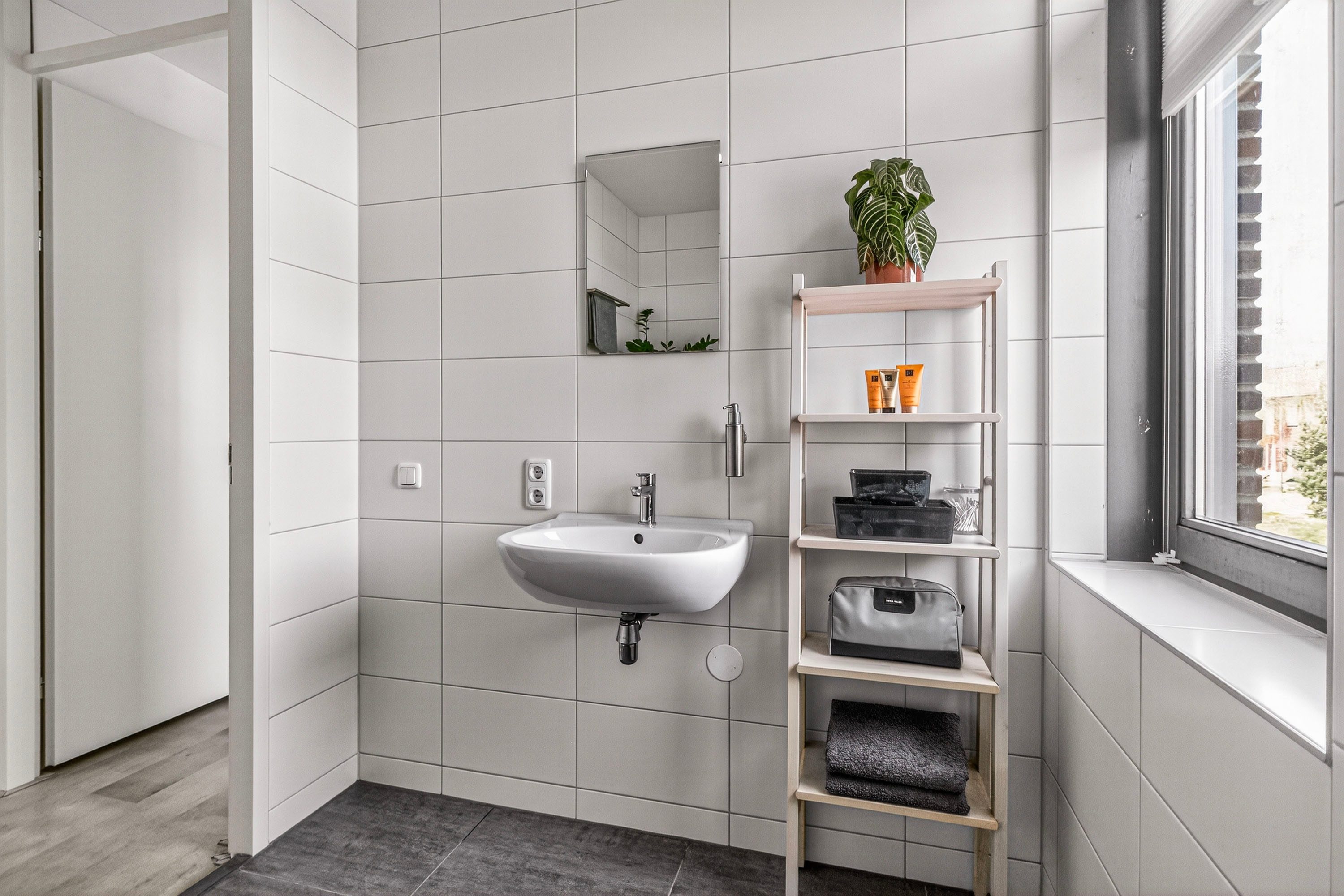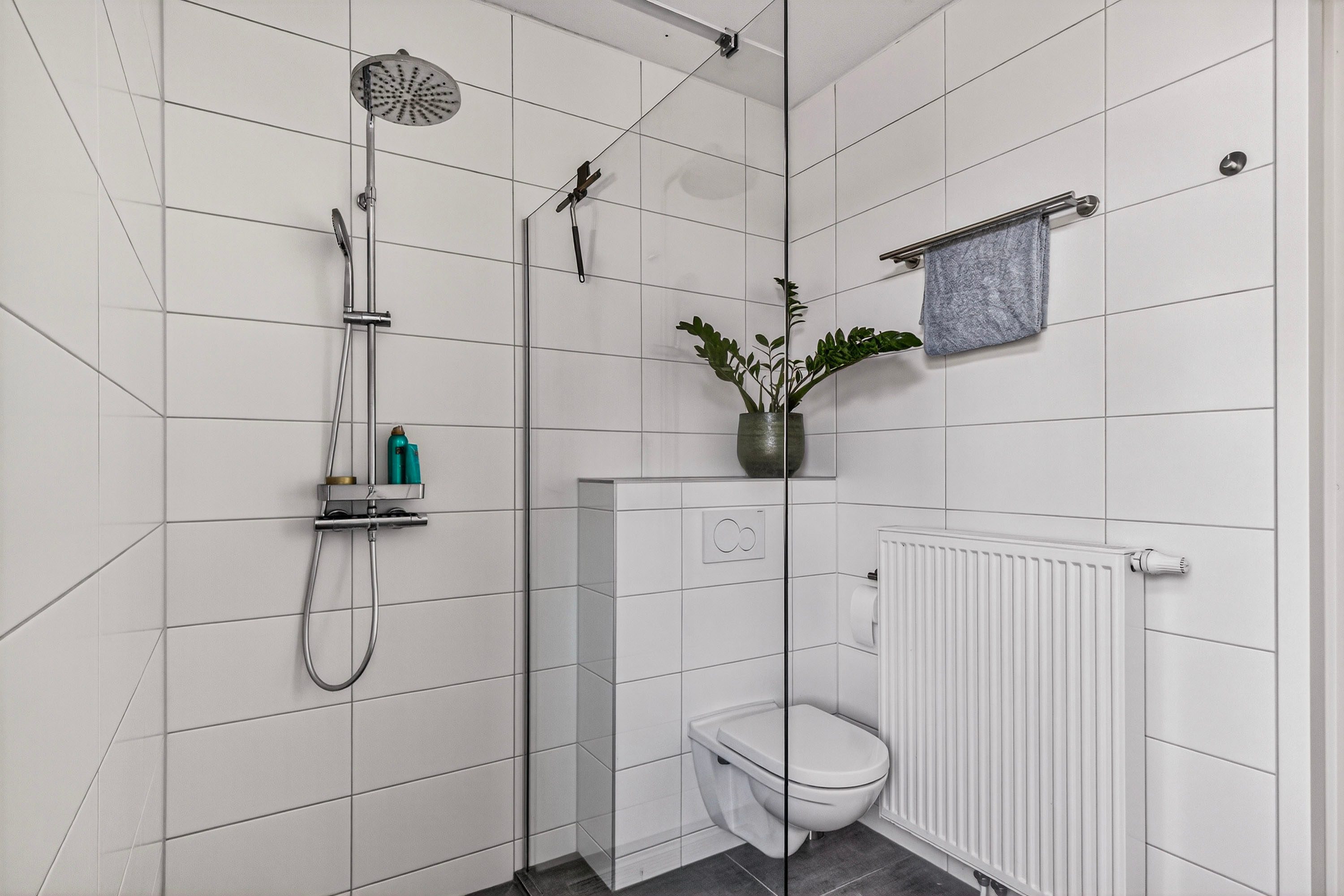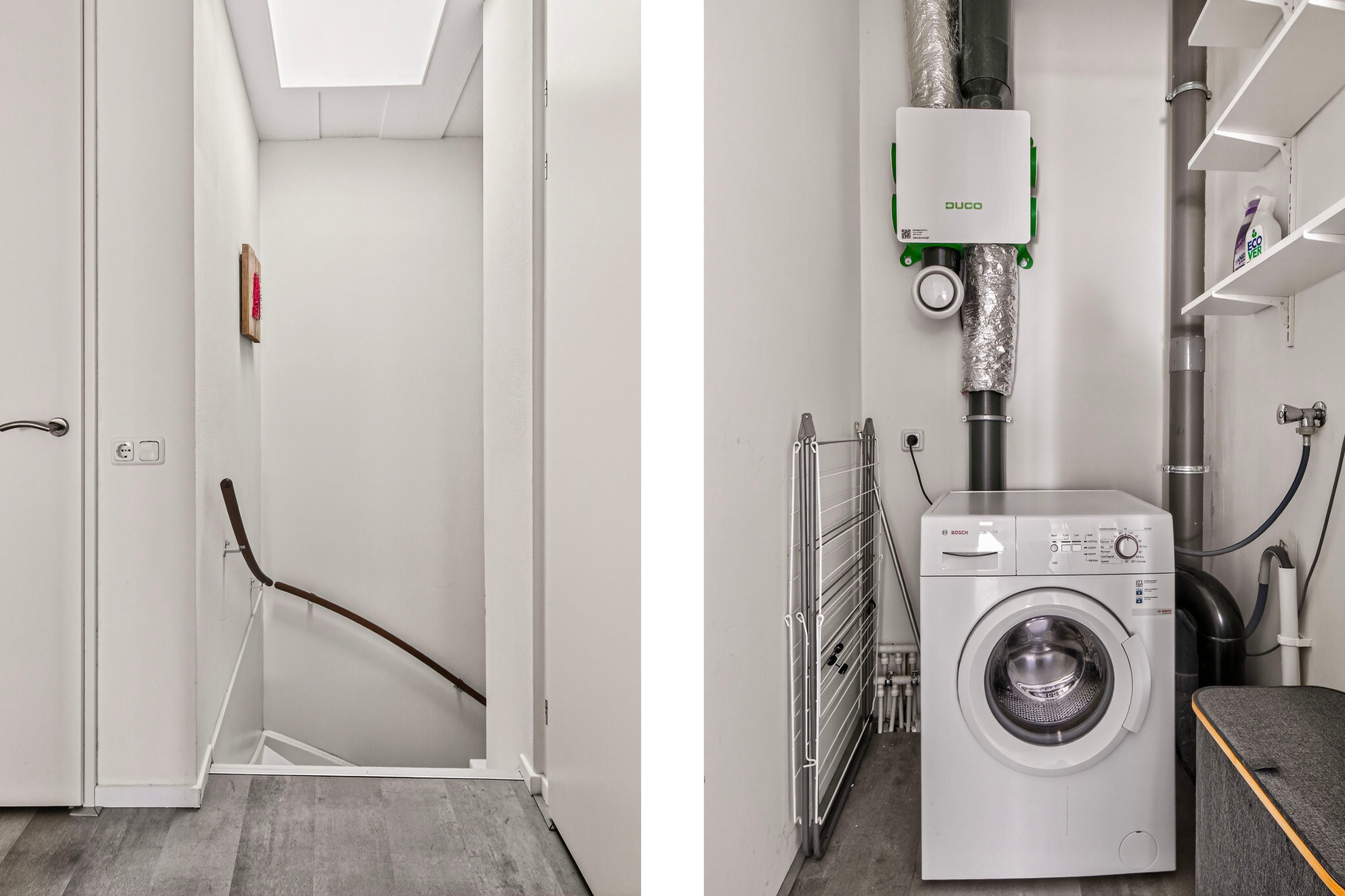 De badkamer is netjes en praktisch ingericht en beschikt over een inloopdouche, wastafel en toilet. Daarnaast vind je op deze verdieping een handige berging met wasmachineaansluiting en een extra vaste kast, ideaal voor extra opslag.