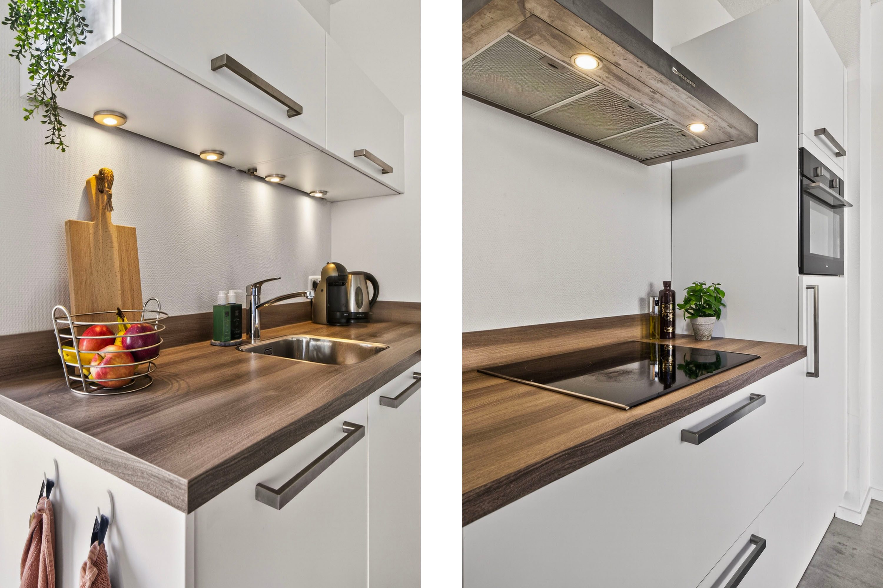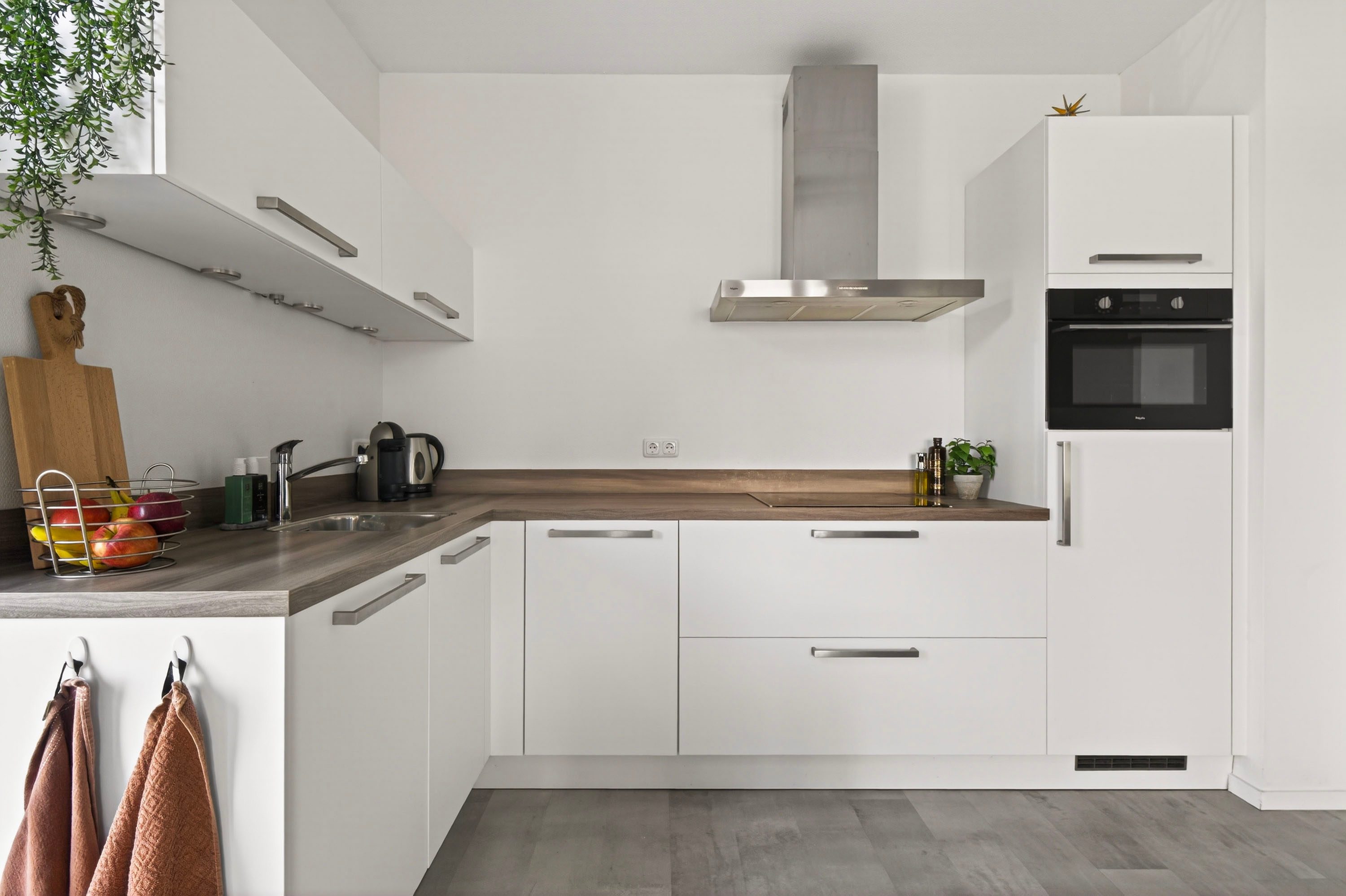 De keuken is modern uitgevoerd en voorzien van diverse inbouwapparatuur, waaronder een inductiekookplaat, afzuigkap, vaatwasser, oven en koelkast. Hier kook je met gemak terwijl je in contact blijft met de rest van de ruimte.