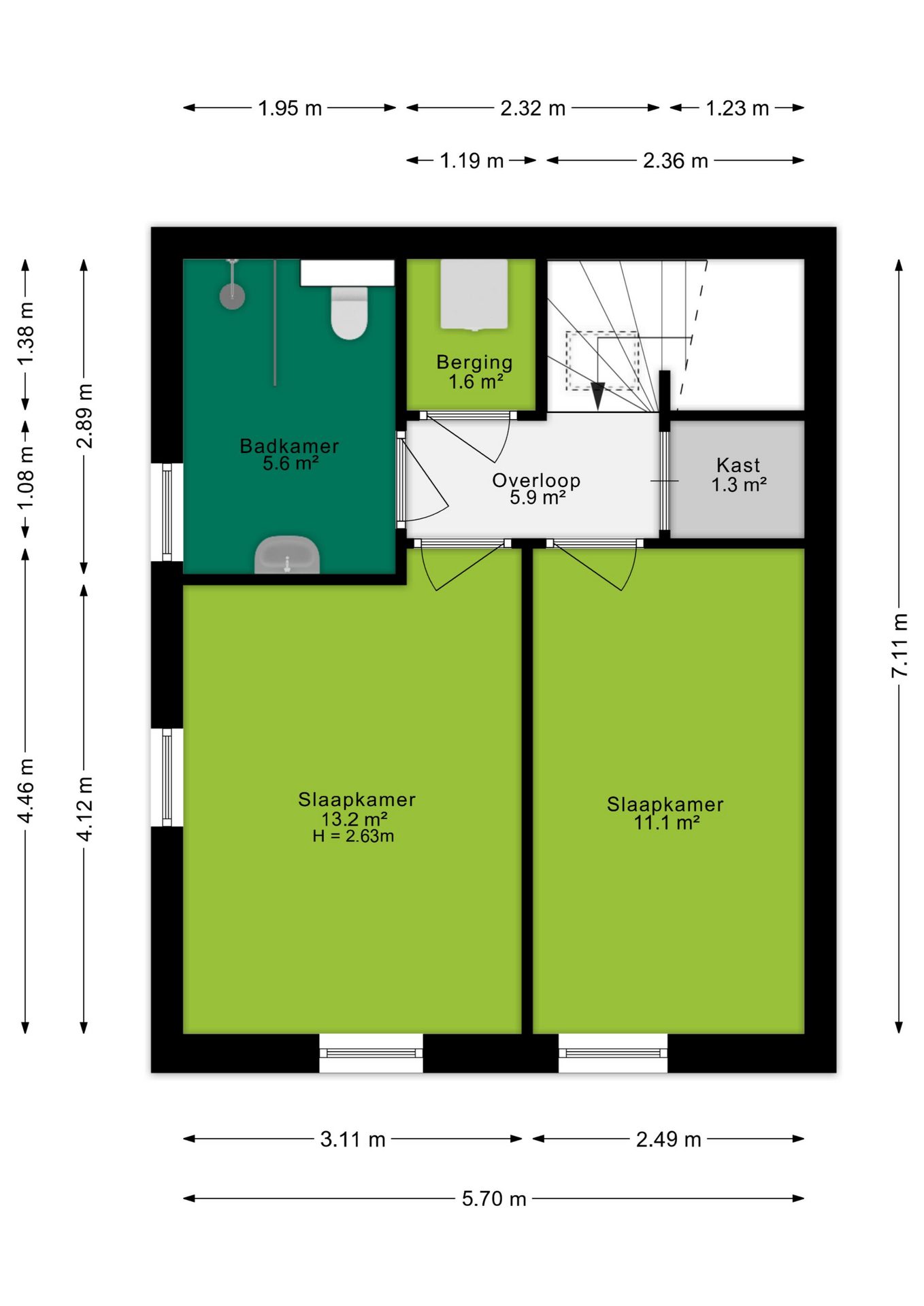 Op de eerste verdieping bevinden zich twee ruime slaapkamers van circa 13 m² en 11 m². Beide kamers zijn goed in te delen en bieden voldoende ruimte voor een tweepersoonsbed of een fijne werkplek.
