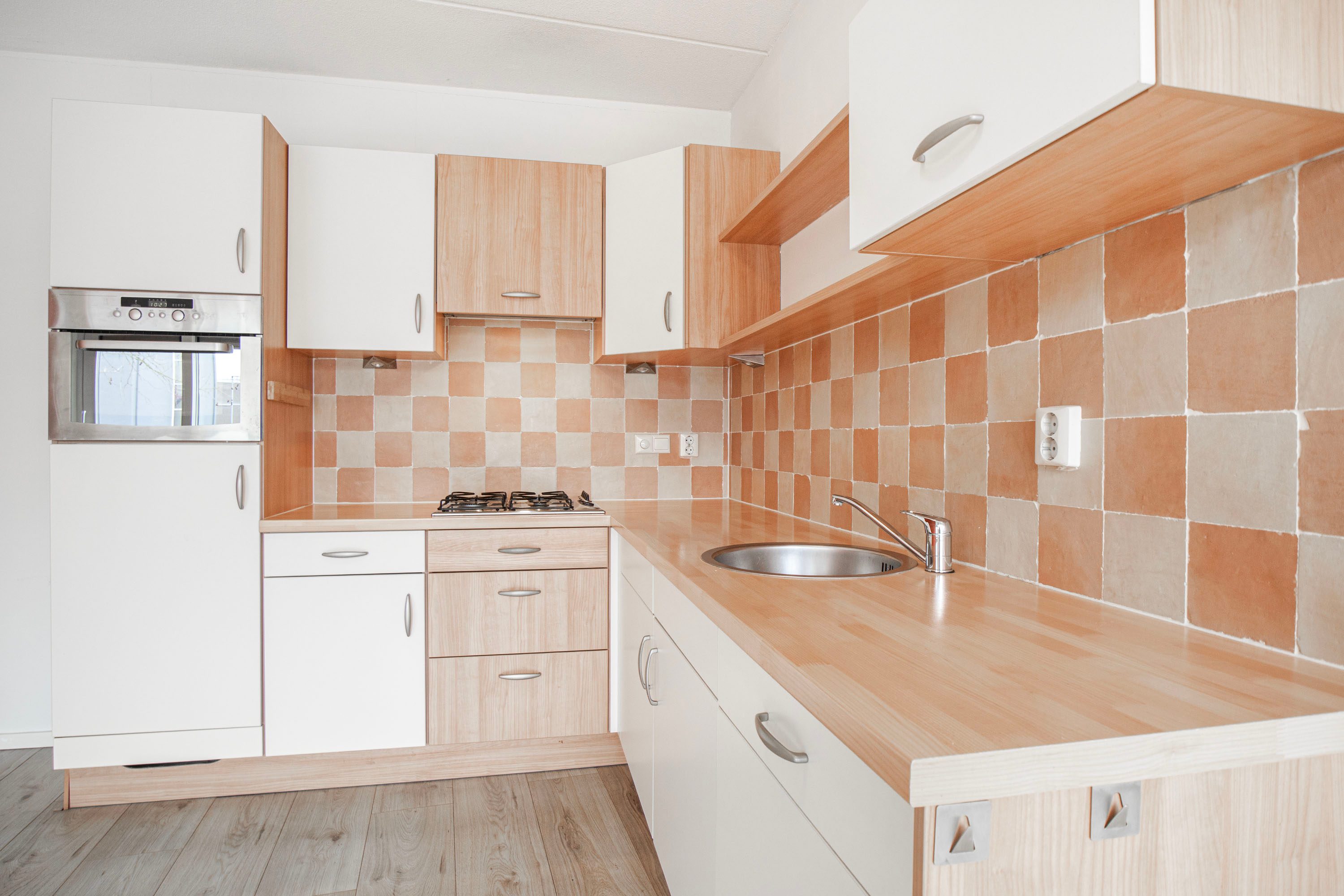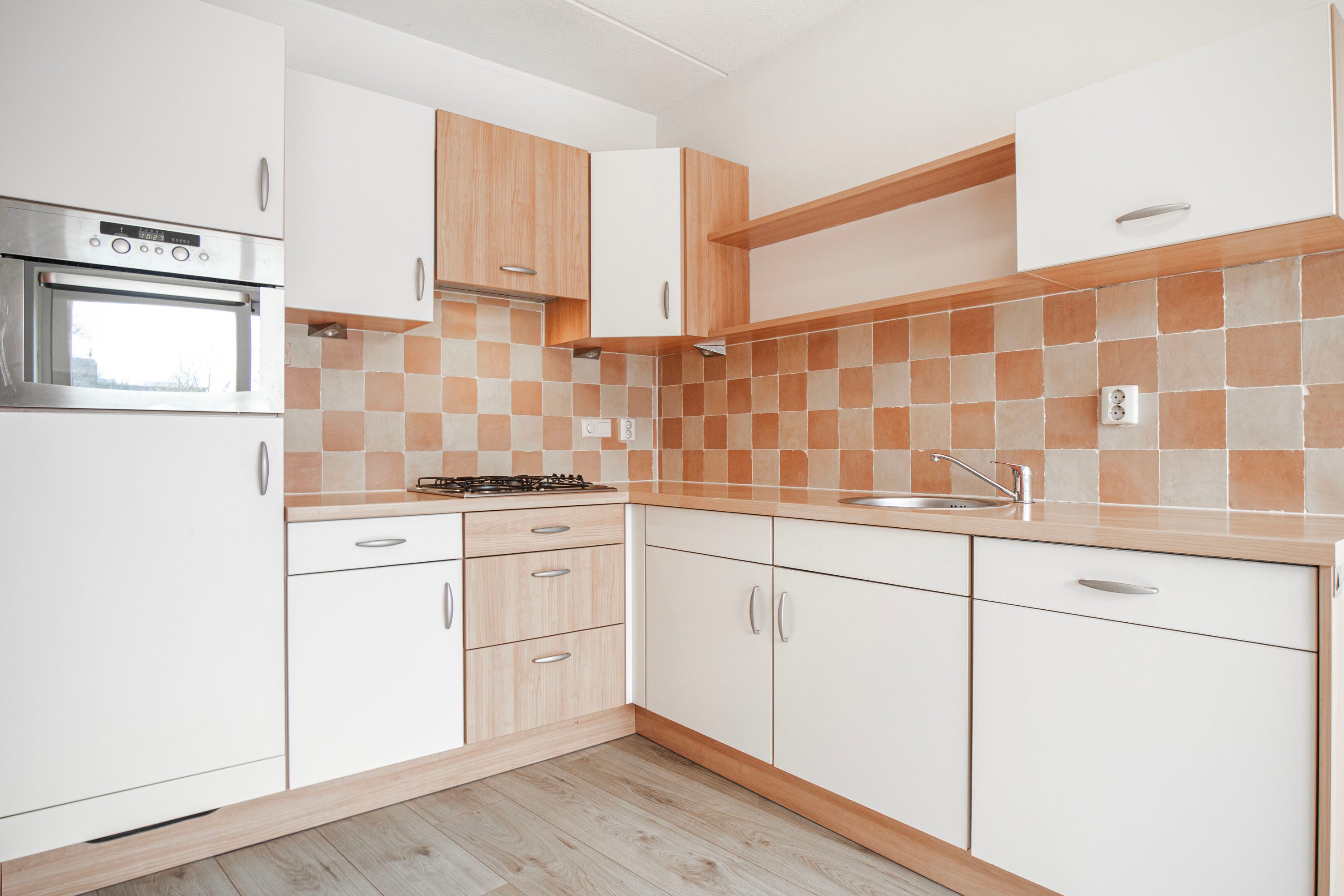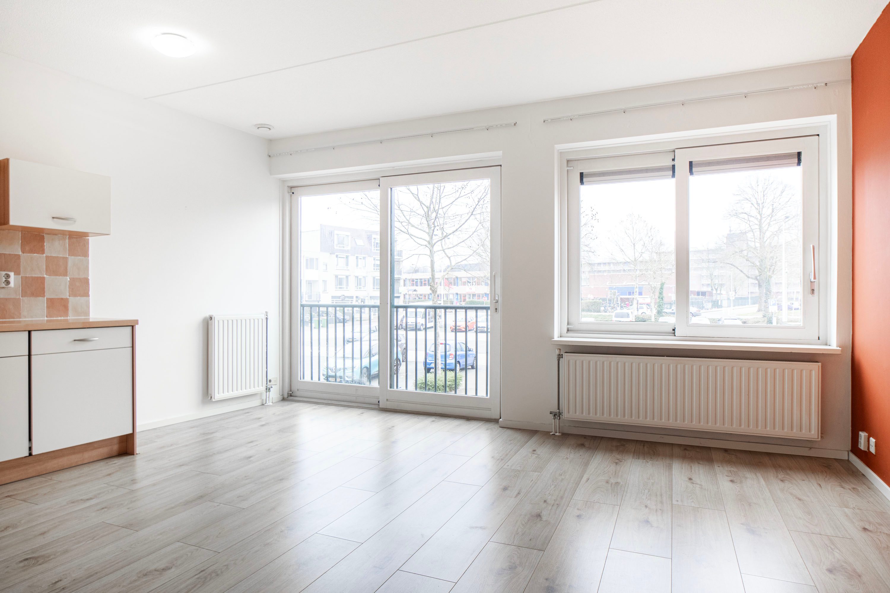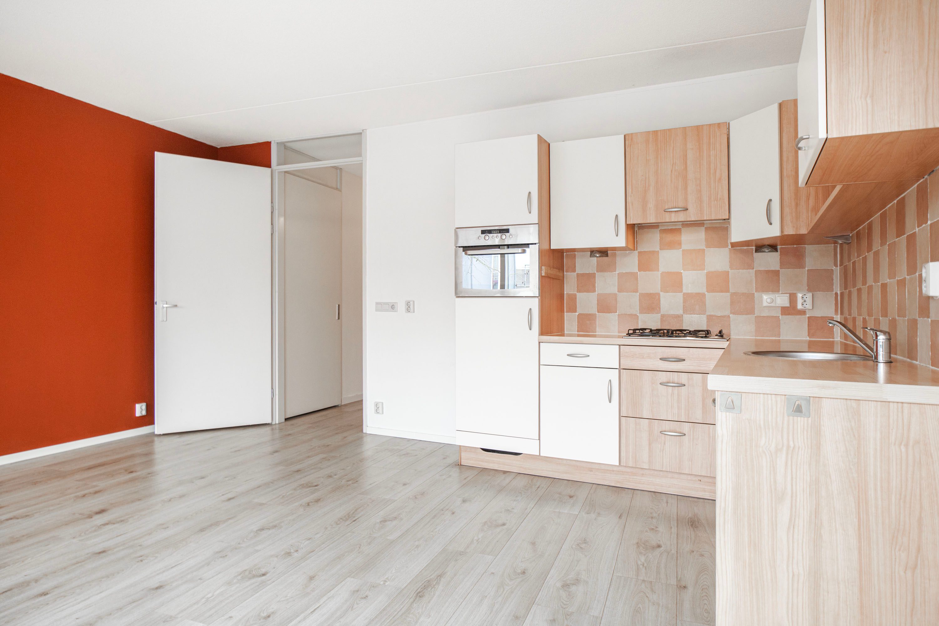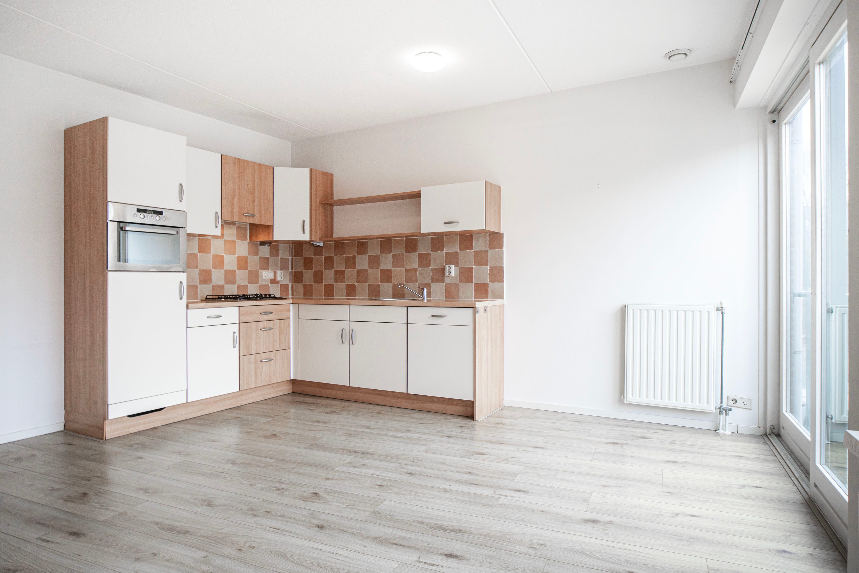 De woonkamer van circa 17 m² is licht en ruim opgezet. Dankzij het draai-/kiepraam en de schuifpui valt er veel daglicht binnen. Het Franse balkon maakt het mogelijk om op warme dagen de schuifpui heerlijk open te zetten. De open keuken (ca. 6 m²) vormt één geheel met de woonkamer en zorgt voor een prettige, open sfeer in de leefruimte.
