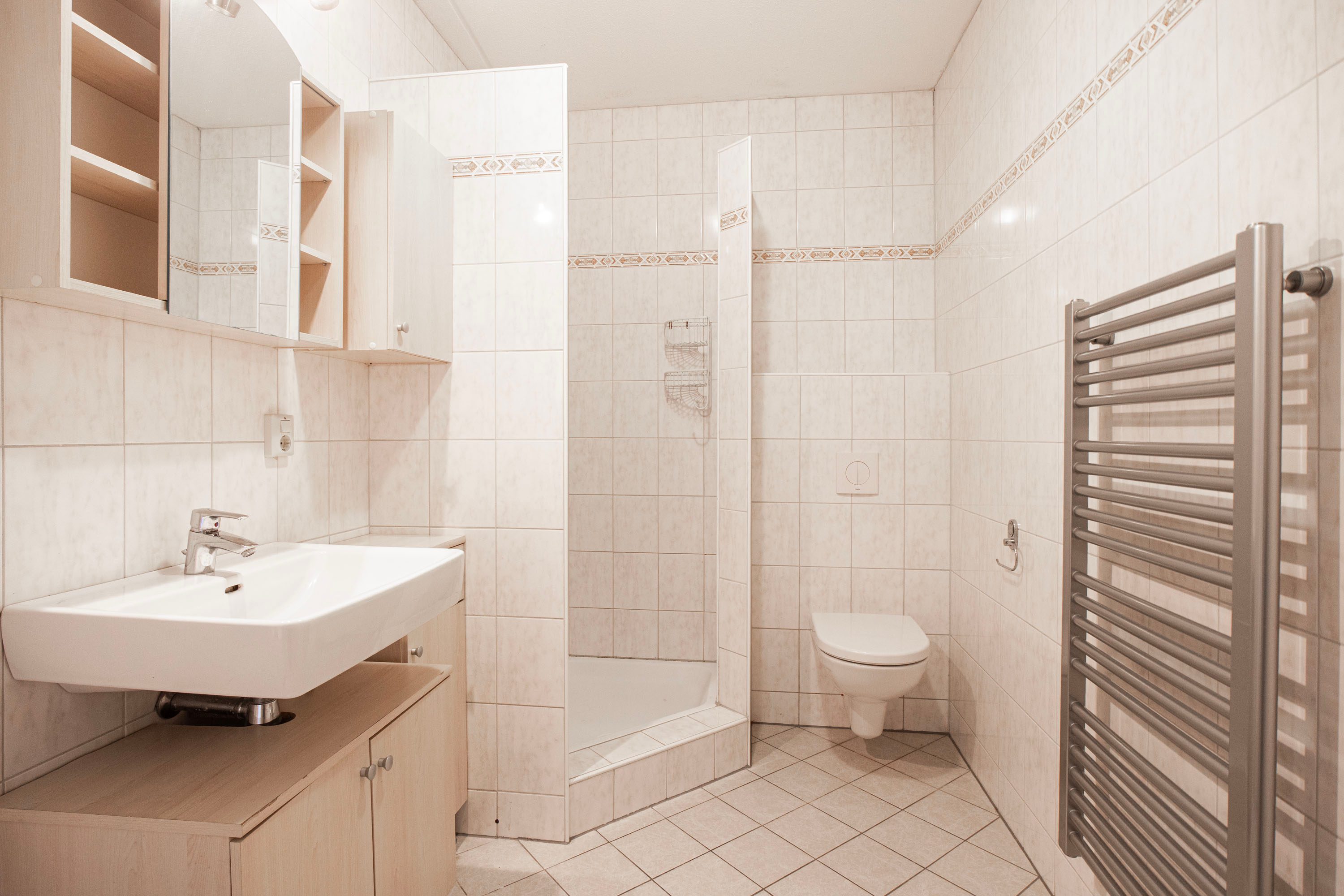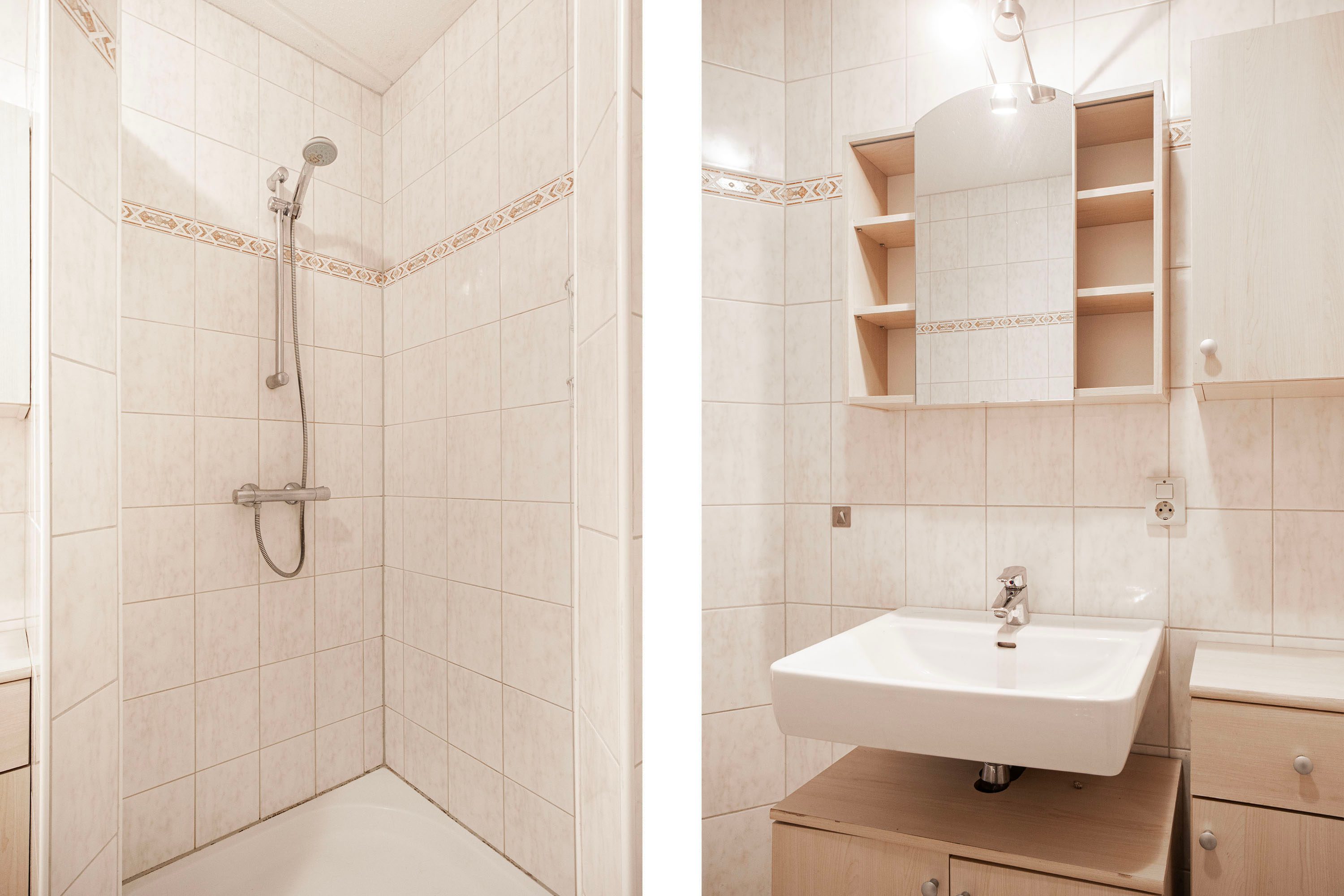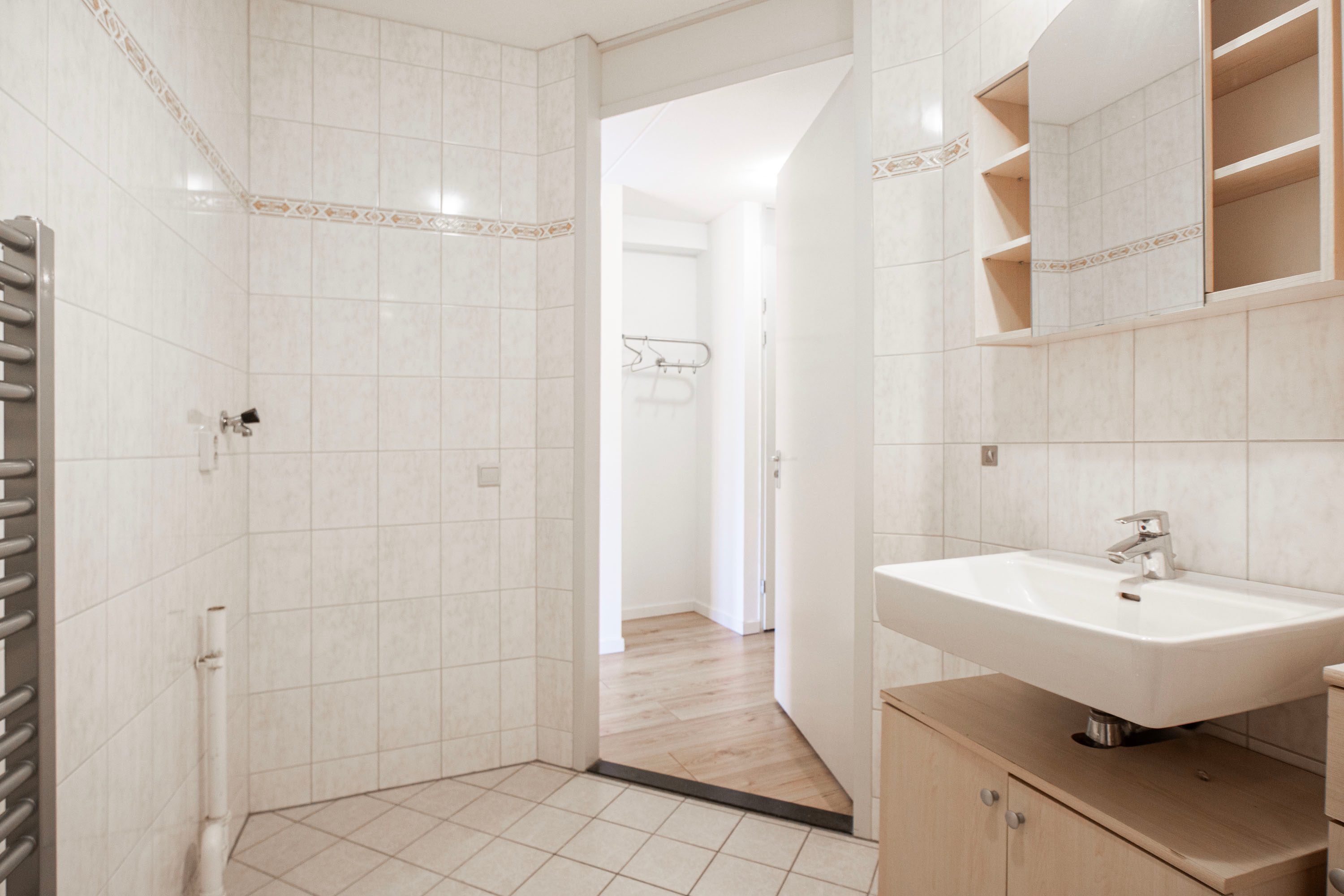 De badkamer (ca. 6 m²) bevindt zich tussen de woonkamer en slaapkamer en is volledig betegeld, wat zorgt voor eenvoudig onderhoud. De ruimte is voorzien van een douche, wastafel met meubel, toilet, designradiator en een aansluiting voor de wasmachine. Het wastafelmeubel biedt daarbij praktische extra opbergruimte.