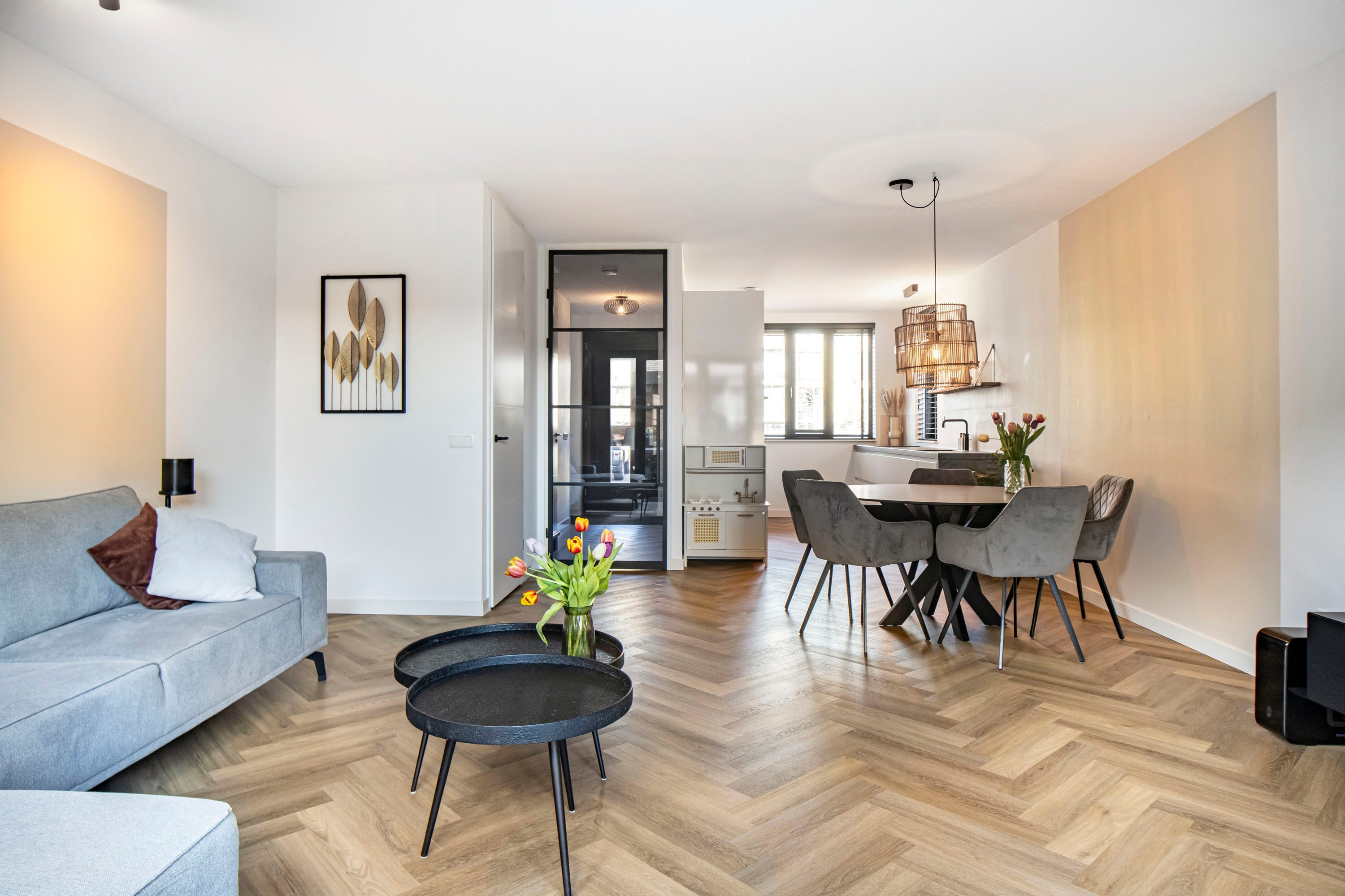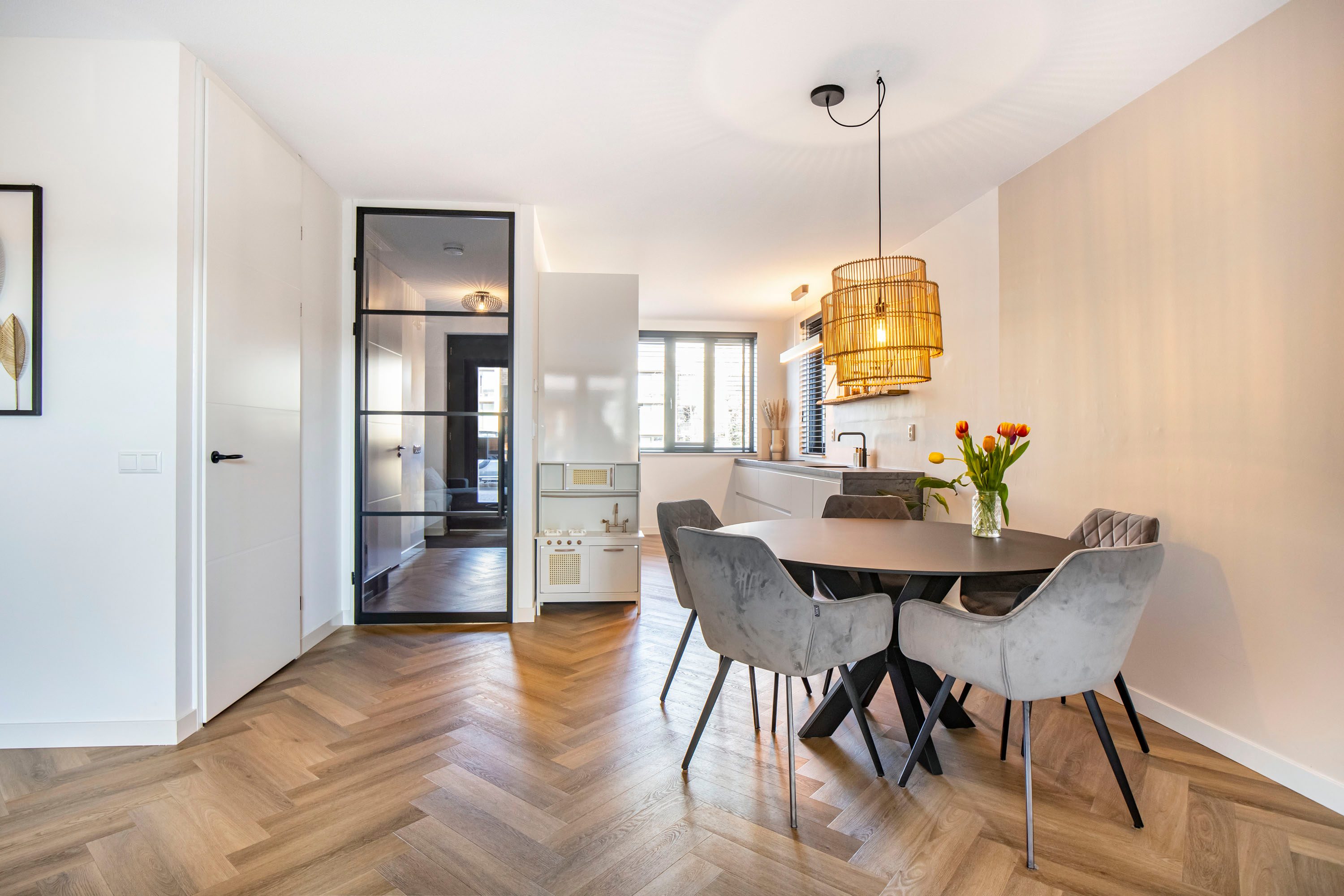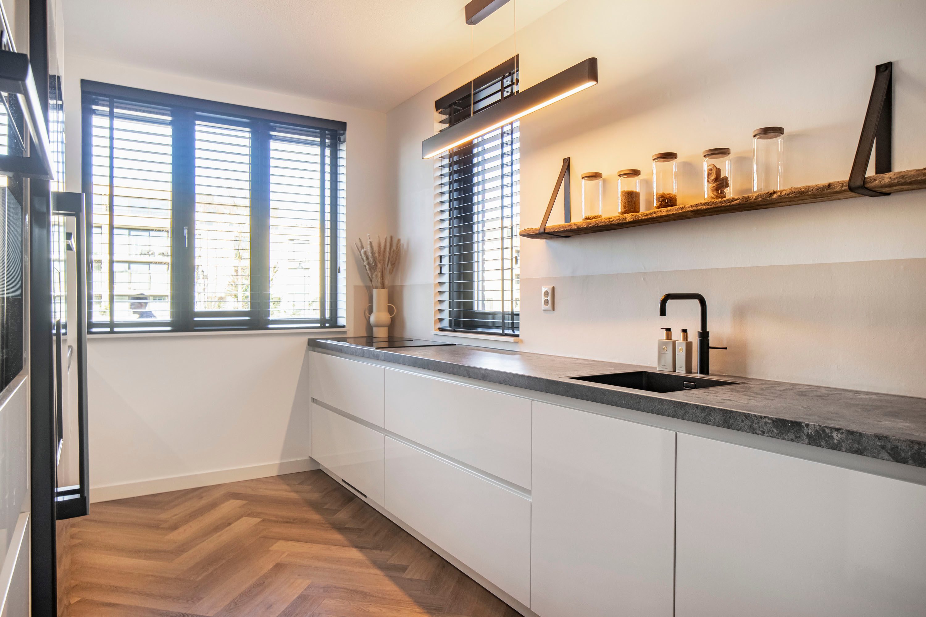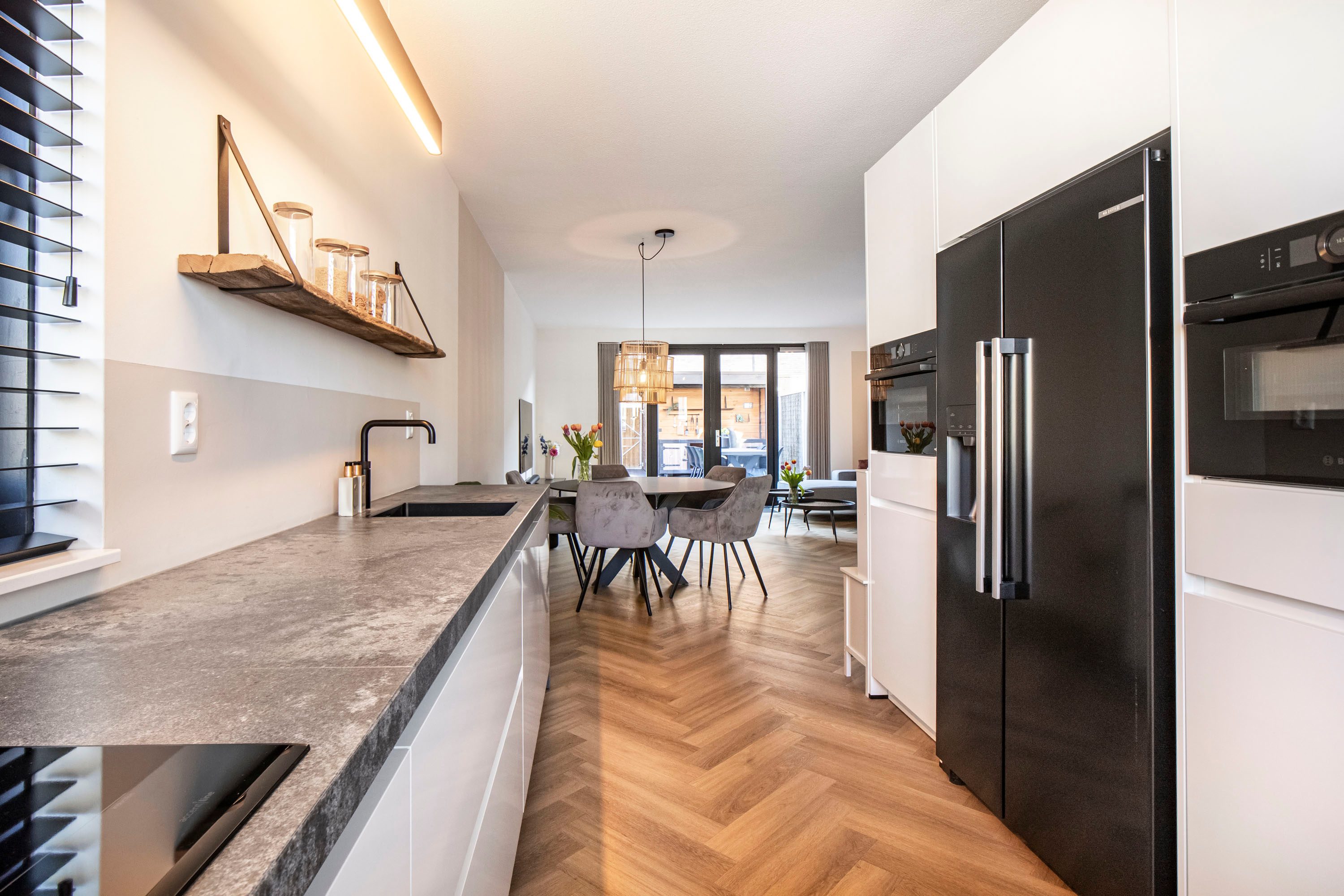 Via de entree kom je binnen in de hal met meterkast, moderne toiletruimte en de trapopgang naar de eerste verdieping. Via een stijlvolle taatsdeur bereik je de leefruimte. De woonkamer bevindt zich aan de achterzijde van de woning en kijkt uit op de tuin. Dankzij de grote ramen en de openslaande deuren voelt deze ruimte licht en ruim aan. Aan de voorzijde van de woning bevindt zich de moderne keuken. Deze is uitgerust met diverse inbouwapparatuur van Bosch, waaronder een inductiekookplaat, magnetron, combi-oven en vaatwasser. Daarnaast is de keuken voorzien van een Quooker. Onder de trap bevindt zich bovendien een praktische trapkast voor extra voorraad of huishoudelijke spullen. De gehele begane grond is voorzien van vloerverwarming, waardoor je hier altijd comfortabel woont.