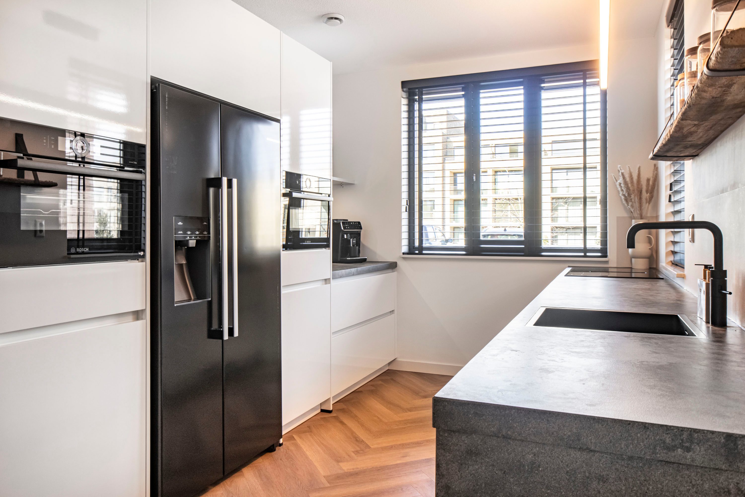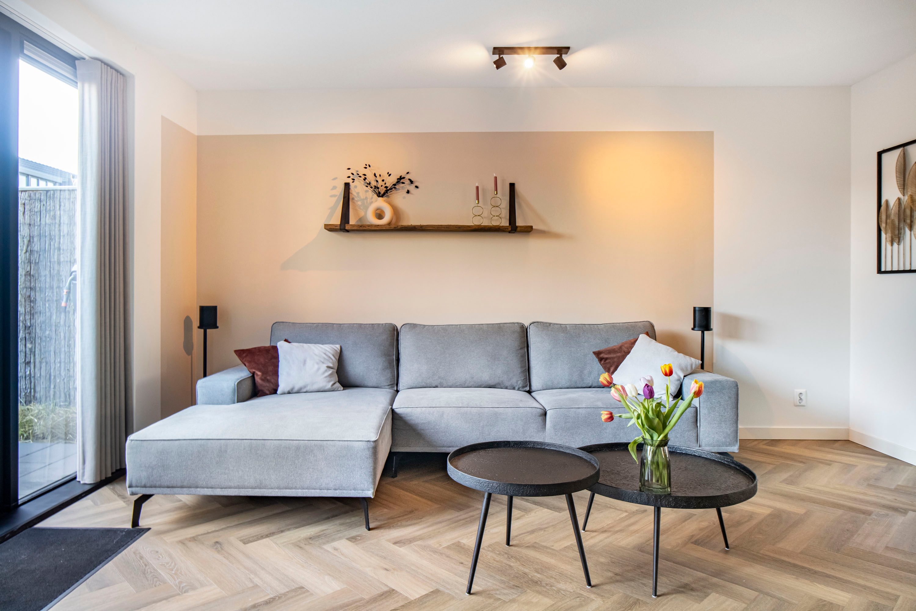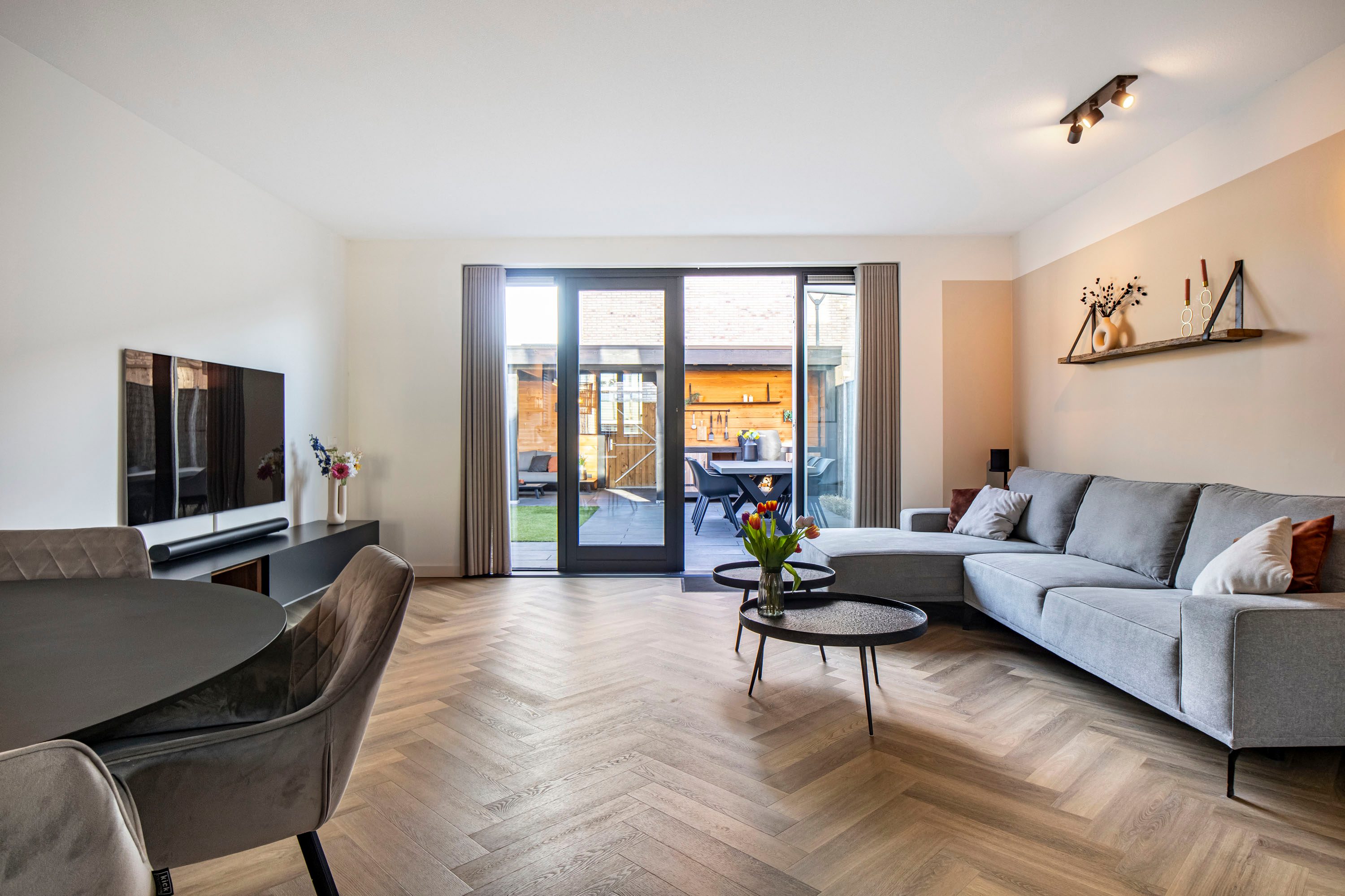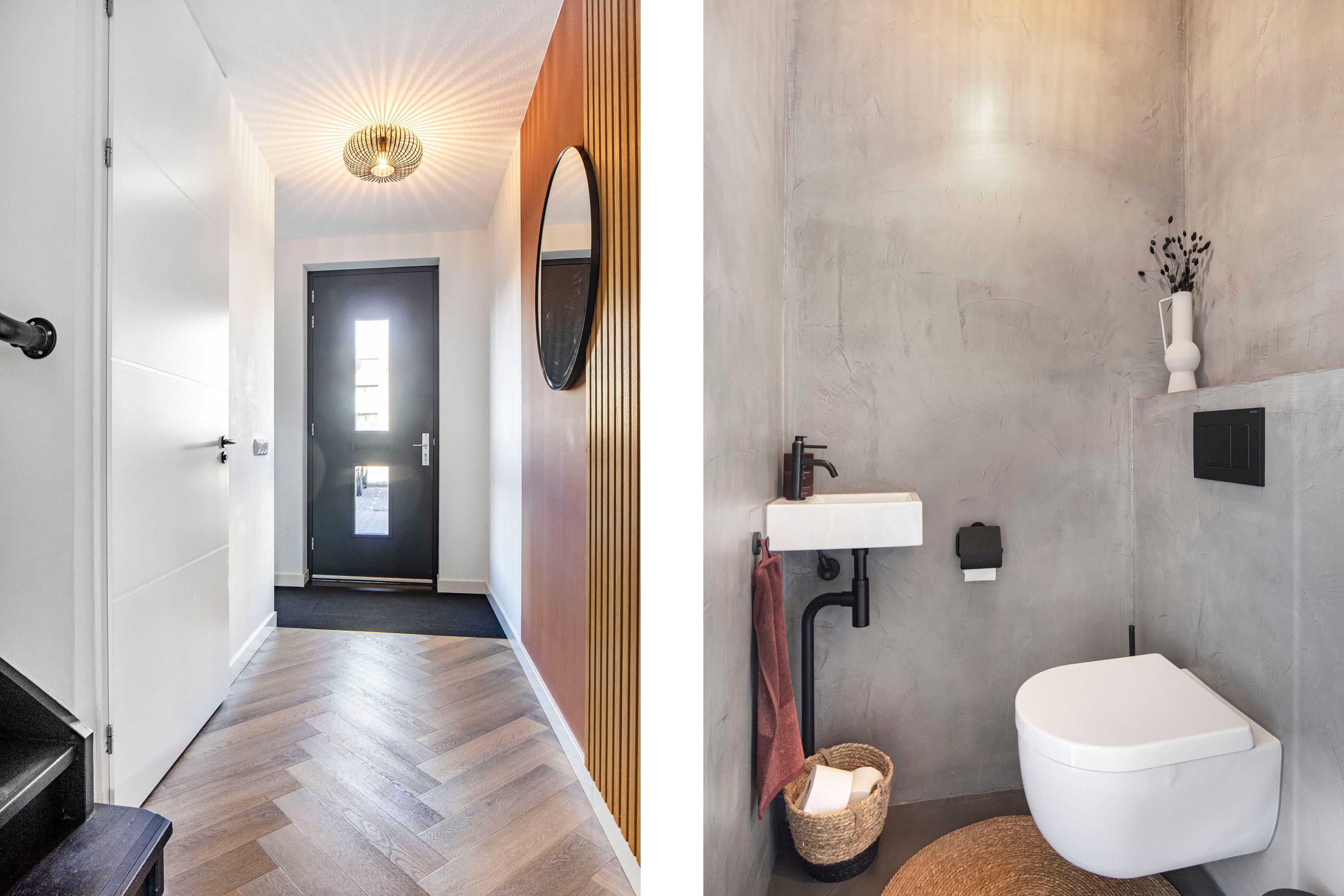 Via de entree kom je binnen in de hal met meterkast, moderne toiletruimte en de trapopgang naar de eerste verdieping. Via een stijlvolle taatsdeur bereik je de leefruimte. De woonkamer bevindt zich aan de achterzijde van de woning en kijkt uit op de tuin. Dankzij de grote ramen en de openslaande deuren voelt deze ruimte licht en ruim aan. Aan de voorzijde van de woning bevindt zich de moderne keuken. Deze is uitgerust met diverse inbouwapparatuur van Bosch, waaronder een inductiekookplaat, magnetron, combi-oven en vaatwasser. Daarnaast is de keuken voorzien van een Quooker. Onder de trap bevindt zich bovendien een praktische trapkast voor extra voorraad of huishoudelijke spullen. De gehele begane grond is voorzien van vloerverwarming, waardoor je hier altijd comfortabel woont.
