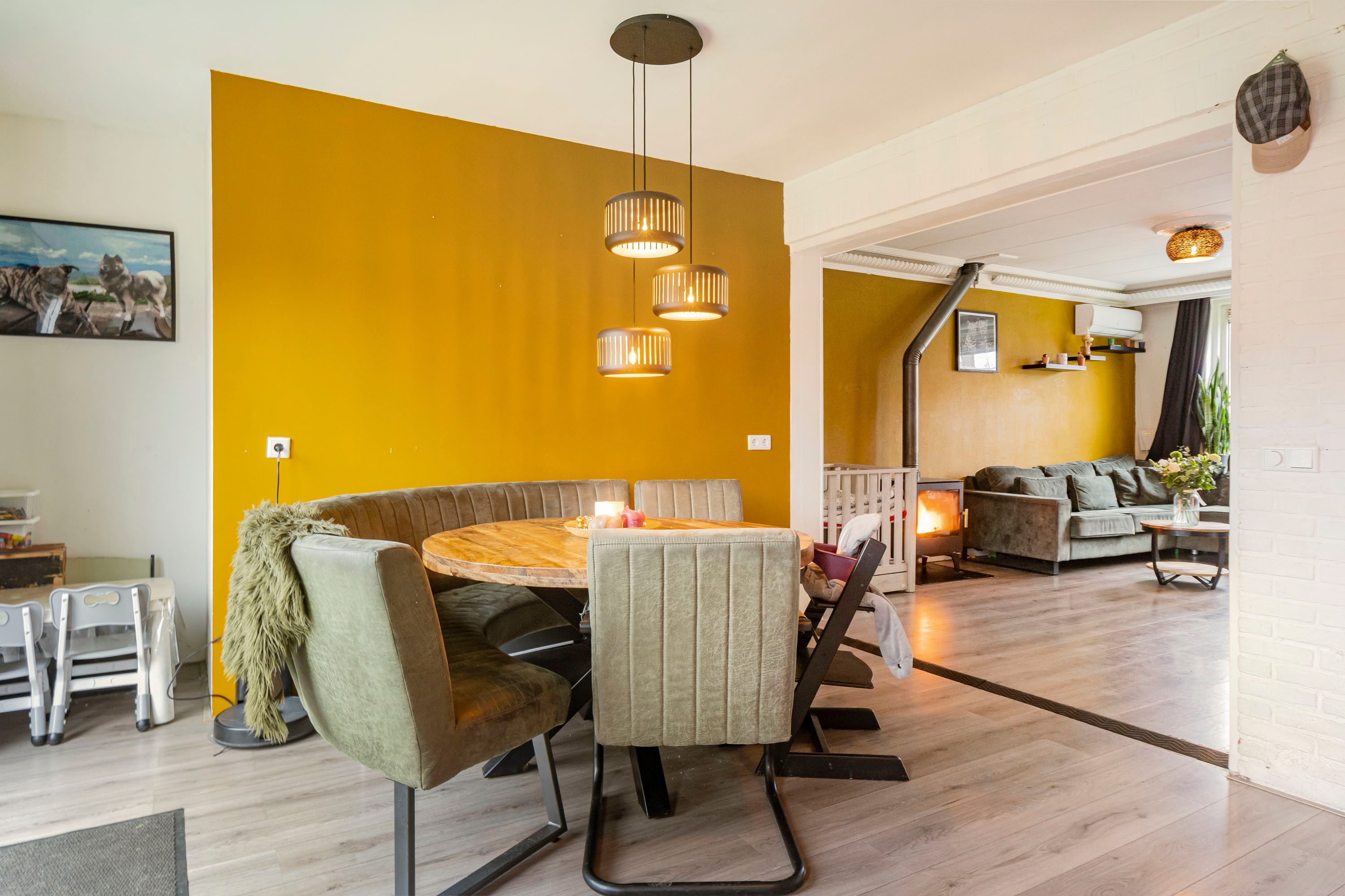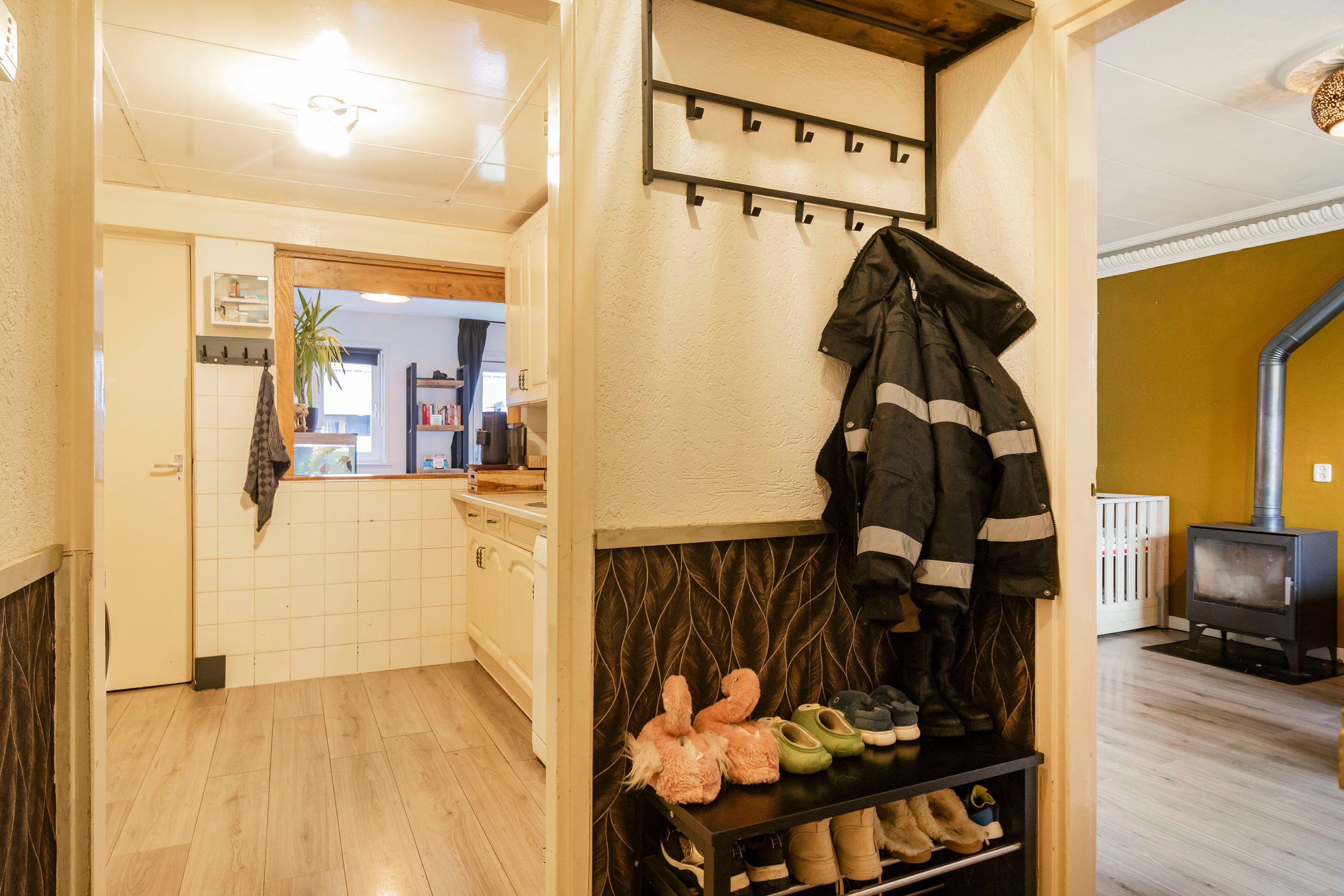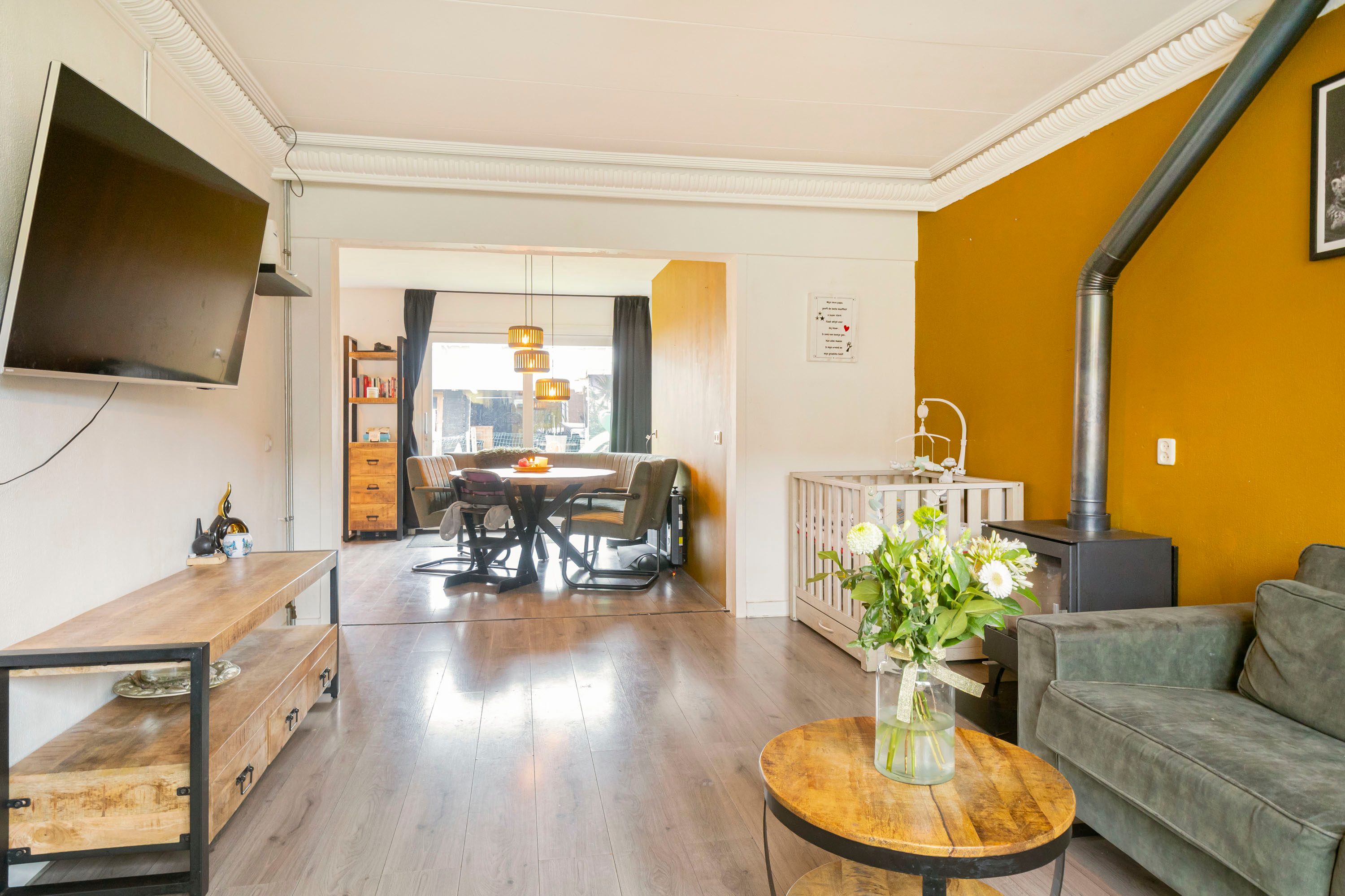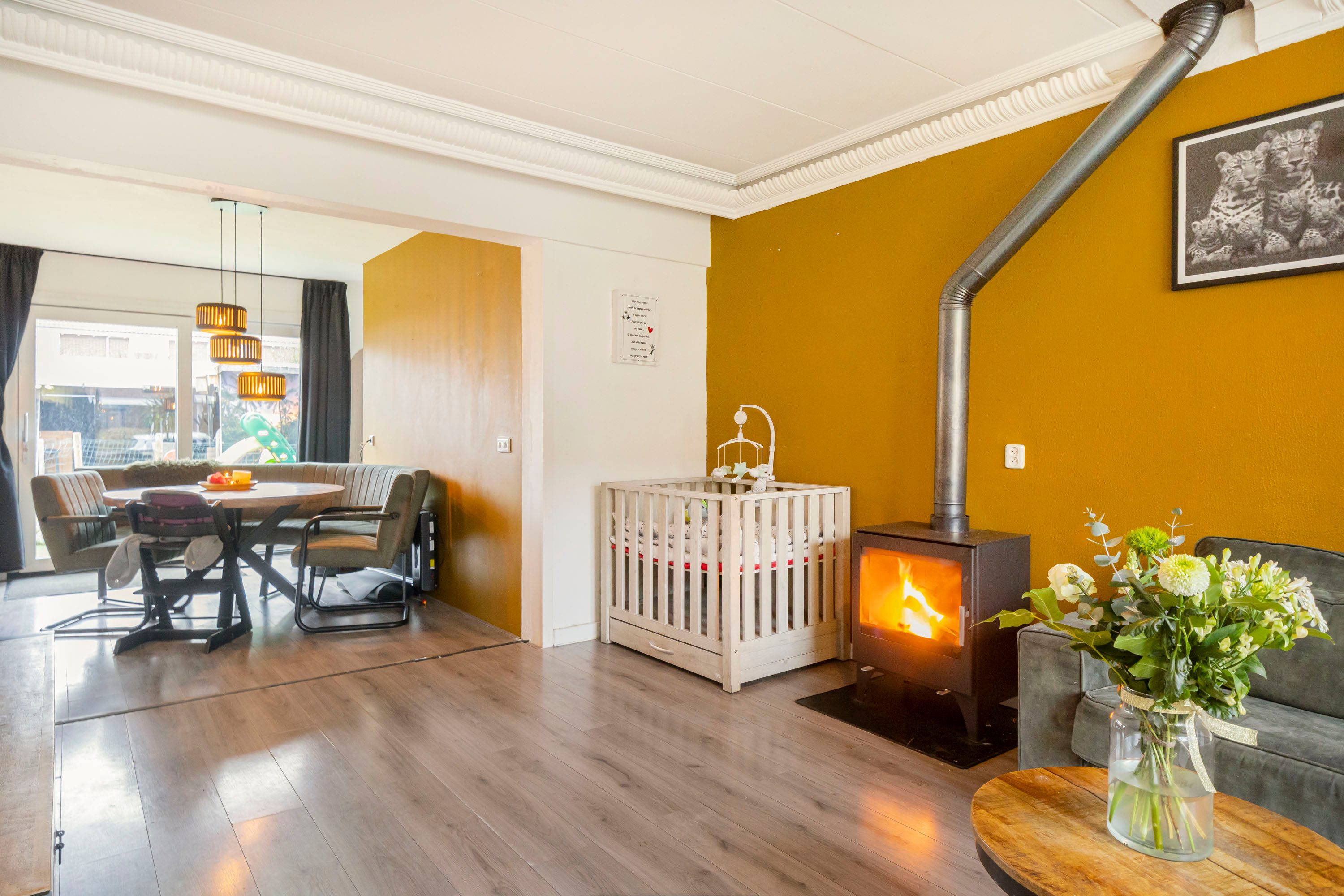 Via de entree kom je binnen in de hal met toegang tot het toilet, de keuken en de trapopgang naar de eerste verdieping. De woonkamer is direct een fijne verrassing: door de gerealiseerde uitbouw is een royale leefruimte ontstaan van circa 10 meter diep. De houtkachel zorgt voor extra sfeer en warmte.