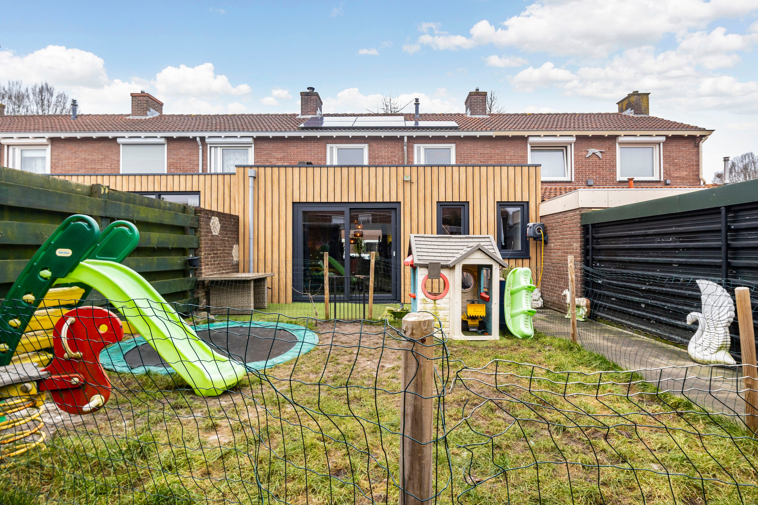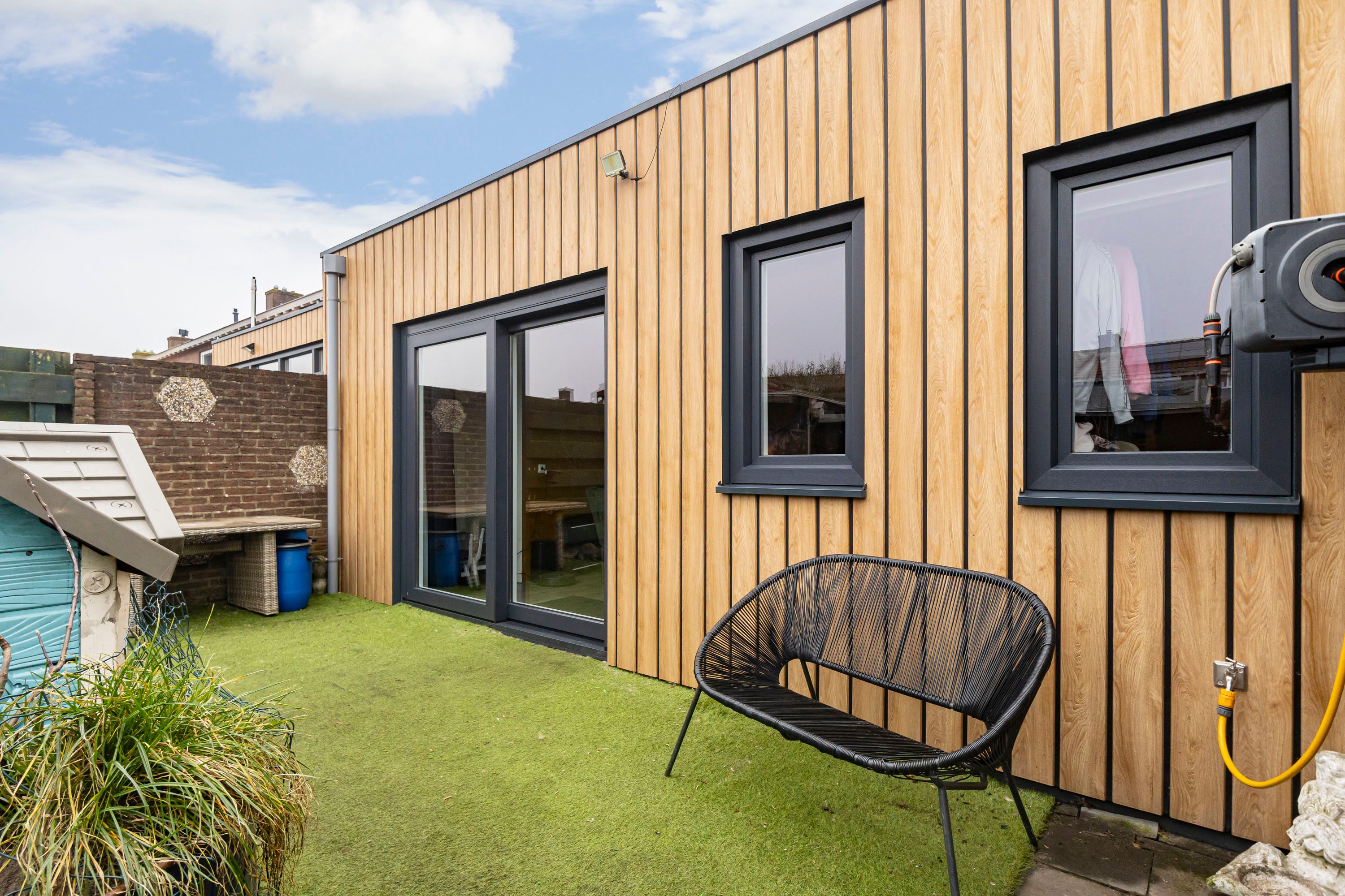 Via de schuifpui in de woonkamer bereik je de diepe achtertuin, gelegen op het noordoosten. Dankzij de diepte van de tuin zijn er meerdere mogelijkheden voor zitplekken, zowel in de zon als in de schaduw.