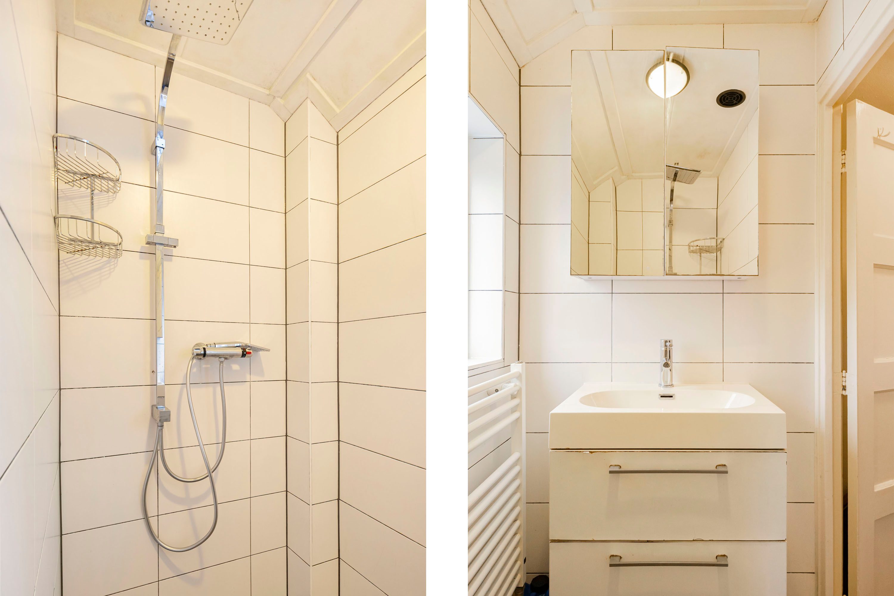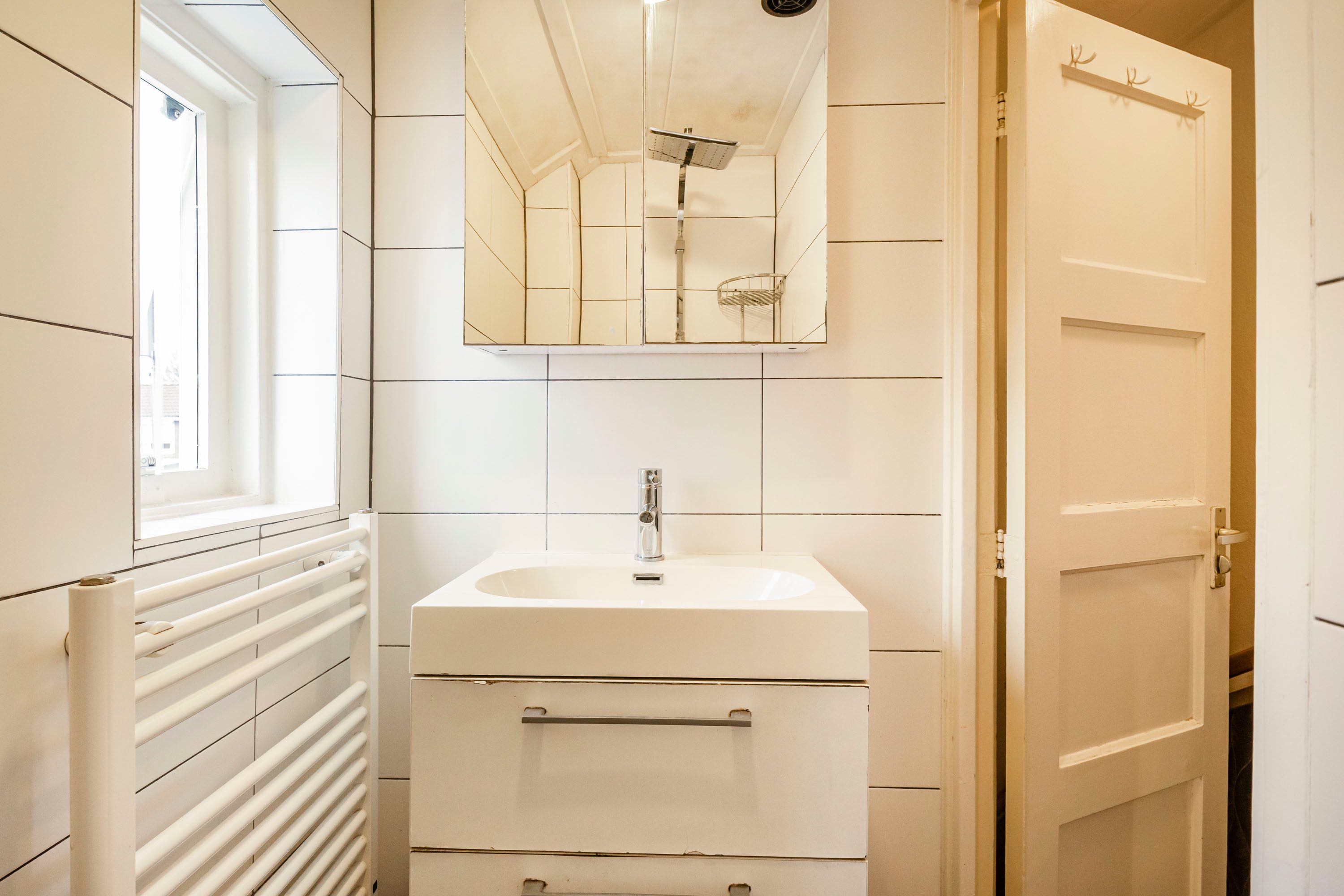 De badkamer is voorzien van een inloopdouche, wastafel met meubel, designradiator en een spiegelkast.
