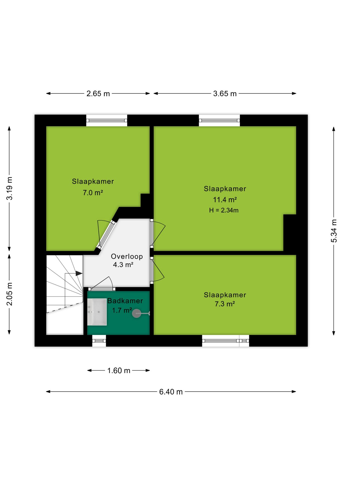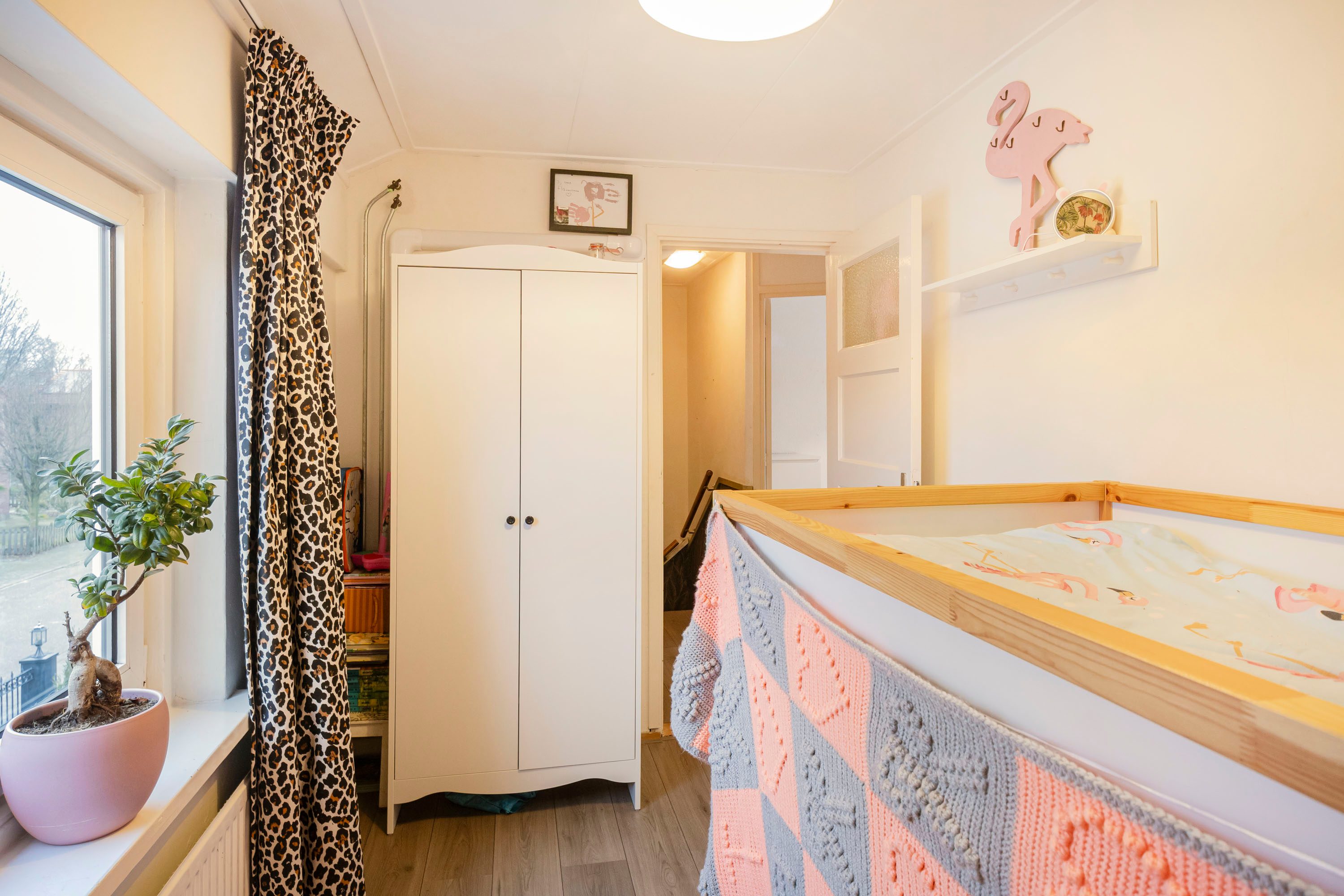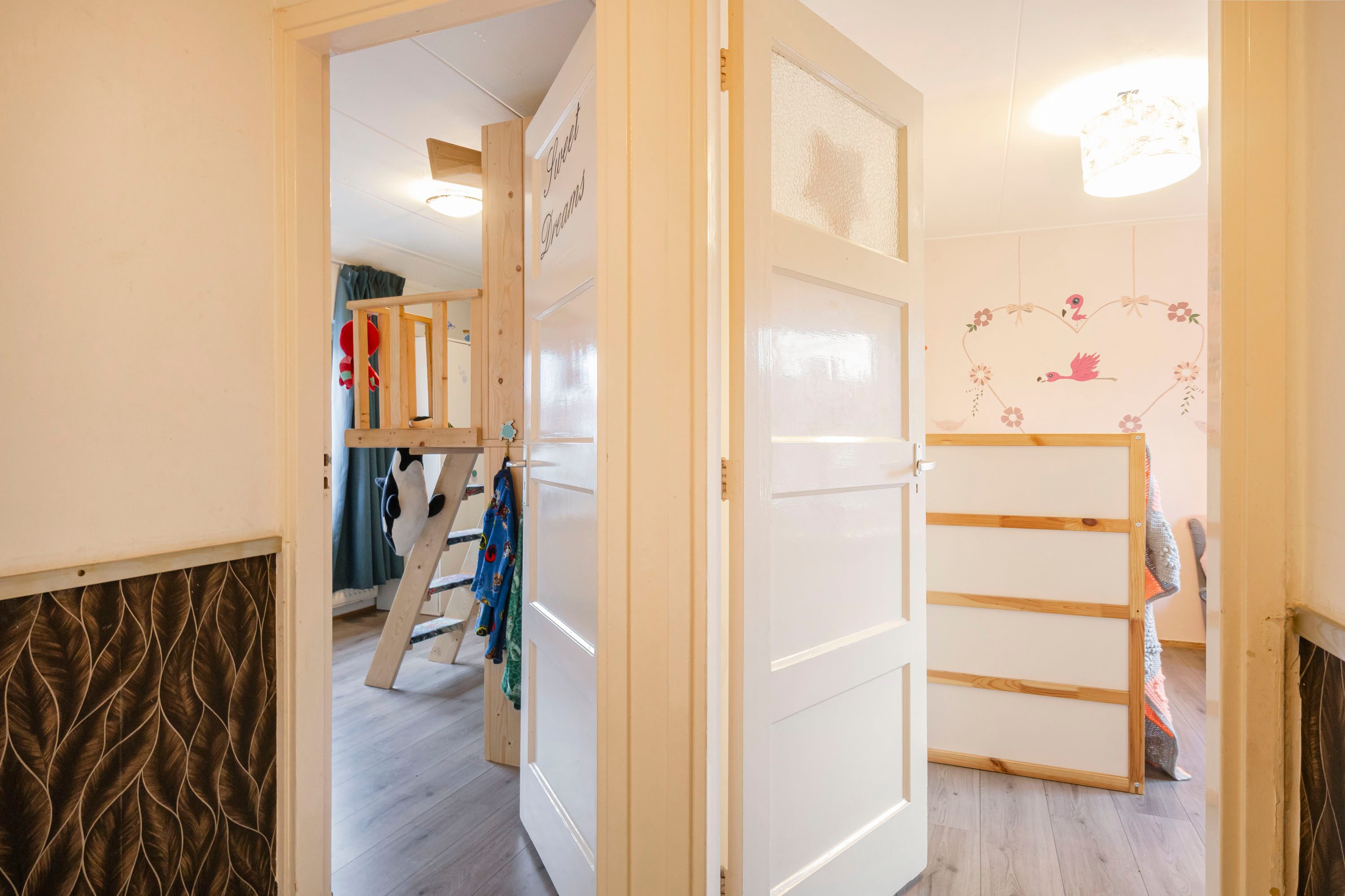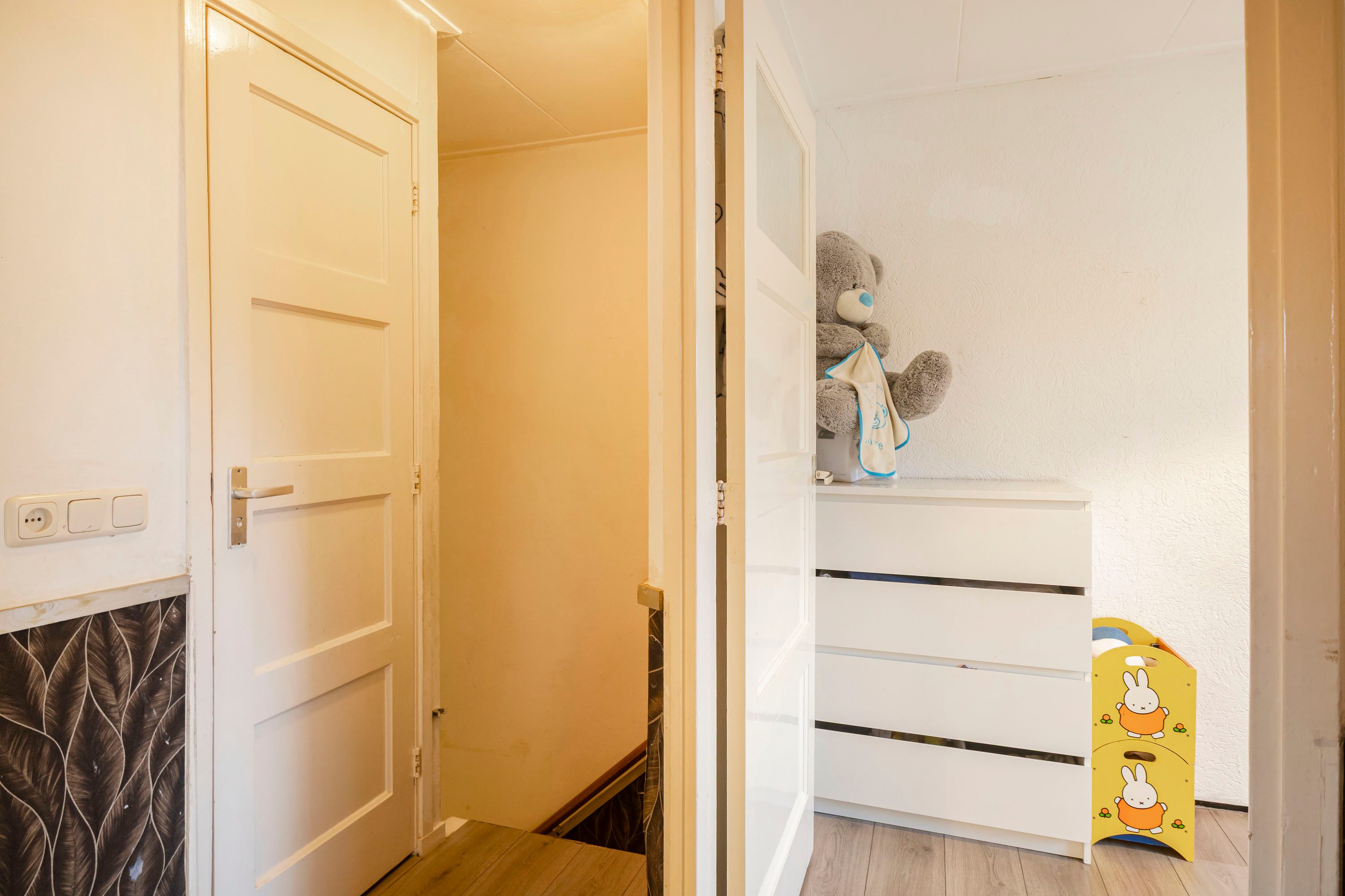 Op de eerste verdieping bevinden zich drie slaapkamers, waarvan één kamer van circa 12 m² en twee kamers van circa 7 m². De kamers zijn praktisch in te delen en geschikt als slaapkamer, werk- of hobbyruimte.