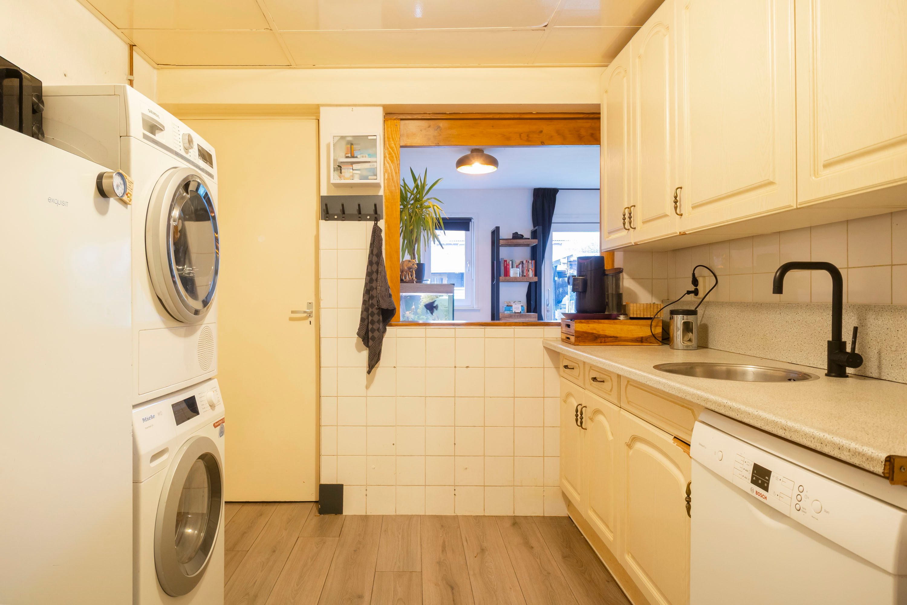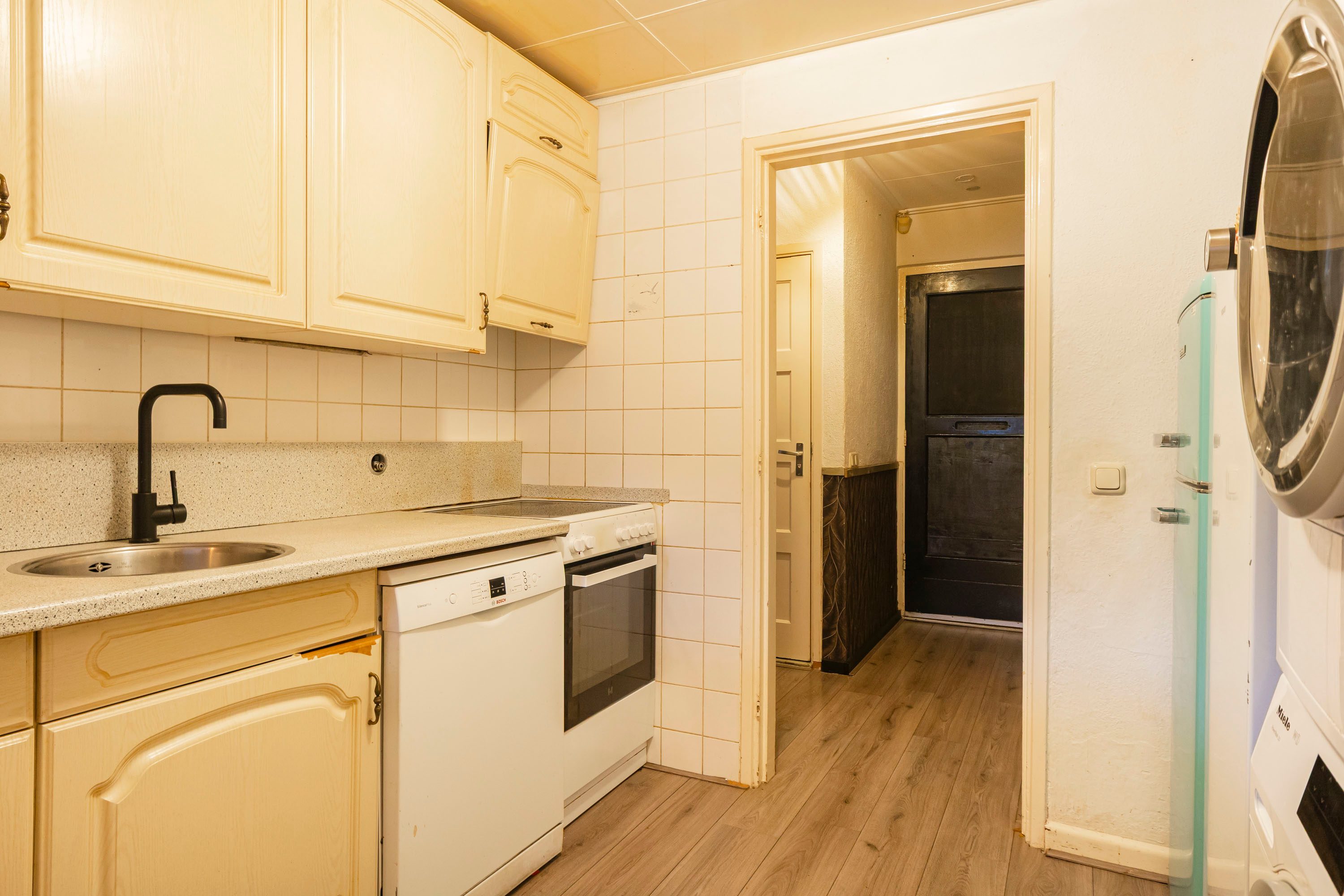 De keuken is uitgevoerd in een lichte kleurstelling en praktisch ingericht. Hier bevindt zich ook de wasmachineaansluiting. Vanuit de keuken heb je toegang tot een extra kamer op de begane grond, ideaal te gebruiken als slaapkamer, thuiswerkplek of berging.