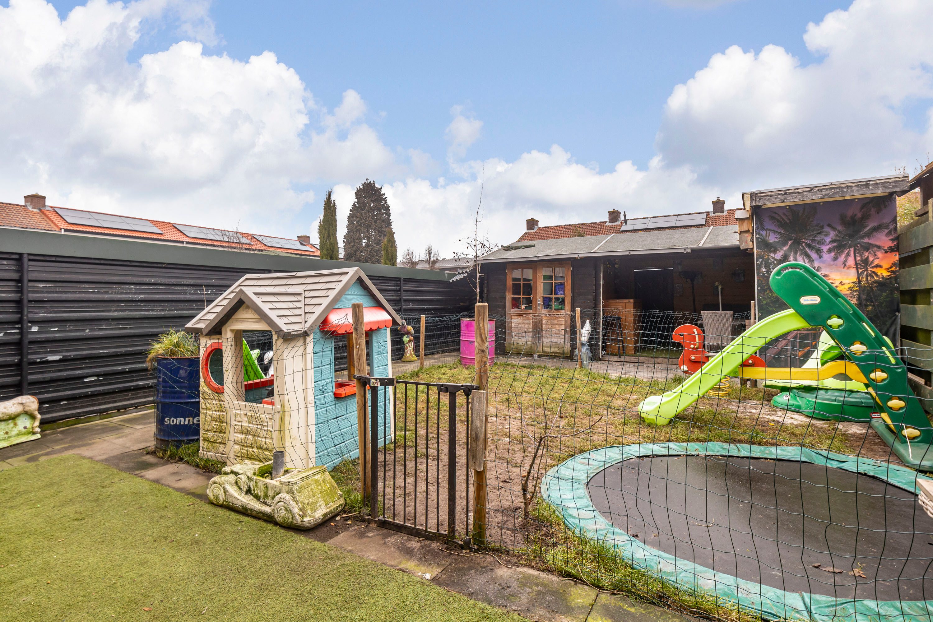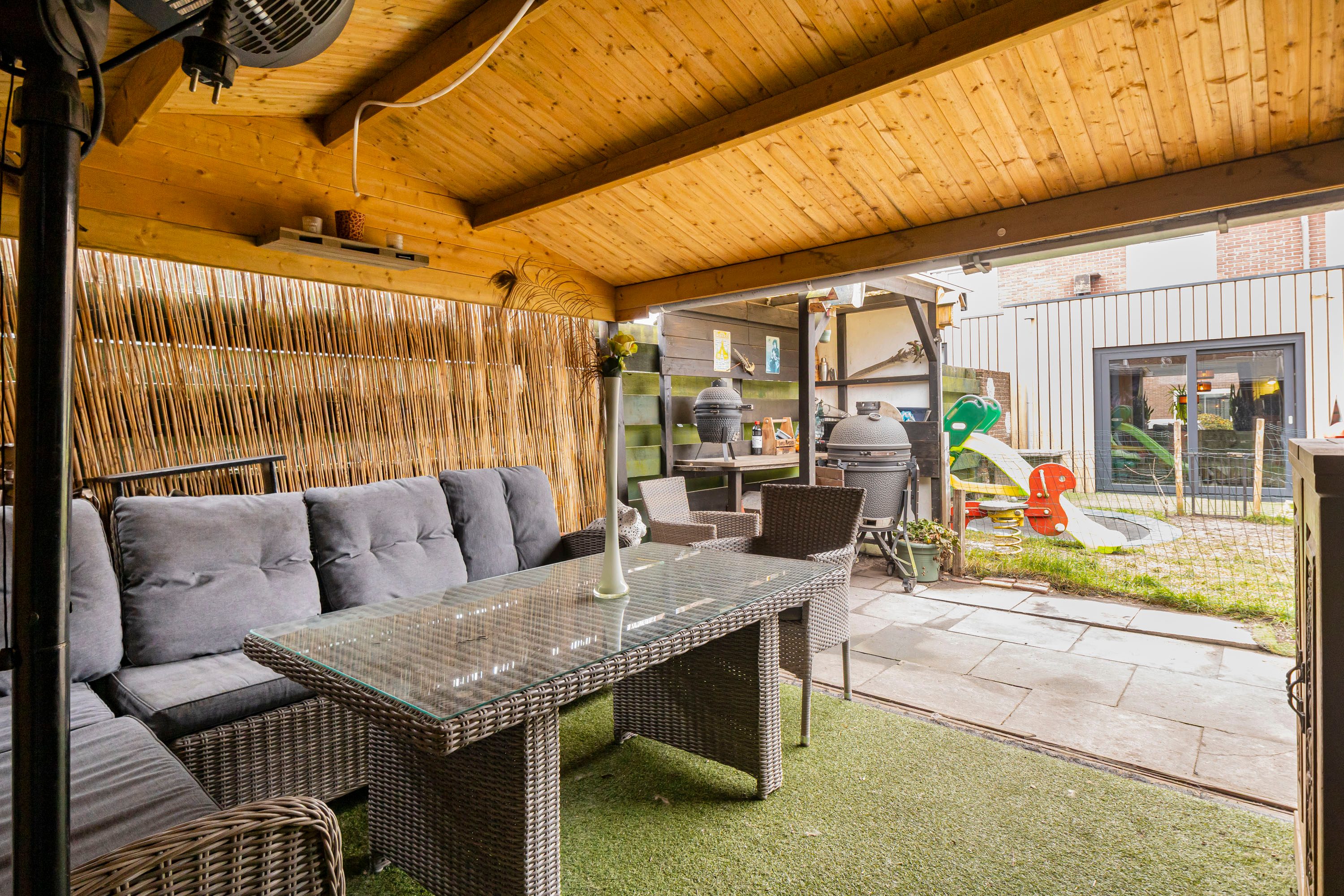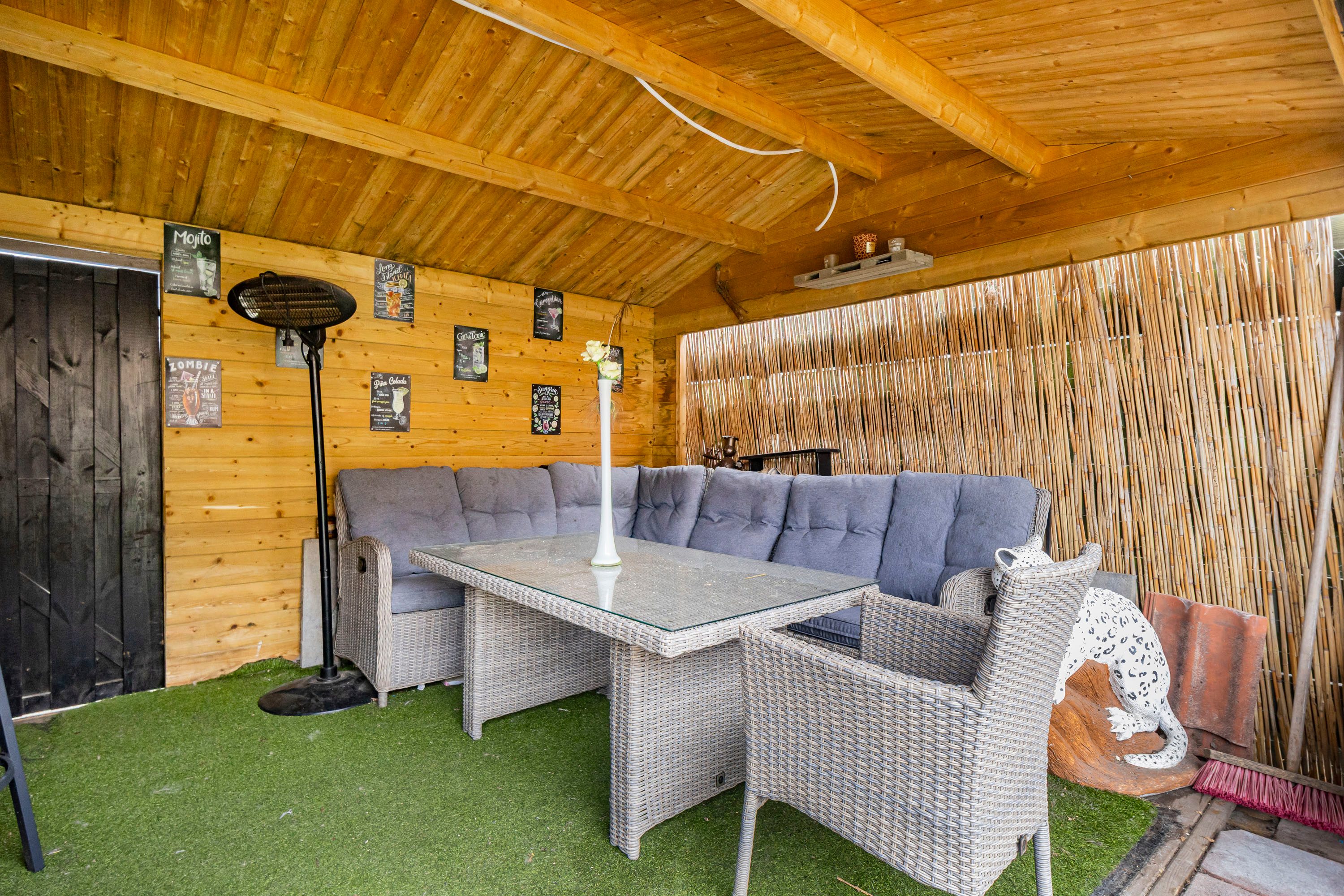 De tuin is bereikbaar via een achterom en je komt hierbij uit onder een overkapping, een fijne plek om ook bij minder mooi weer buiten te zitten. Daarnaast is er een houten berging aanwezig voor het opbergen van fietsen en tuingereedschap.