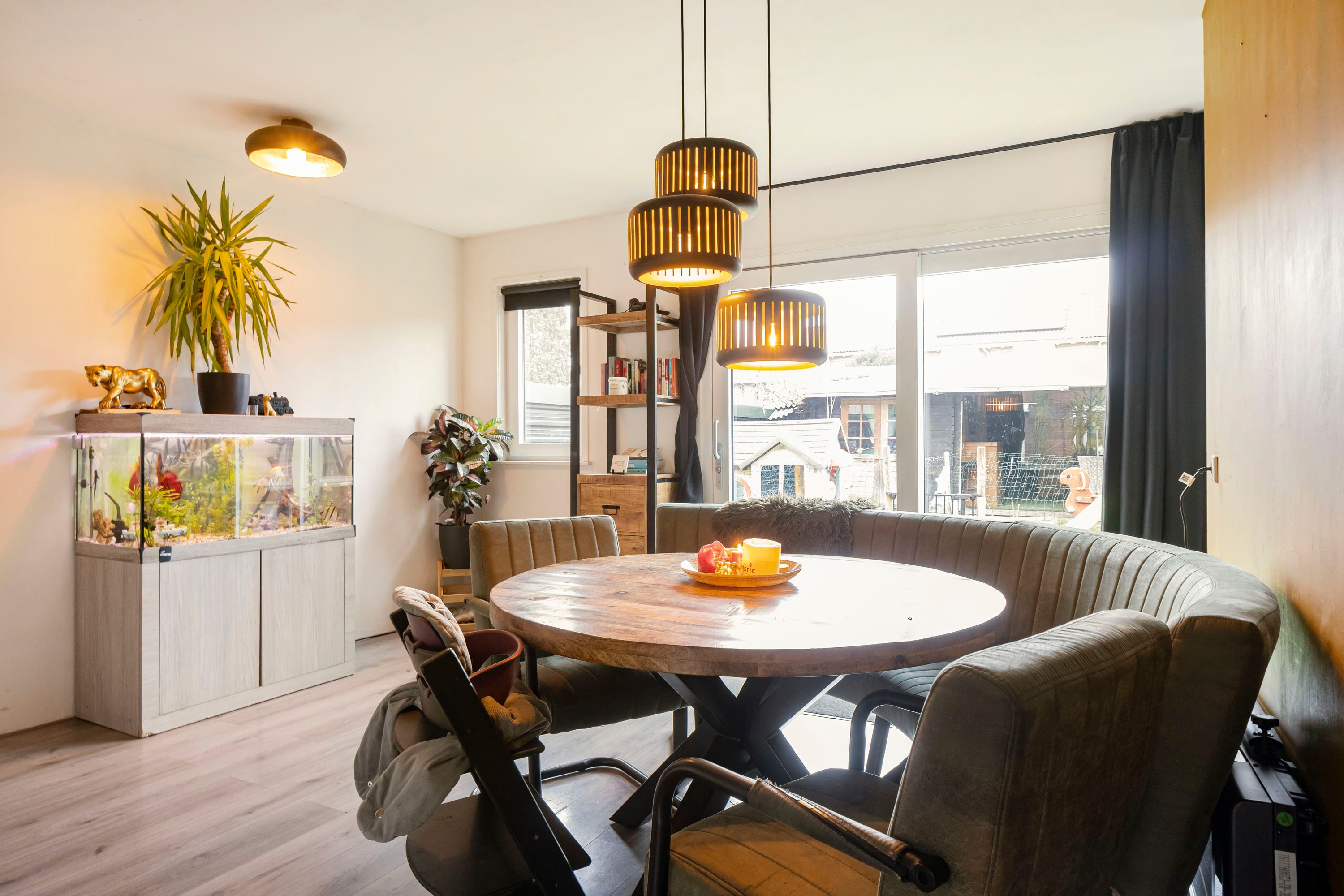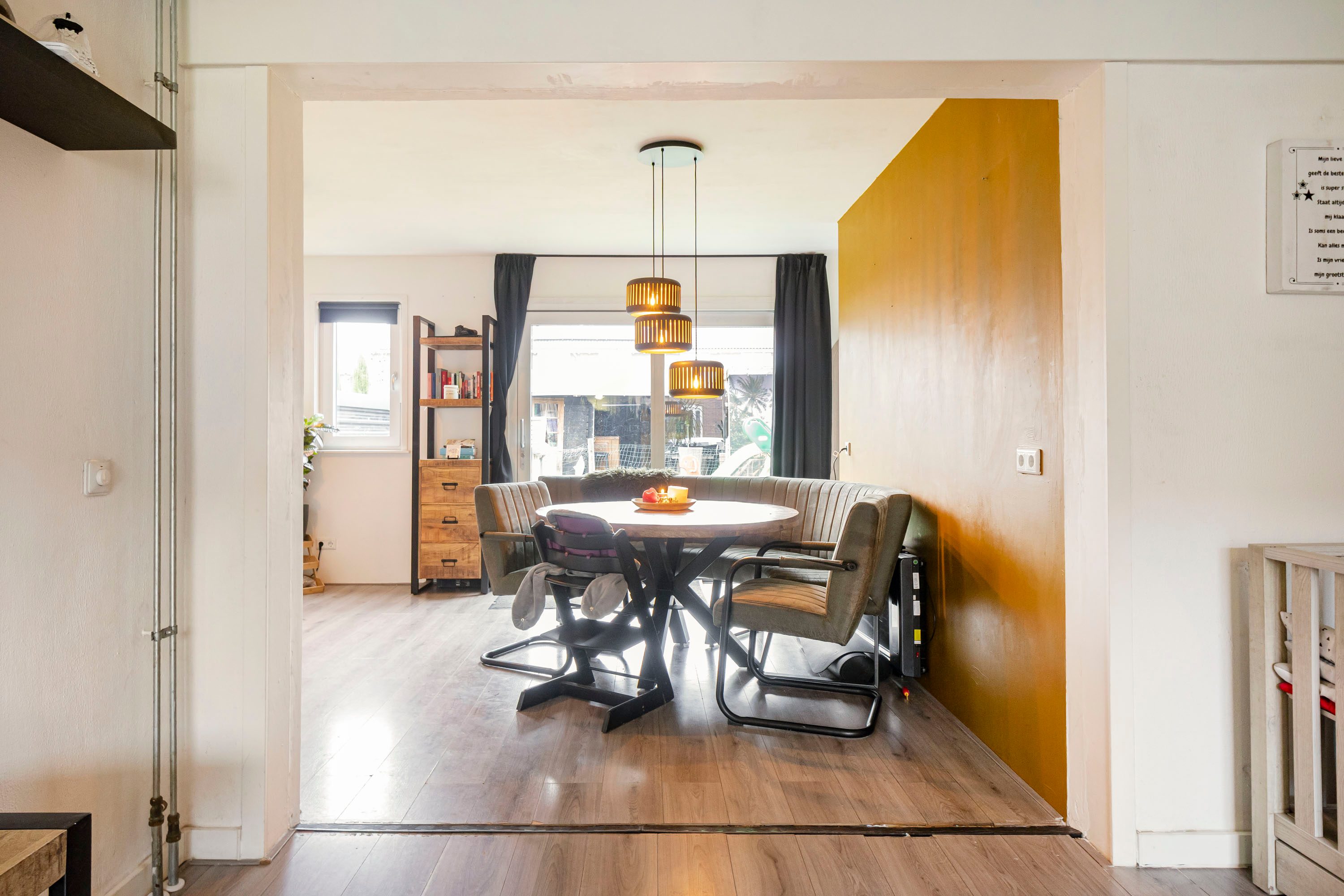 De uitbouw is circa drie jaar geleden gerealiseerd en voorzien van een kunststof schuifpui, waardoor binnen en buiten mooi in elkaar overlopen. Er is volop ruimte voor zowel een comfortabele zithoek als een grote eettafel.