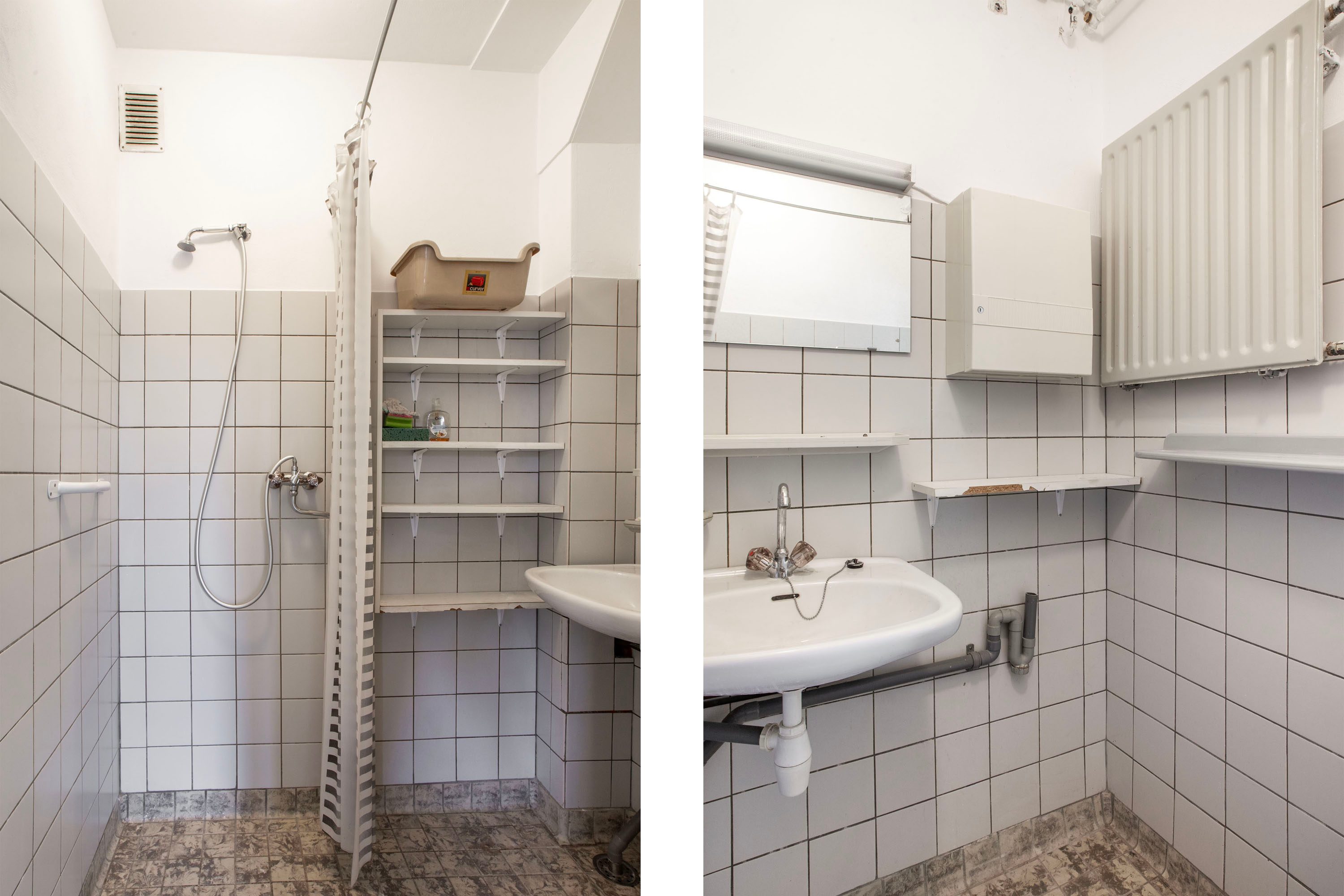 De badkamer is eenvoudig uitgevoerd met een douche en een wastafel. Ideaal voor kopers die deze ruimte graag omvormen tot een moderne, comfortabele badkamer.