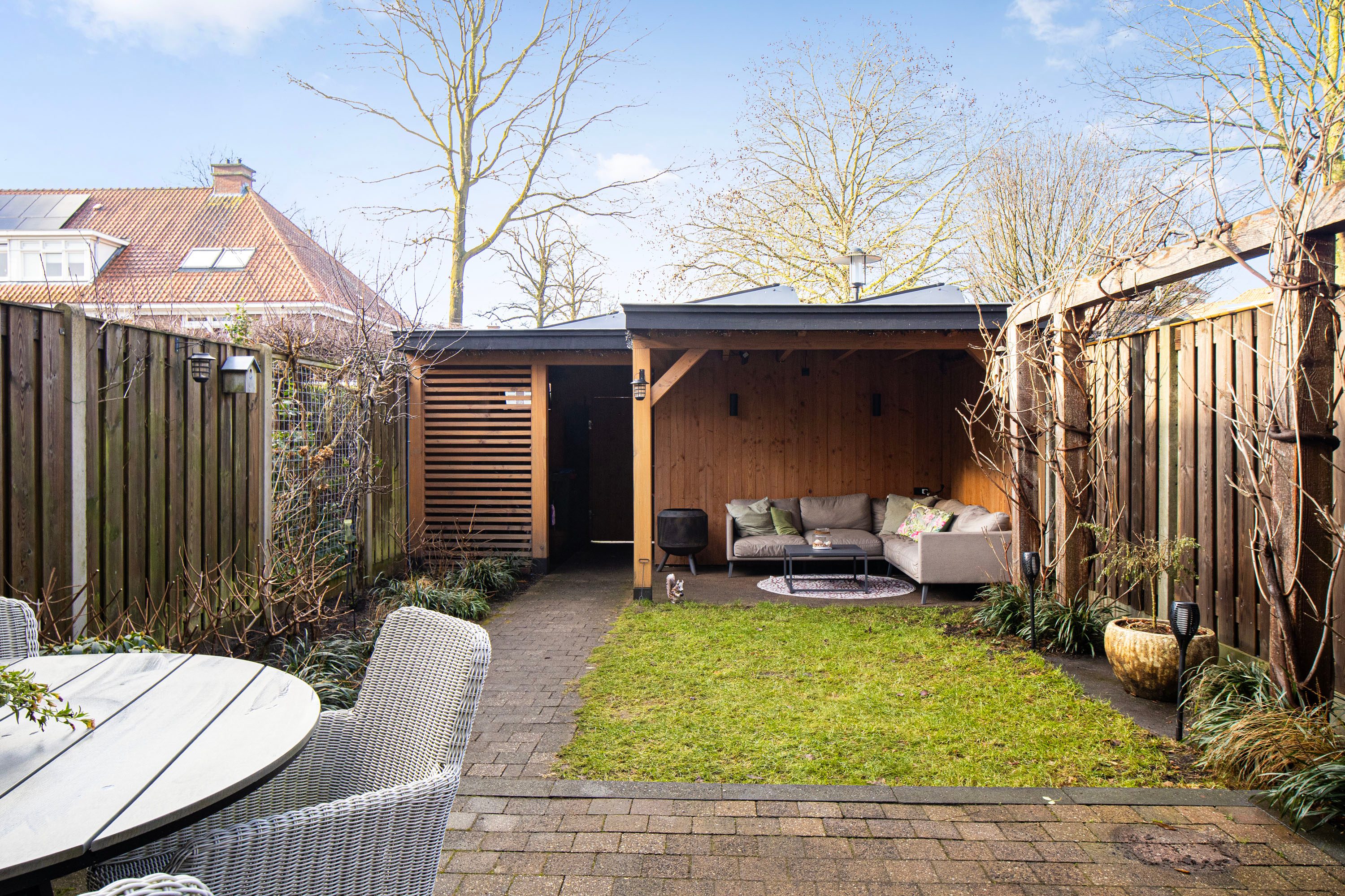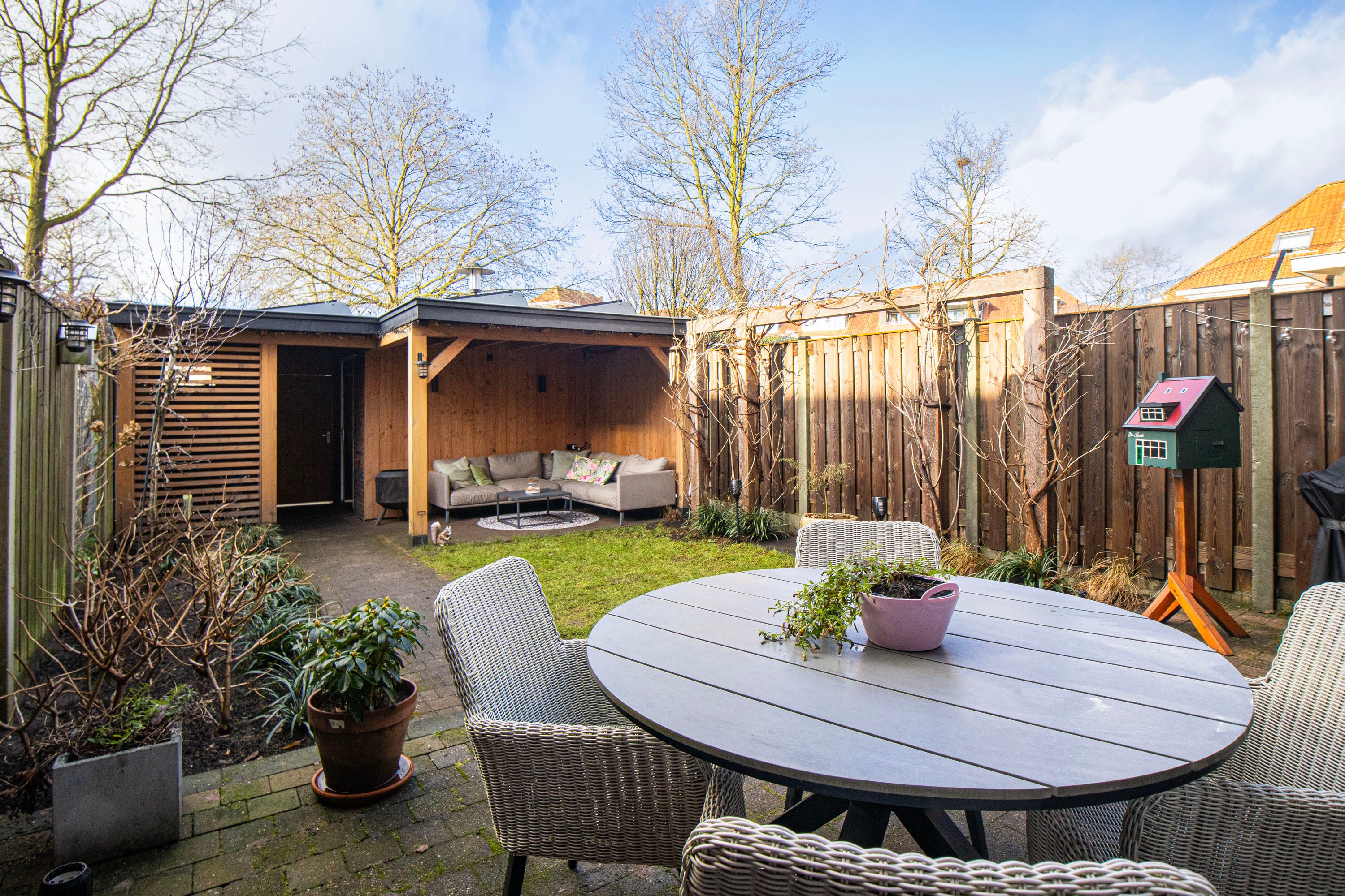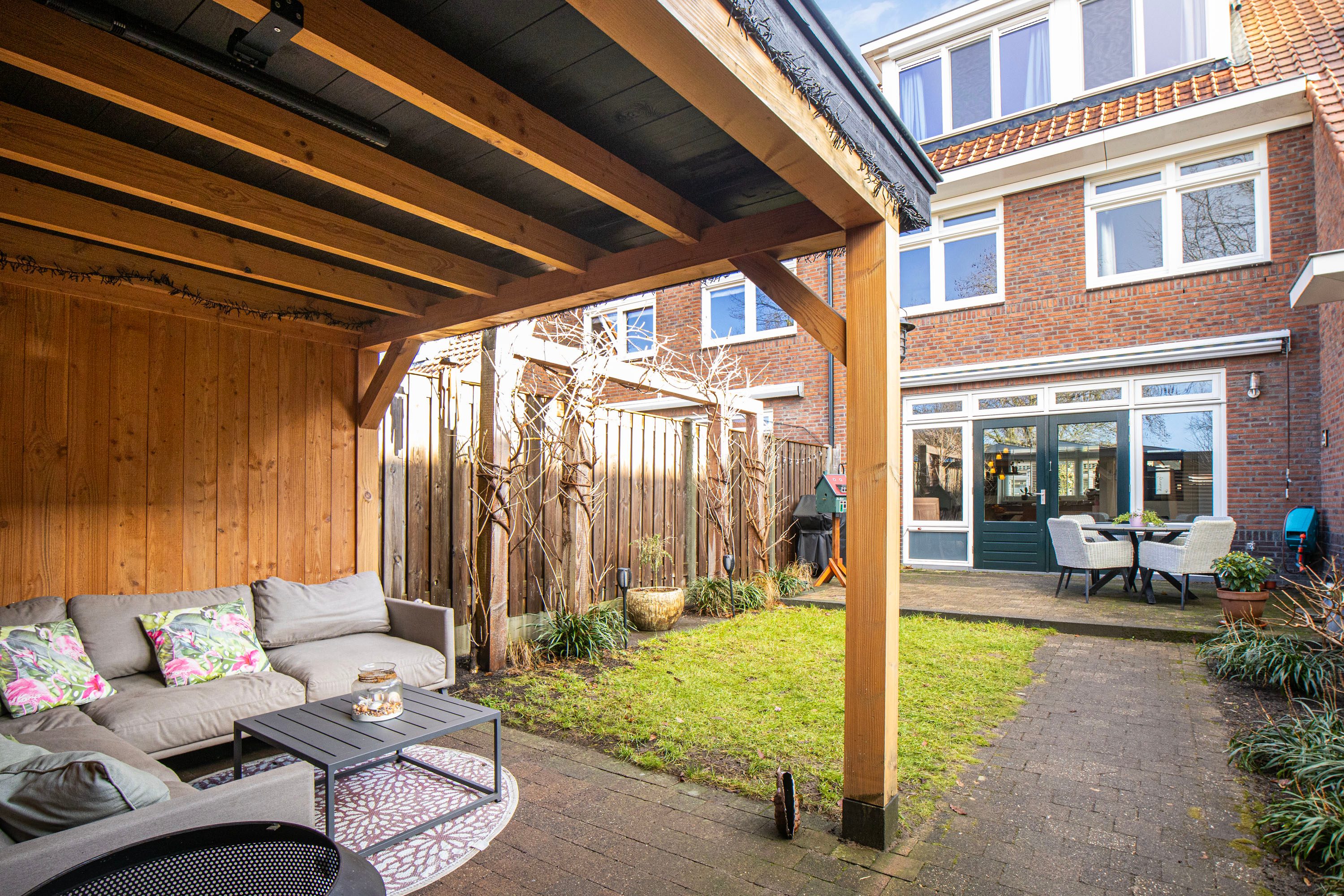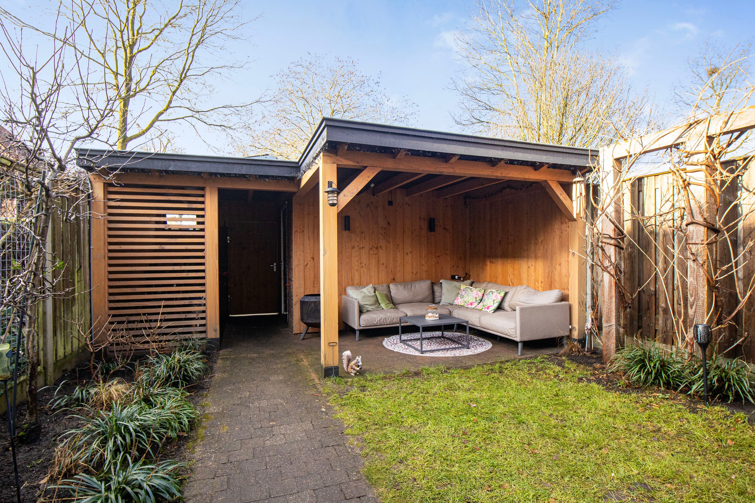 De openslaande tuindeuren geven toegang tot de royale achtertuin op het zuidwesten. De tuin biedt volop ruimte voor een comfortabele loungehoek onder de overkapping/veranda van 7,5 m², evenals een speelhoek voor kinderen. Daarnaast is er een praktische berging van 7,6 m², ideaal voor fietsen en tuingereedschap. De tuin beschikt bovendien over een handige achterom, bijvoorbeeld voor de containers.