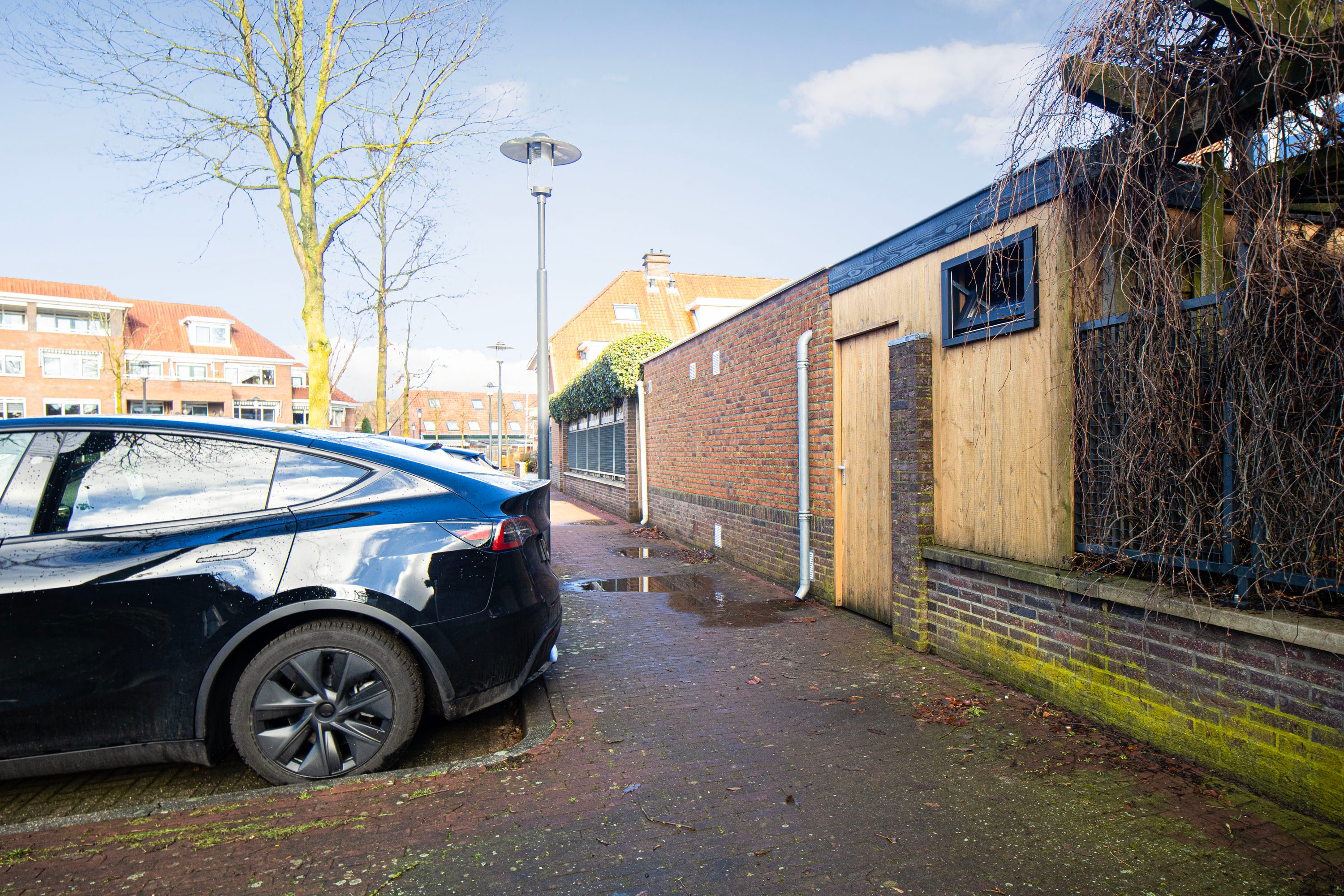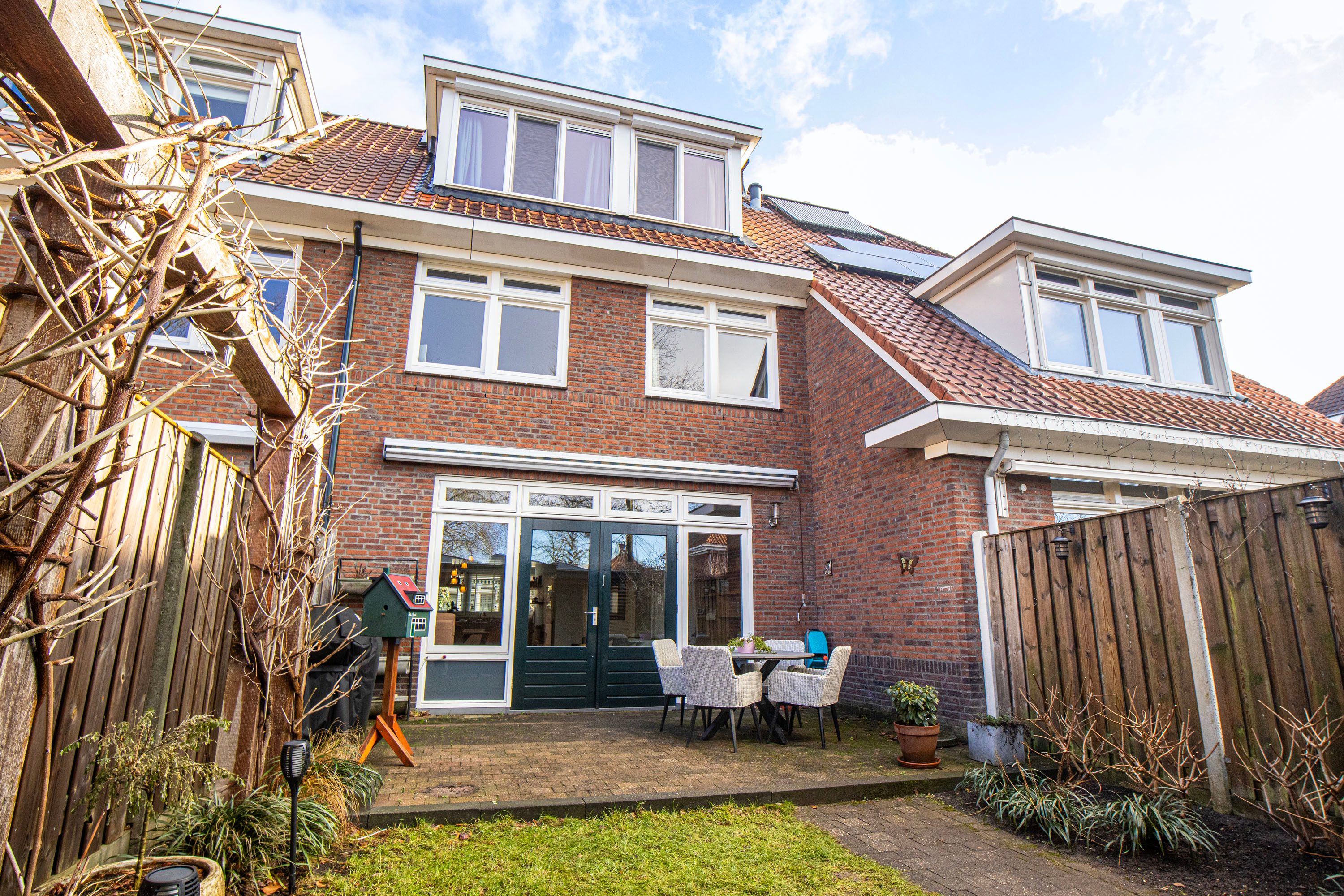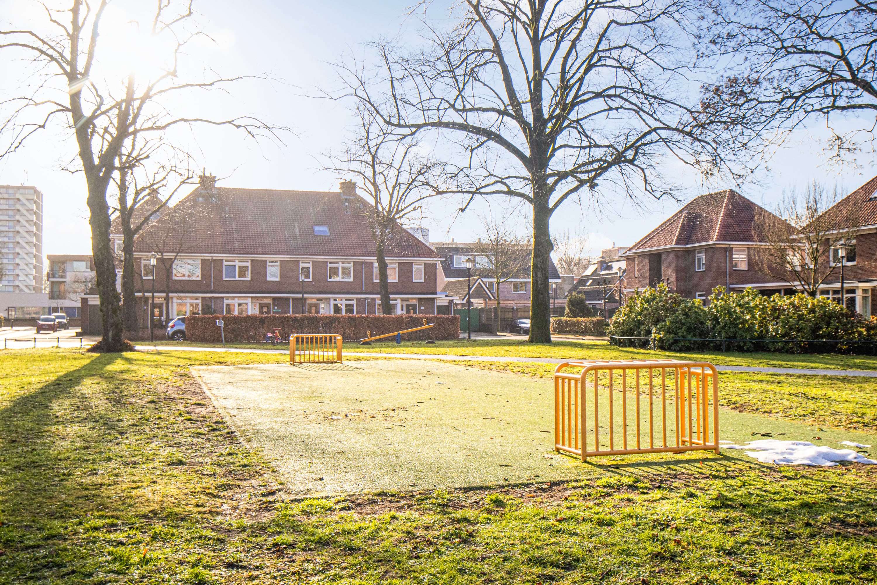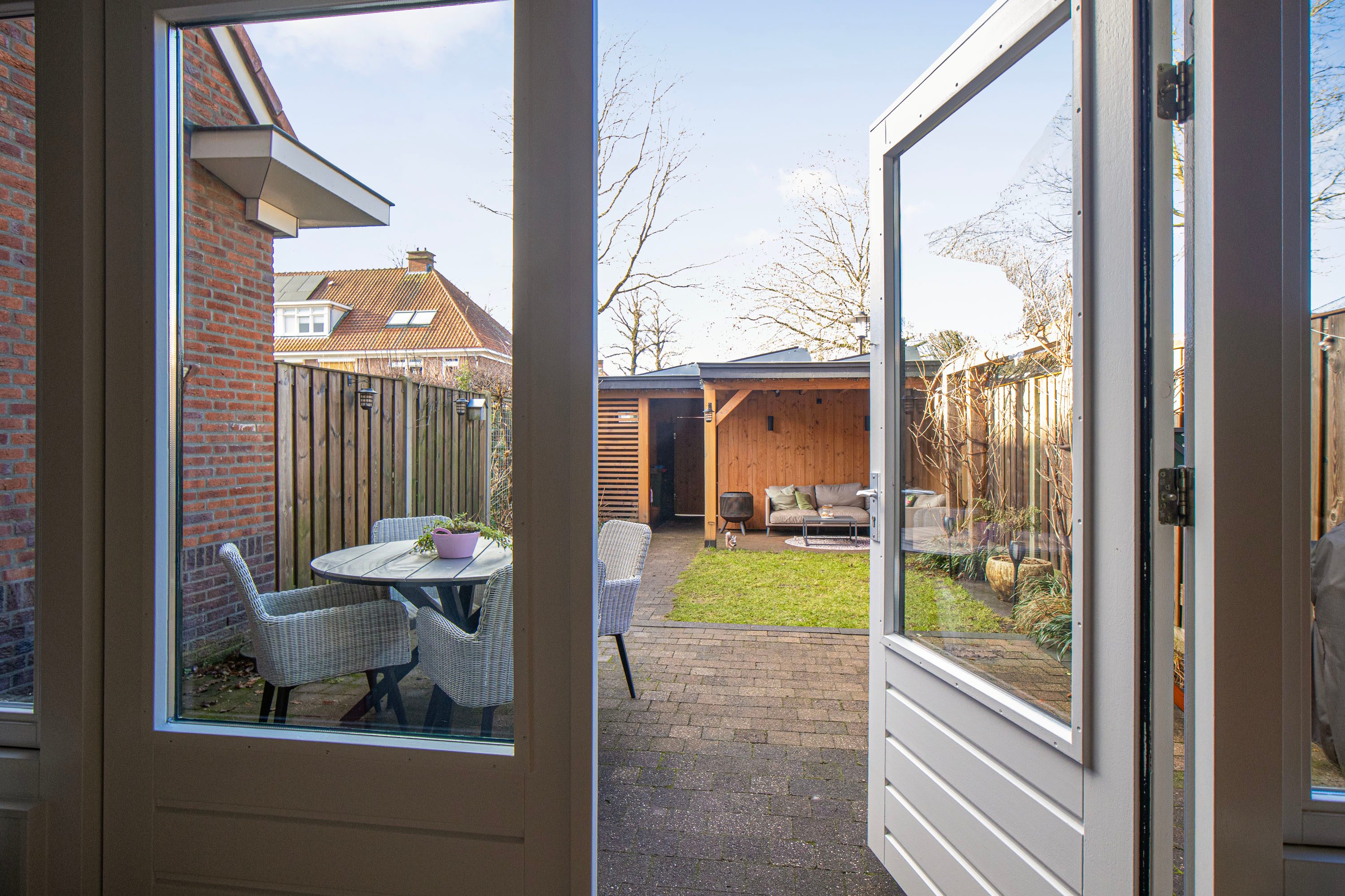 De openslaande tuindeuren geven toegang tot de royale achtertuin op het zuidwesten. De tuin biedt volop ruimte voor een comfortabele loungehoek onder de overkapping/veranda van 7,5 m², evenals een speelhoek voor kinderen. Daarnaast is er een praktische berging van 7,6 m², ideaal voor fietsen en tuingereedschap. De tuin beschikt bovendien over een handige achterom, bijvoorbeeld voor de containers.