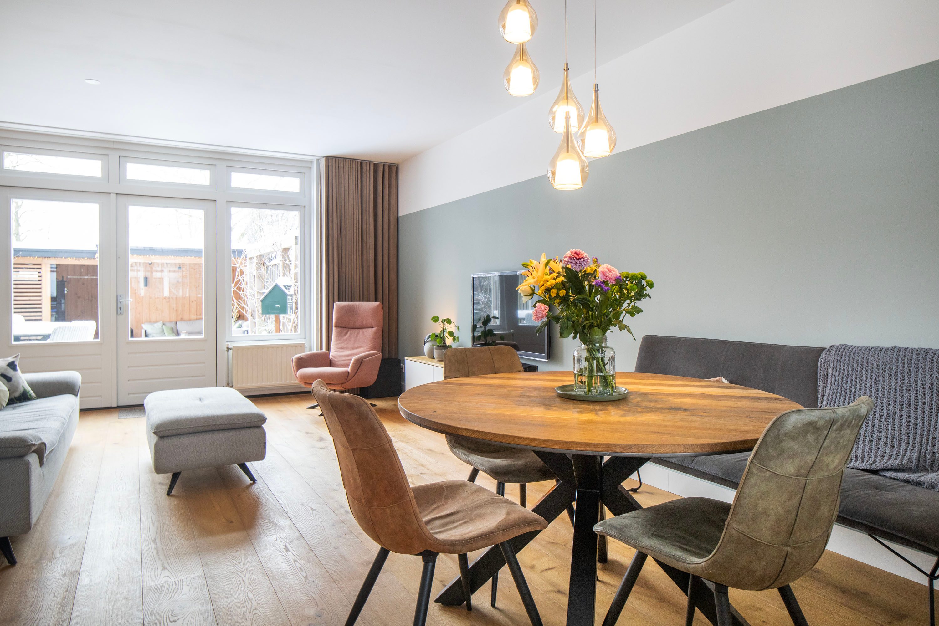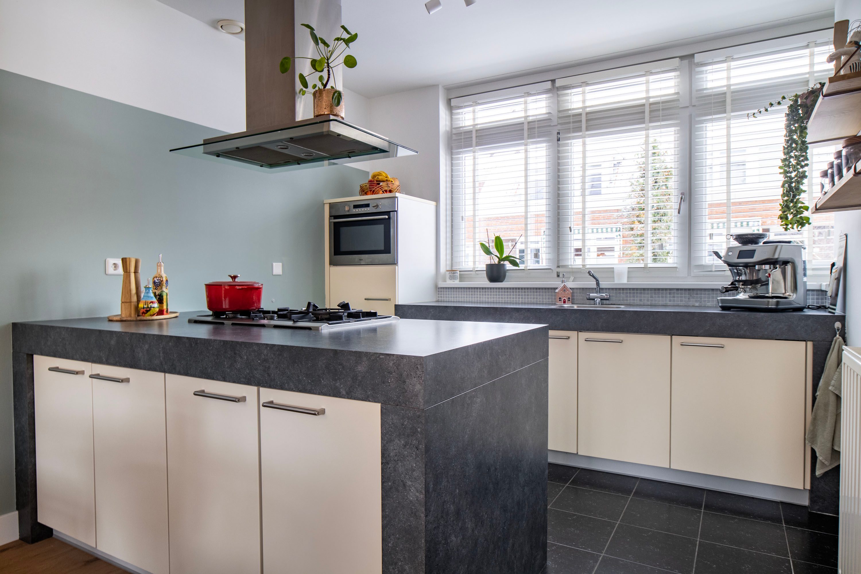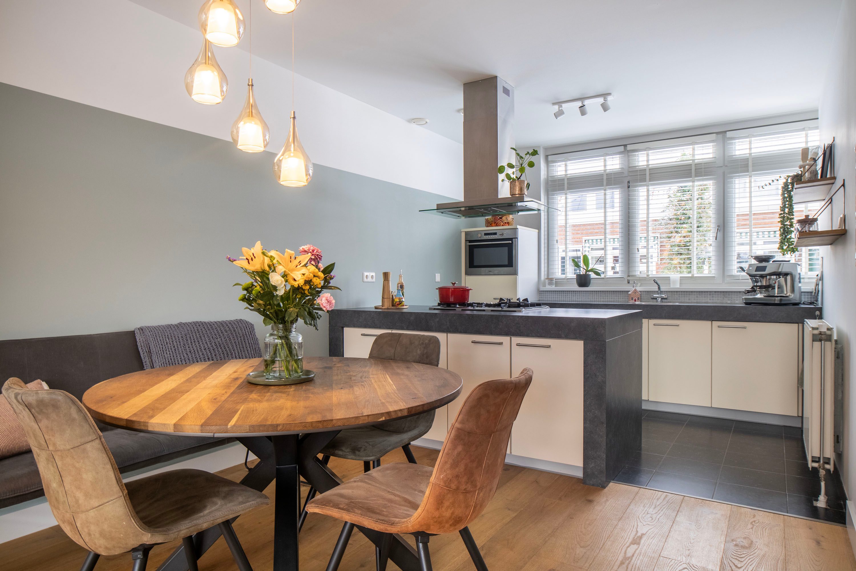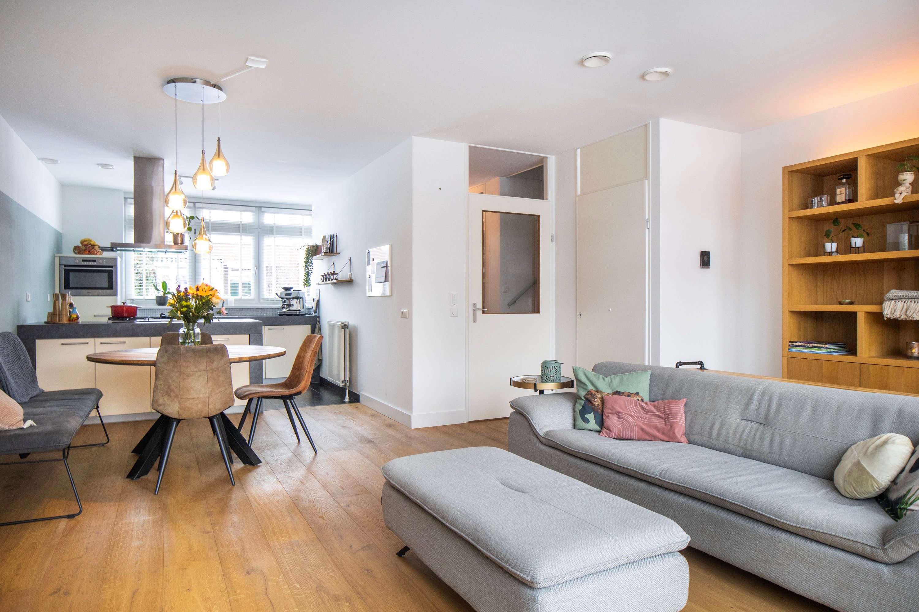 Via de entree, waar zich de meterkast, het toilet en de trapopgang bevinden, betreed je de ruime en lichte woonkamer van 27,8 m². De sfeervolle woonkamer beschikt over een houten vloer. Dankzij de grote tuindeuren geniet deze ruimte van veel natuurlijke lichtinval. Er is voldoende ruimte voor een grote bank én een gezellige extra zithoek. Centraal in de woonkamer bevindt zich het eetgedeelte, dat in open verbinding staat met de keuken. De open keuken van 12,3 m² is voorzien van een modern kookeiland en diverse inbouwapparatuur, waaronder een gasfornuis, afzuigkap, combi-oven, koelkast, vriezer en vaatwasser. Het te openen raam zorgt voor prettige ventilatie en extra daglicht.