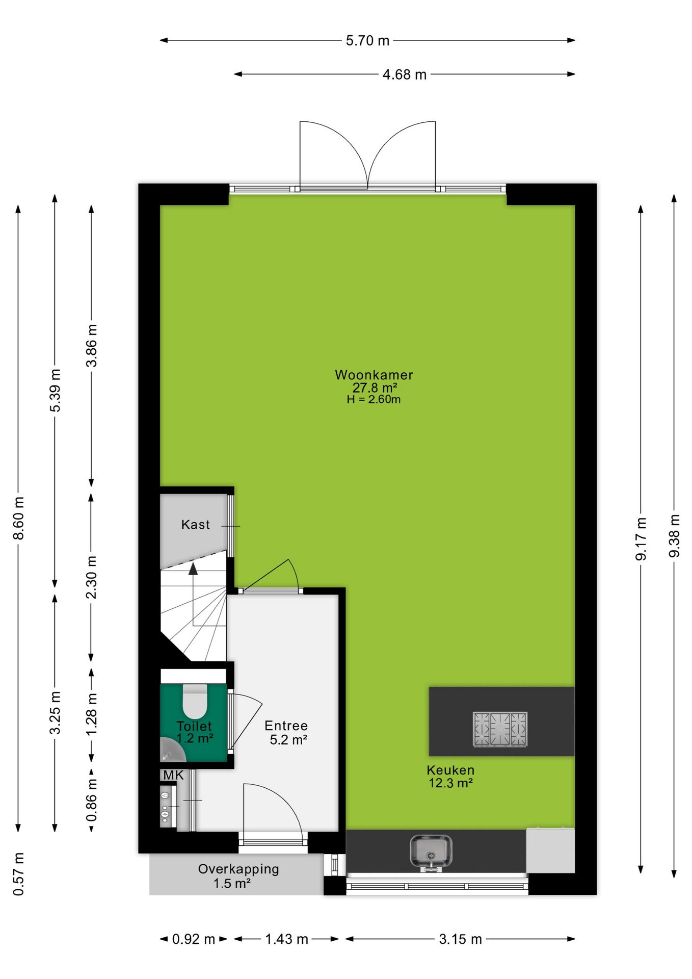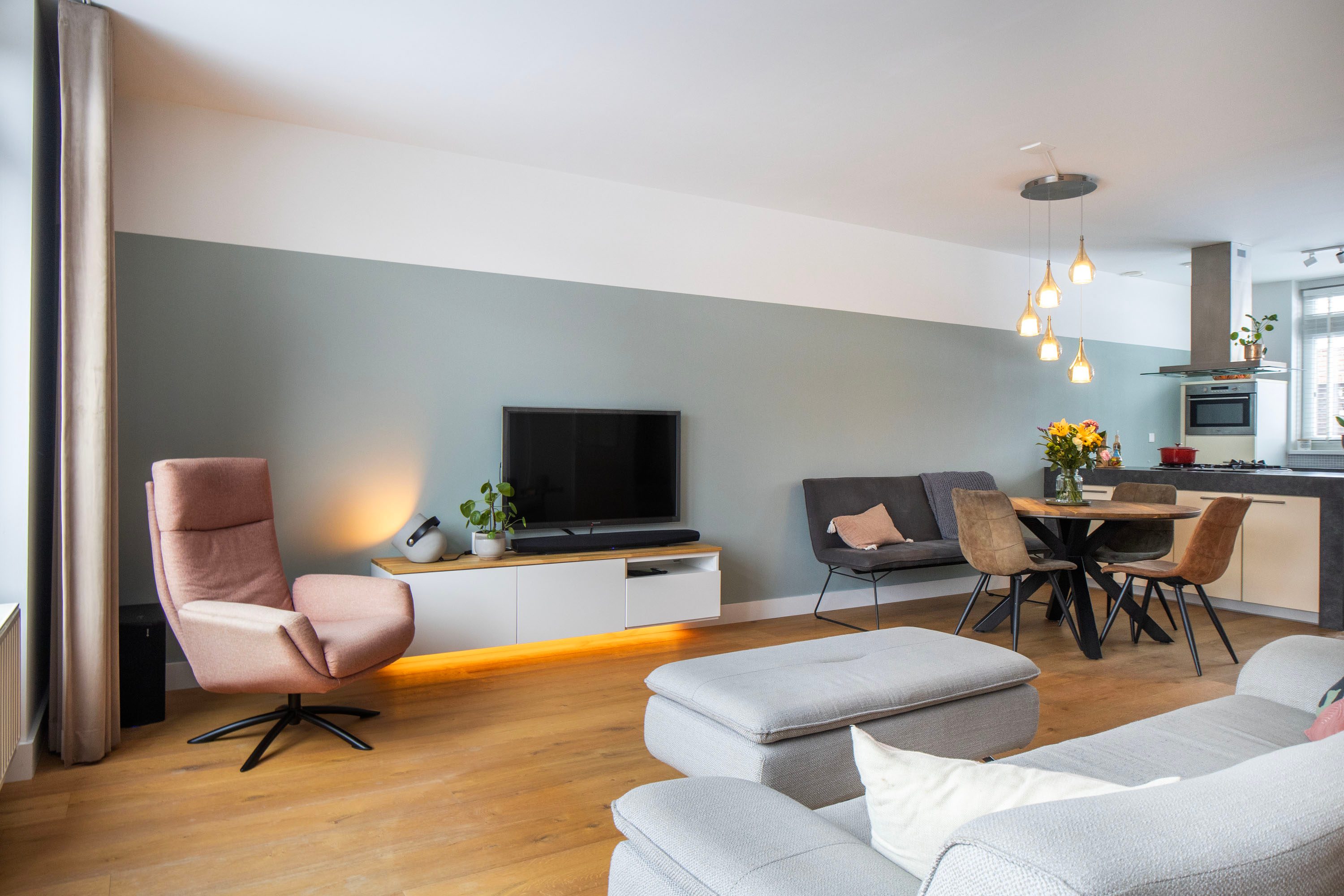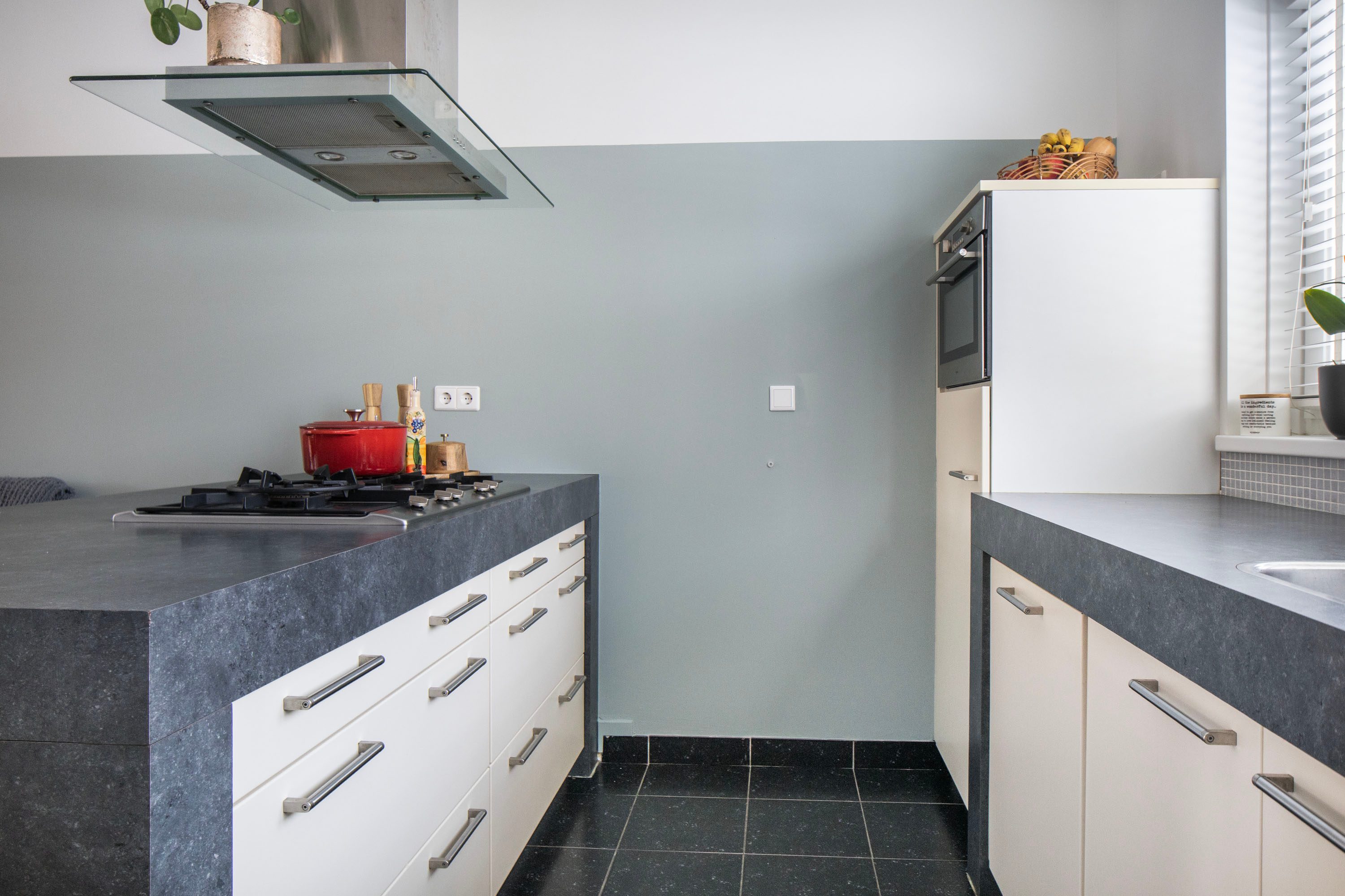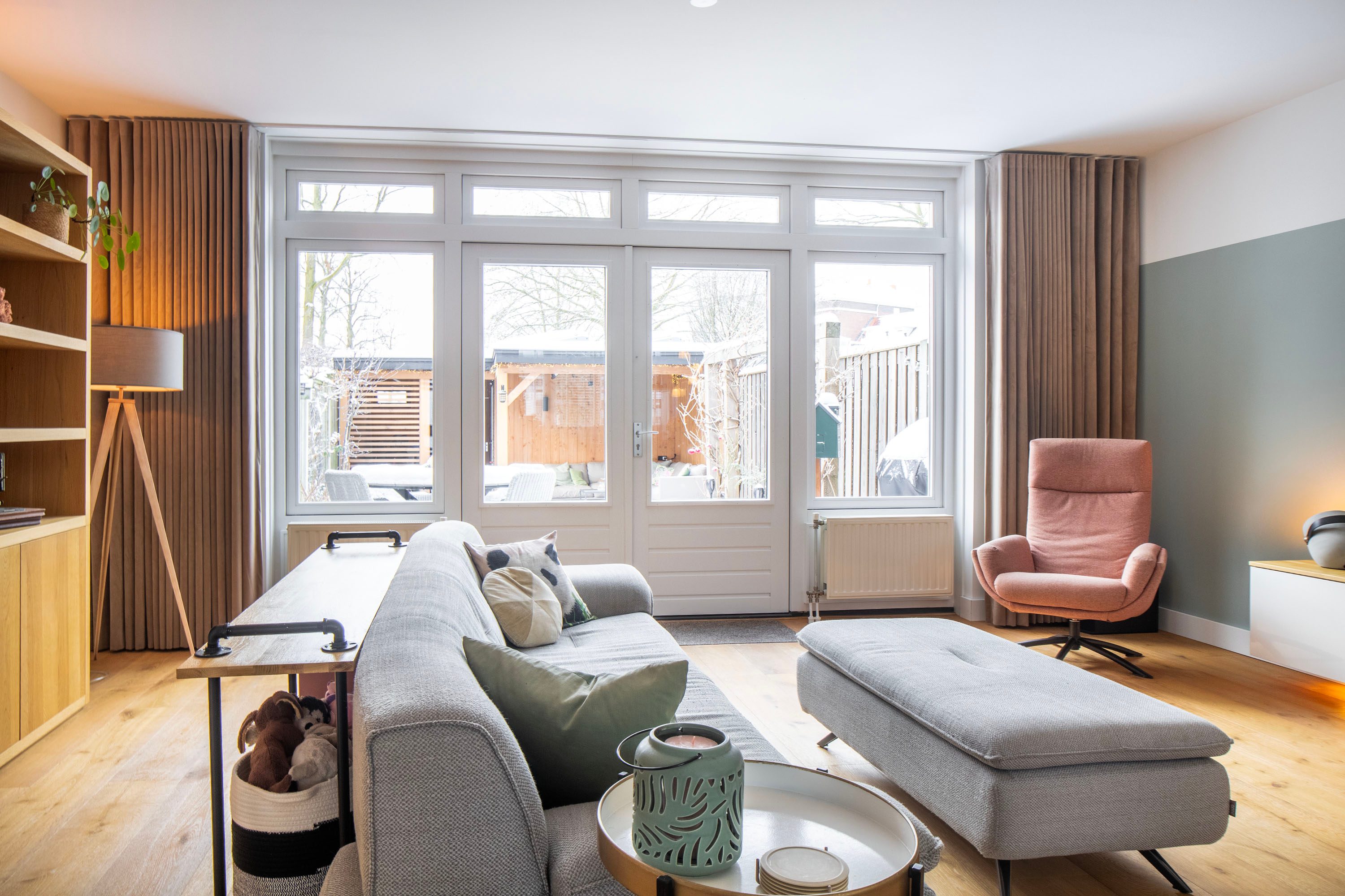 Via de entree, waar zich de meterkast, het toilet en de trapopgang bevinden, betreed je de ruime en lichte woonkamer van 27,8 m². De sfeervolle woonkamer beschikt over een houten vloer. Dankzij de grote tuindeuren geniet deze ruimte van veel natuurlijke lichtinval. Er is voldoende ruimte voor een grote bank én een gezellige extra zithoek. Centraal in de woonkamer bevindt zich het eetgedeelte, dat in open verbinding staat met de keuken. De open keuken van 12,3 m² is voorzien van een modern kookeiland en diverse inbouwapparatuur, waaronder een gasfornuis, afzuigkap, combi-oven, koelkast, vriezer en vaatwasser. Het te openen raam zorgt voor prettige ventilatie en extra daglicht.