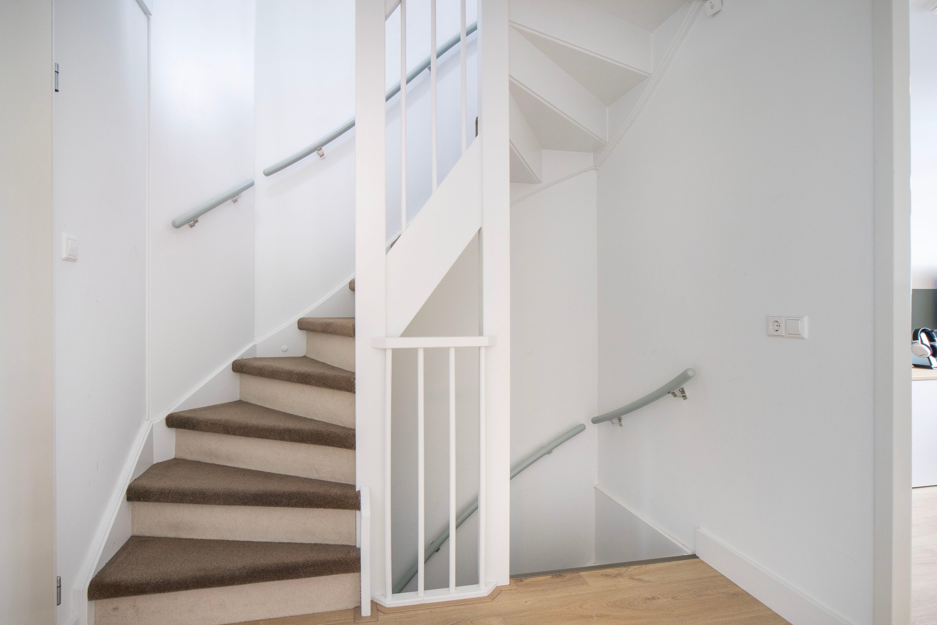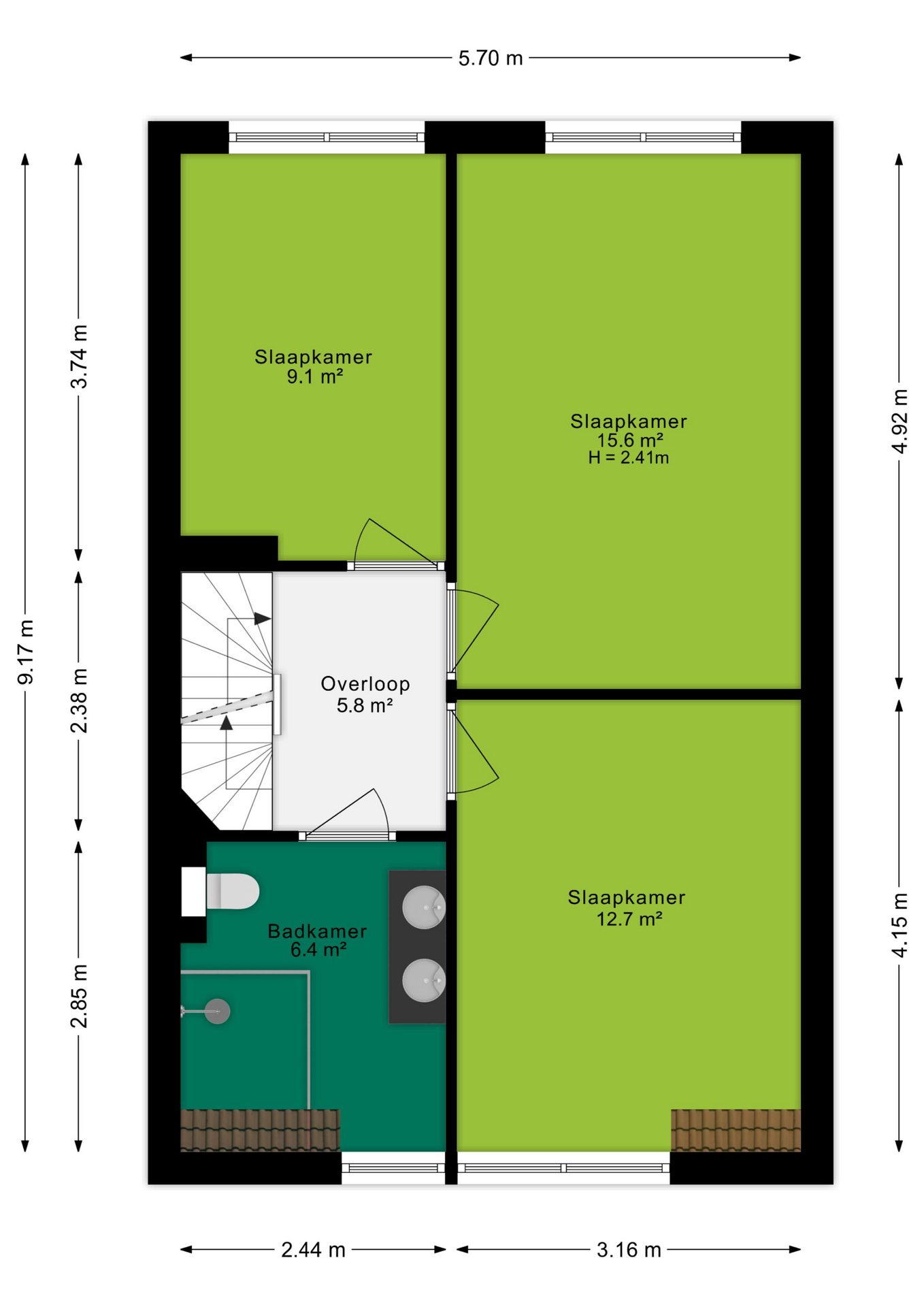 Door middel van de vaste trap kom je bij de overloop van de eerste verdieping. Vanaf de overloop zijn alle drie de slaapkamers bereikbaar, deze zijn ruim met oppervlakten van 9,1 m², 12,7 m² en 15,6 m². Alle kamers zijn aangenaam licht. De moderne badkamer van 6,4 m² is uitgerust met een dubbel wastafelmeubel, een inloopdouche en een toilet.