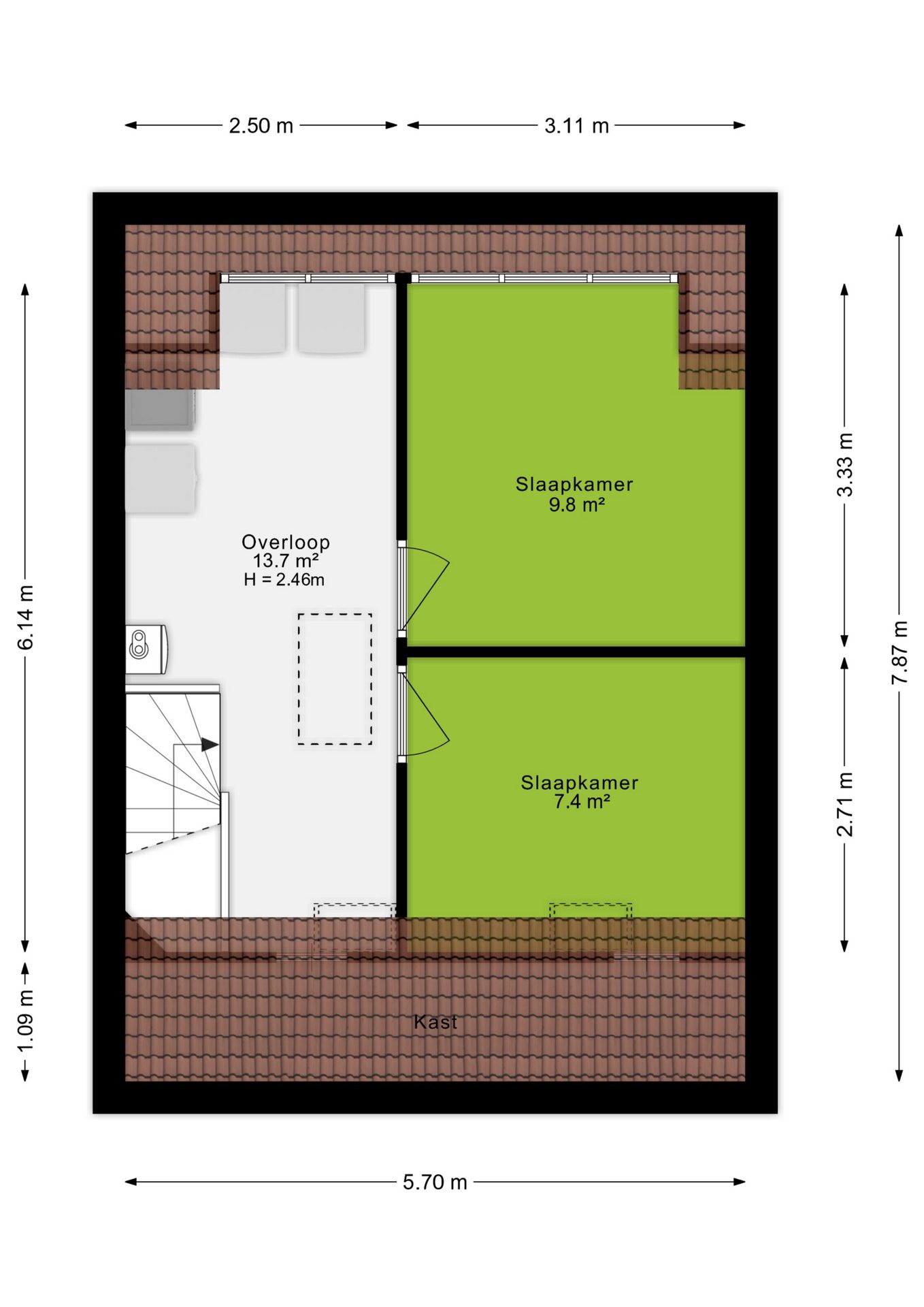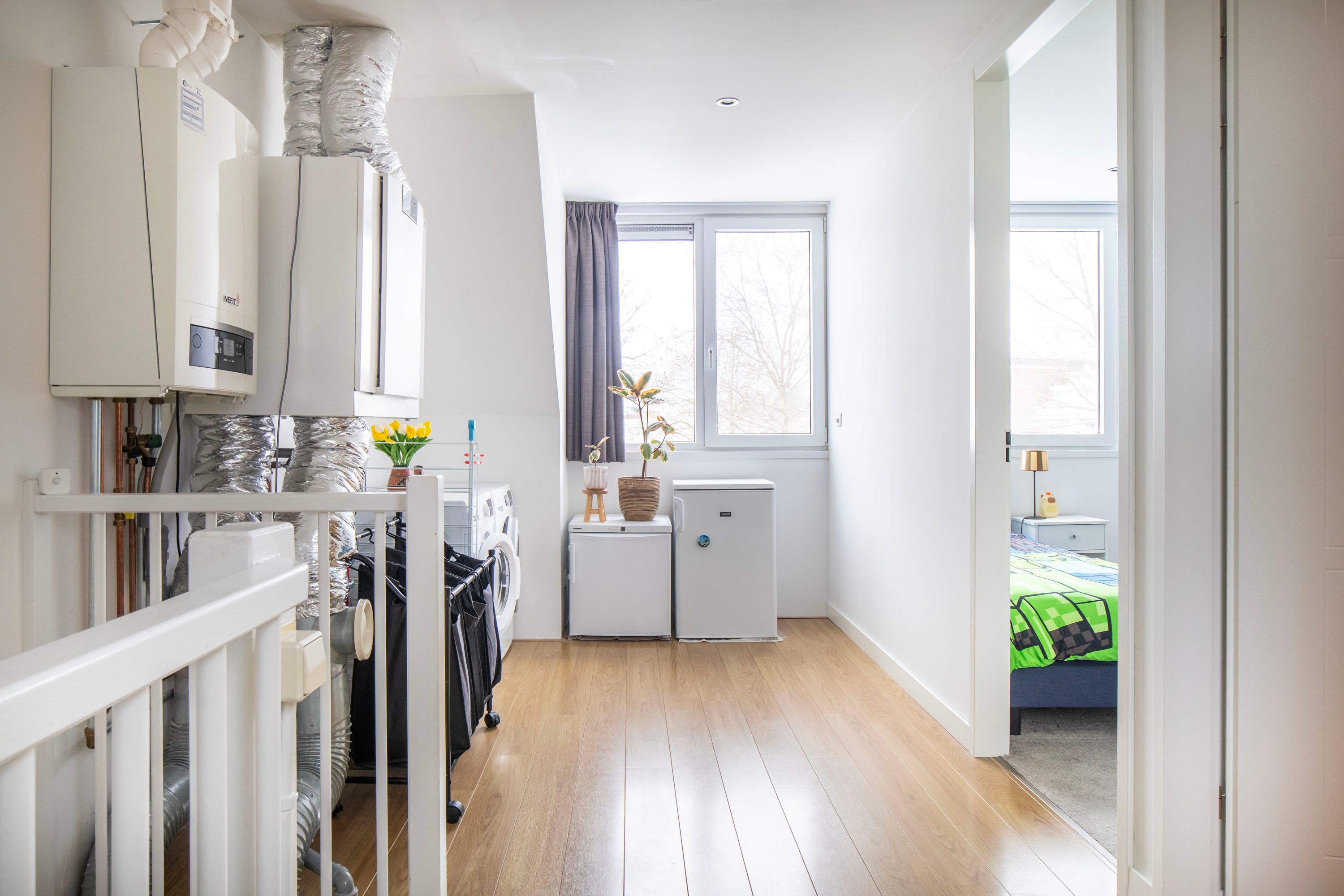 Via een vaste trap bereik je de ruime overloop, die toegang biedt tot de vierde en vijfde slaapkamer van 7,4 m² en 9,8 m². Dankzij de dakkapel, welke geplaatst is in 2022 en dakramen voelen ook deze kamers licht en ruim aan. Tevens beschikt de woning over een ruime vliering over de gehele breedte van de woning en is via een vlizotrap te bereiken.