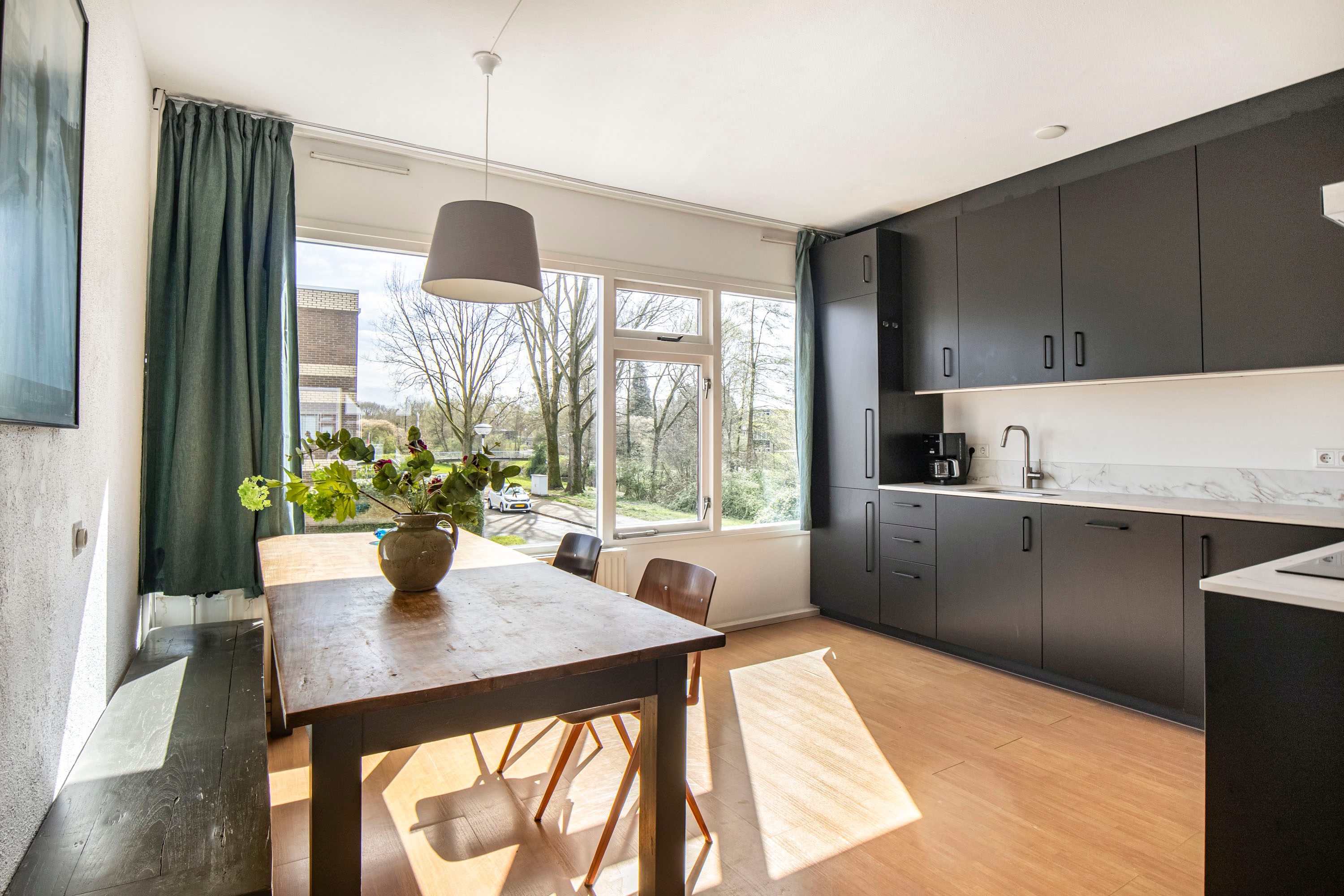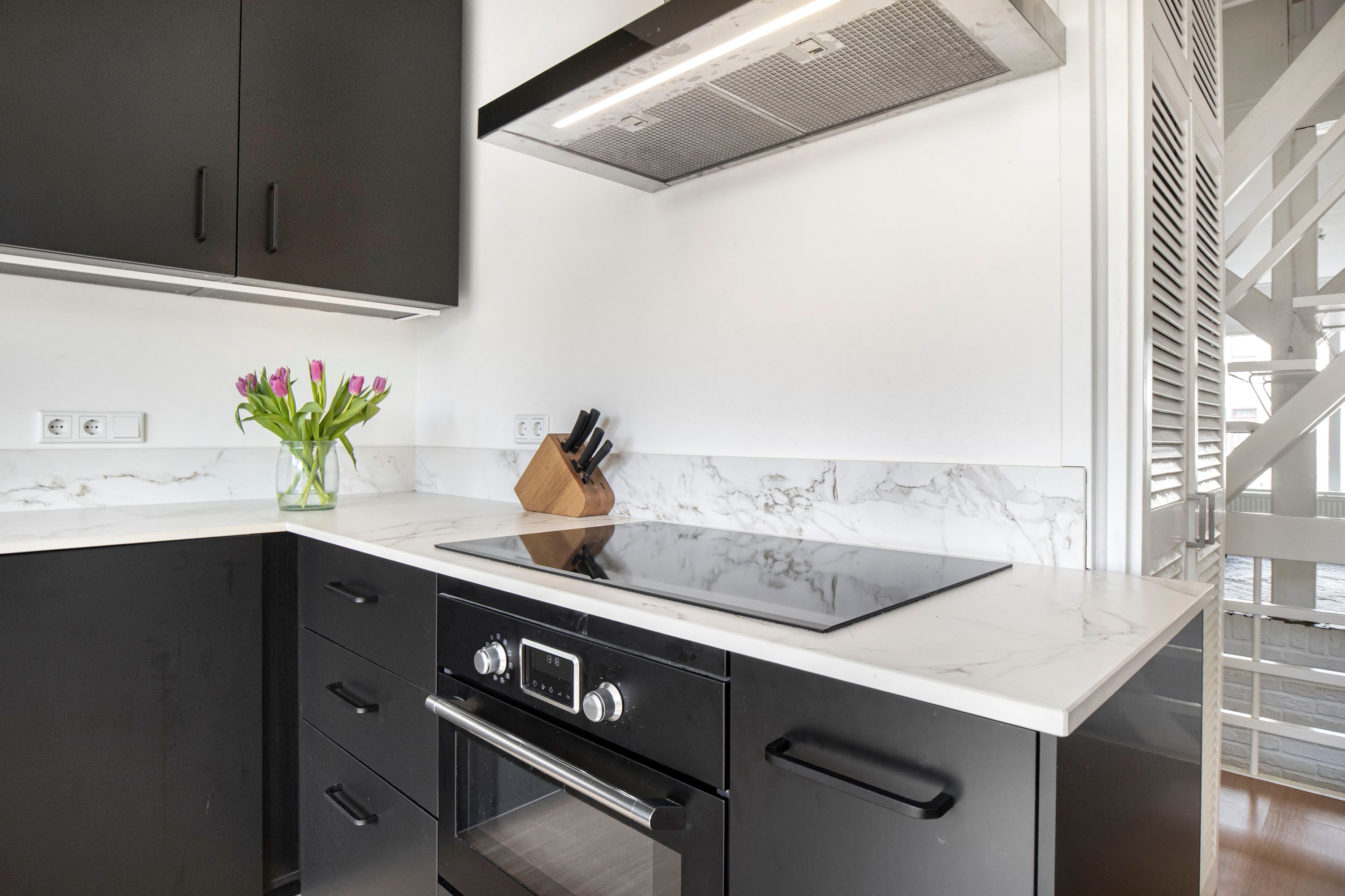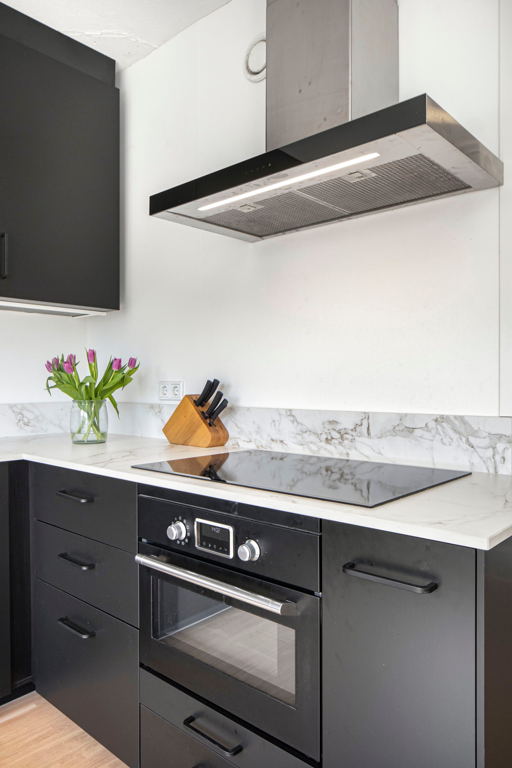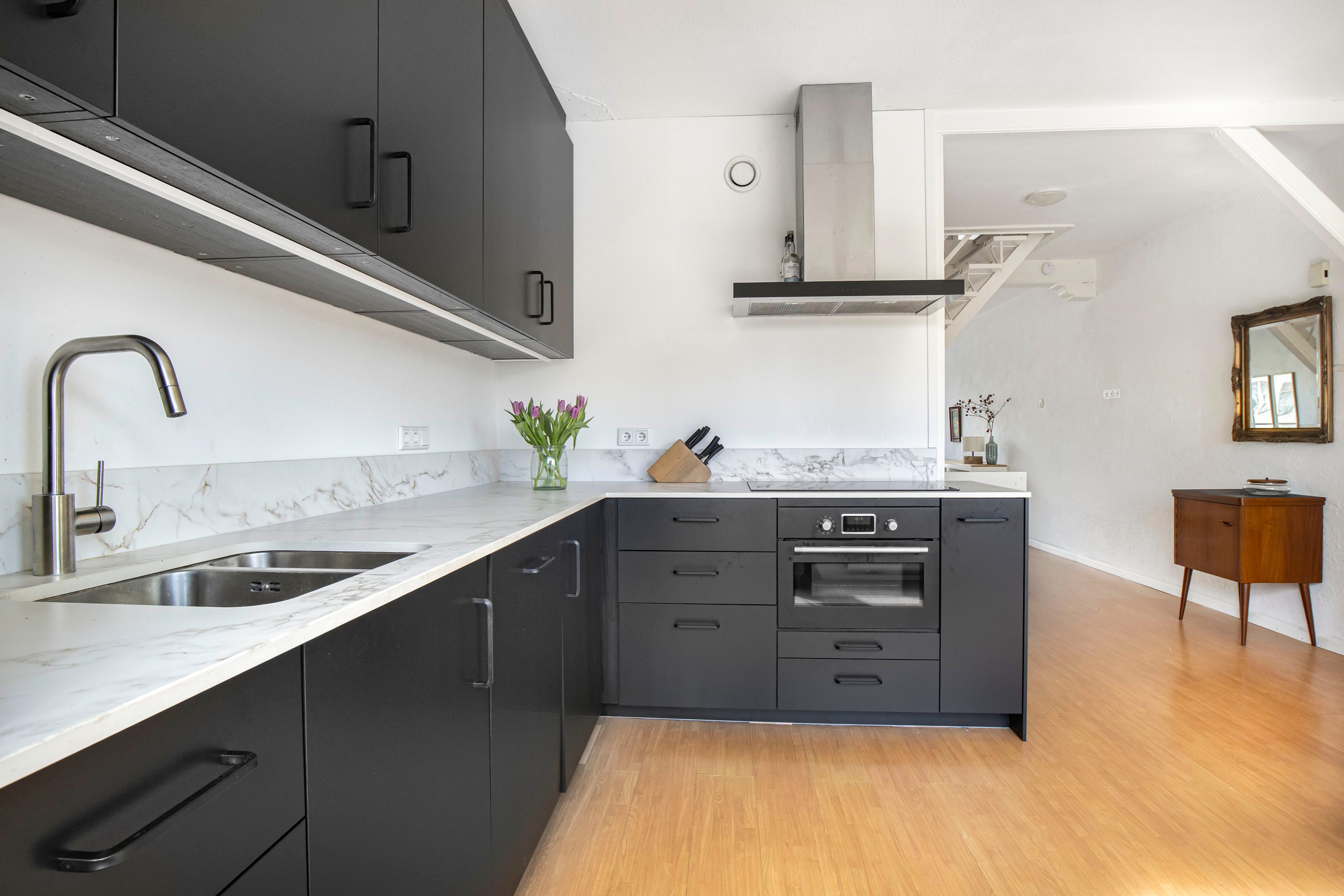De indeling is prettig en logisch: wonen en koken zijn met elkaar verbonden, maar toch subtiel gescheiden. Aan de voorzijde ligt de vernieuwde keuken (2024), strak en compleet uitgevoerd met inbouwapparatuur. Hier kook je niet alleen, hier leef je. Of je nu snel ontbijt of uitgebreid dineert met vrienden.