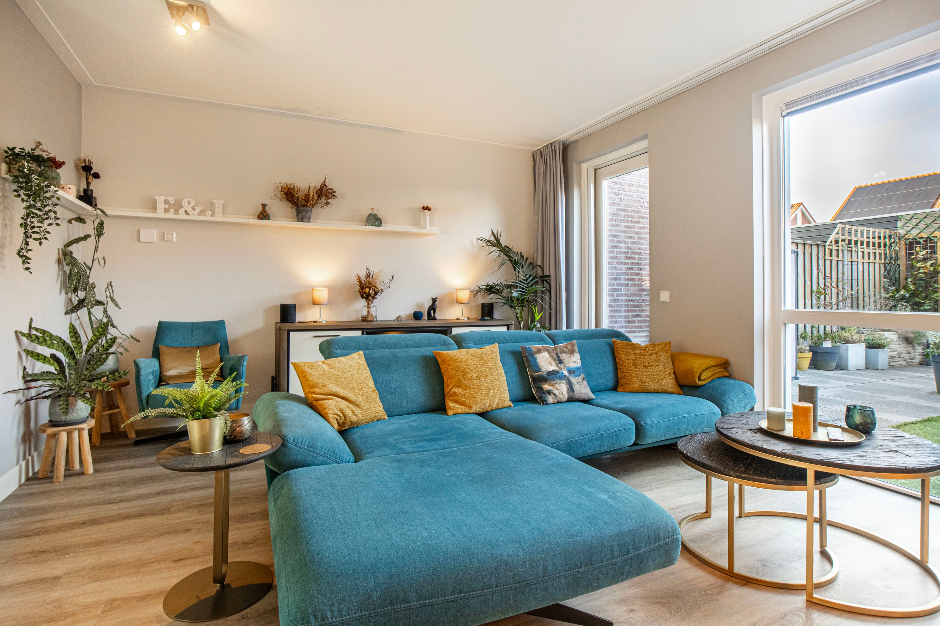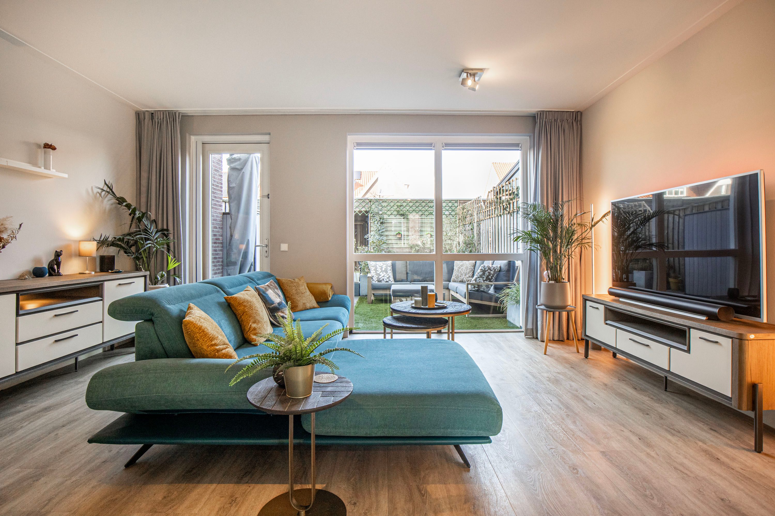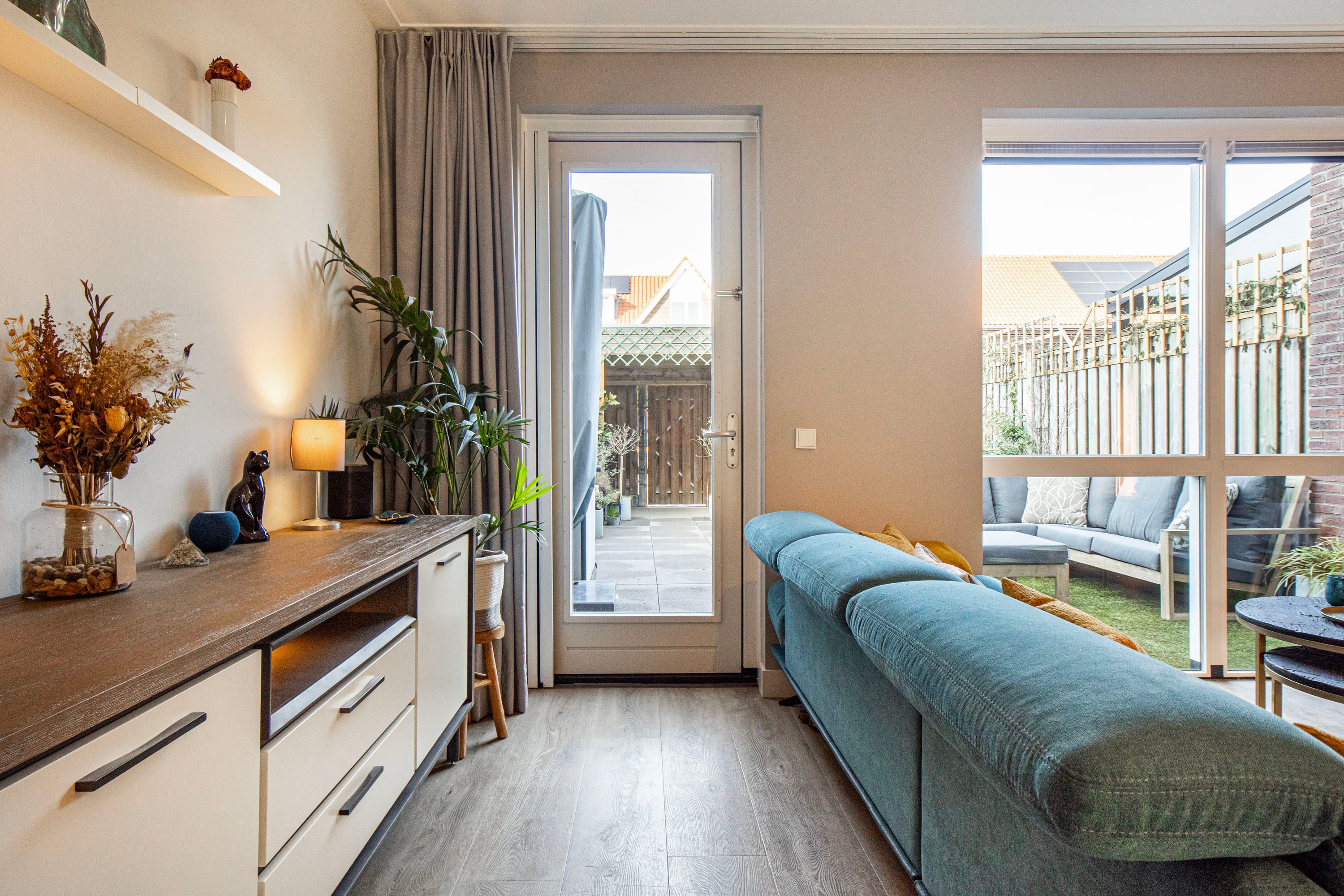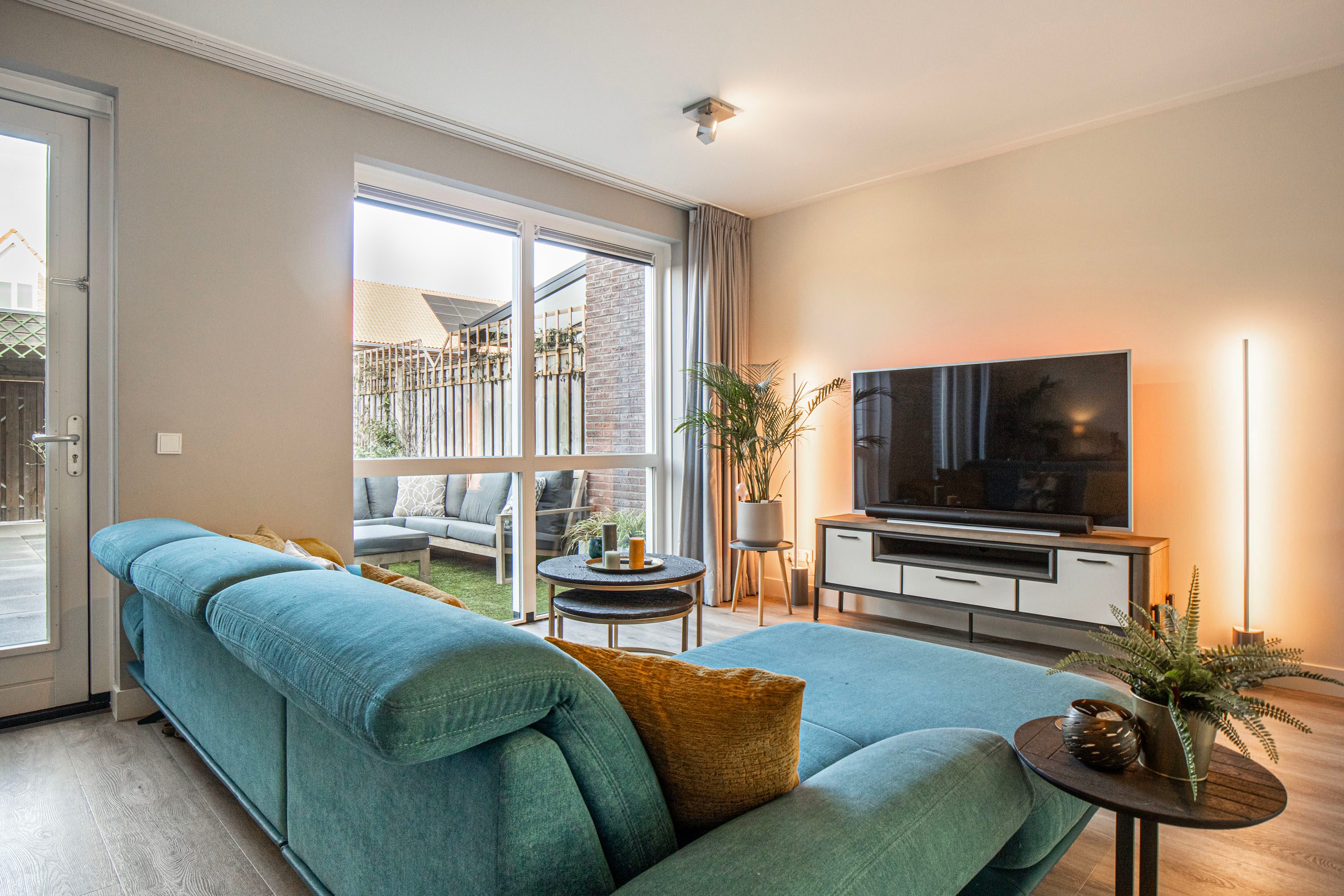 De aangename woonkamer is heerlijk licht dankzij de extra raampartijen en de loopdeur naar de achtertuin. De wanden zijn glad afgewerkt en de vloerverwarming fungeert als hoofdverwarming, wat zorgt voor optimaal comfort. Onder de trap bevindt zich een praktische provisiekast.