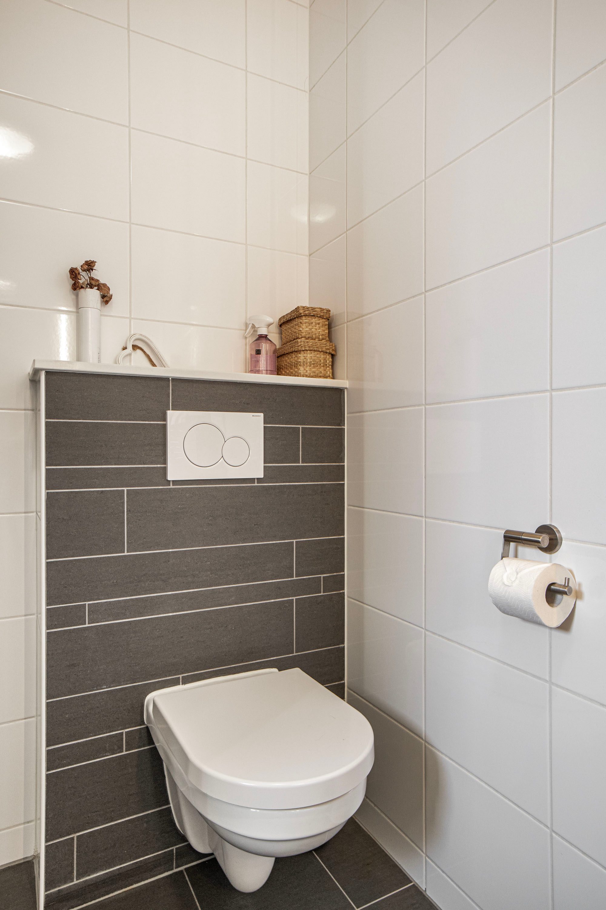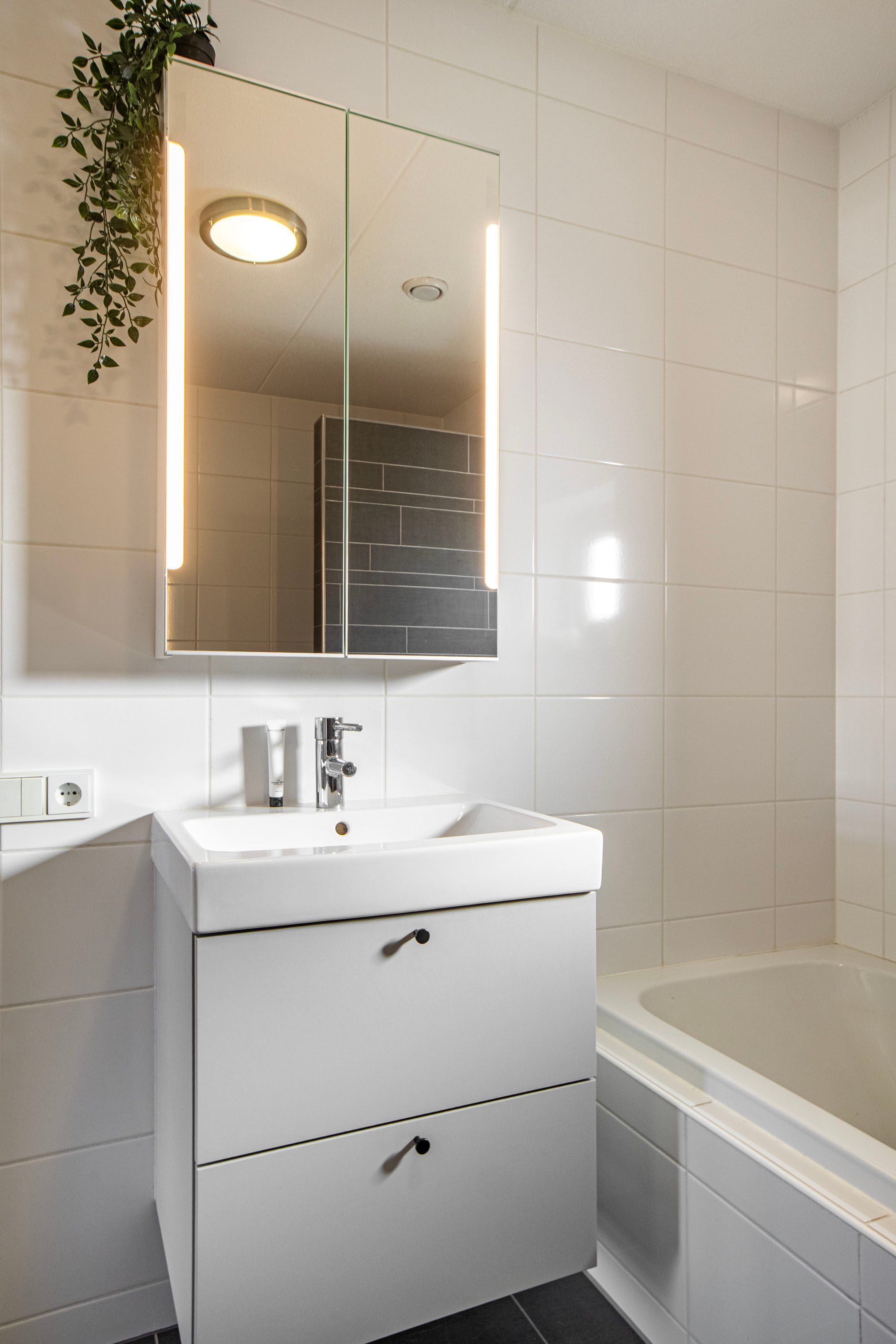 De volledig ingerichte badkamer is voorzien van een inloopdouche, vaste wastafel, ligbad en tweede toilet. Dankzij het raam is er naast mechanische ook natuurlijke ventilatie aanwezig.