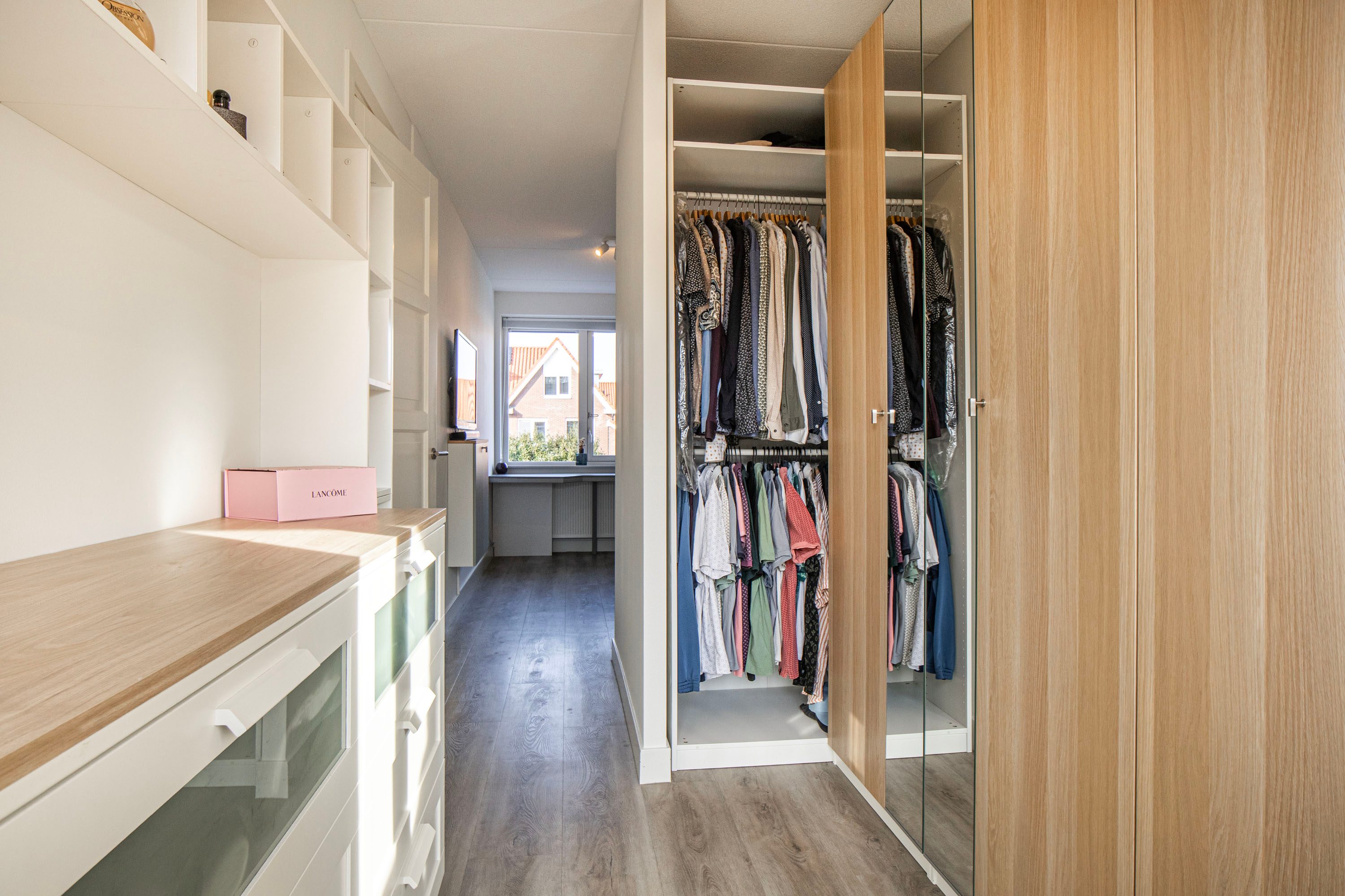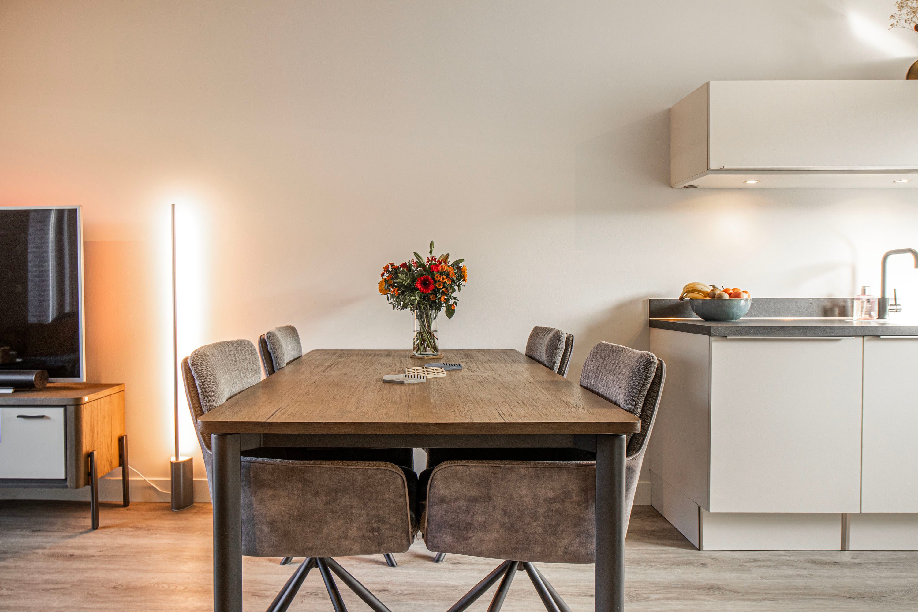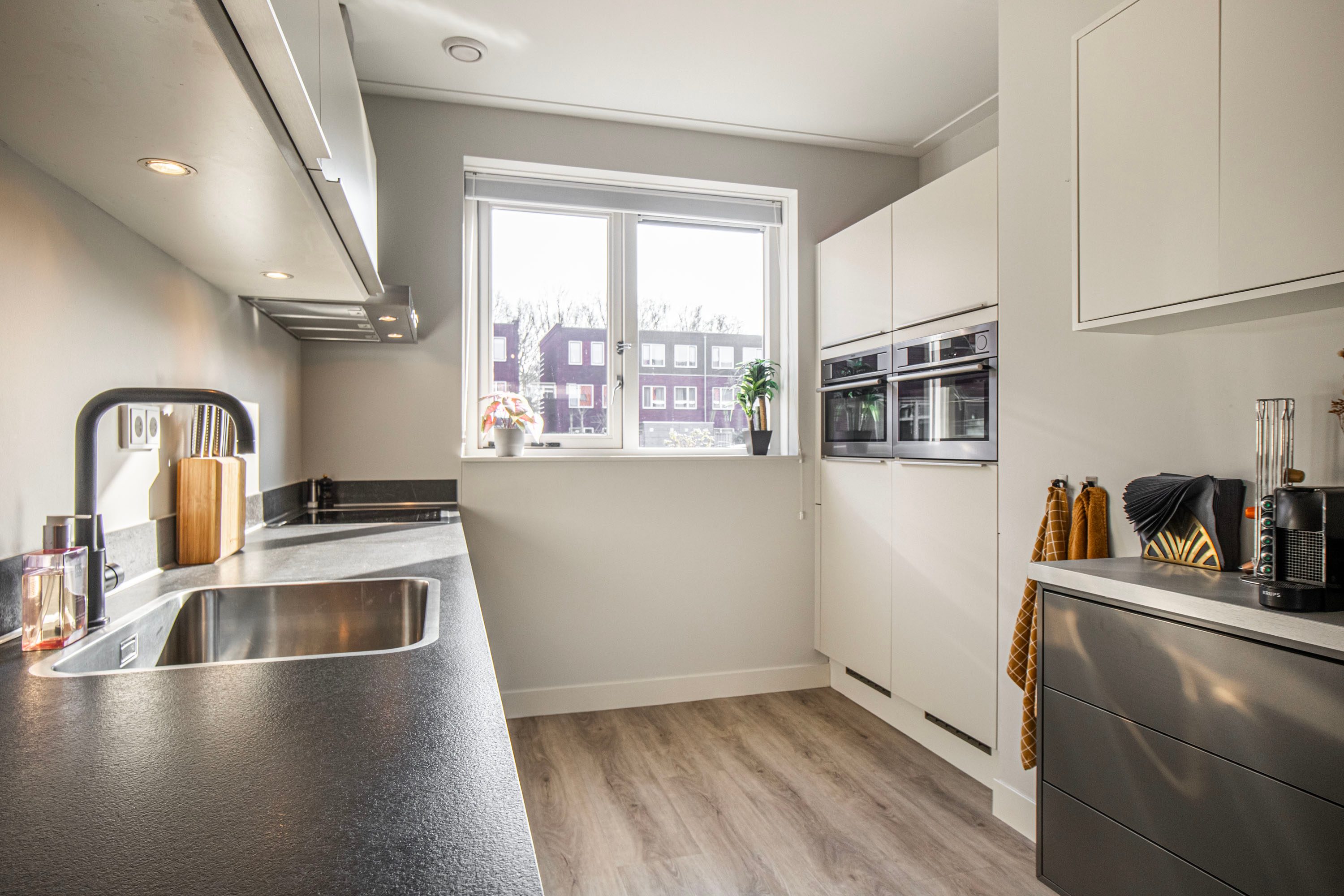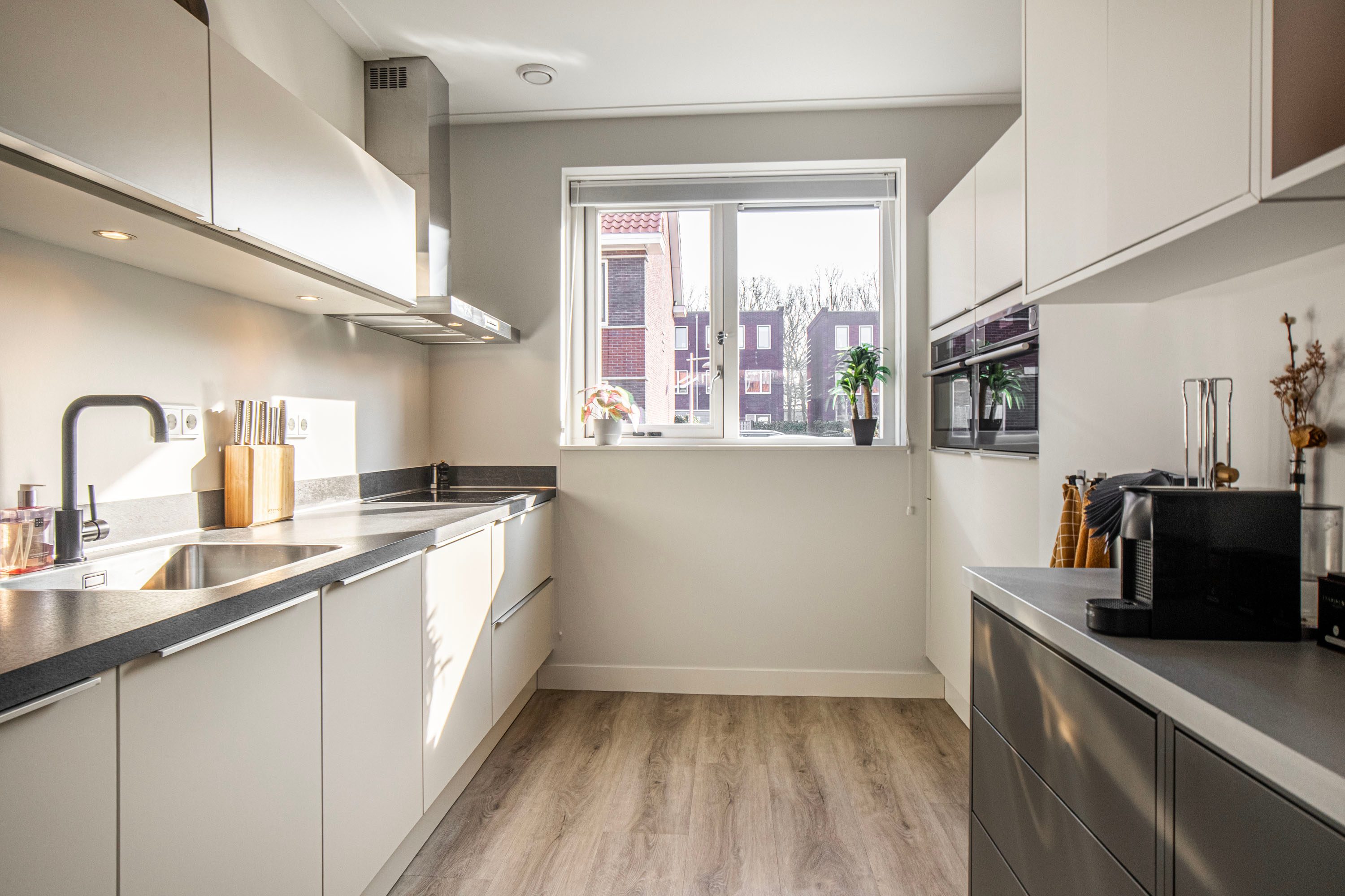De woning beschikt over een strak afgewerkte, luxe inbouwkeuken in een lichte kleurstelling. De hoge kastenwand met geïntegreerde combi-oven en stoomoven is mooi weggewerkt in een nis. Verder is de keuken voorzien van een inductiekookplaat, afzuigkap, koelkast, vriezer en vaatwasser.