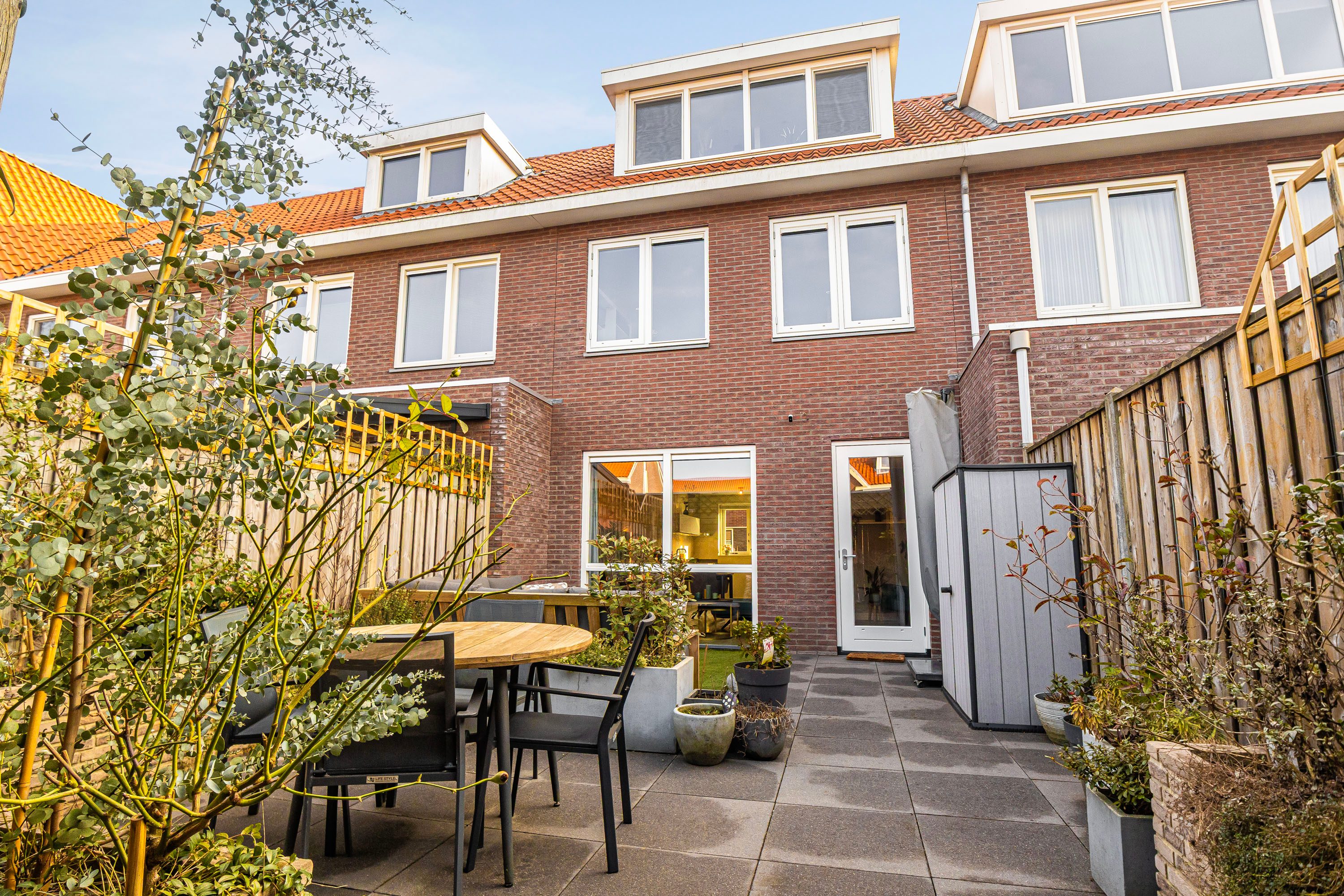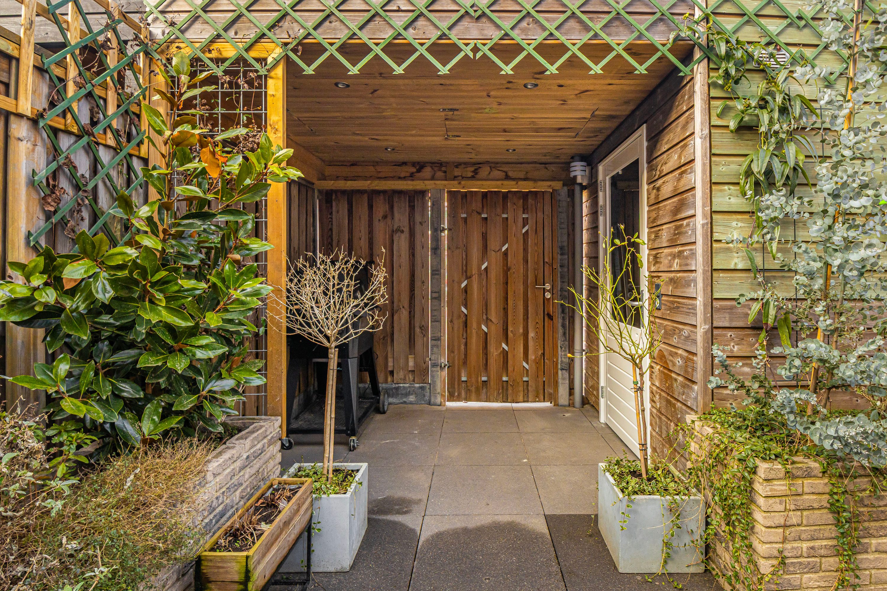 Prettige achtertuin, fraai aangelegd, voorzien van grote tegels, plantenbakken en vrijstaande houten berging. Er is een mogelijkheid tot achterom en op het achtergelegen parkeerterrein beschik je over een eigen parkeerplek. Deze is direct achter de tuin gelegen, fijn om direct te kunnen in en uit te laden aan de poort.