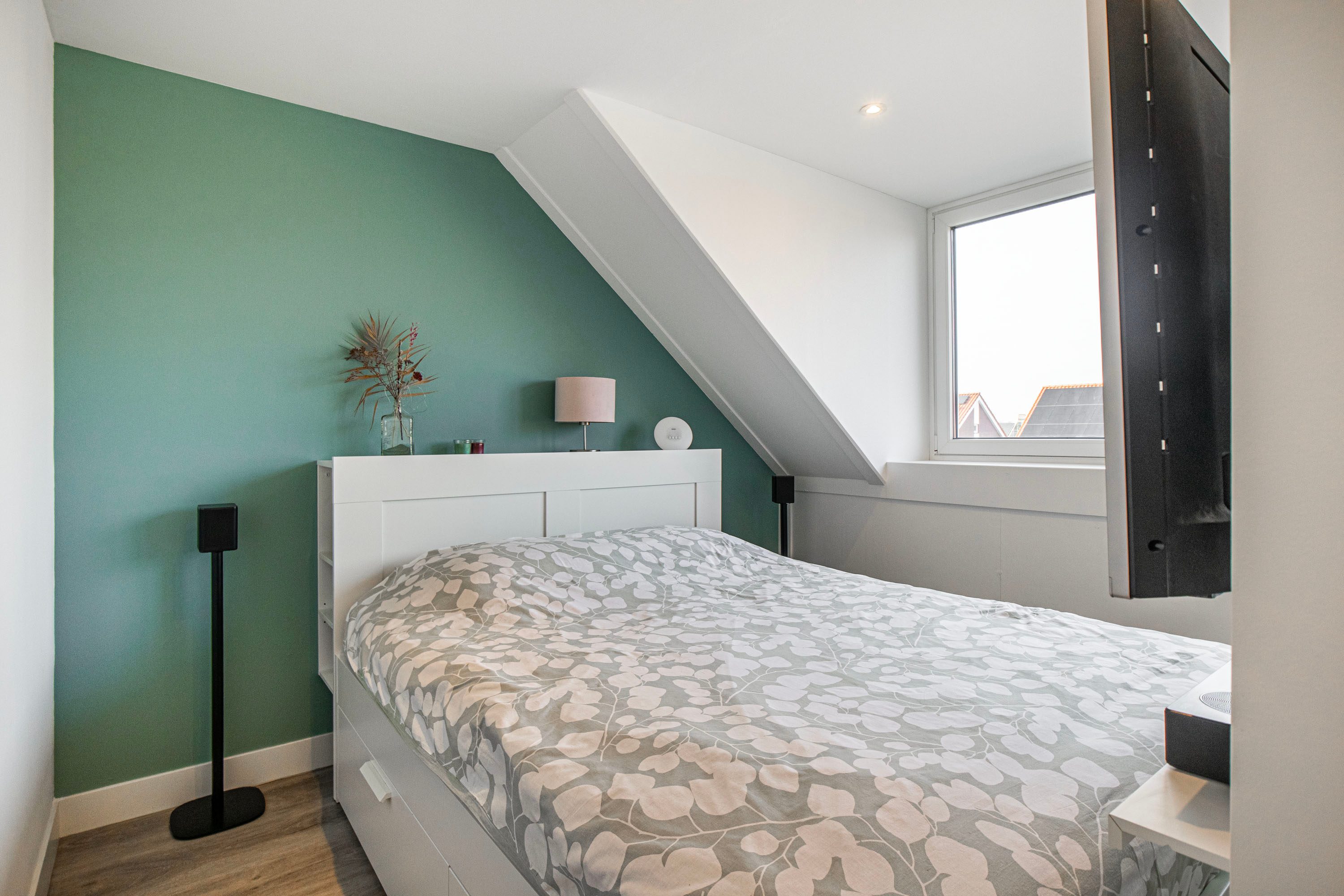 De vaste open trap leidt naar de tweede verdieping. Hier tref je een ruime voorzolder voorzien van dakkapel en aansluitingen voor de wasmachine en droger. Alles is keurig weggewerkt onder een aanrechtblad met extra wastafel en vaste kasten. Aan de achterzijde bevindt zich een royale slaapkamer met een dakkapel. Achter de knieschotten is extra bergruimte aanwezig en middels een vlizotrap is de bergzolder bereikbaar. De dakkapellen zijn voorzien van rolluiken en horren.
