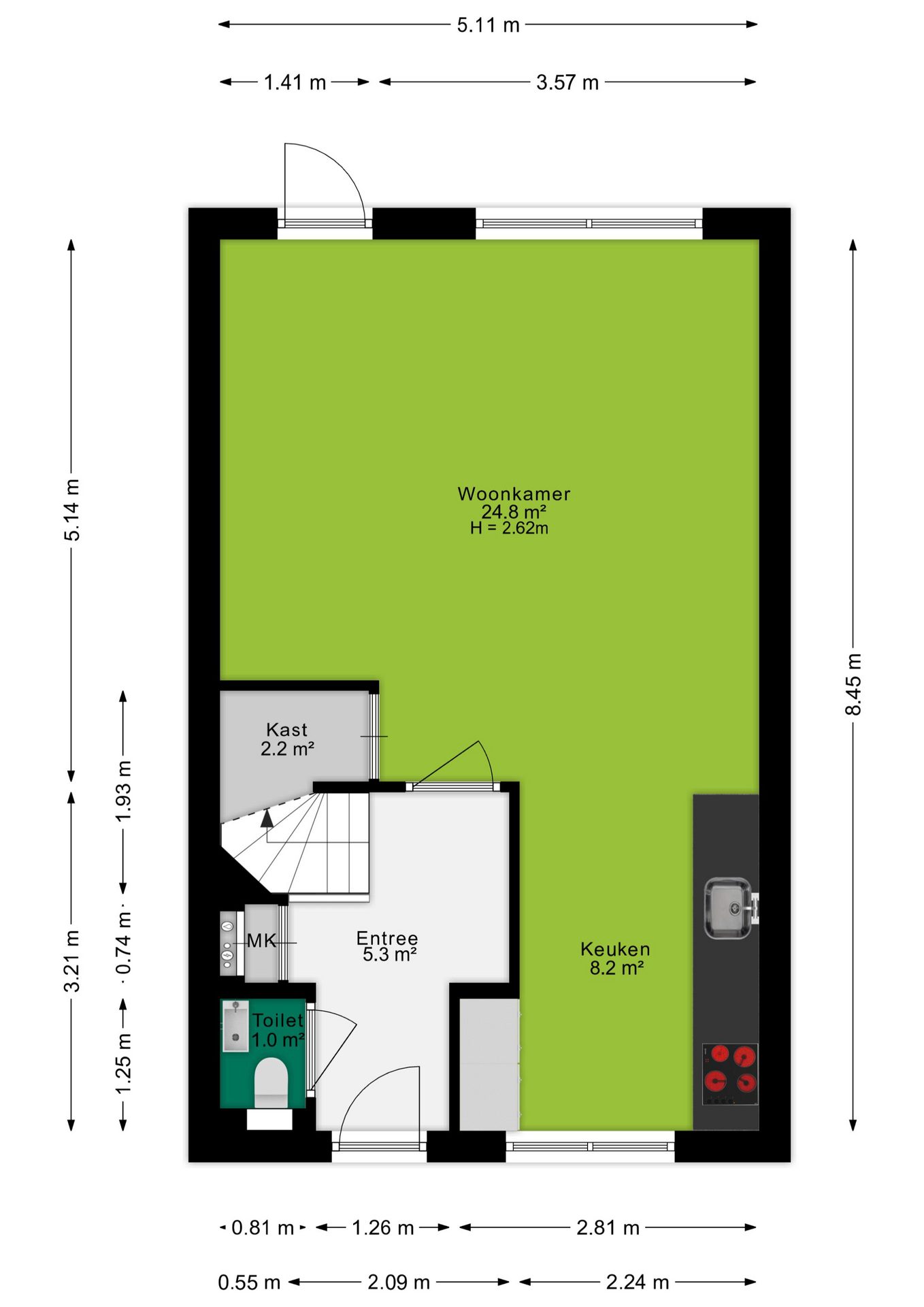 Via de entree bereik je de hal met toegang tot het toilet en de meterkast.