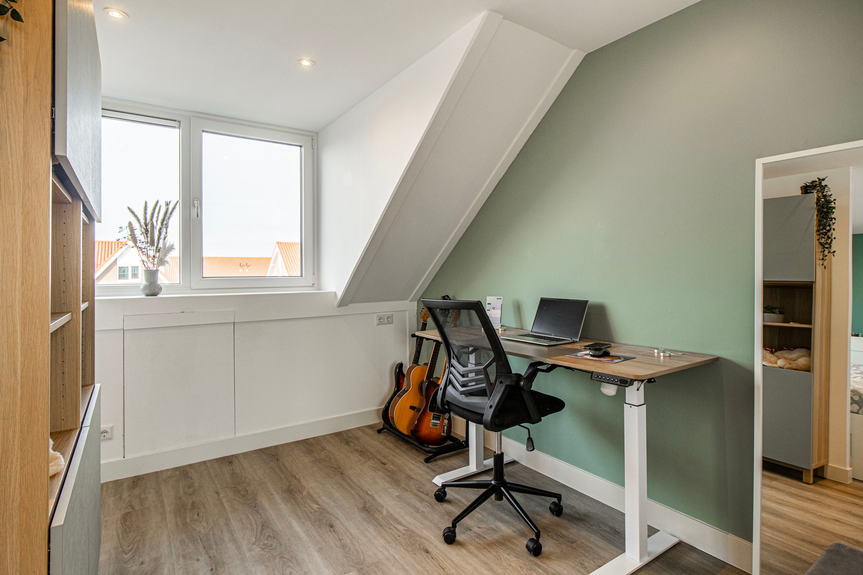 Via de vaste trap kom je op de overloop met toegang tot twee slaapkamers (met mogelijkheid tot 3) en de badkamer. De slaapkamers zijn licht en van goede afmeting. De grootste kamer is opgedeeld in een werkruimte/kantoor en de andere ruimte is ingedeeld met vaste kasten. Deze kamers kunnen beide goed teruggebracht worden naar volwaardige slaapvertrekken.