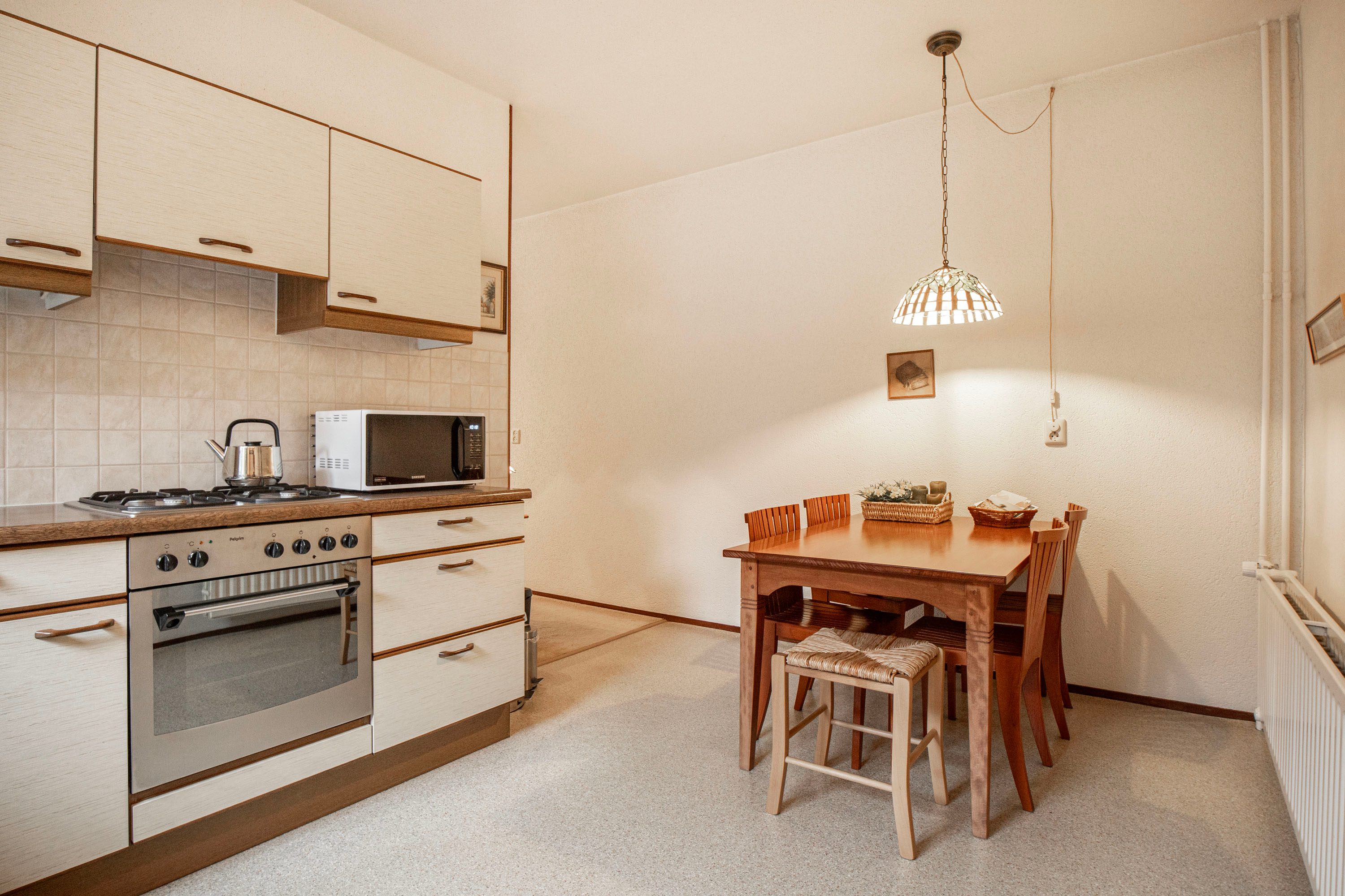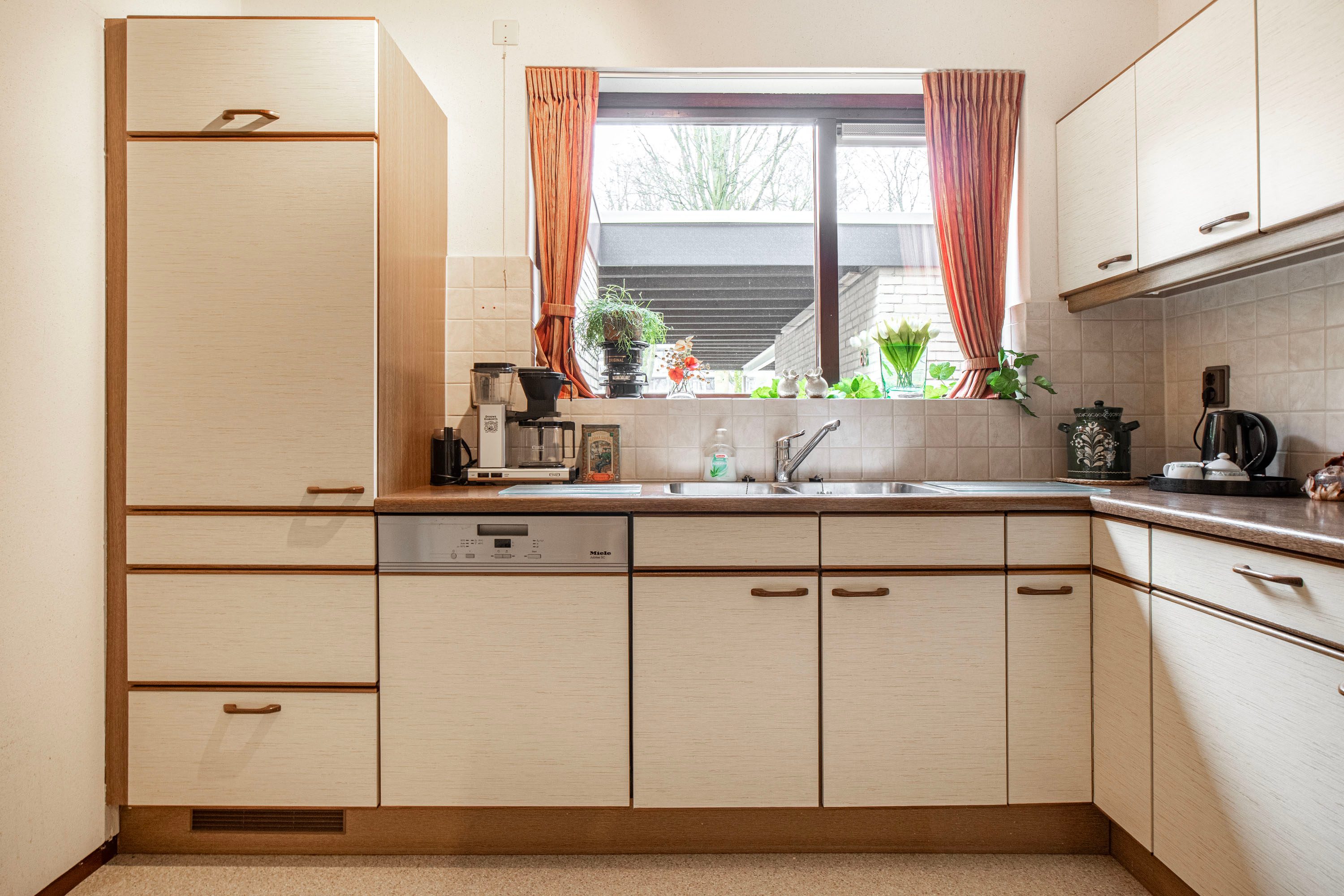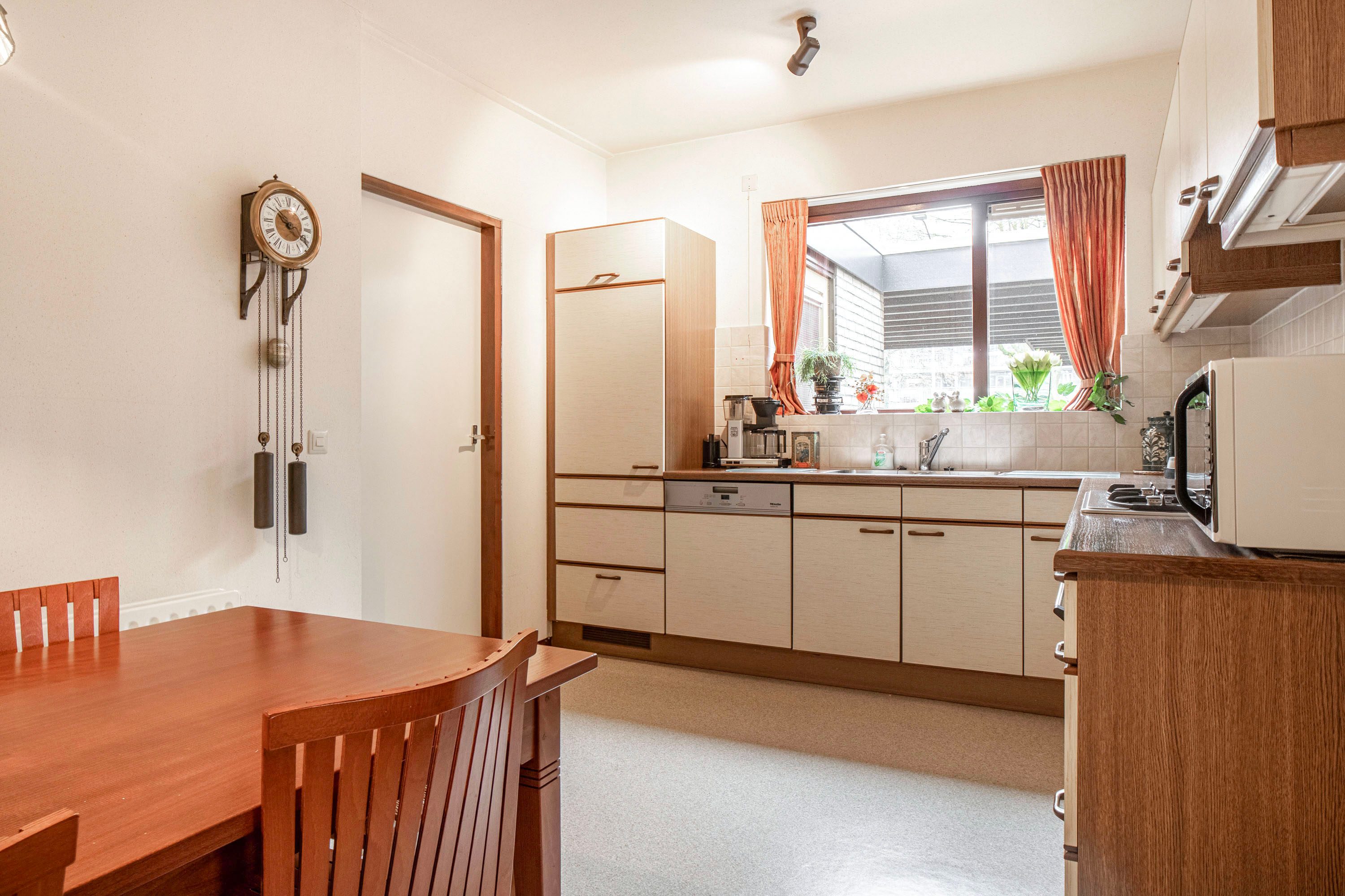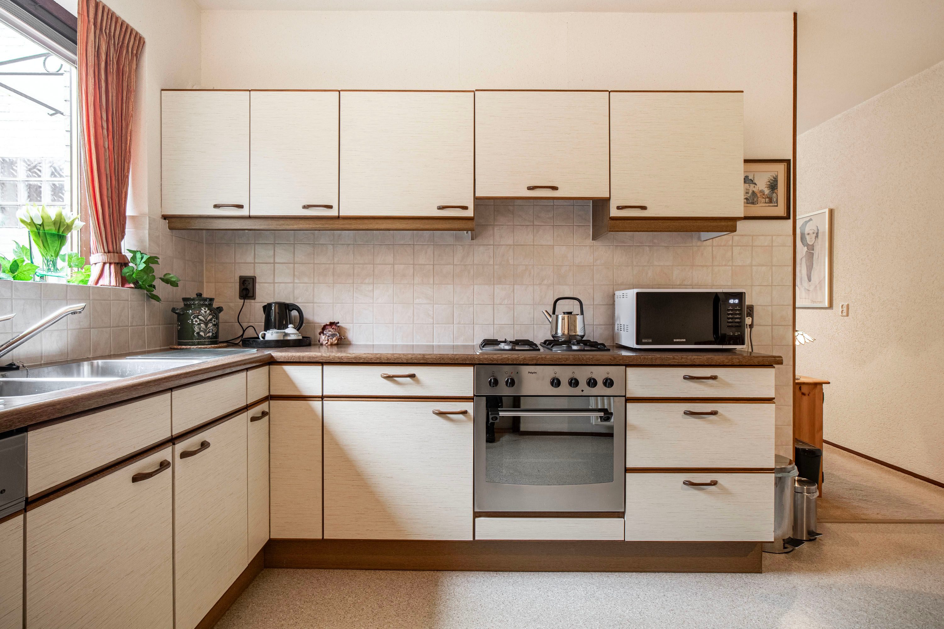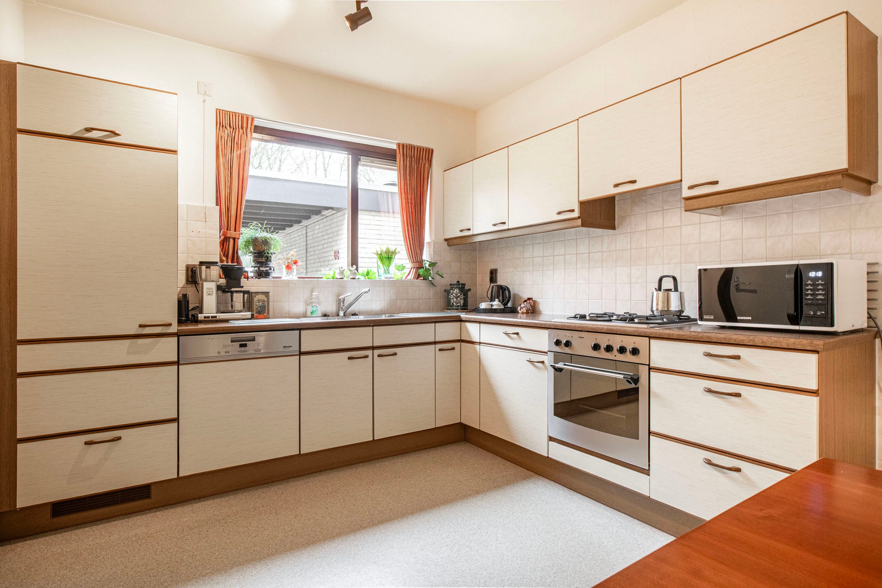 De halfopen eetkeuken biedt voldoende ruimte voor een eettafel en vormt een fijne plek om samen te komen. Vanuit de keuken heb je toegang tot de inpandige berging, ideaal voor extra opslag of het stallen van fietsen.