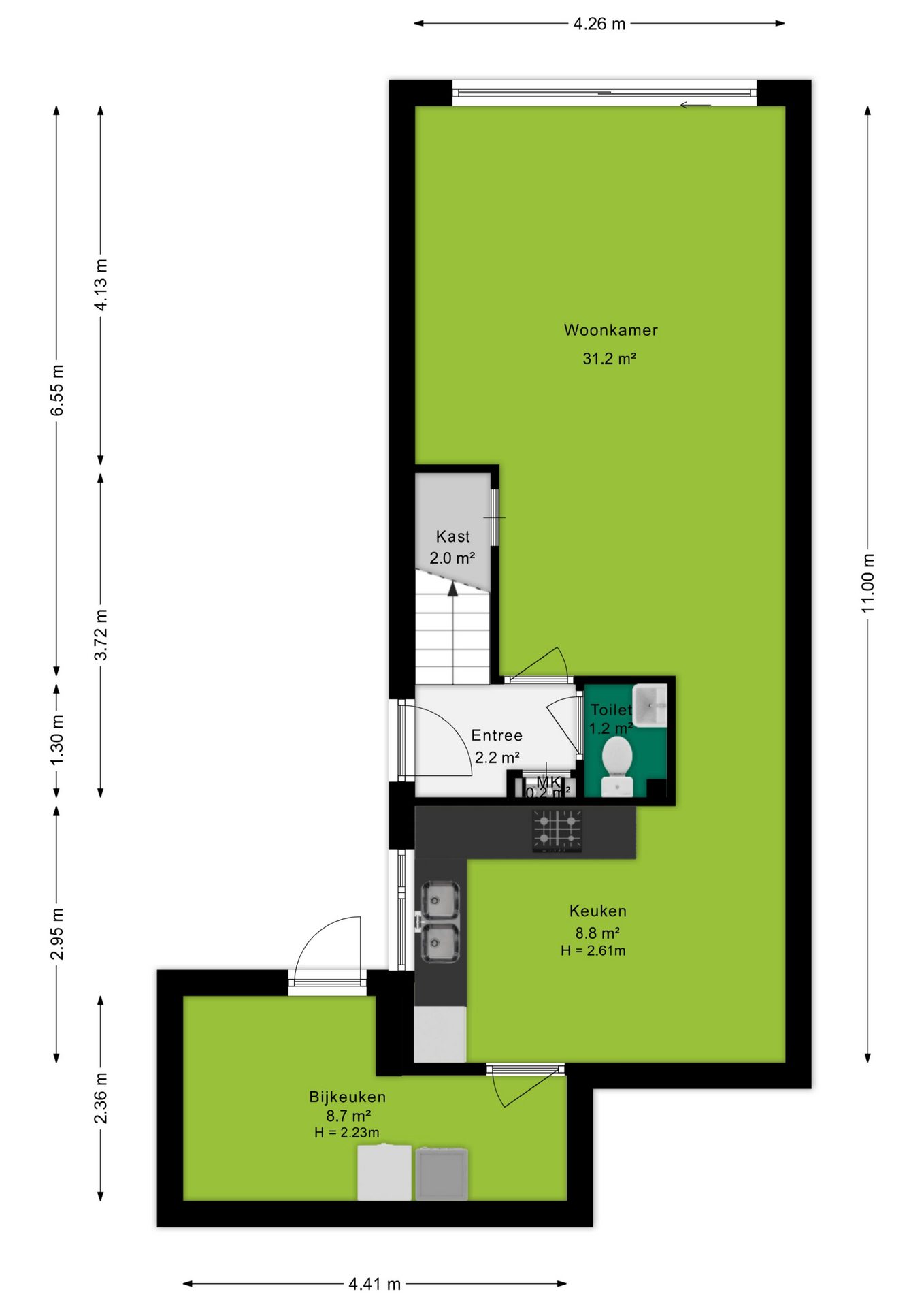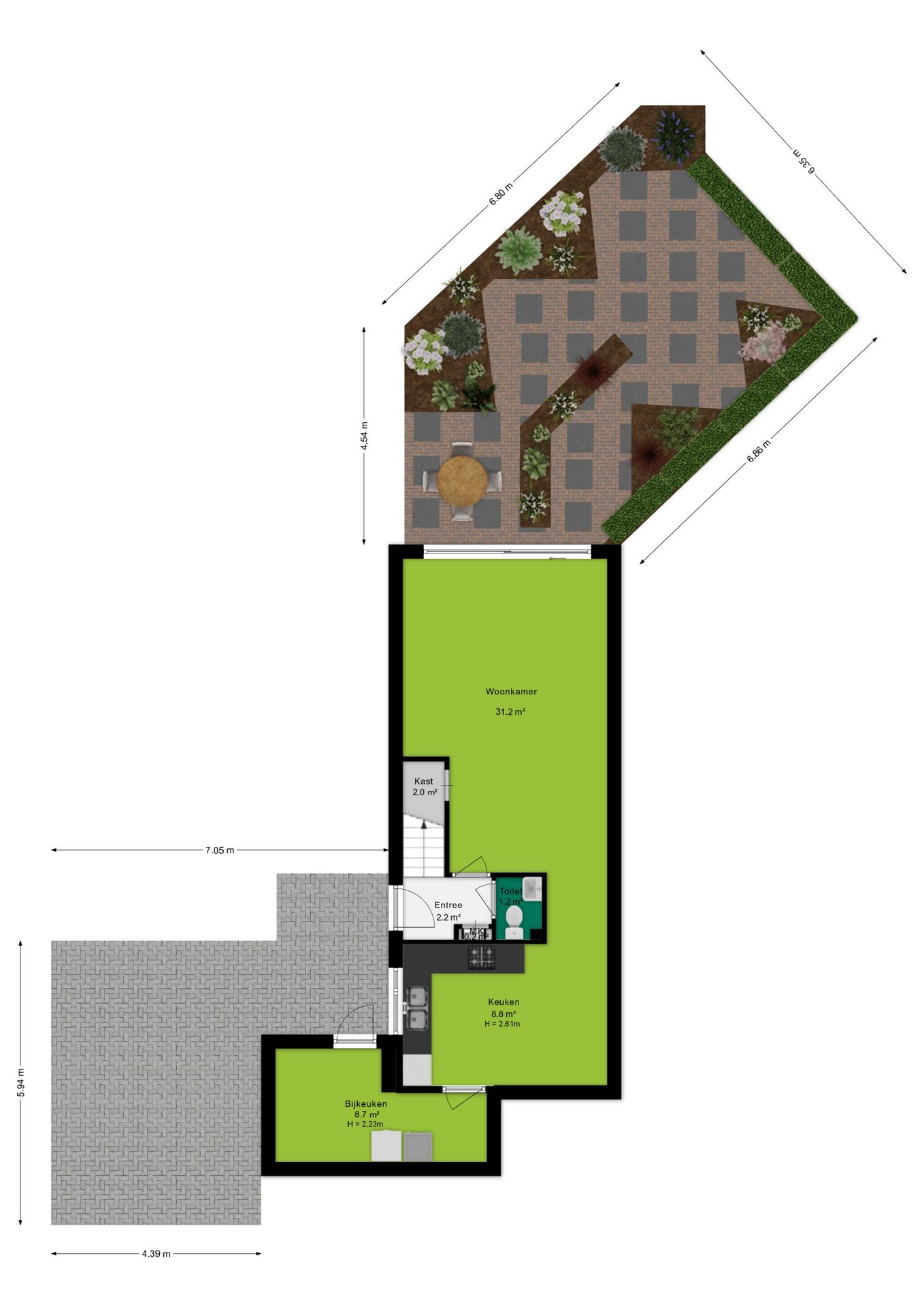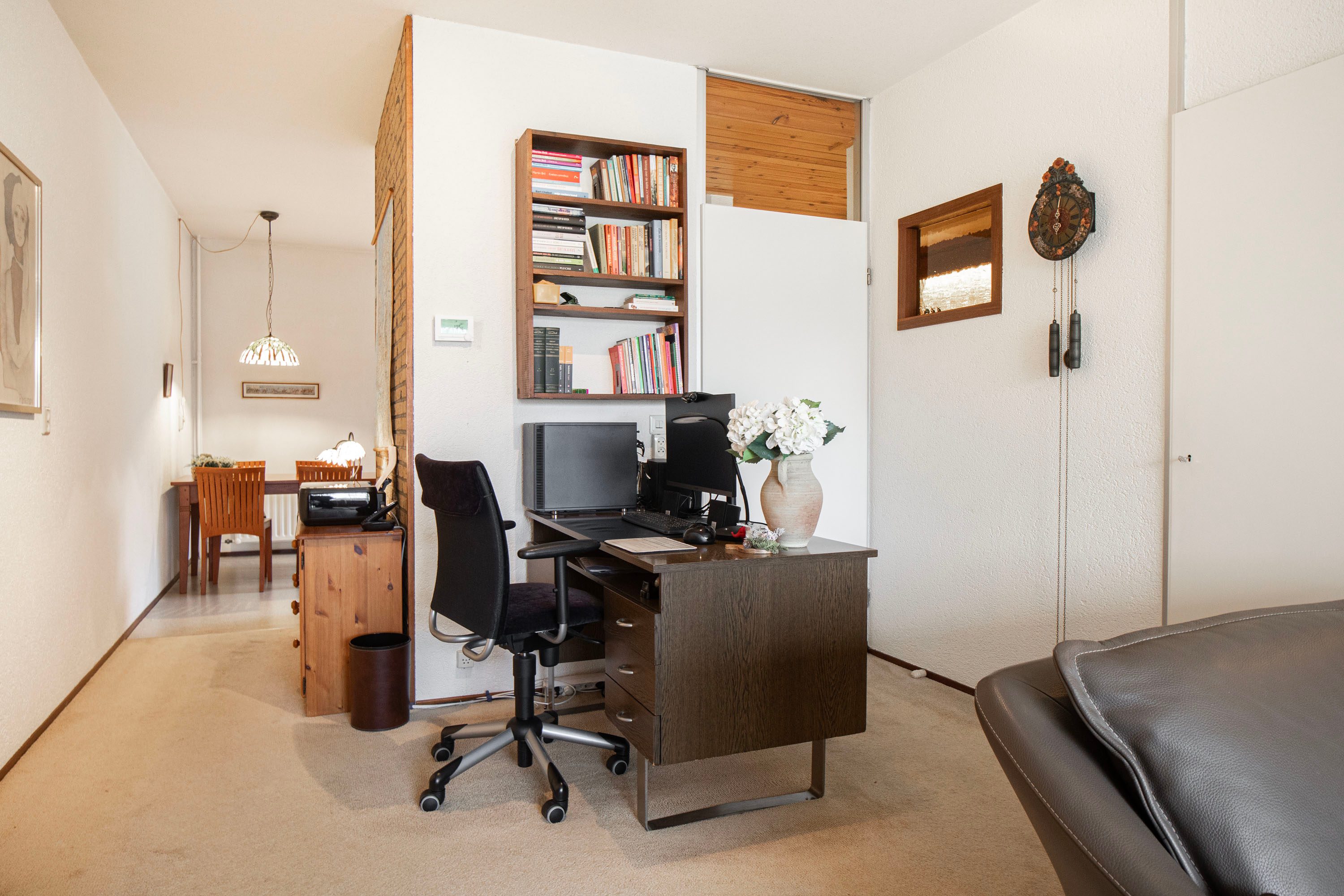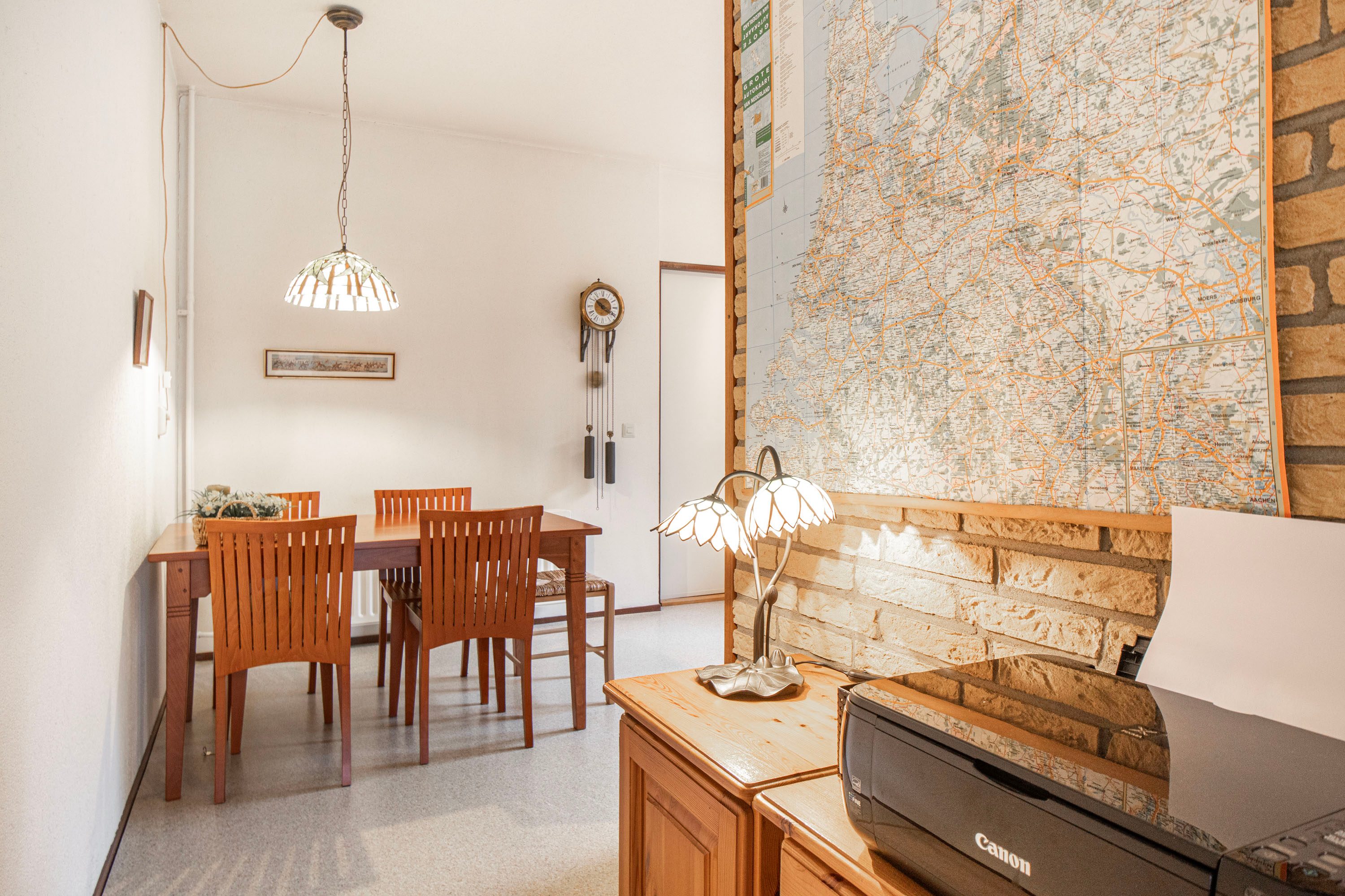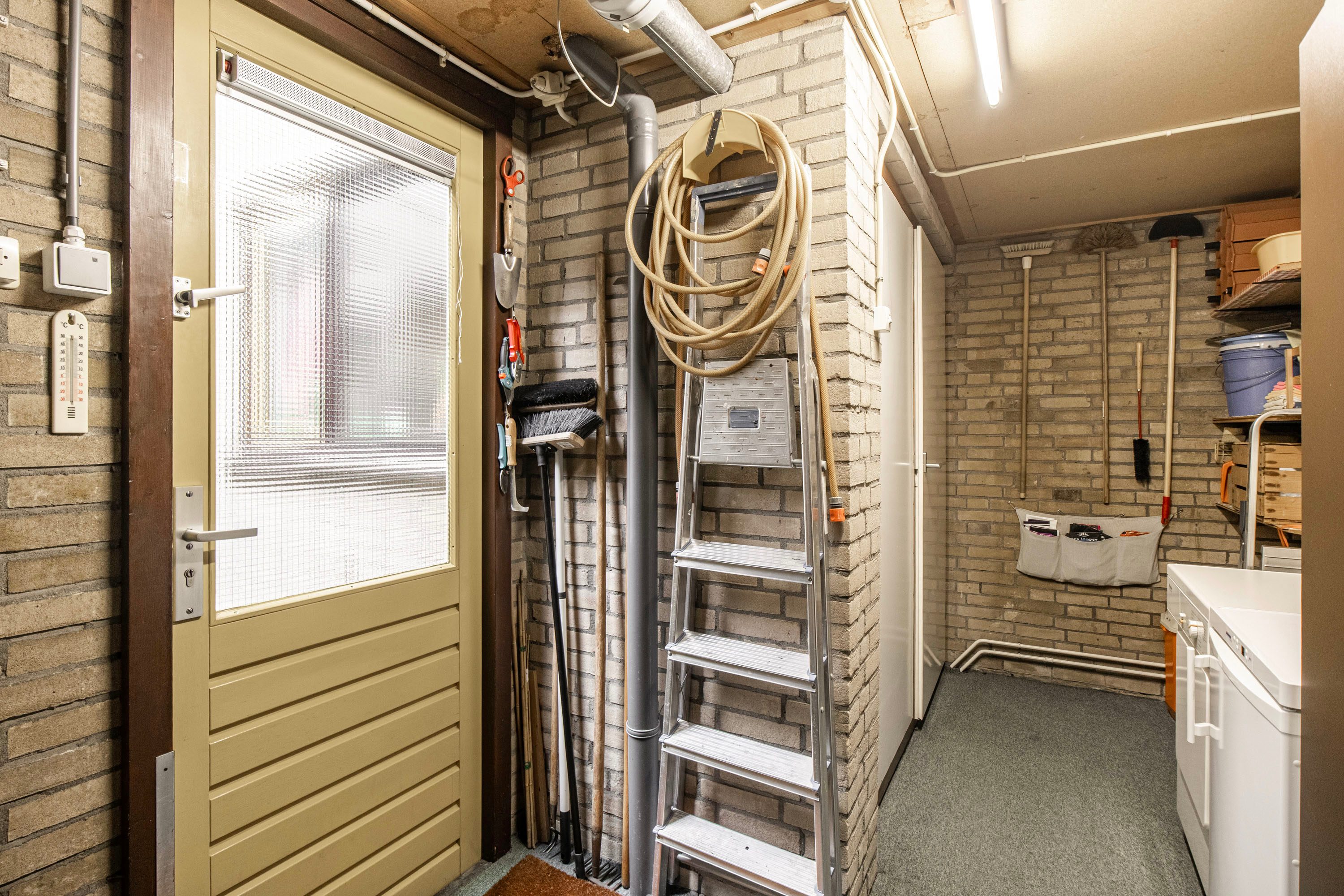 De halfopen eetkeuken biedt voldoende ruimte voor een eettafel en vormt een fijne plek om samen te komen. Vanuit de keuken heb je toegang tot de inpandige berging, ideaal voor extra opslag of het stallen van fietsen.