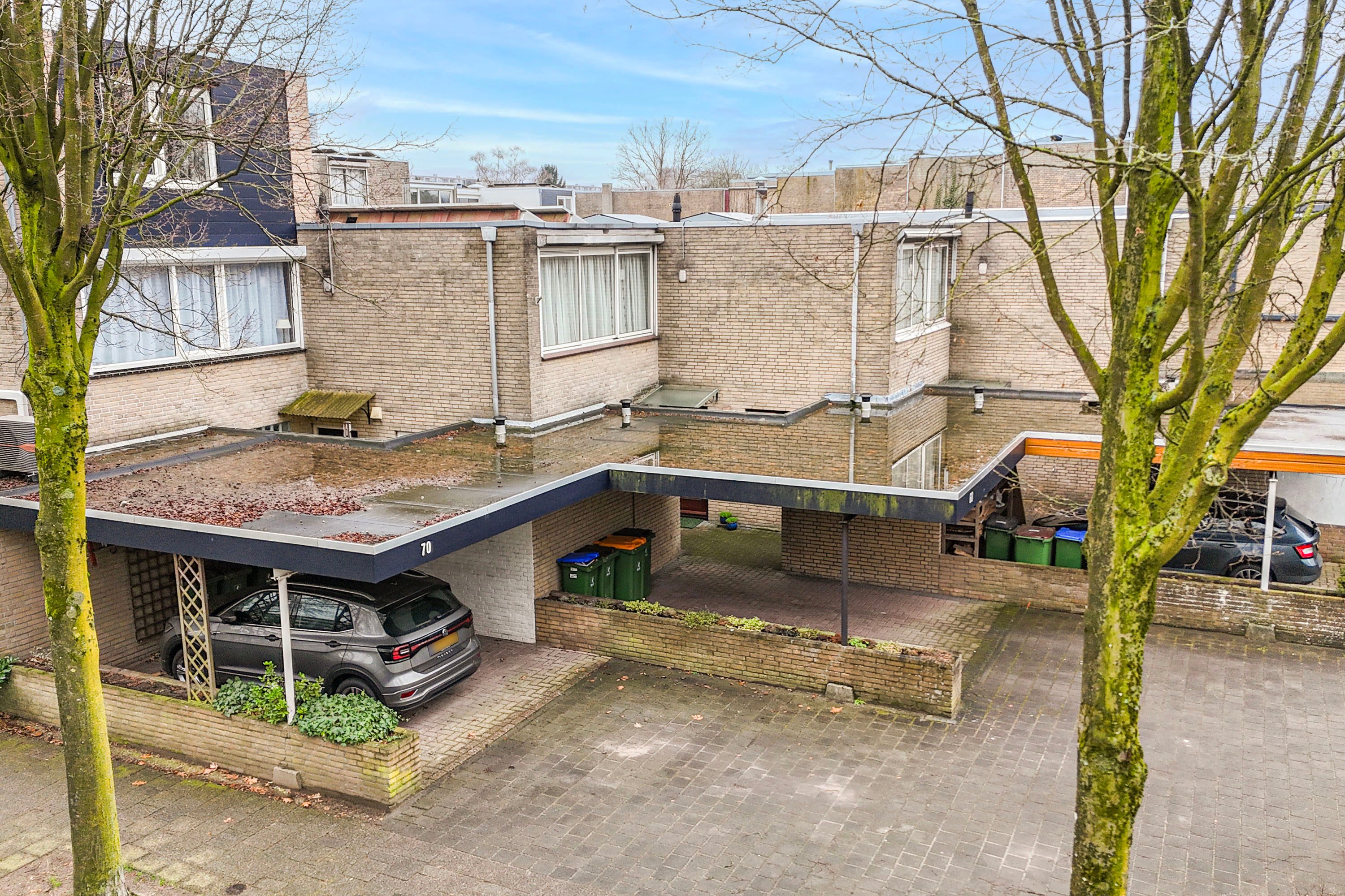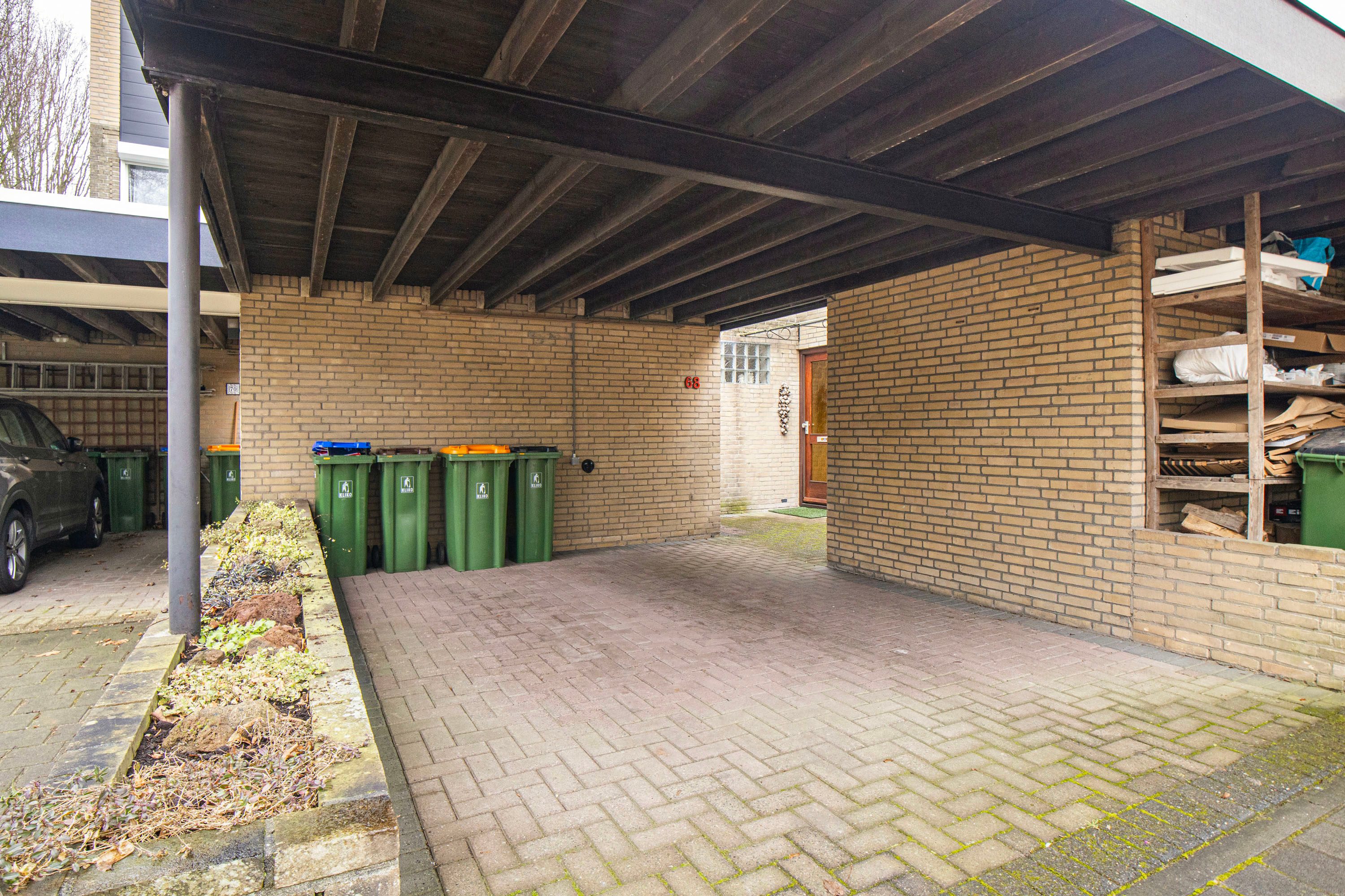 Aan de voorzijde bevindt zich de carport met parkeergelegenheid op eigen terrein.