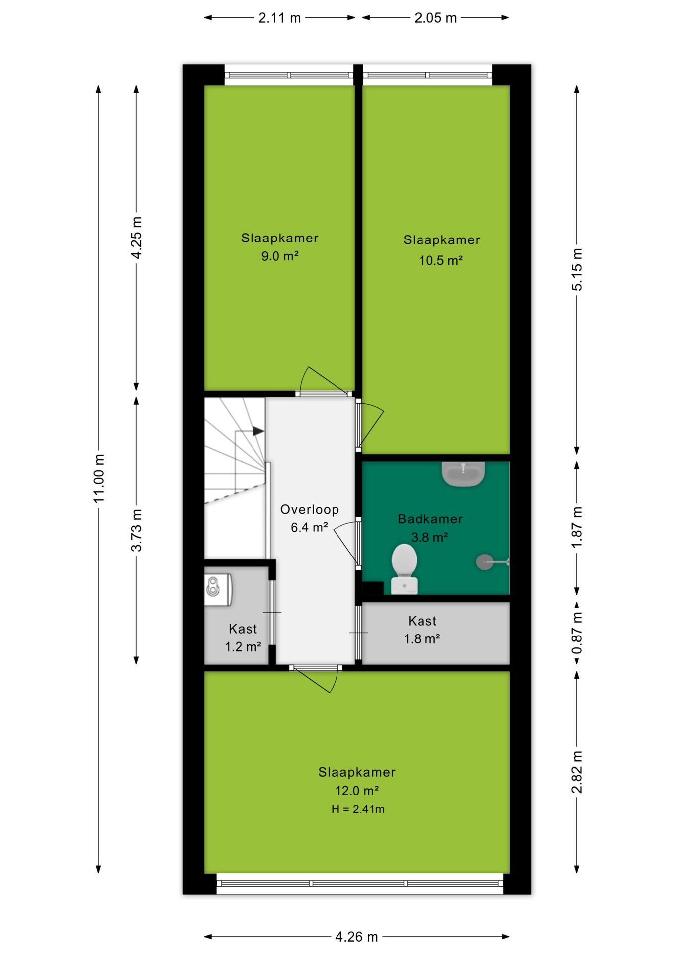 Vanuit de entree bereik je de overloop op de eerste verdieping die toegang biedt aan alle ruimtes. Er zijn in totaal 3 slaapkamers, allen ruim van opzet. Twee slaapkamers zijn aan de achterzijde gelegen en een aan de voorzijde van de woning. De voorste slaapkamer is voorzien van een elektrisch bedienbare zonneluifel. De slaapkamers aan de achterzijde beschikken over elektrisch bedienbare screens (2025).