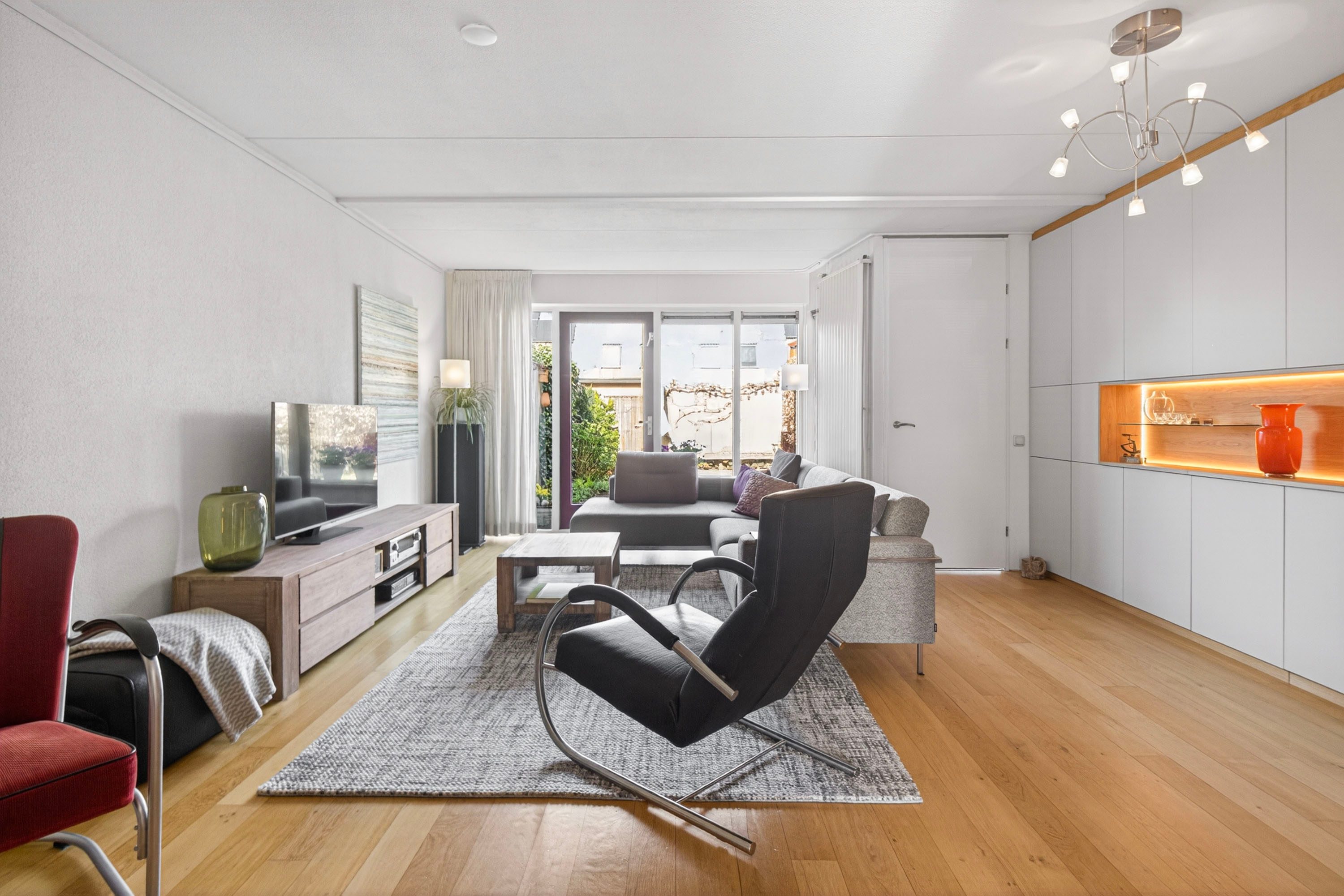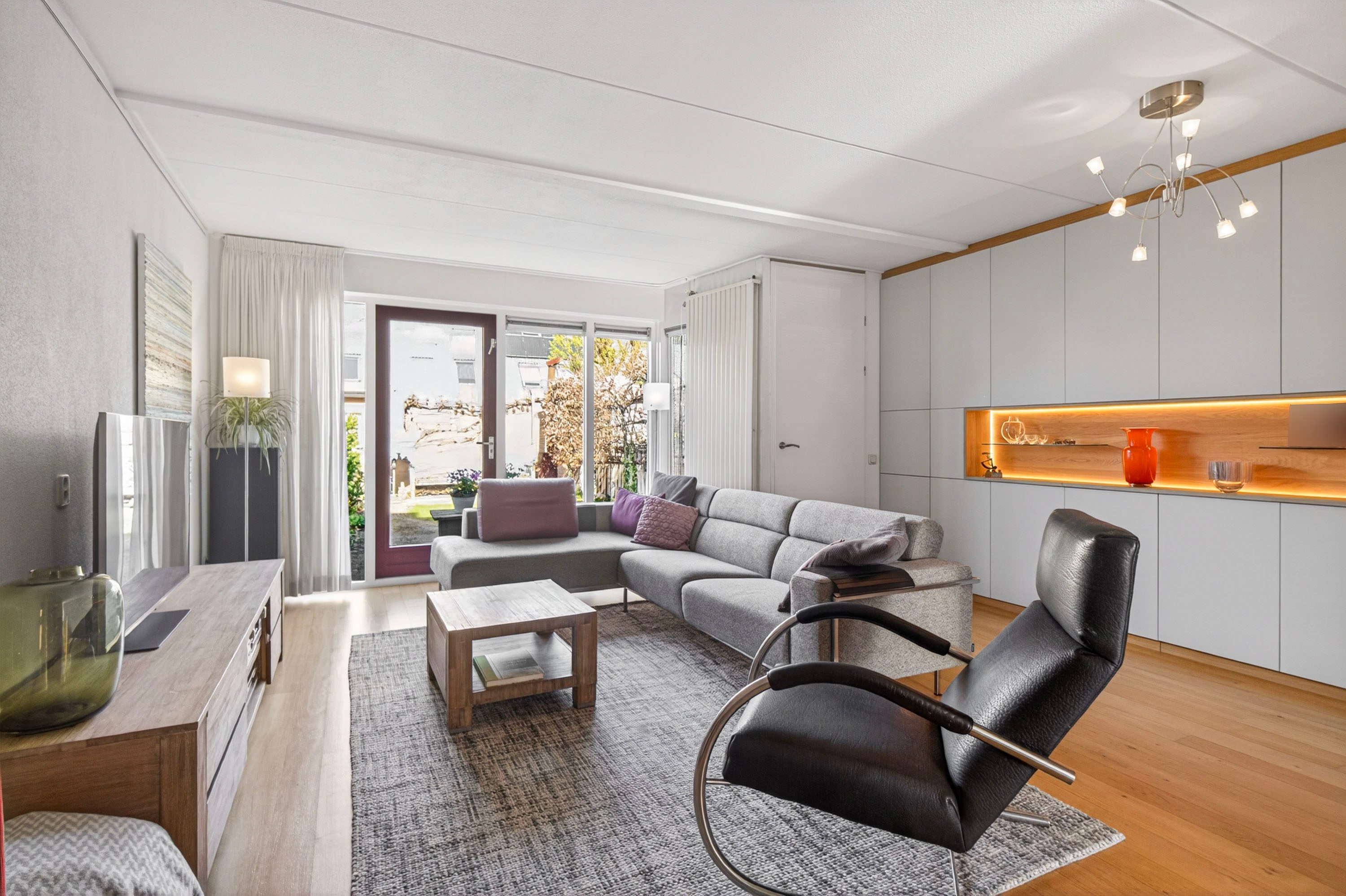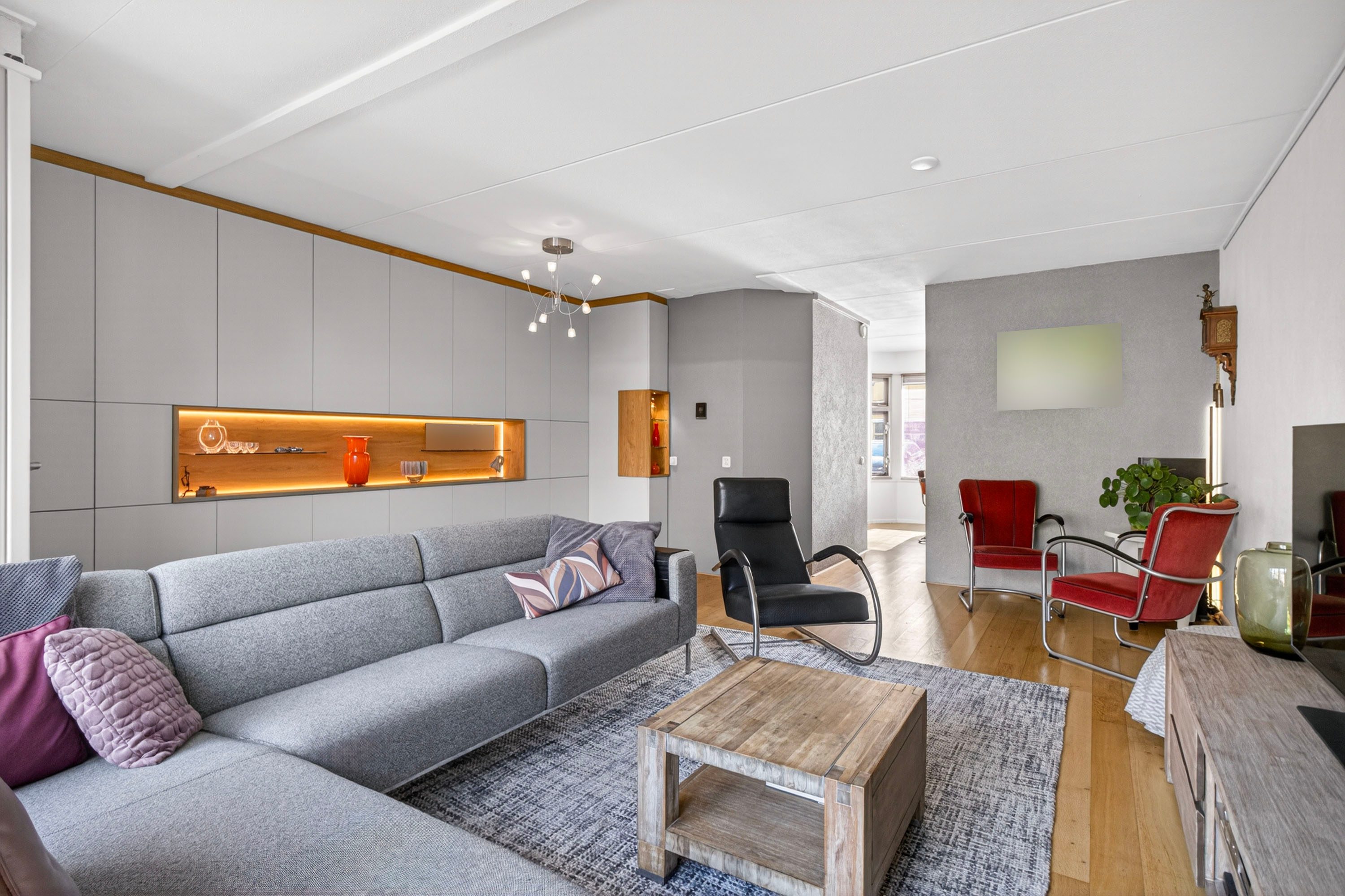 De keuken staat in open verbinding met de ruime en lichte woonkamer aan de achterzijde. Dankzij de grote raampartijen geniet je hier van veel natuurlijk licht. Vanuit de woonkamer heb je toegang tot de tuin én tot een praktische tweede hal, die momenteel wordt gebruikt voor de extra bergruimte.