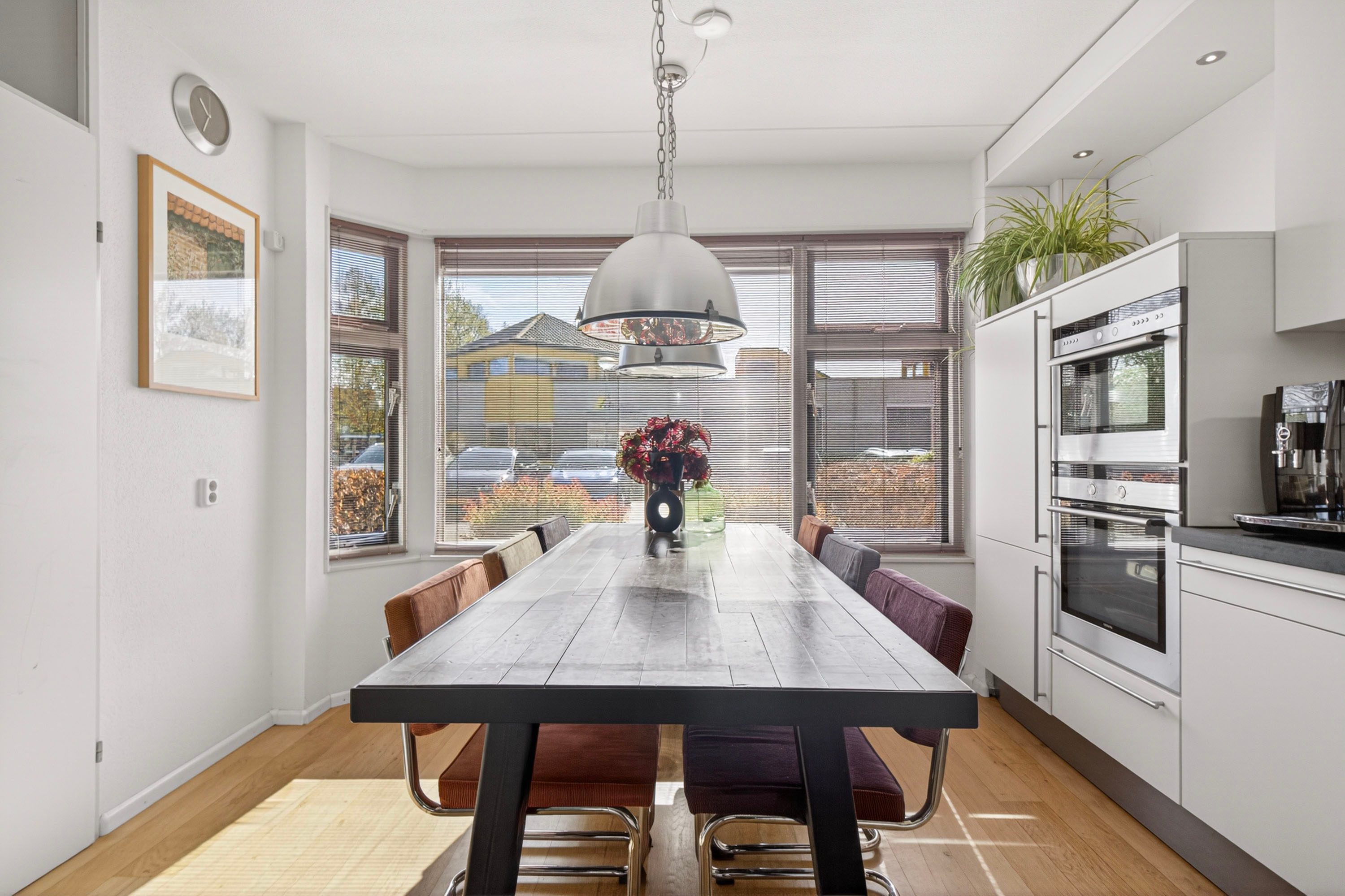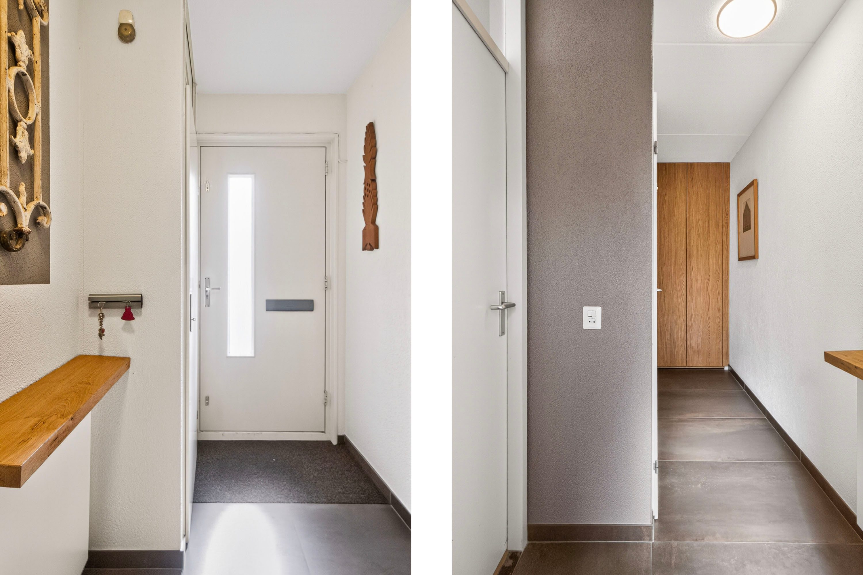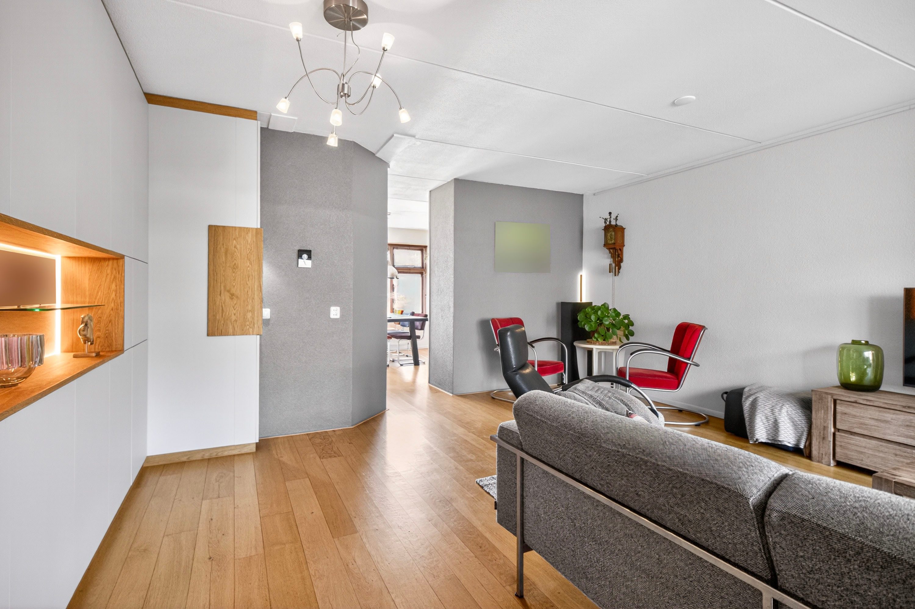 De keuken staat in open verbinding met de ruime en lichte woonkamer aan de achterzijde. Dankzij de grote raampartijen geniet je hier van veel natuurlijk licht. Vanuit de woonkamer heb je toegang tot de tuin én tot een praktische tweede hal, die momenteel wordt gebruikt voor de extra bergruimte.