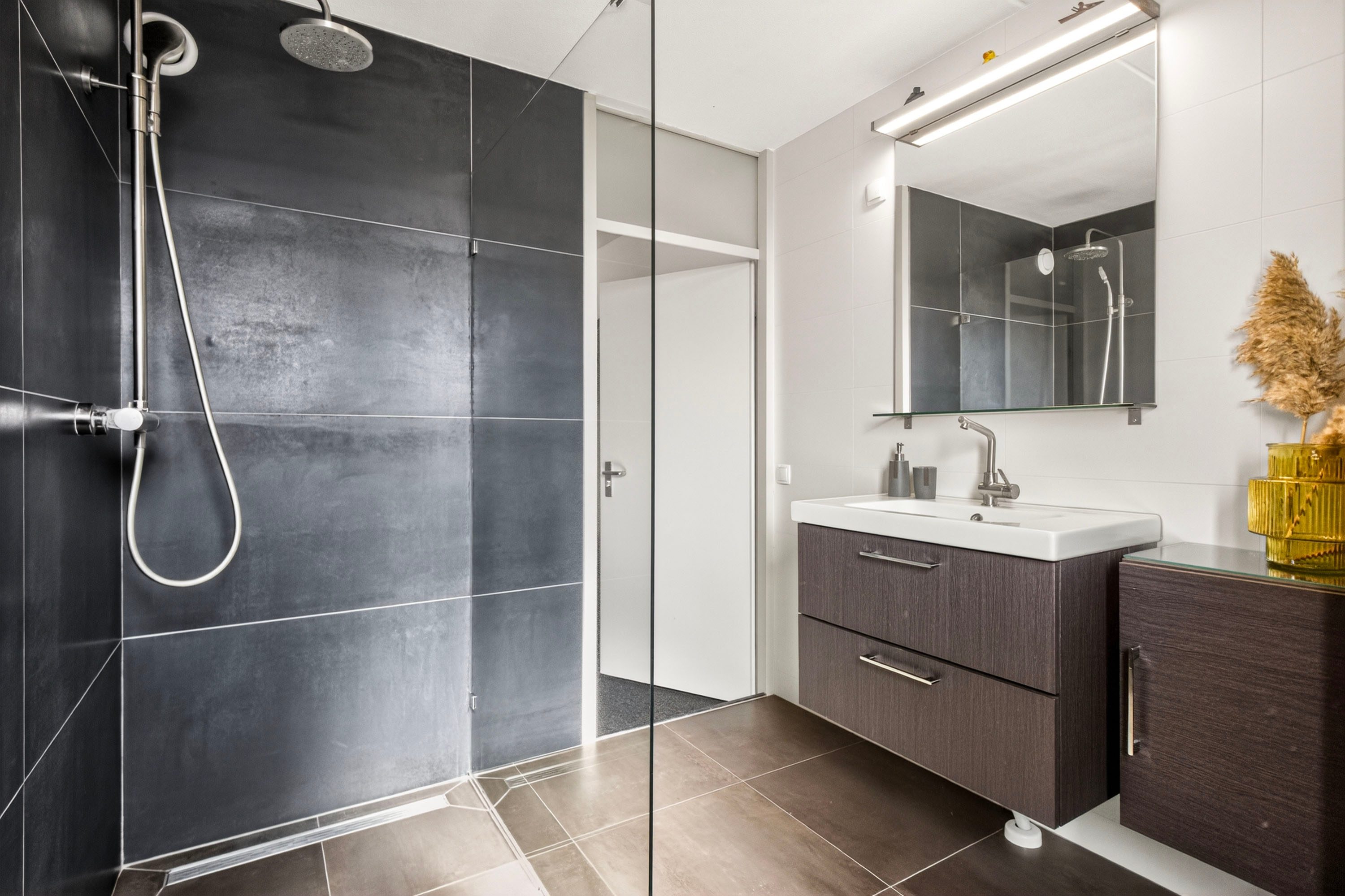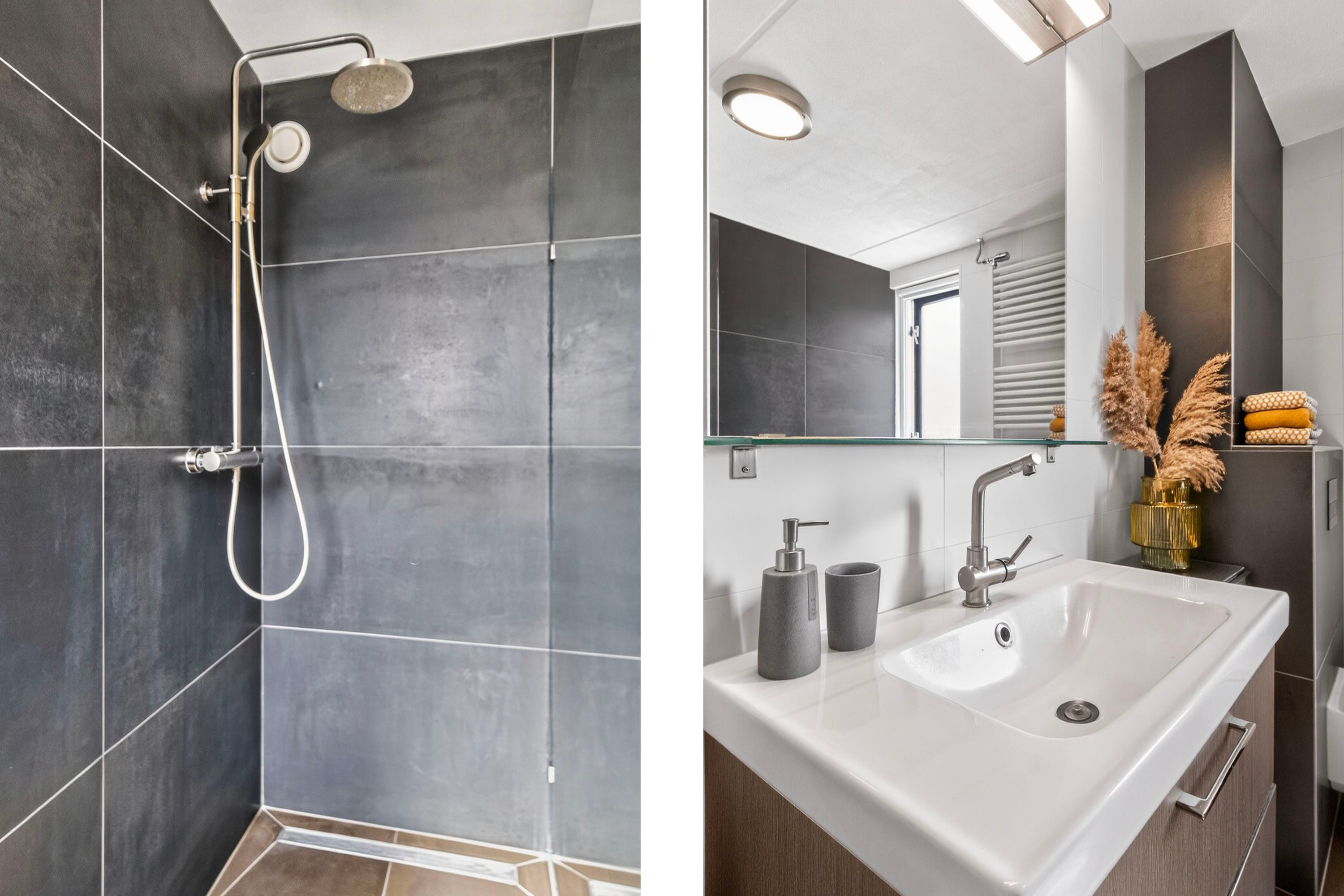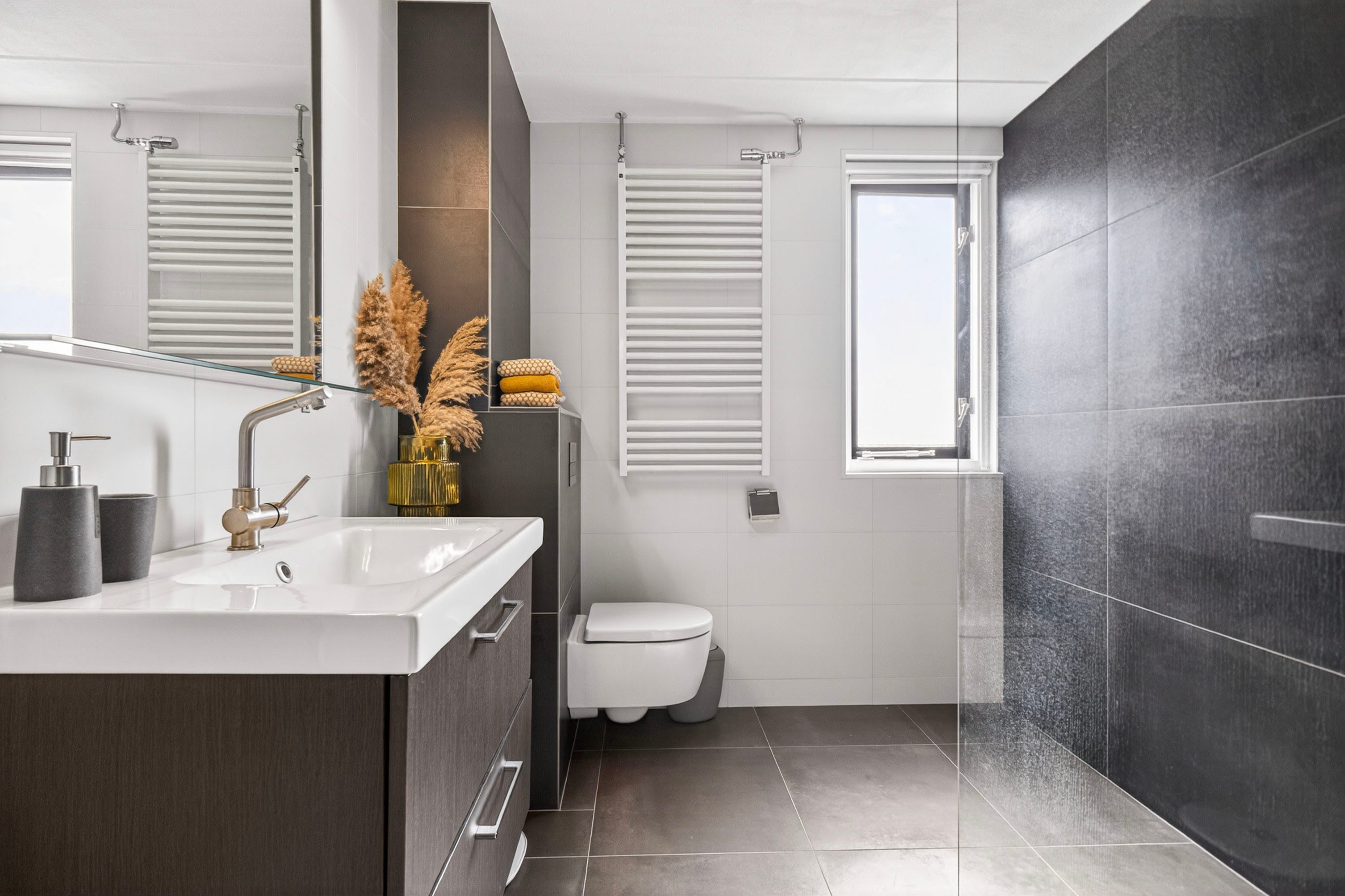 De moderne badkamer (2019) is compleet uitgevoerd met een inloopdouche, wastafelmeubel, spiegel, zwevend toilet en designradiator.