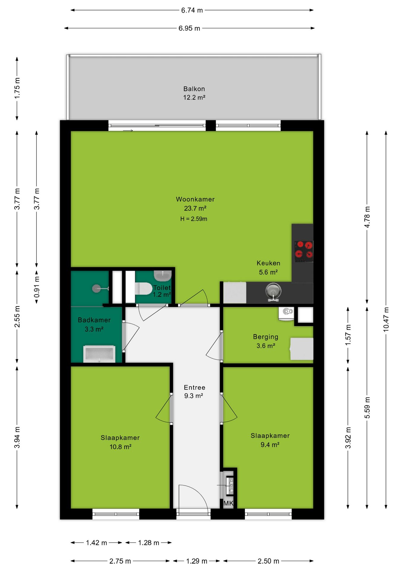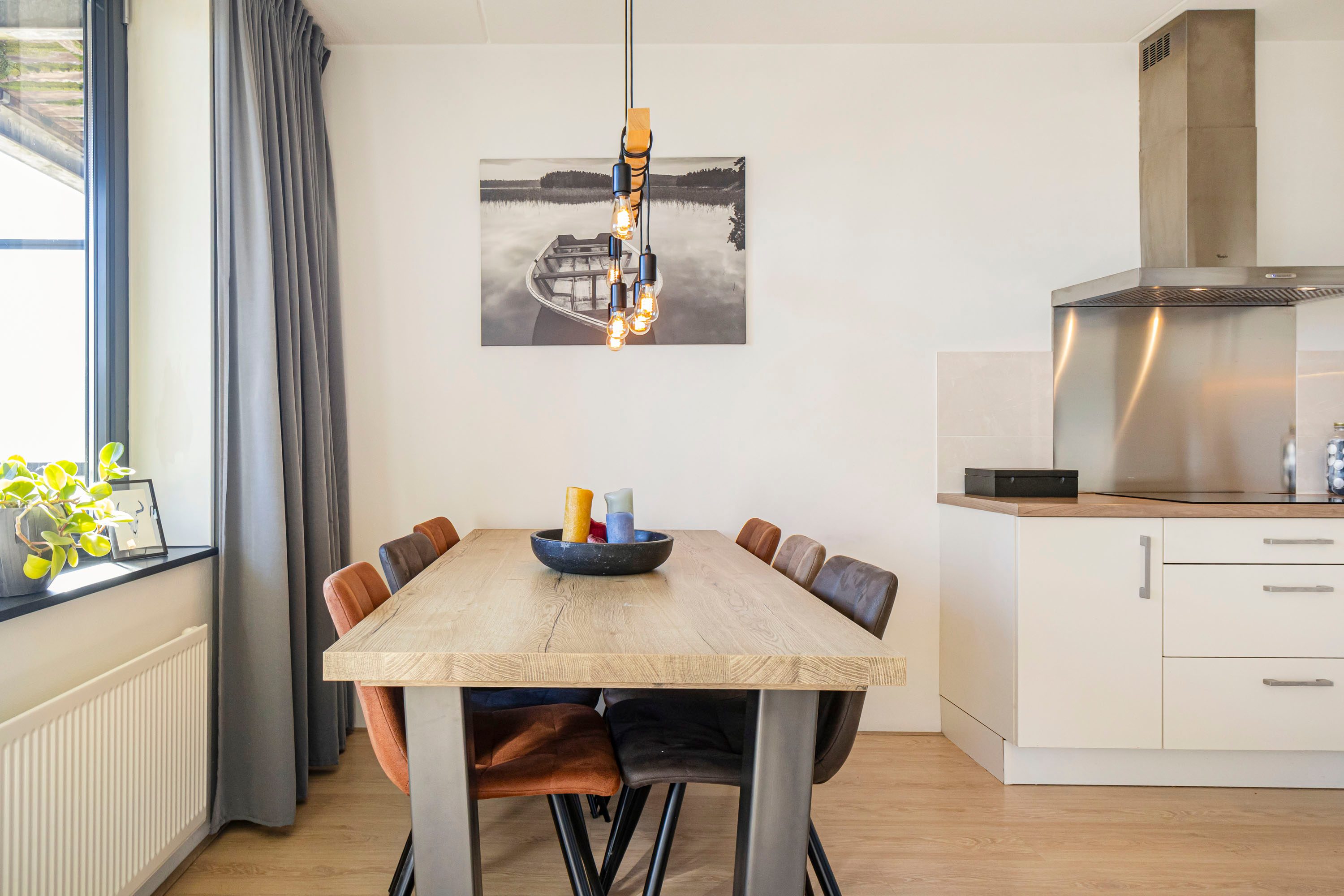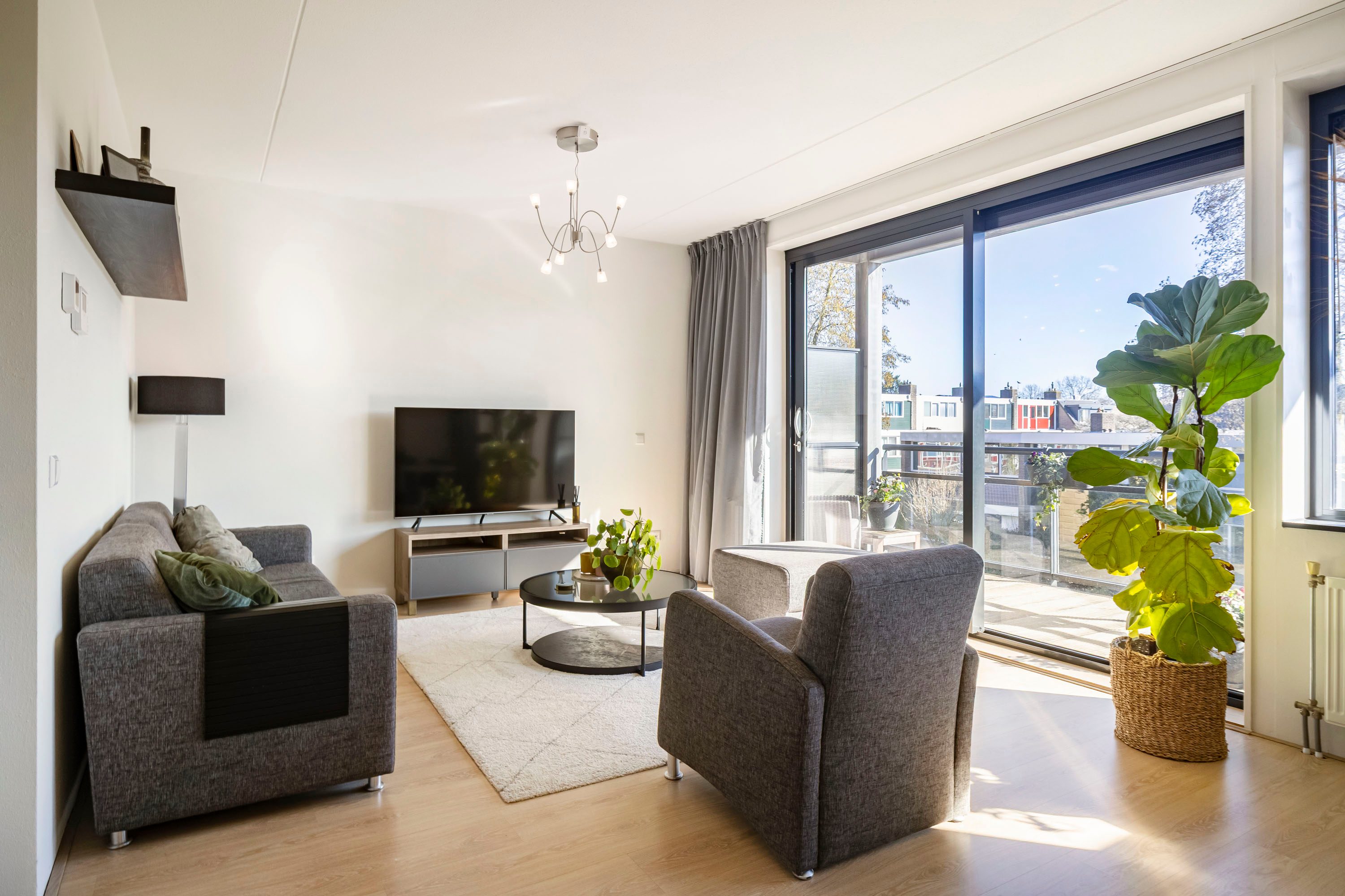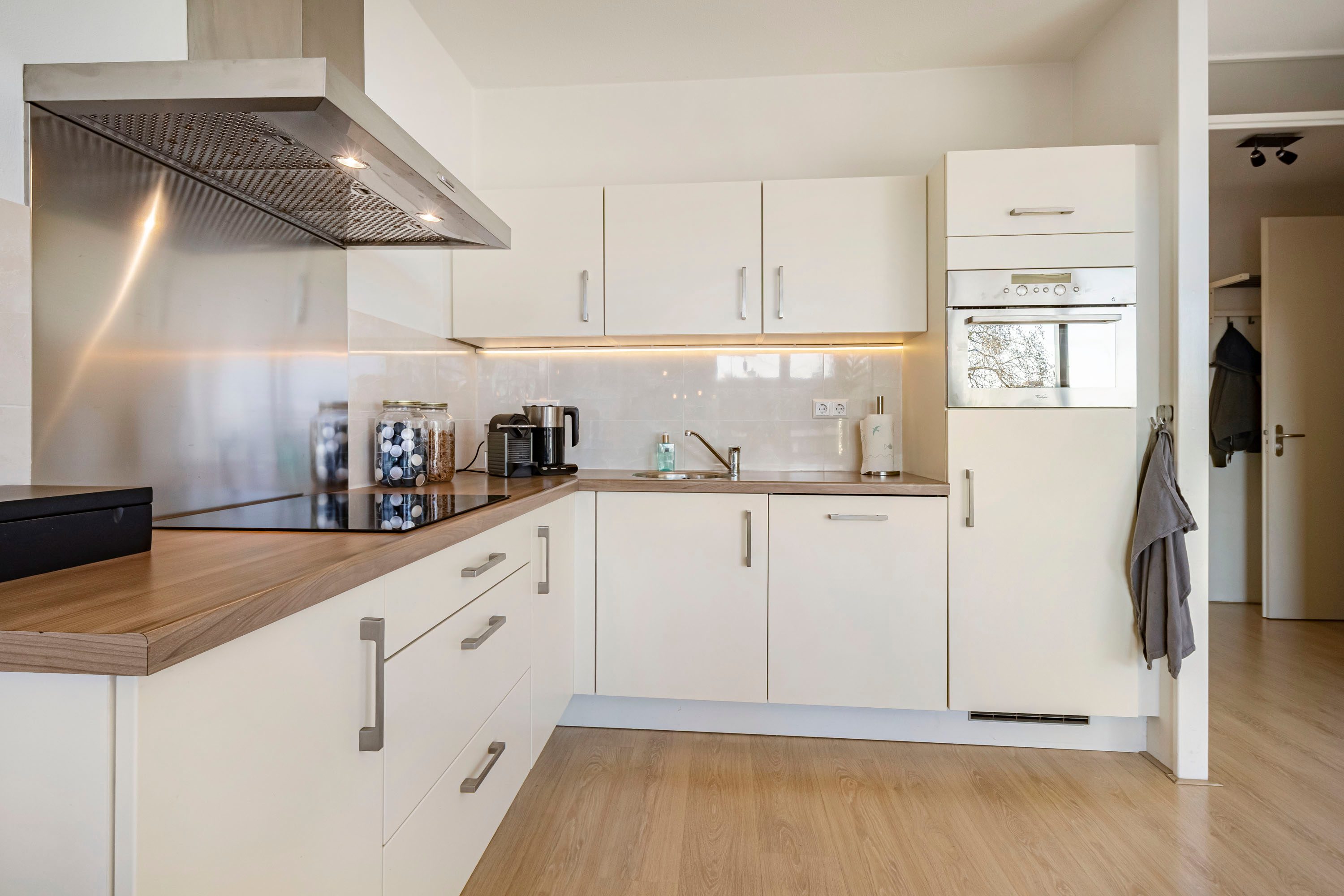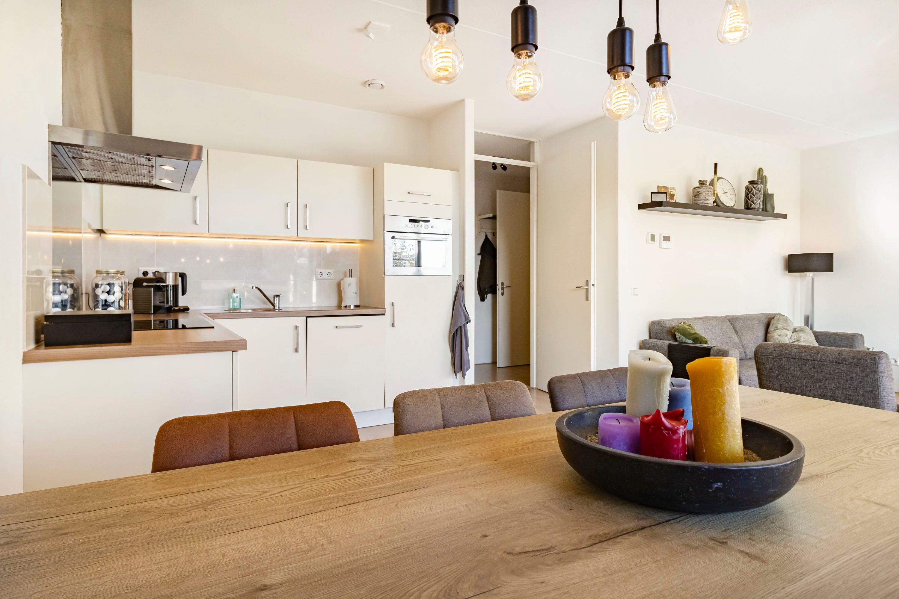 De leefruimte is praktisch en prettig ingedeeld. De woonkamer biedt voldoende ruimte voor een royale zithoek en een gezellige eethoek. Dankzij de grote schuifpui naar het balkon geniet je hier van veel natuurlijk licht en een fijne verbinding met buiten.
