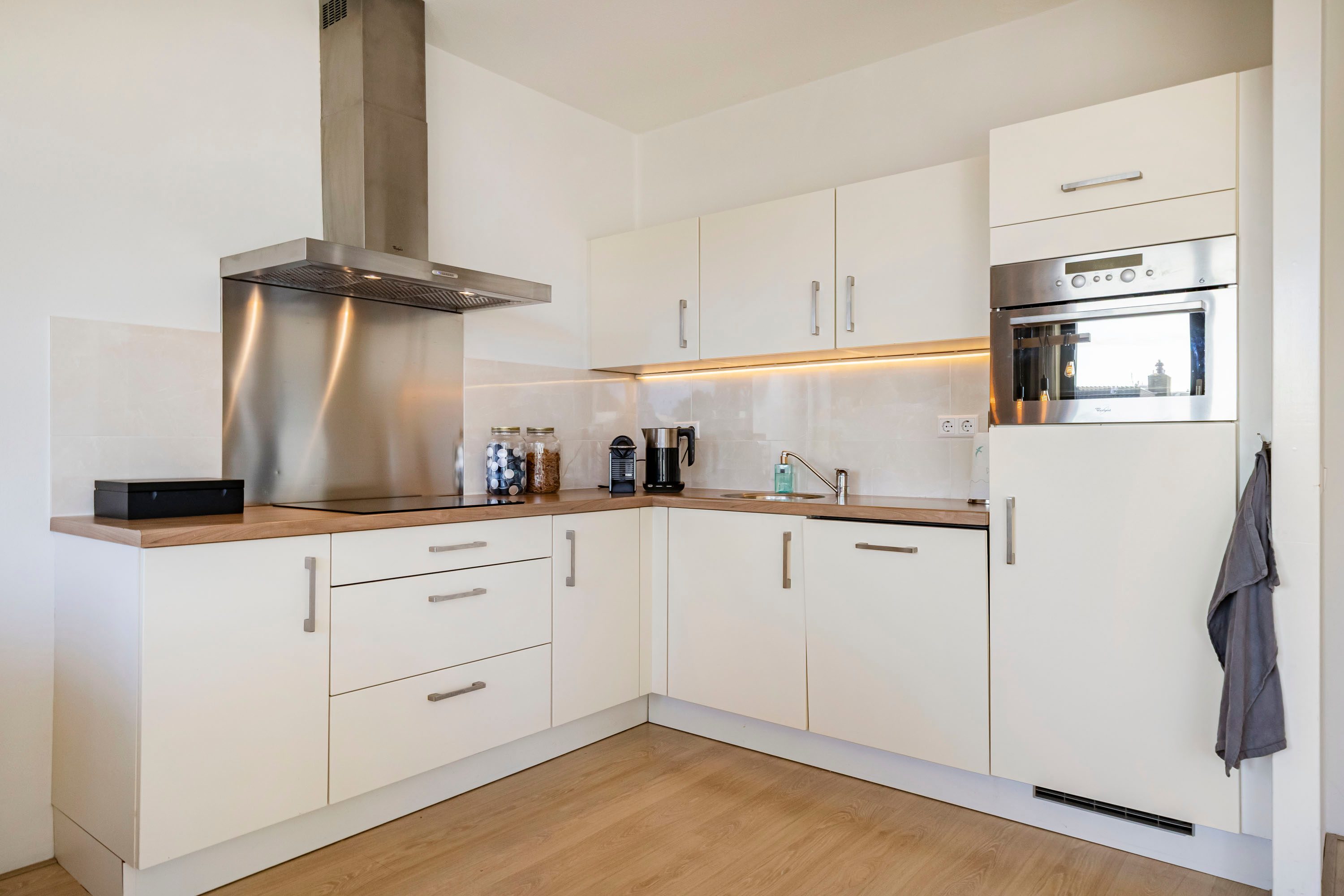 De open keuken staat in directe verbinding met de woonkamer en is compleet uitgerust met onder andere een inductiekookplaat, afzuigkap, magnetron, combi-oven, koelkast en vaatwasser.