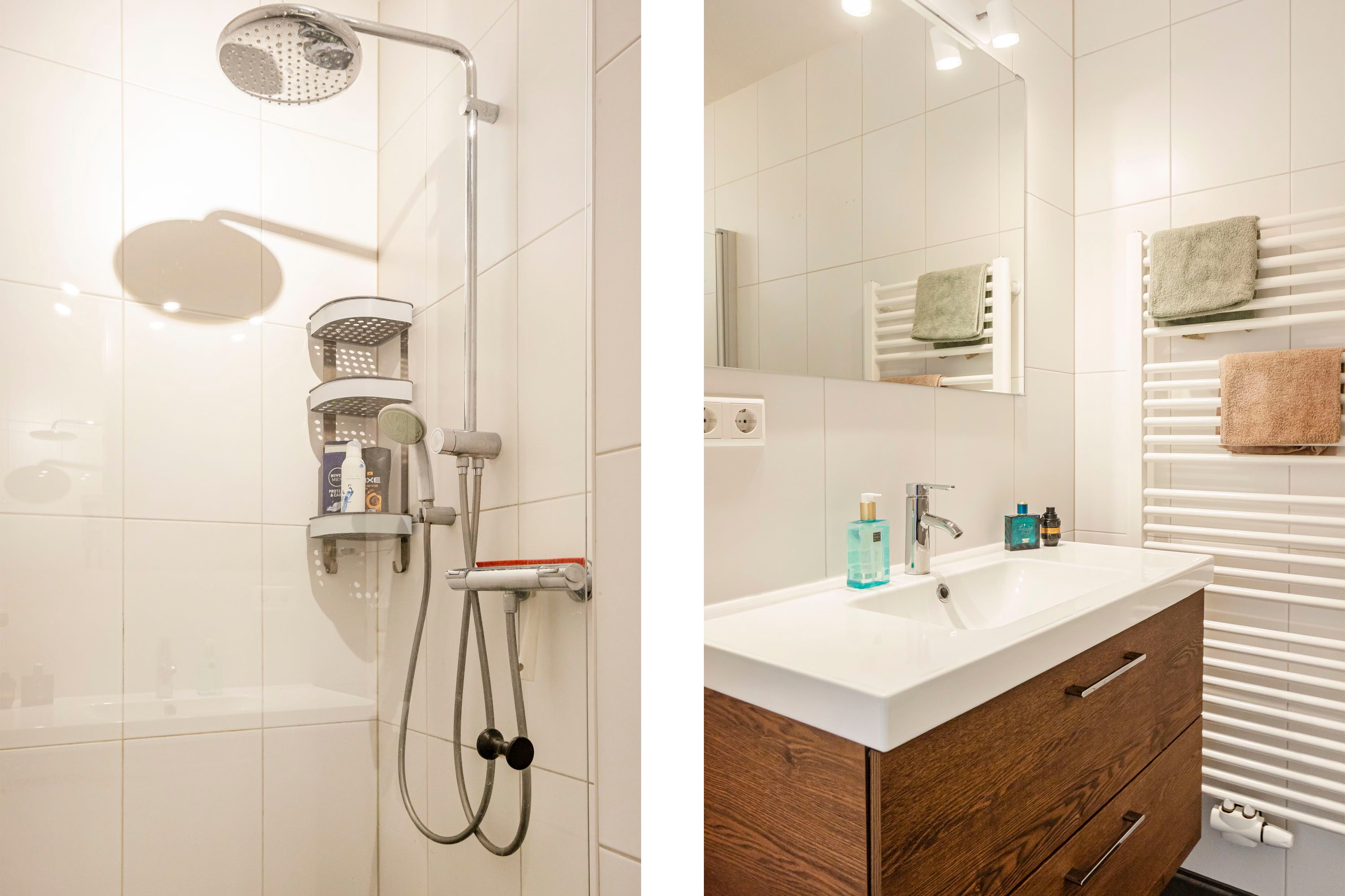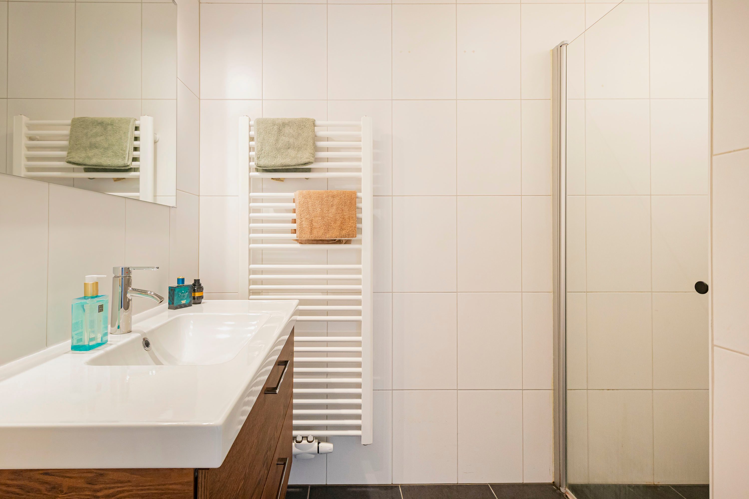 De moderne badkamer is verzorgd uitgevoerd en voorzien van een inloopdouche, wastafel met meubel en designradiator. Het toilet is separaat, wat extra comfort biedt in het dagelijks gebruik.
