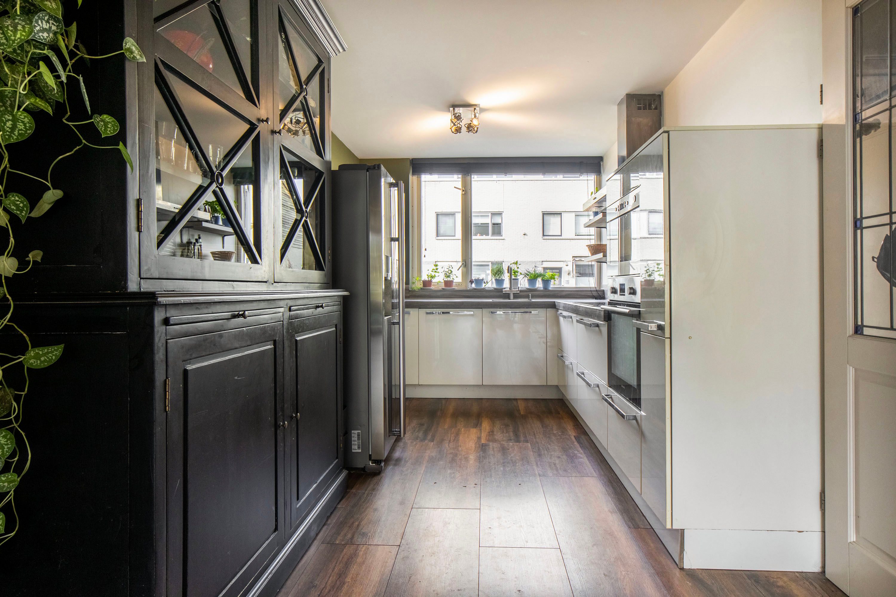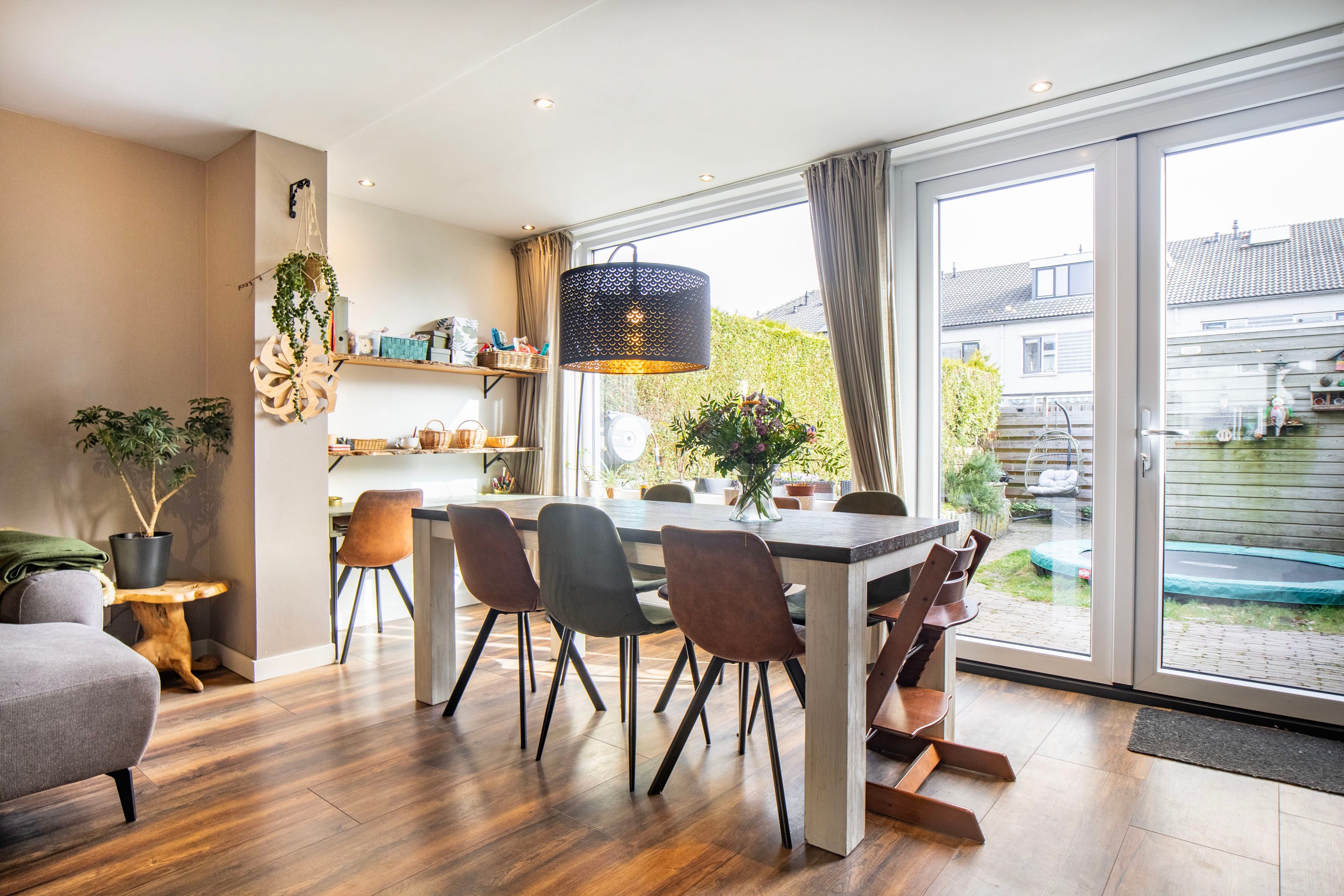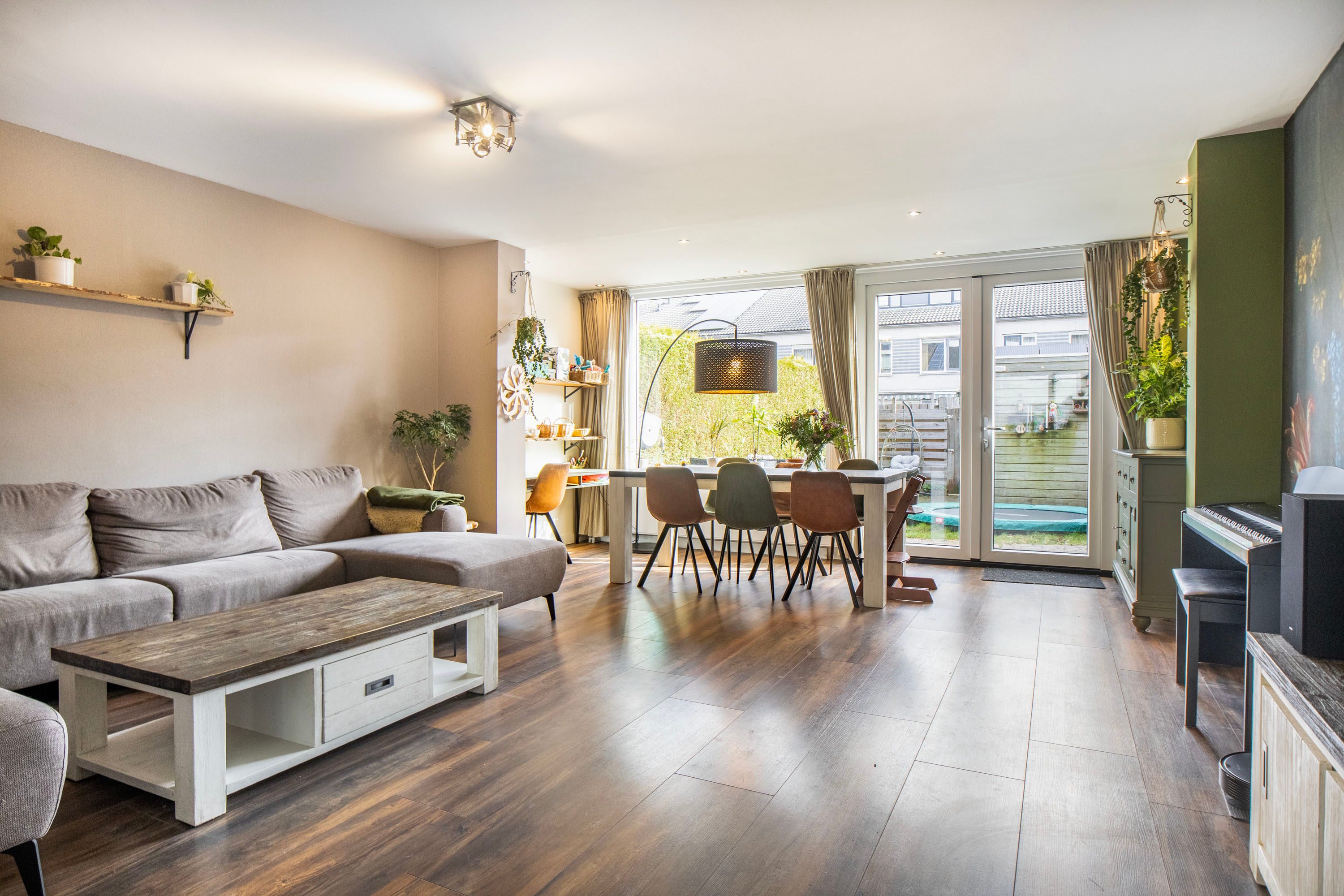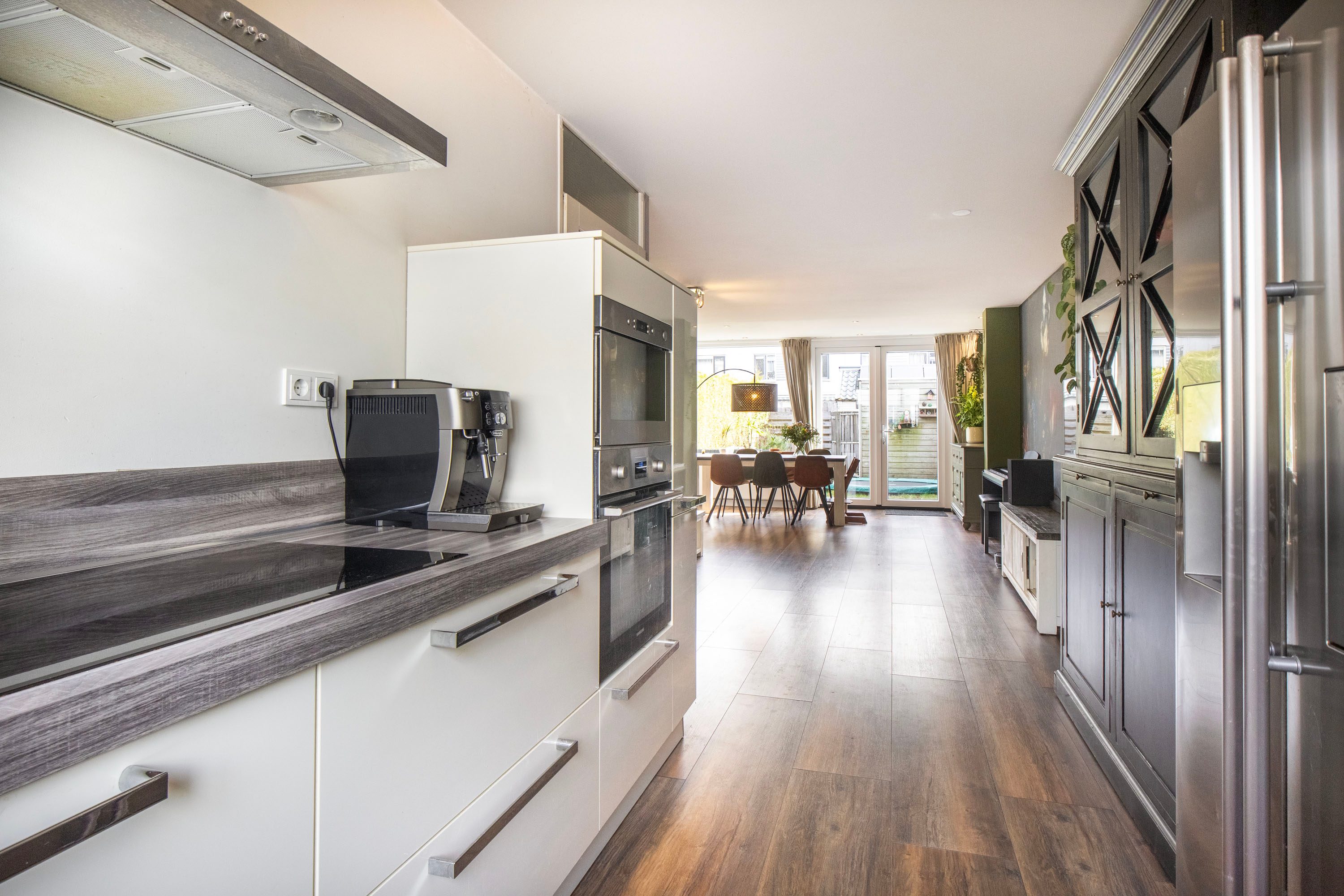 Bij binnenkomst kom je in de hal met de meterkast en het separate toilet. Vanuit hier loop je door naar de ruime en lichte woonkamer van circa 35 m². De woonkamer voelt ruim en open aan dankzij de grote raampartijen. Via de openslaande deuren heb je direct toegang tot de achtertuin, waardoor binnen en buiten mooi in elkaar overlopen. Aan de voorzijde van de woning bevindt zich de halfopen keuken van circa 9 m². Deze keuken is in 2016 vernieuwd en voorzien van diverse inbouwapparatuur, waaronder een kookplaat, afzuigkap, magnetron, oven, koel-vriescombinatie en vaatwasser. Daarnaast is er een Howat heetwaterkraan aanwezig, ideaal voor direct kokend water. Dankzij het grote raam valt er ook hier veel daglicht naar binnen.