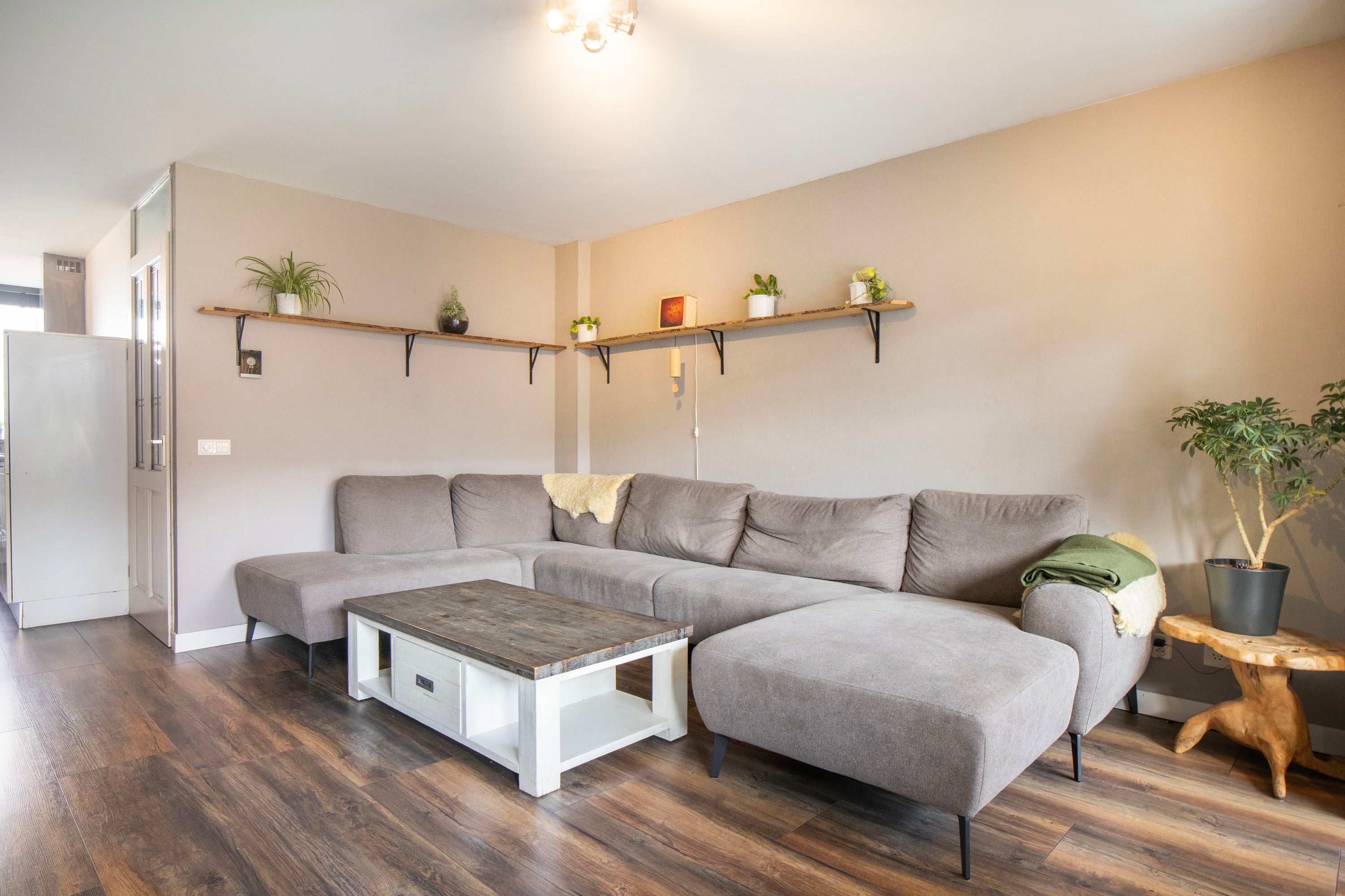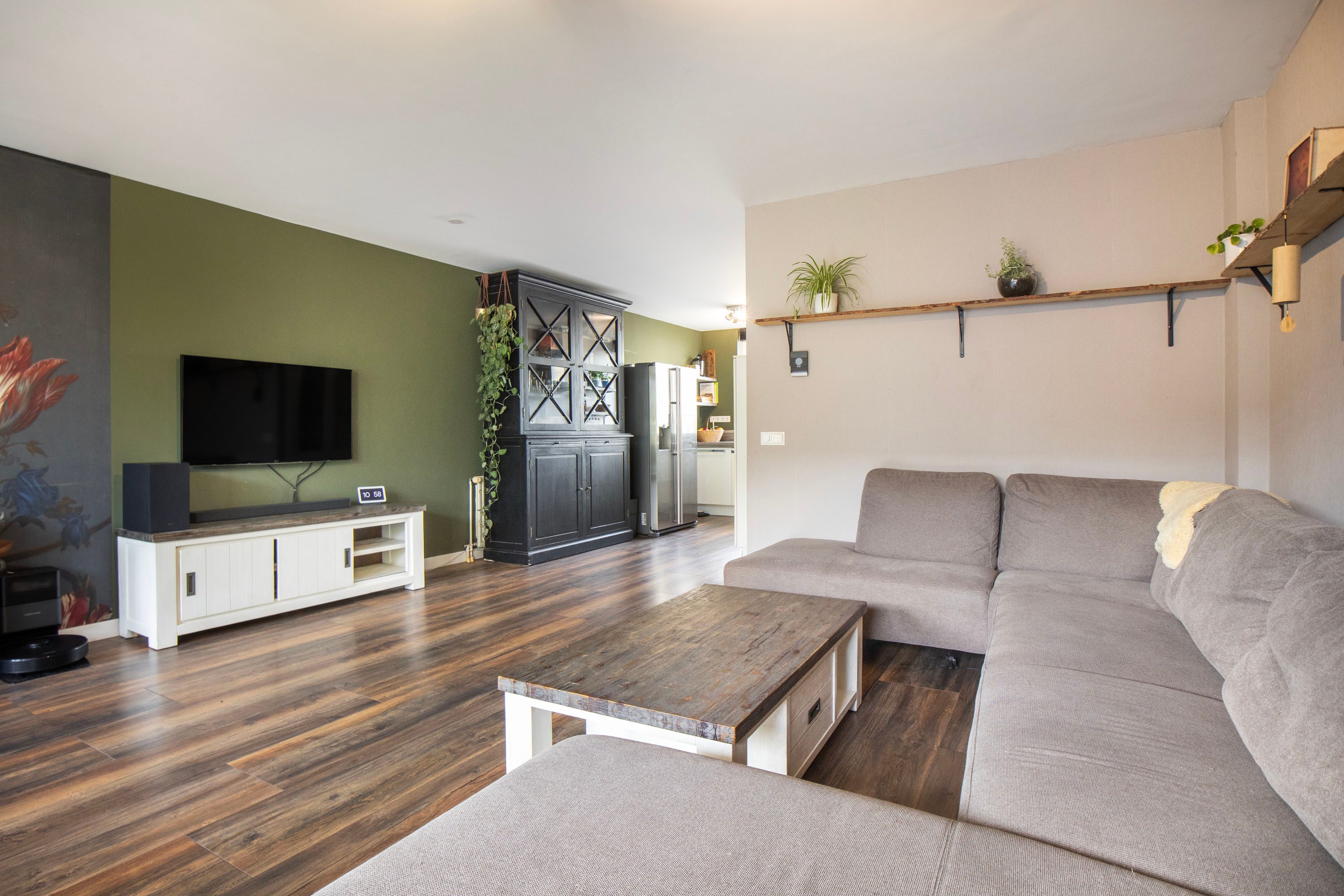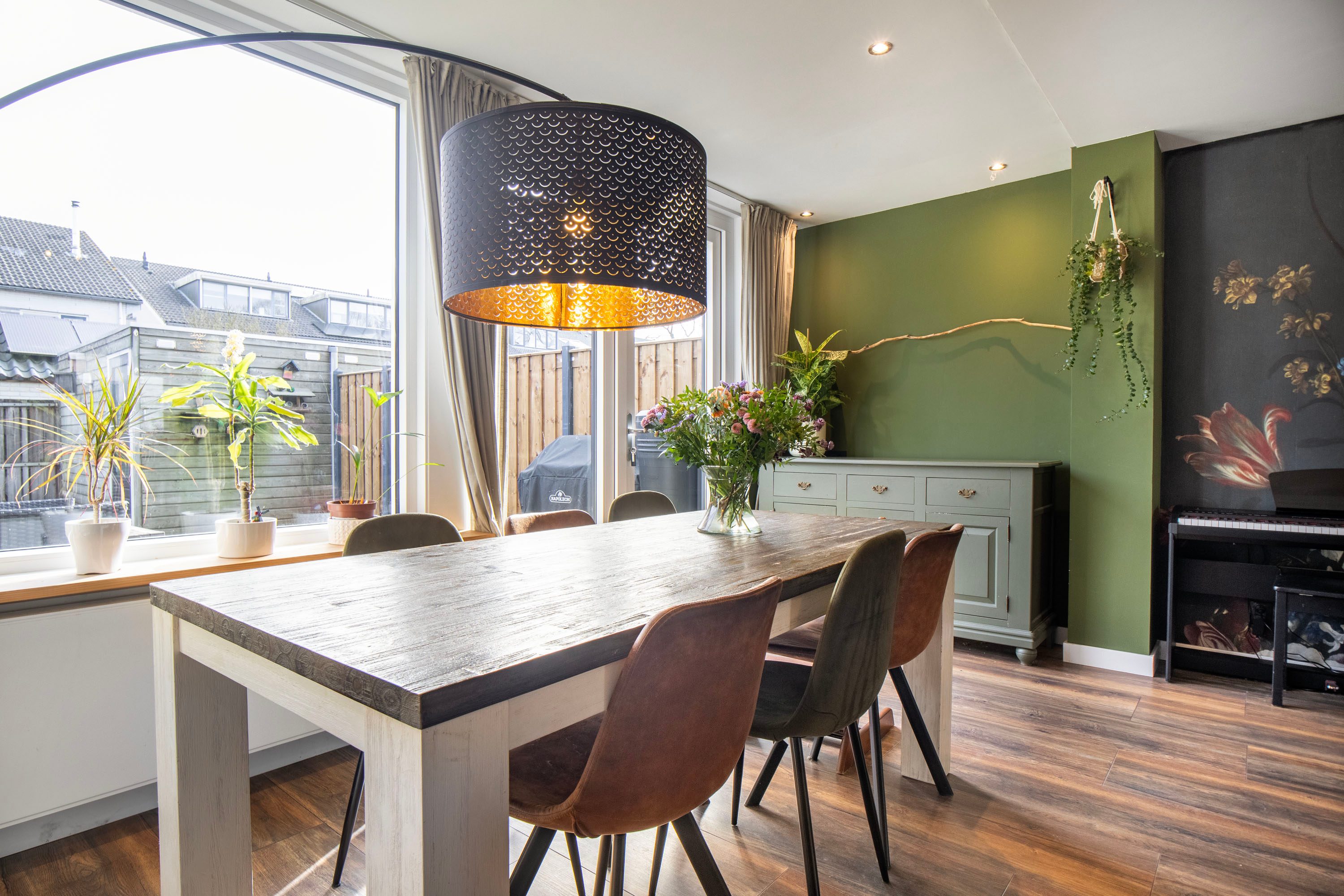 Bij binnenkomst kom je in de hal met de meterkast en het separate toilet. Vanuit hier loop je door naar de ruime en lichte woonkamer van circa 35 m². De woonkamer voelt ruim en open aan dankzij de grote raampartijen. Via de openslaande deuren heb je direct toegang tot de achtertuin, waardoor binnen en buiten mooi in elkaar overlopen. Aan de voorzijde van de woning bevindt zich de halfopen keuken van circa 9 m². Deze keuken is in 2016 vernieuwd en voorzien van diverse inbouwapparatuur, waaronder een kookplaat, afzuigkap, magnetron, oven, koel-vriescombinatie en vaatwasser. Daarnaast is er een Howat heetwaterkraan aanwezig, ideaal voor direct kokend water. Dankzij het grote raam valt er ook hier veel daglicht naar binnen.