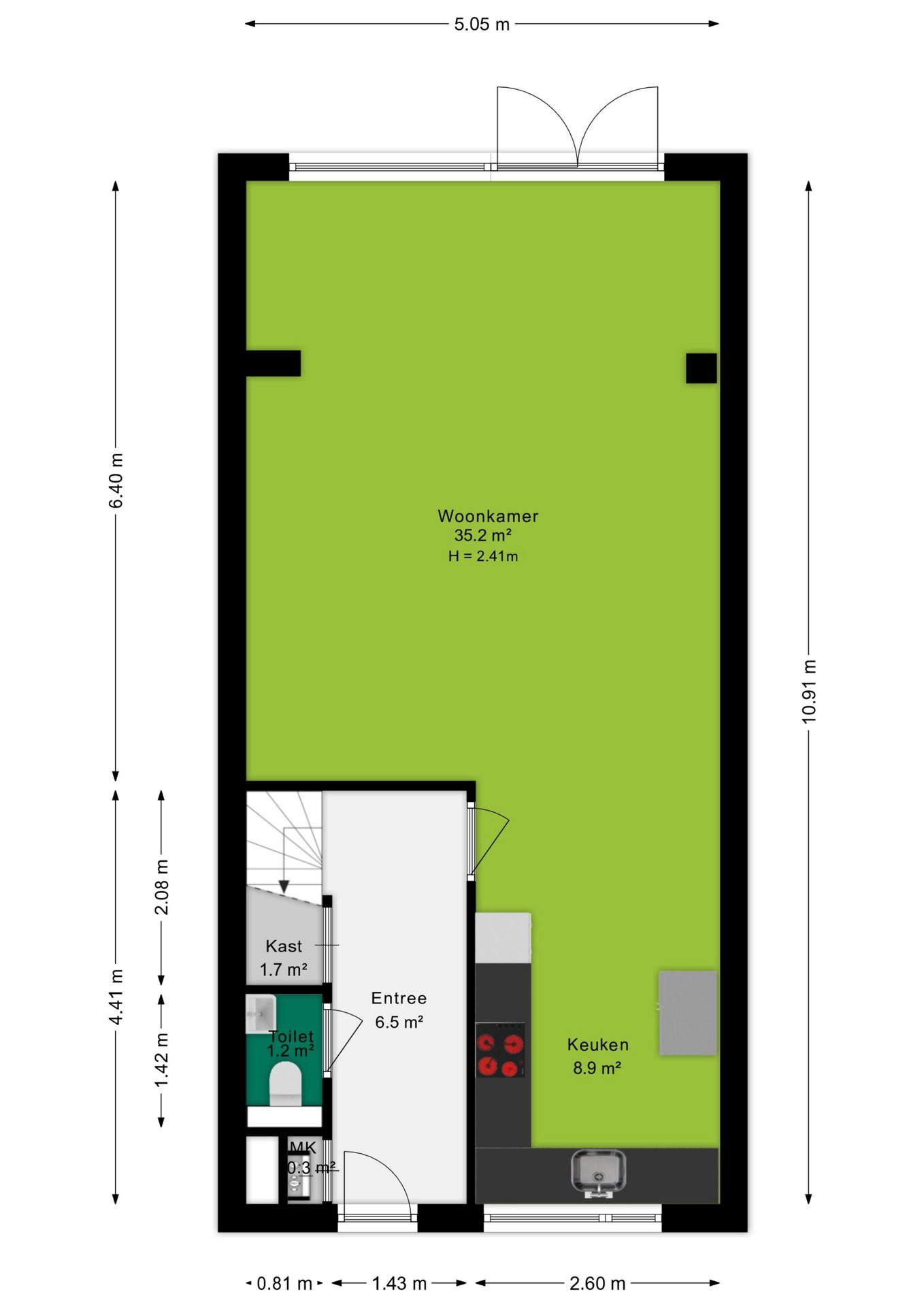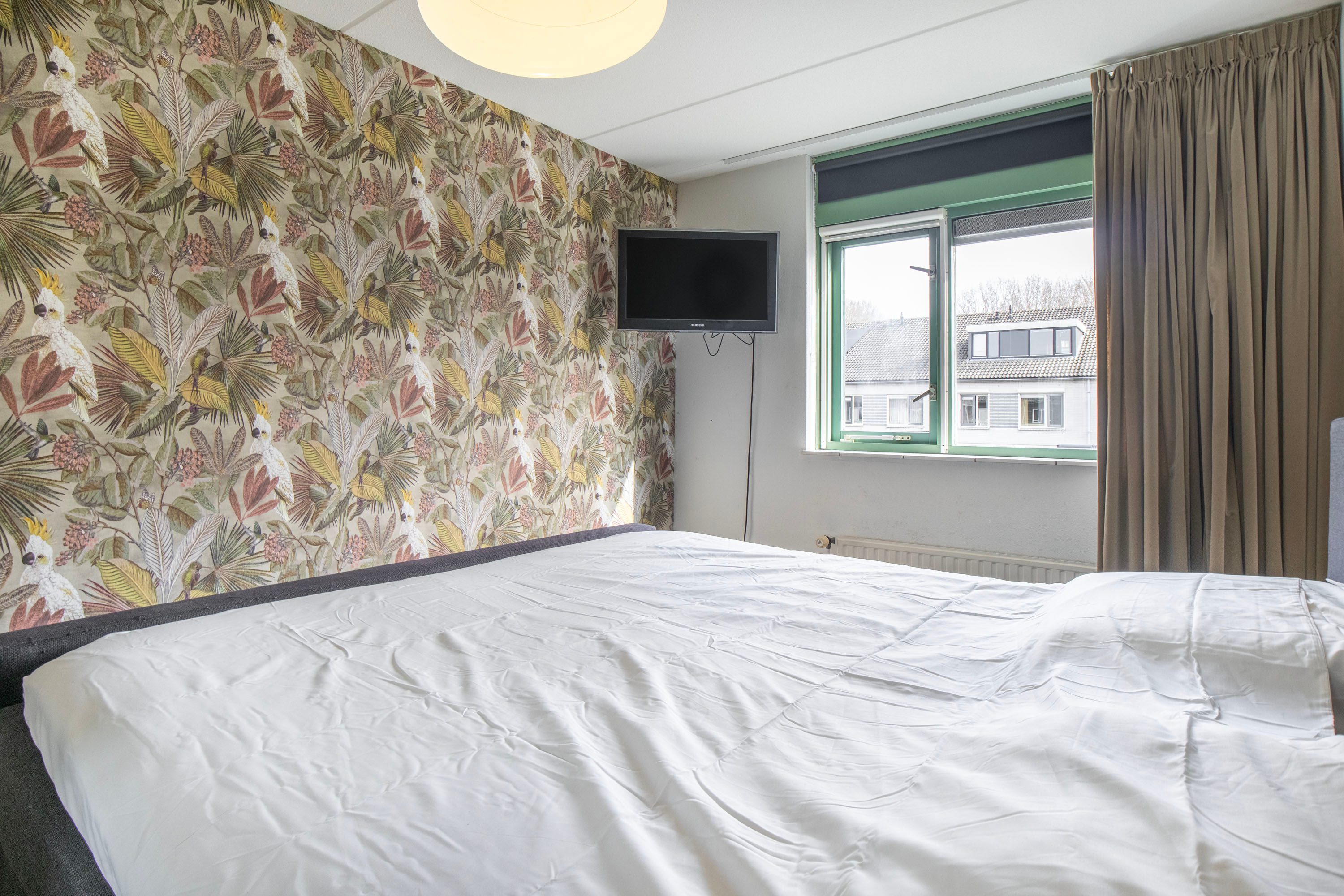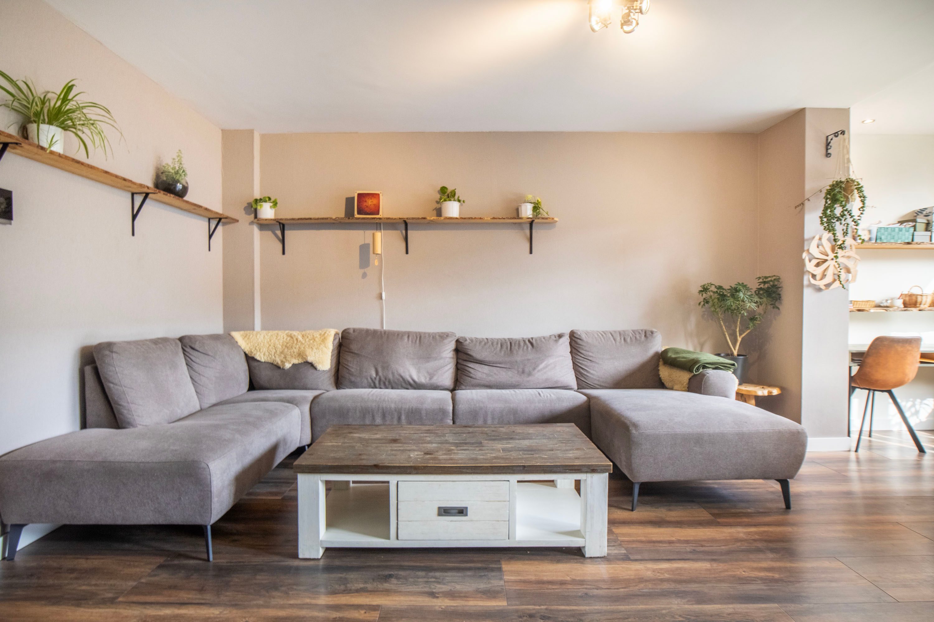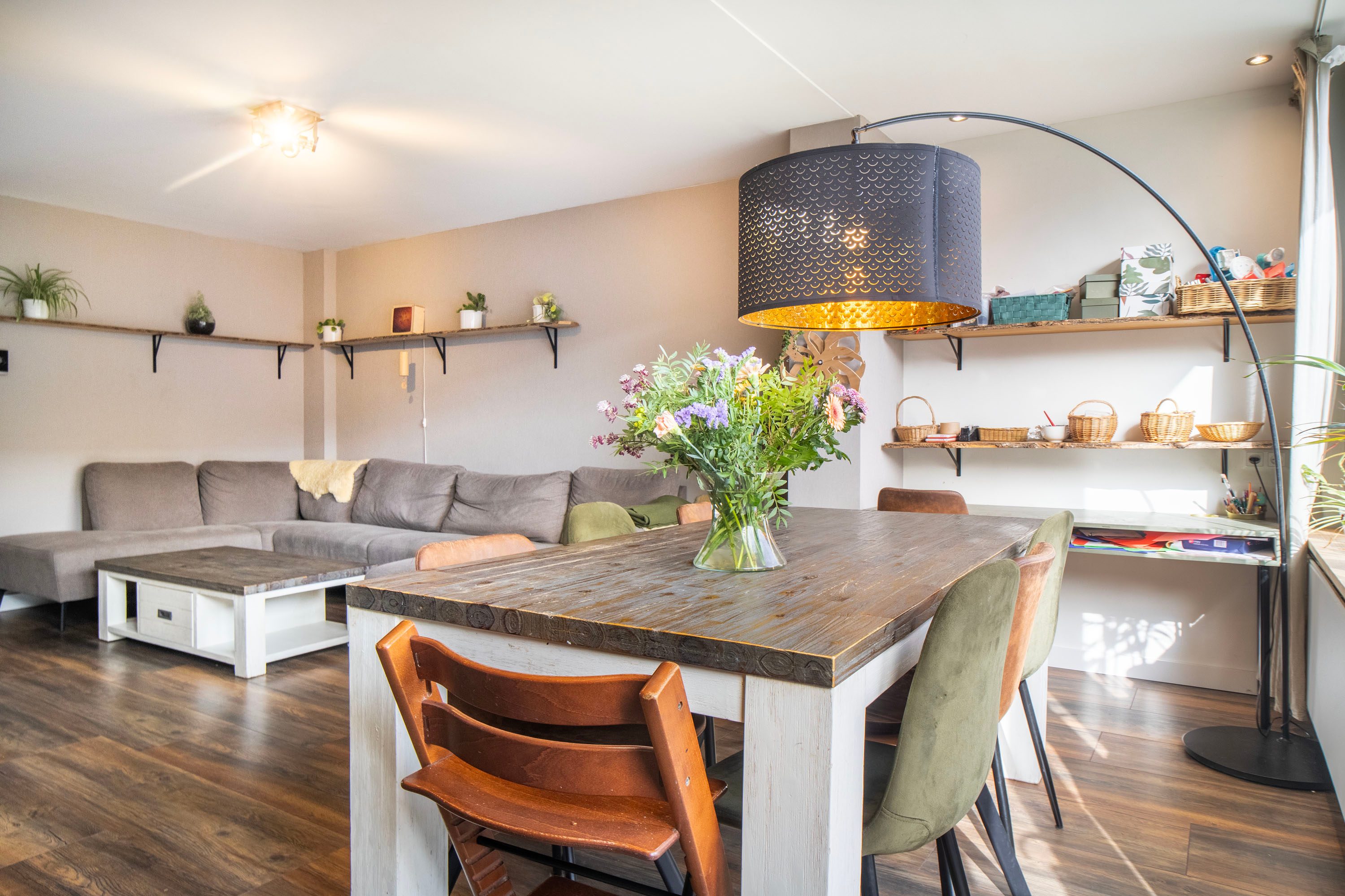 Bij binnenkomst kom je in de hal met de meterkast en het separate toilet. Vanuit hier loop je door naar de ruime en lichte woonkamer van circa 35 m². De woonkamer voelt ruim en open aan dankzij de grote raampartijen. Via de openslaande deuren heb je direct toegang tot de achtertuin, waardoor binnen en buiten mooi in elkaar overlopen. Aan de voorzijde van de woning bevindt zich de halfopen keuken van circa 9 m². Deze keuken is in 2016 vernieuwd en voorzien van diverse inbouwapparatuur, waaronder een kookplaat, afzuigkap, magnetron, oven, koel-vriescombinatie en vaatwasser. Daarnaast is er een Howat heetwaterkraan aanwezig, ideaal voor direct kokend water. Dankzij het grote raam valt er ook hier veel daglicht naar binnen.