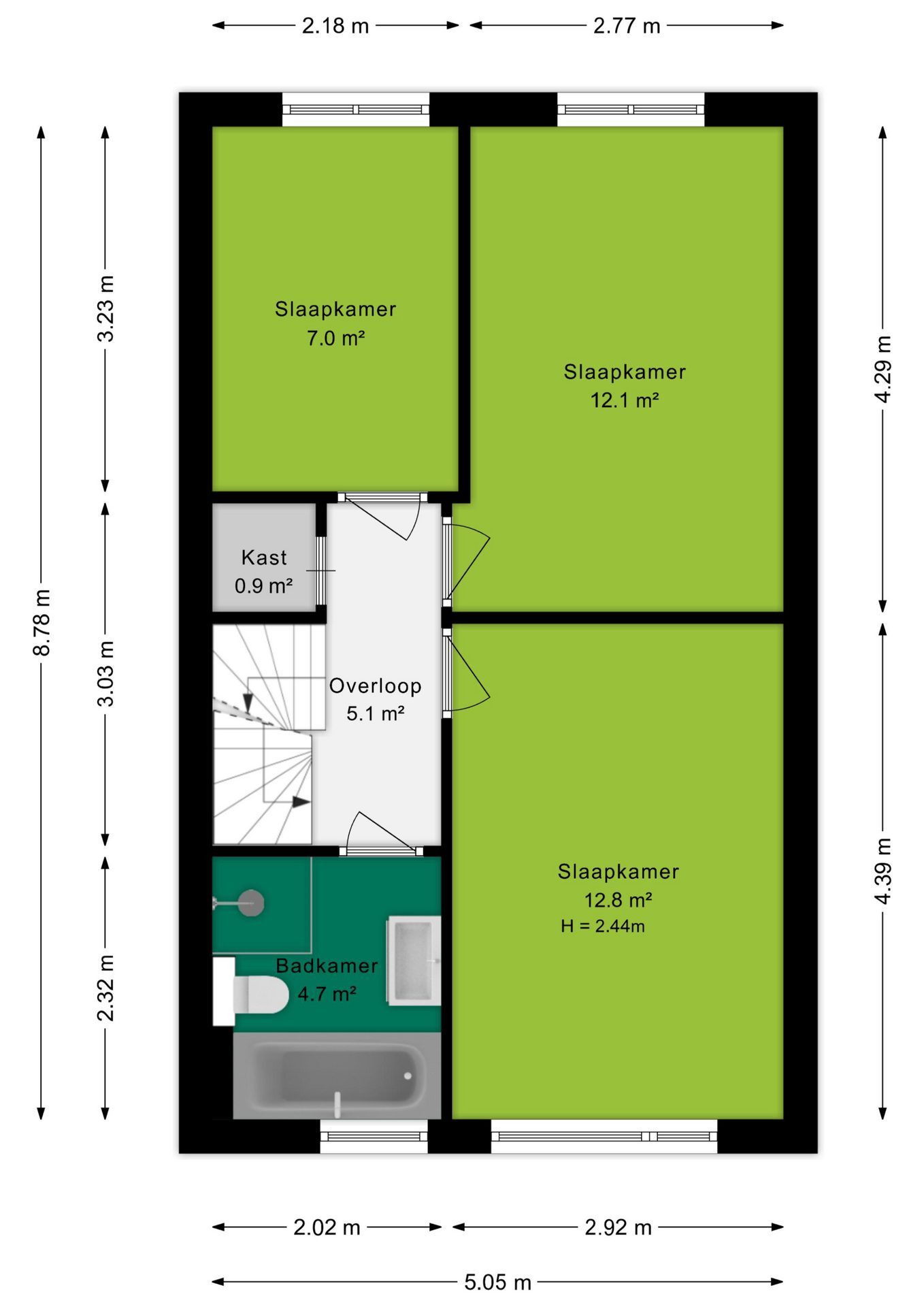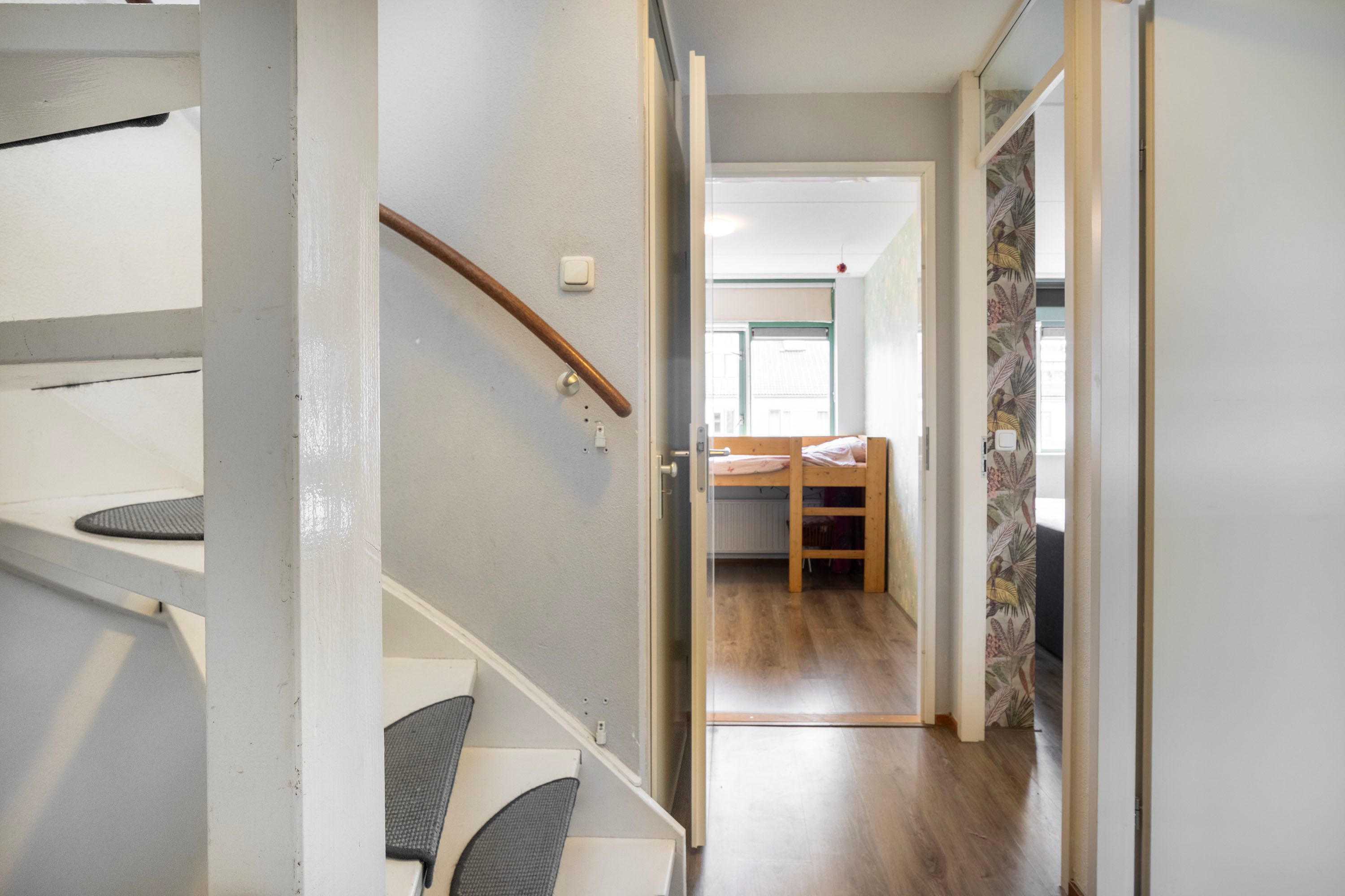 Op de eerste verdieping bevinden zich drie slaapkamers van circa 13 m², 12 m² en 7 m². De kamers zijn praktisch ingedeeld en lenen zich uitstekend als hoofdslaapkamer, kinderkamer of werkruimte. De badkamer is in 2021 vernieuwd en modern uitgevoerd. De ruimte is voorzien van een ligbad, aparte douche, tweede toilet en een wastafel met wastafelmeubel, waardoor de badkamer zowel comfortabel als praktisch is ingericht.