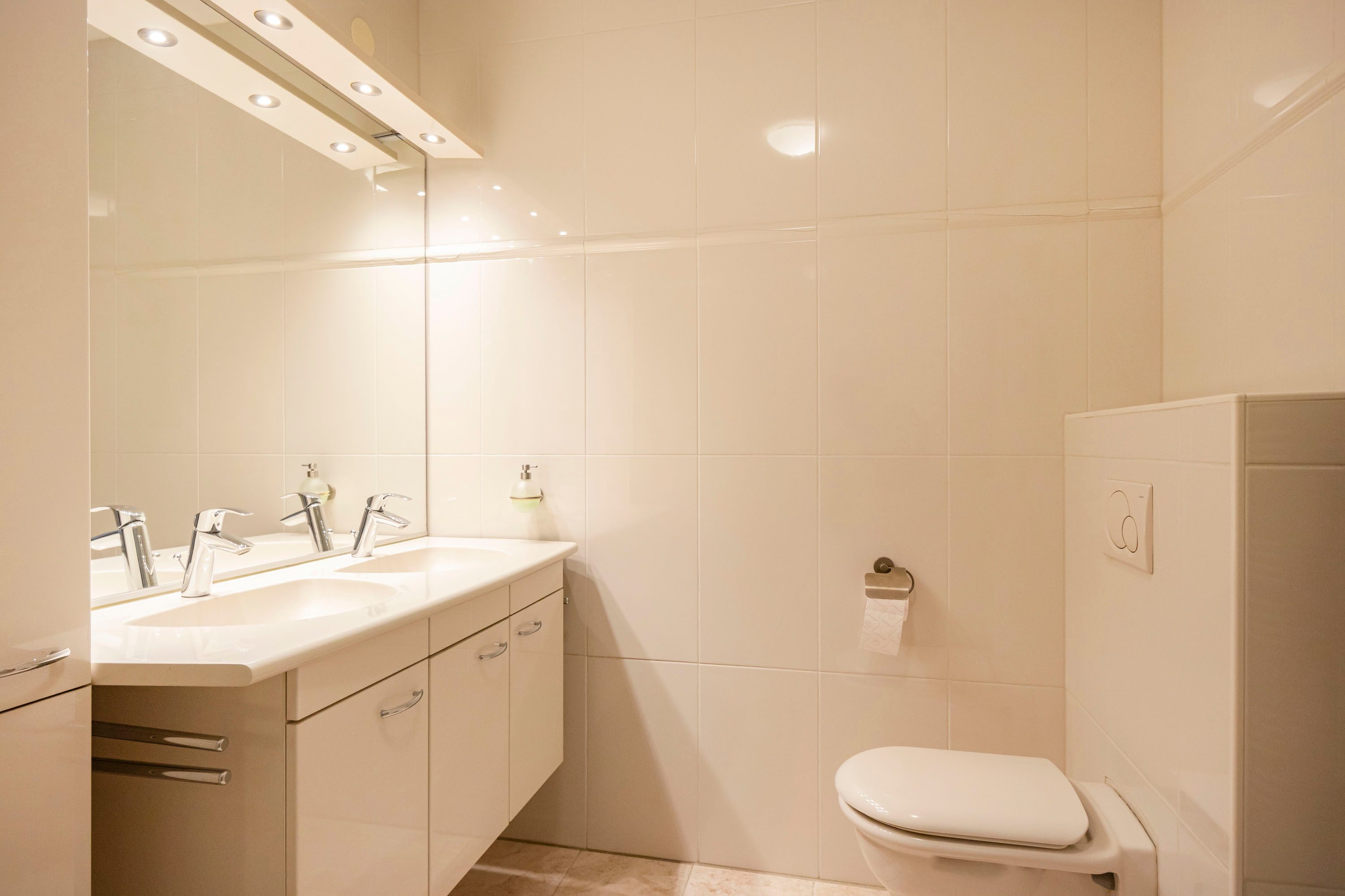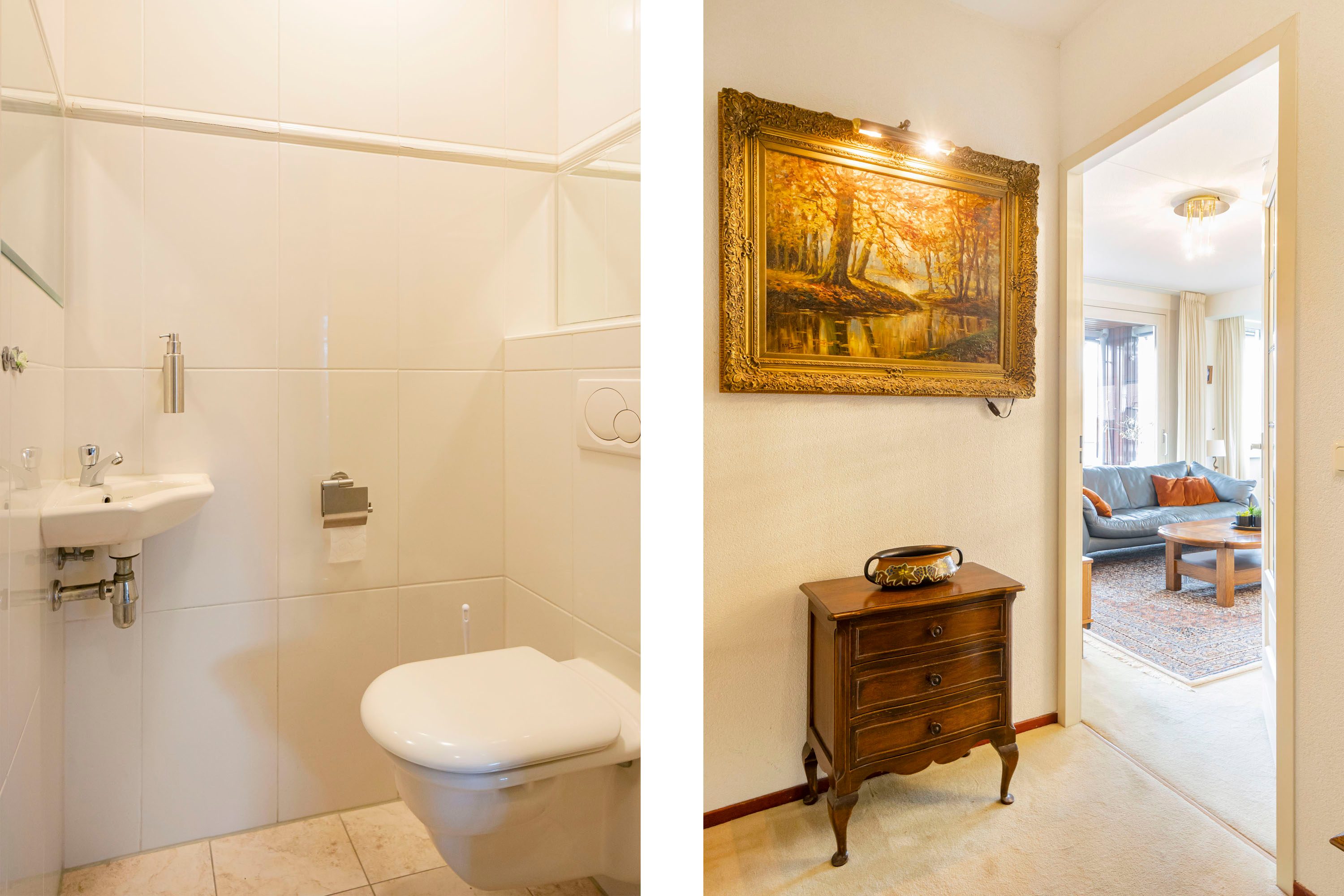 De badkamer van circa 5 m² is praktisch ingedeeld en voorzien van een douche, dubbele wastafel met meubel, kolomkast, designradiator en toilet. Daarnaast is er in de hal nog een tweede separaat toilet aanwezig.
