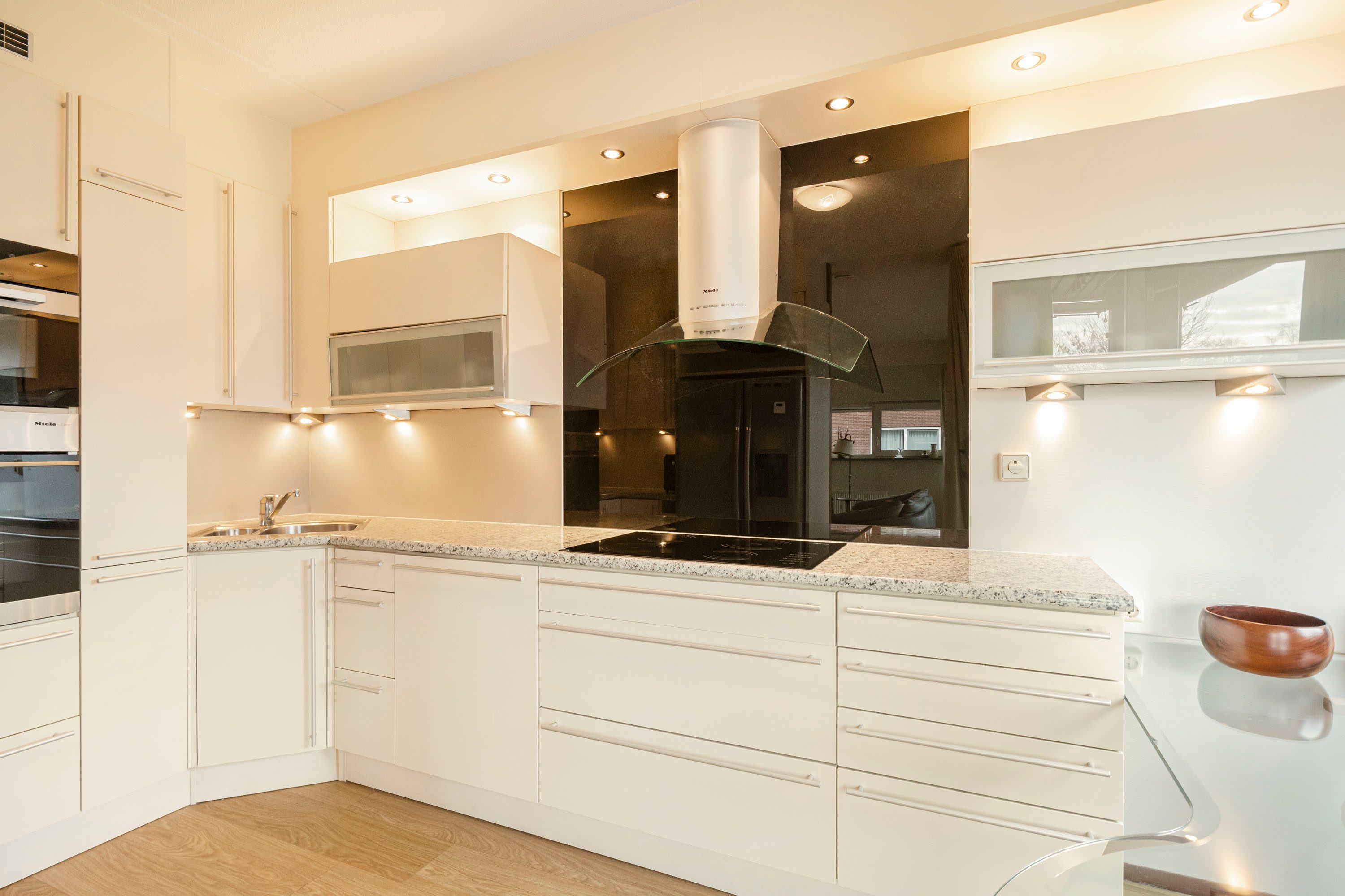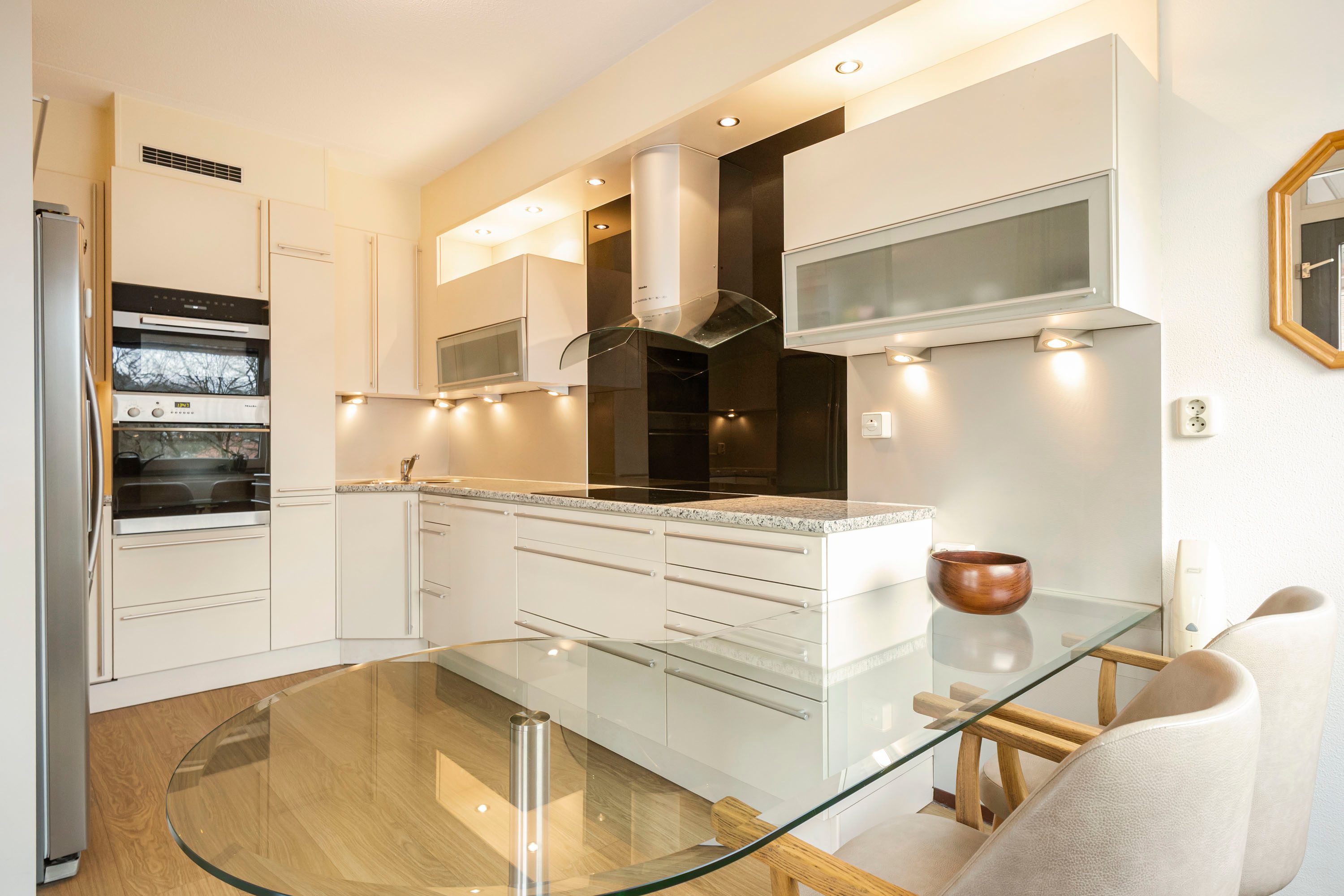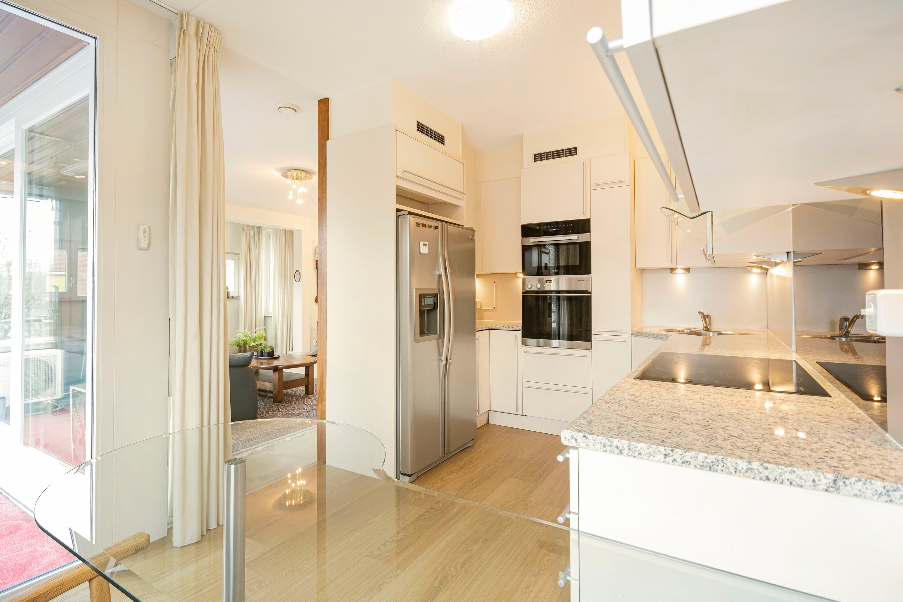 De keuken grenst aan de woonkamer en is uitgerust met diverse inbouwapparatuur, waaronder een inductiekookplaat, afzuigkap, combi-oven, magnetron en vaatwasser. Dankzij de ruime opzet is hier ook plek voor een extra zitje. Ook vanuit de keuken heb je toegang tot het balkon.